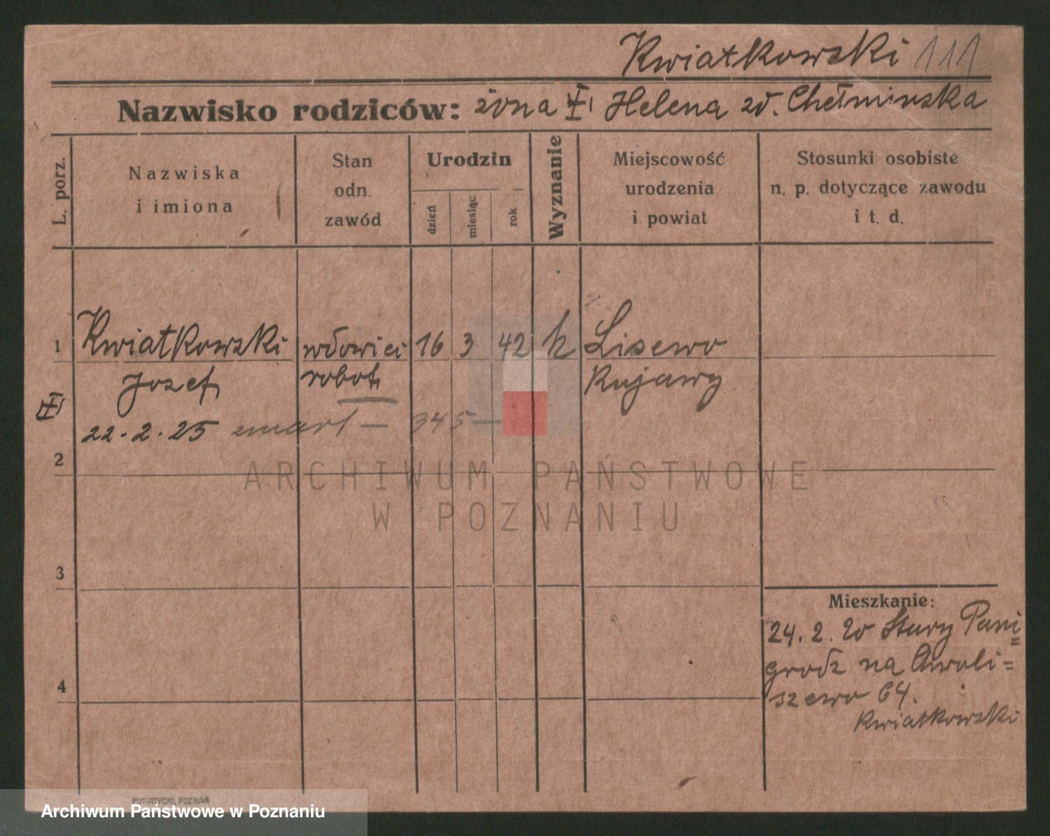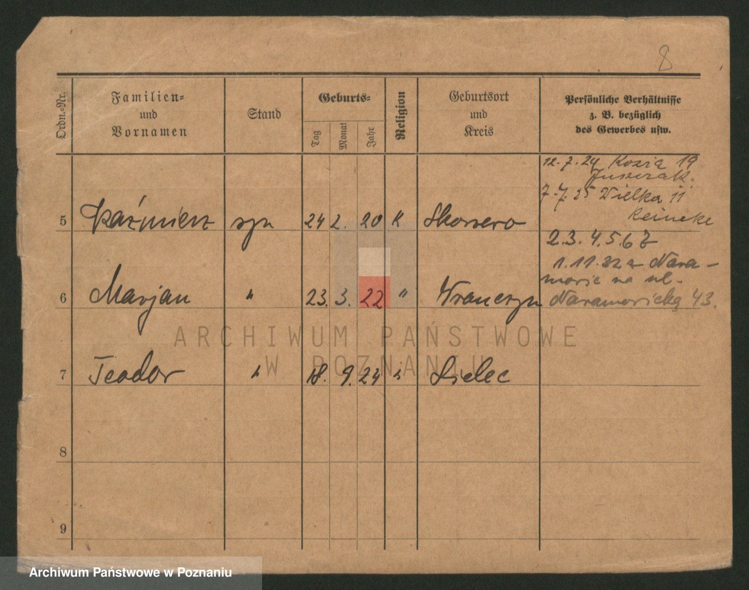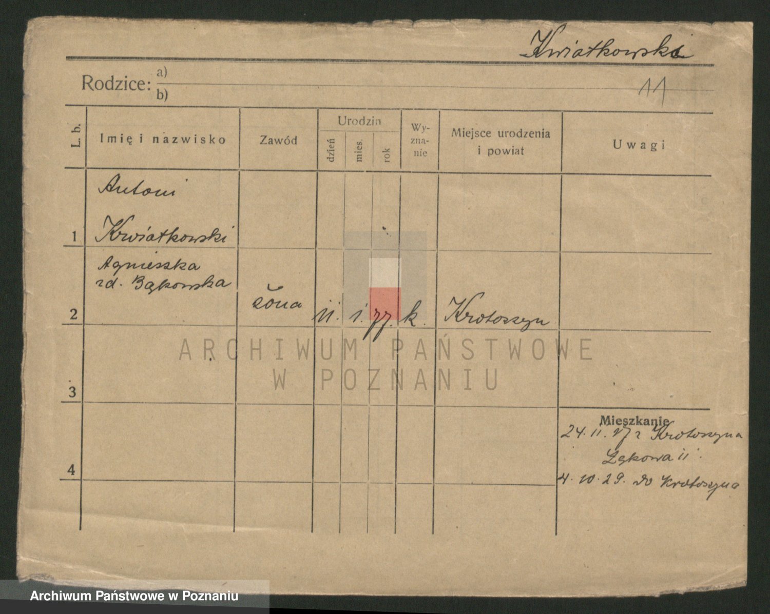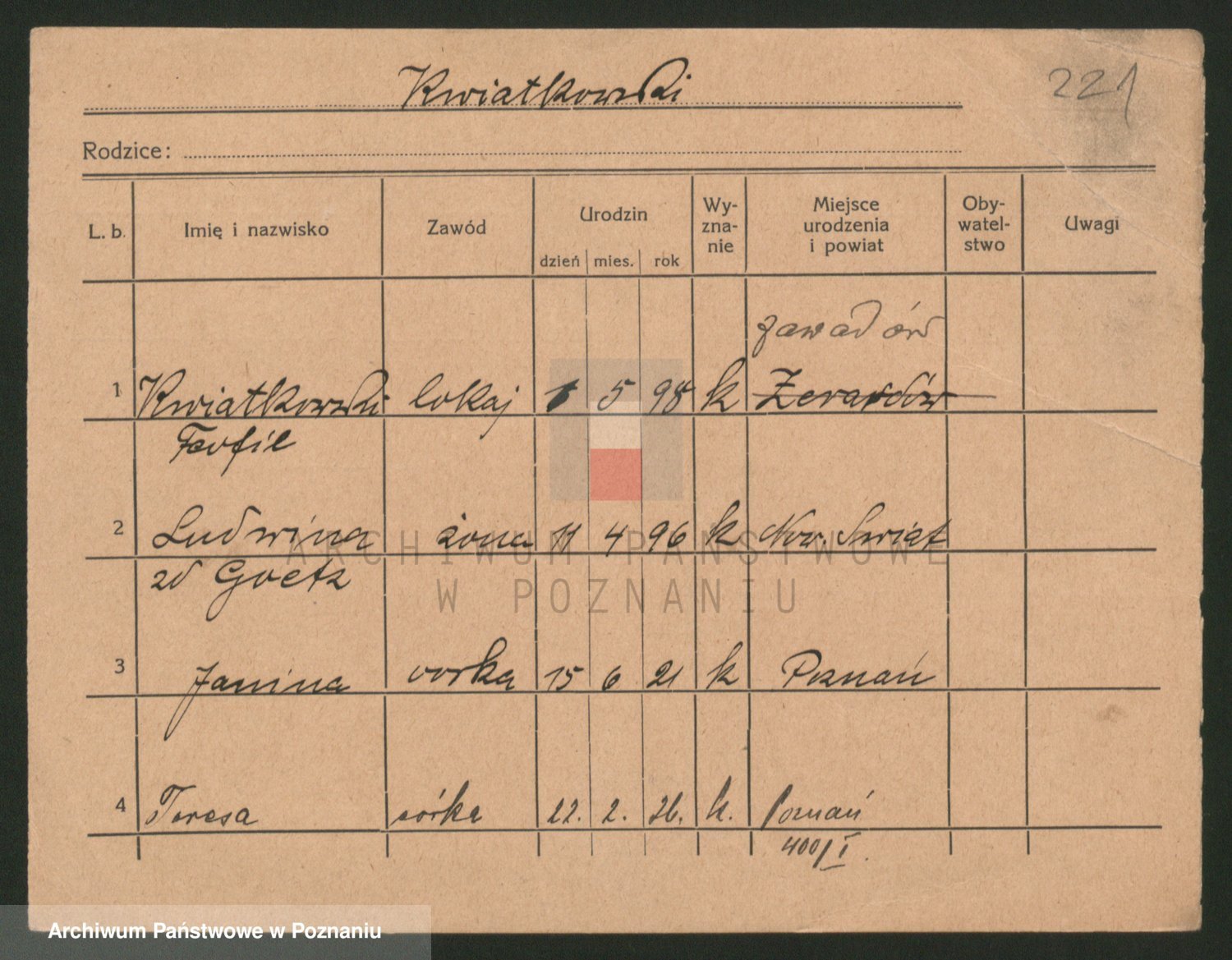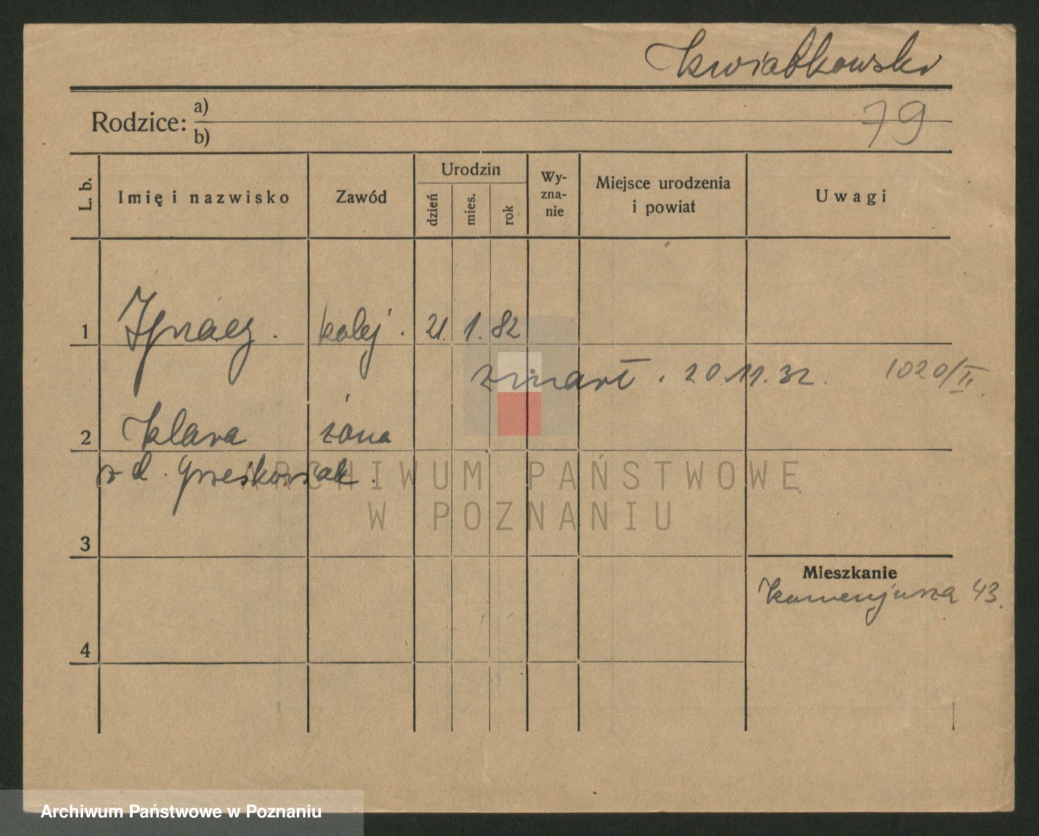 Podgląd karty osobowej dostępny jest po kliknięciu na nazwisko lub ikonkę karty. Można dokonywać powiększenia (ikony na górze) lub przechodzić między kolejnymi skanami (strzałki po bokach).