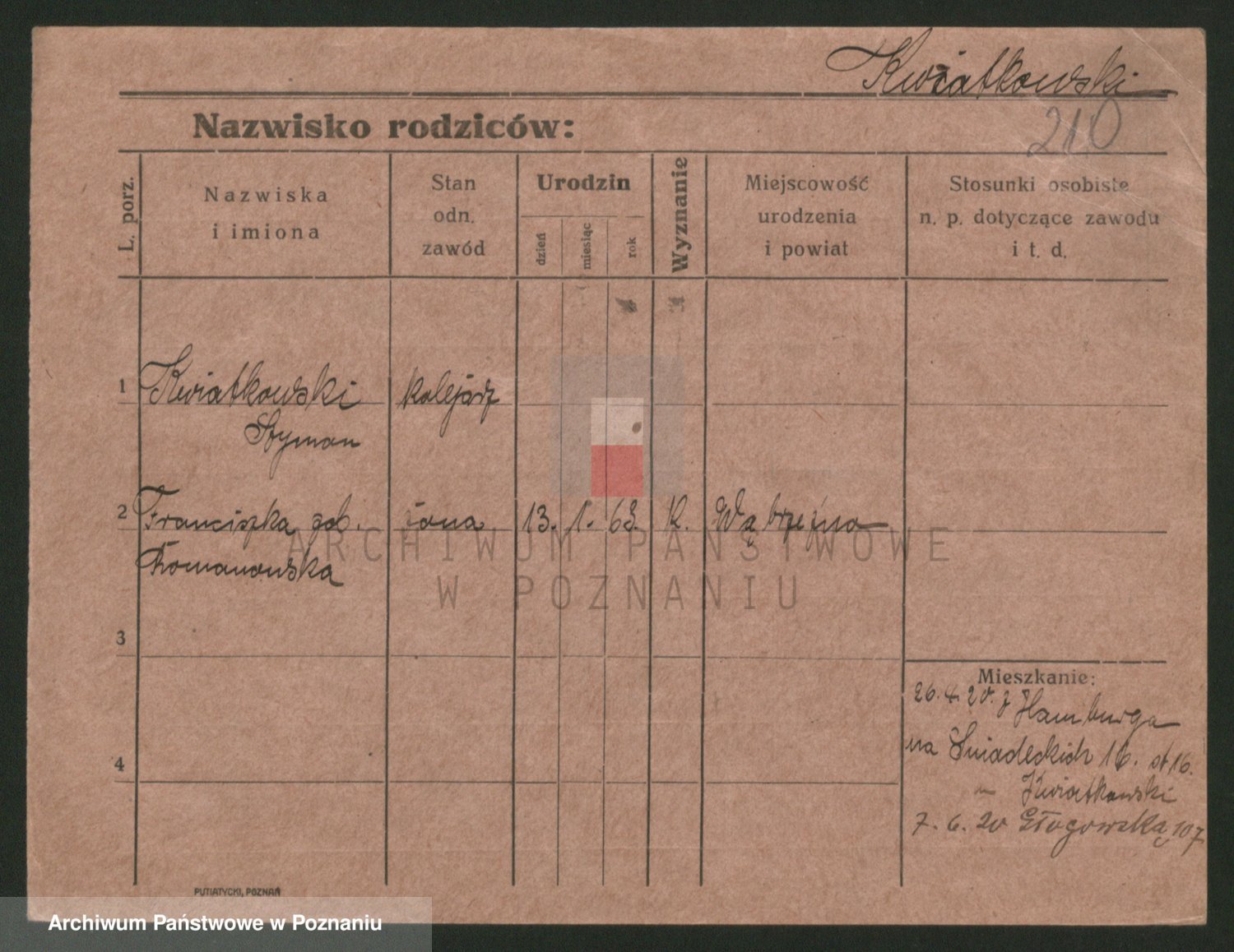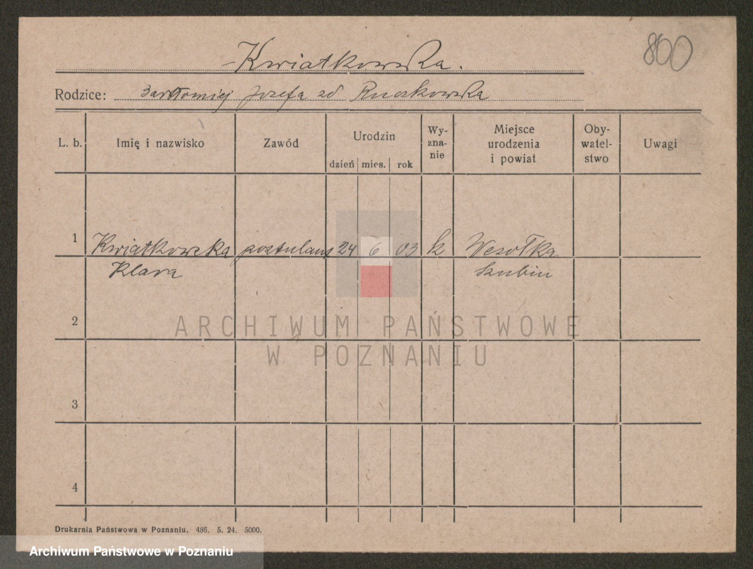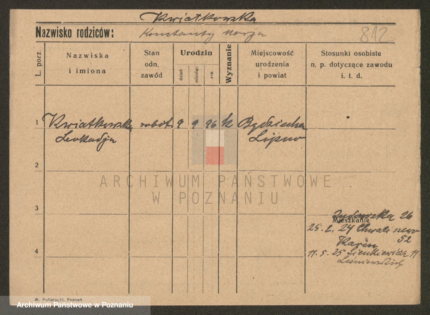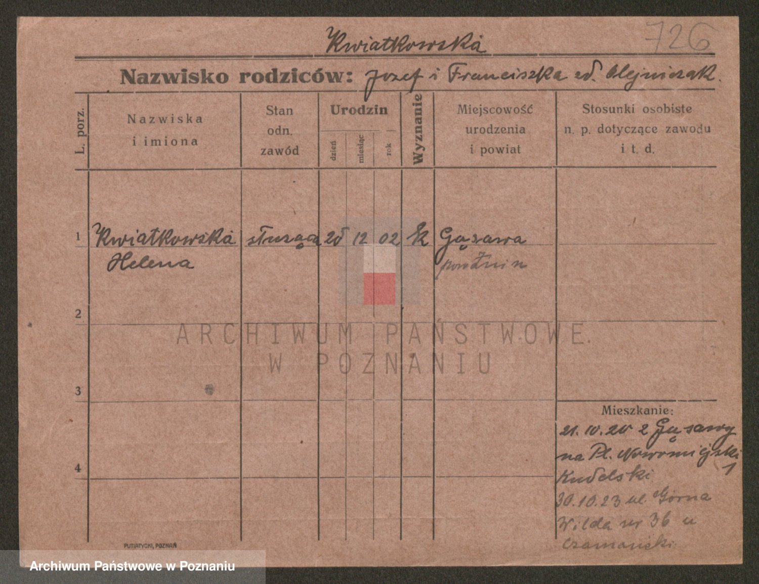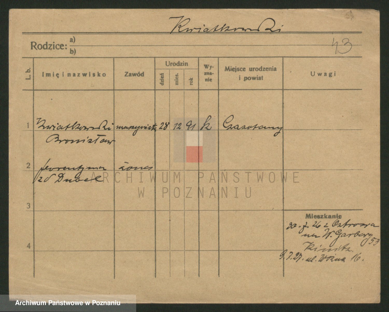 Podgląd karty osobowej dostępny jest po kliknięciu na nazwisko lub ikonkę karty. Można dokonywać powiększenia (ikony na górze) lub przechodzić między kolejnymi skanami (strzałki po bokach).