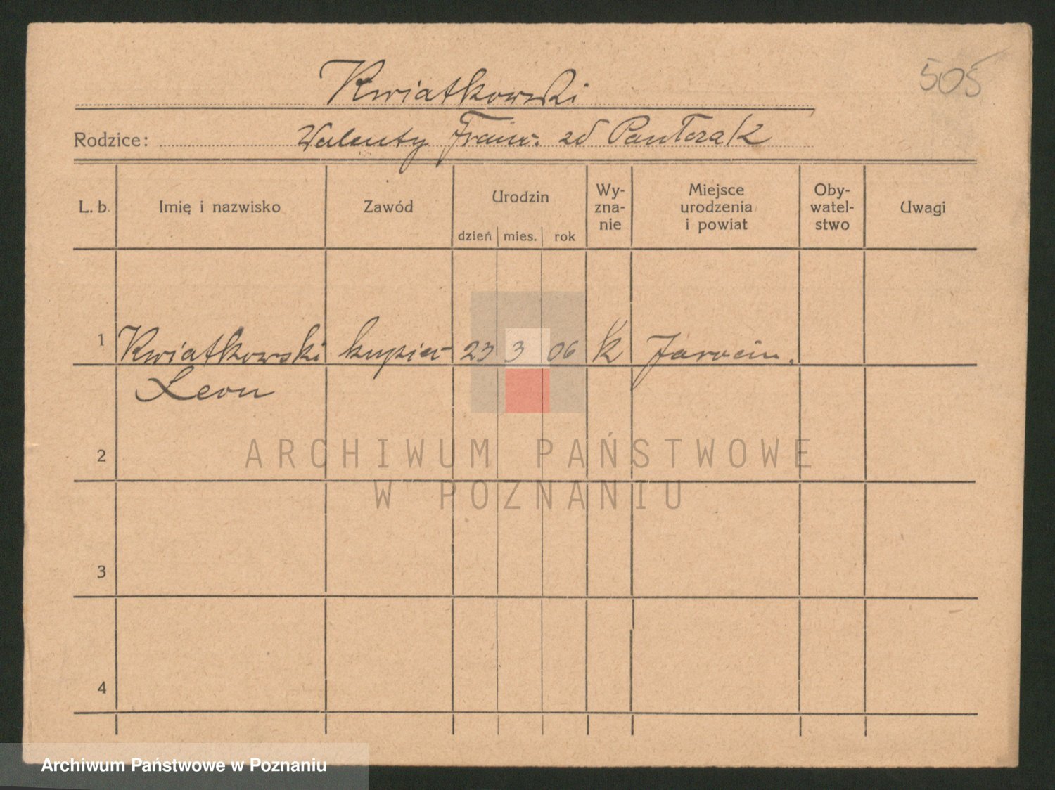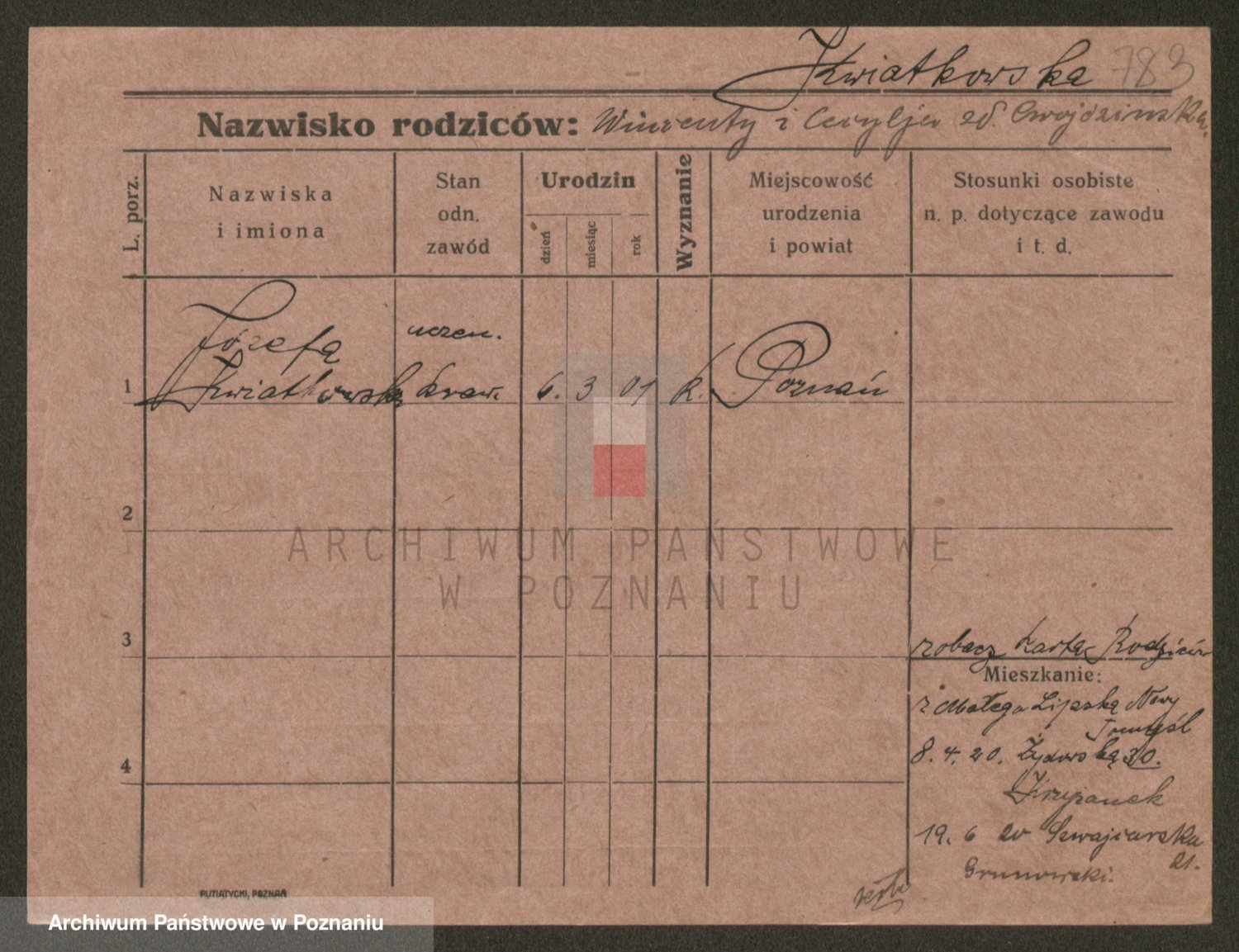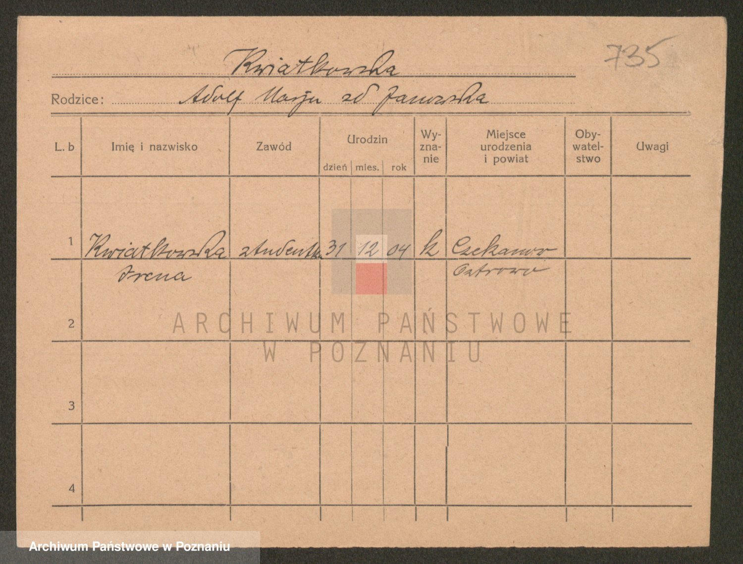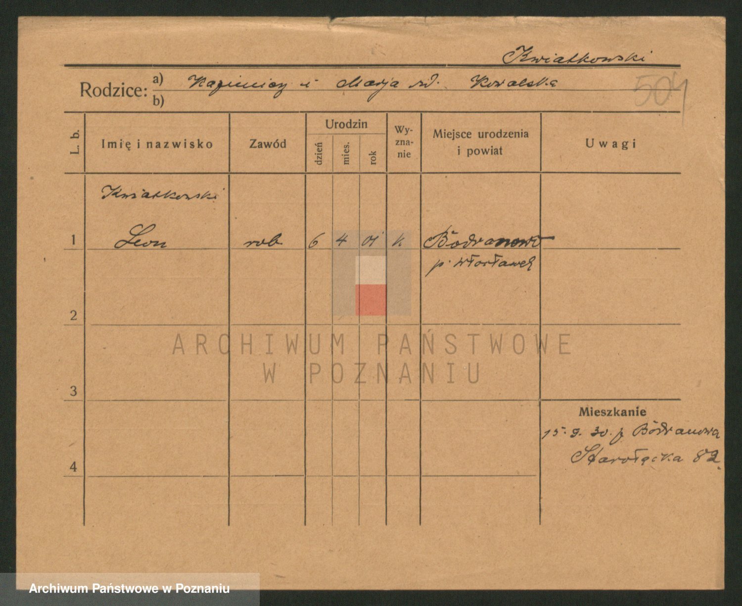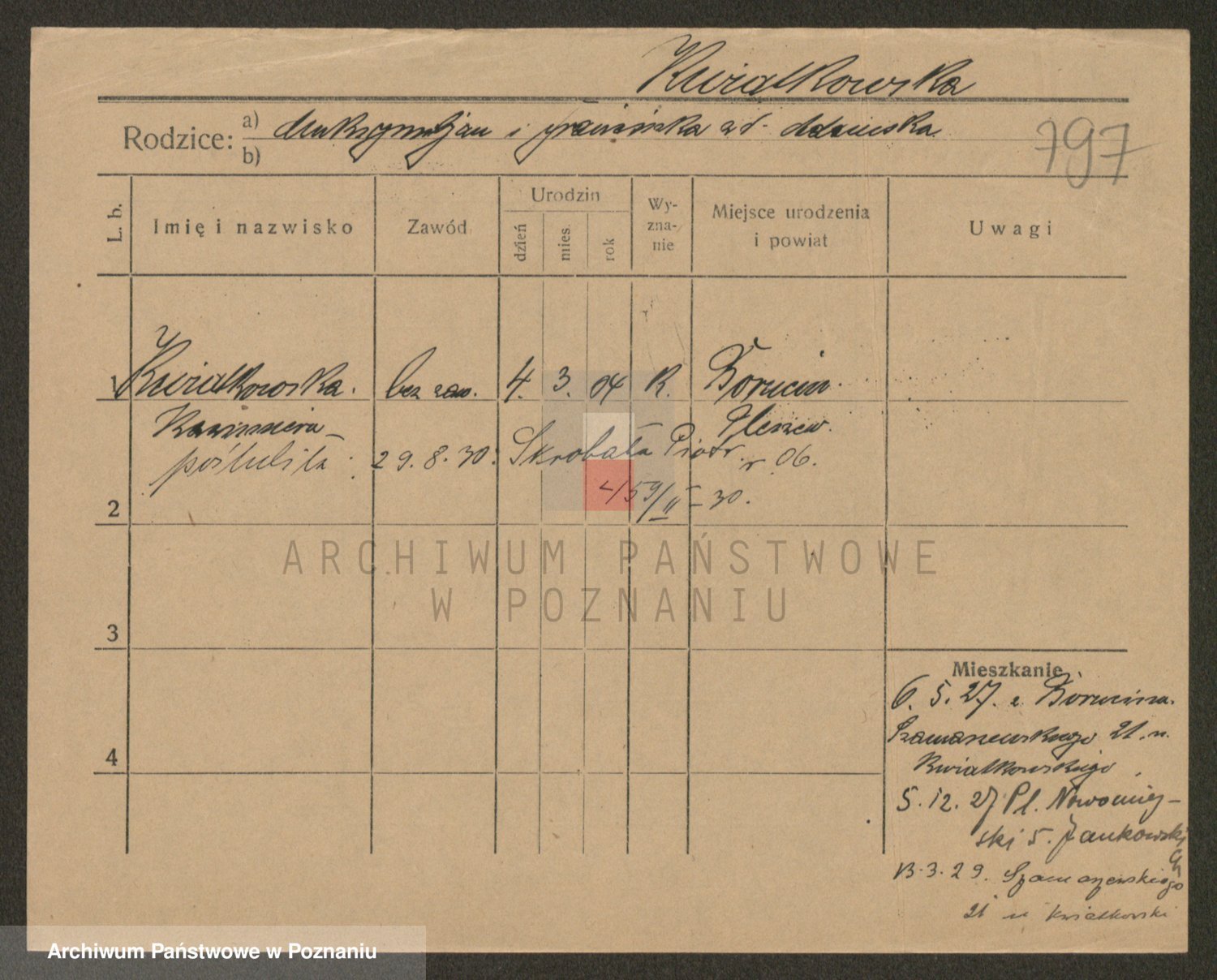 Podgląd karty osobowej dostępny jest po kliknięciu na nazwisko lub ikonkę karty. Można dokonywać powiększenia (ikony na górze) lub przechodzić między kolejnymi skanami (strzałki po bokach).