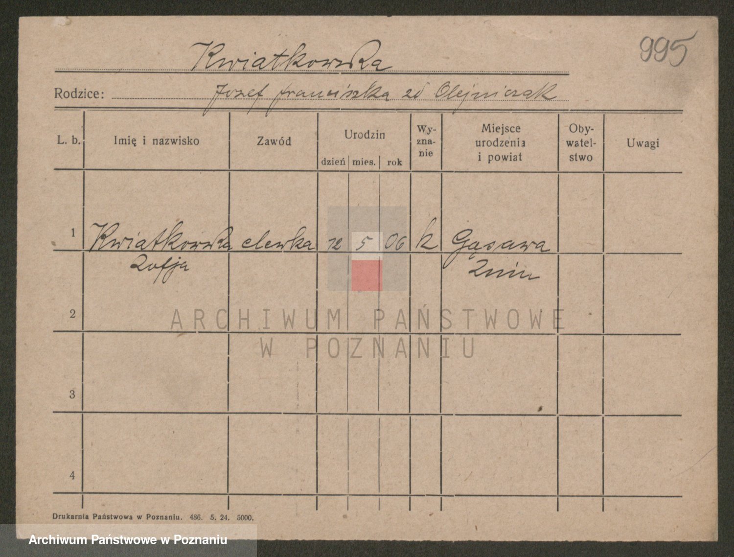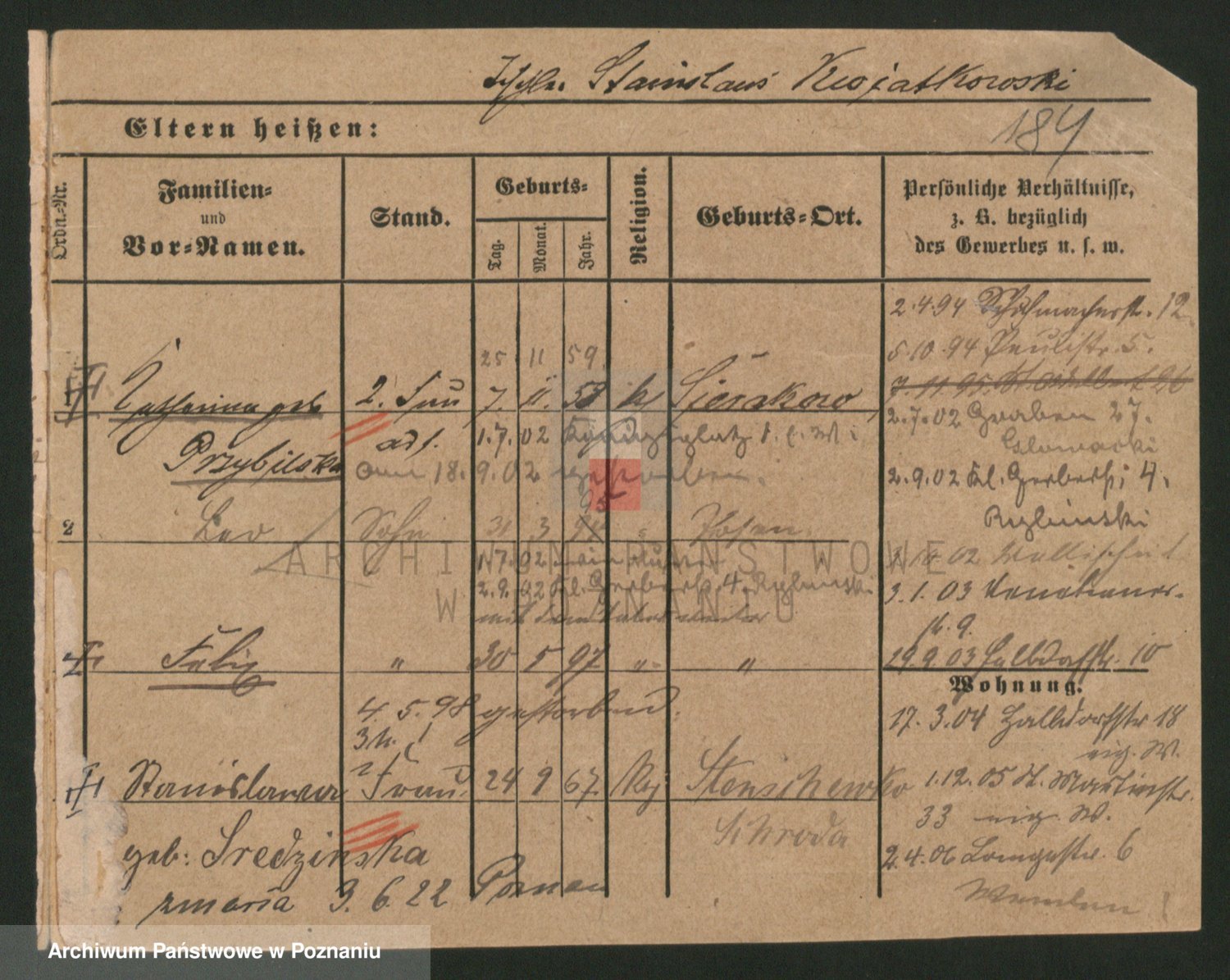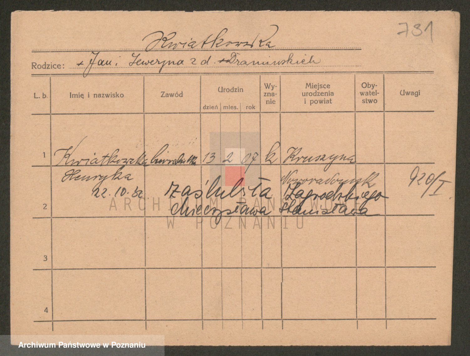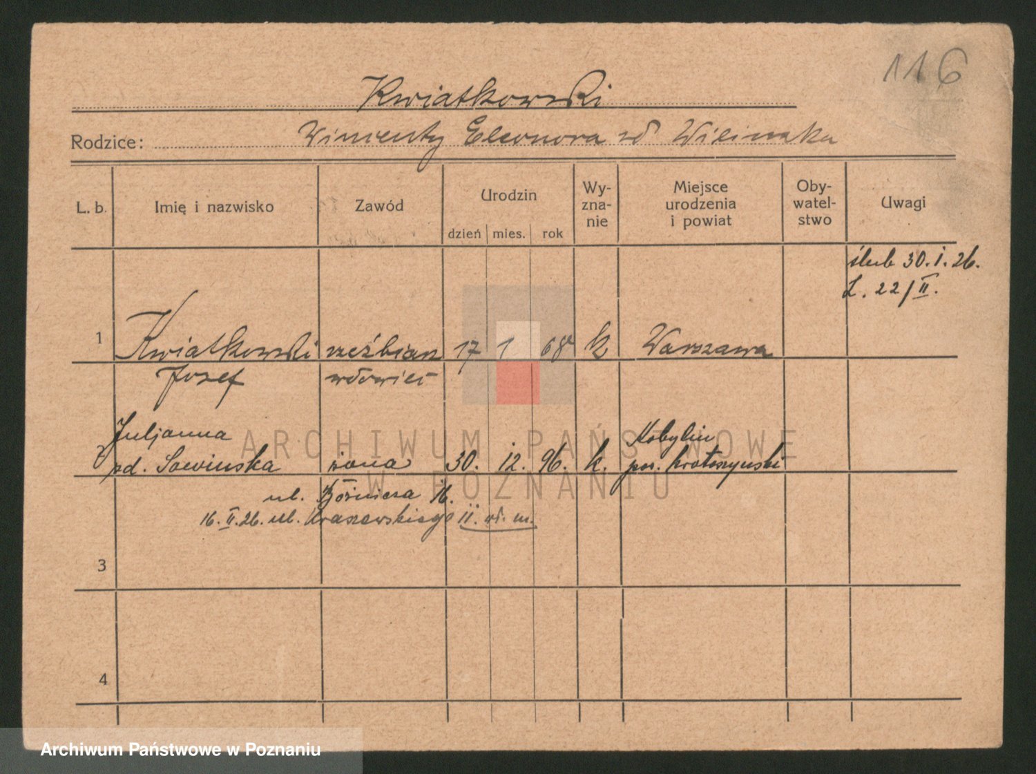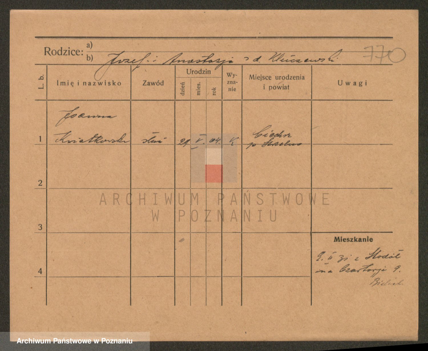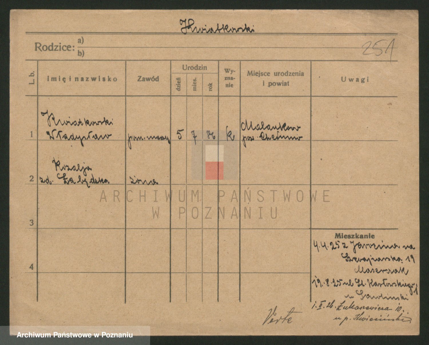 Podgląd karty osobowej dostępny jest po kliknięciu na nazwisko lub ikonkę karty. Można dokonywać powiększenia (ikony na górze) lub przechodzić między kolejnymi skanami (strzałki po bokach).