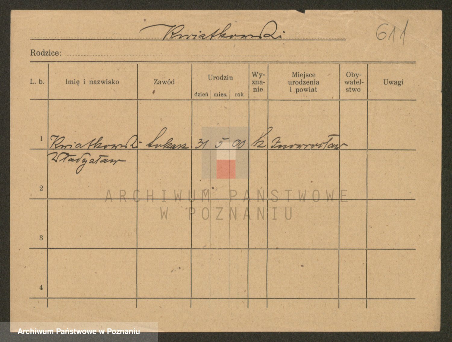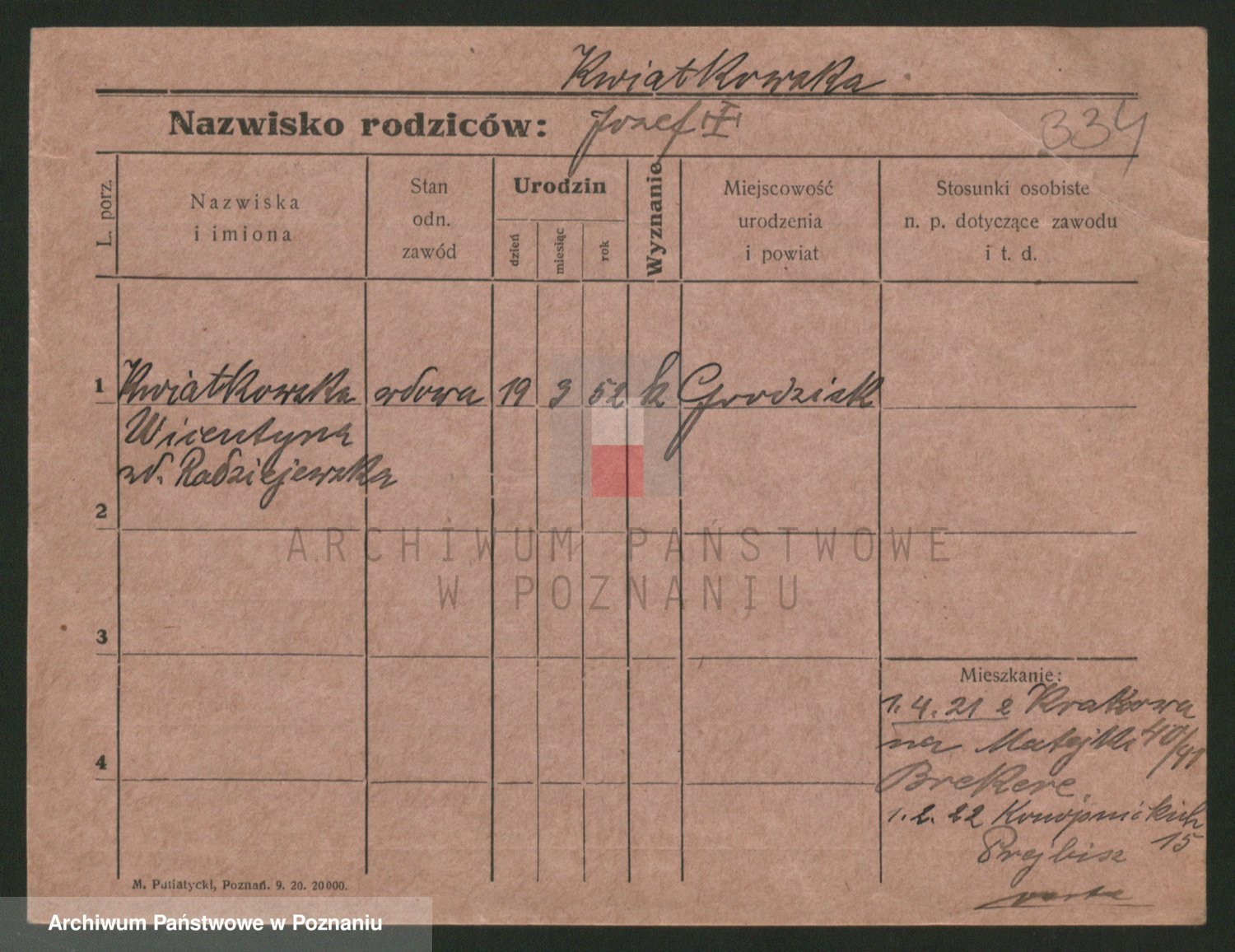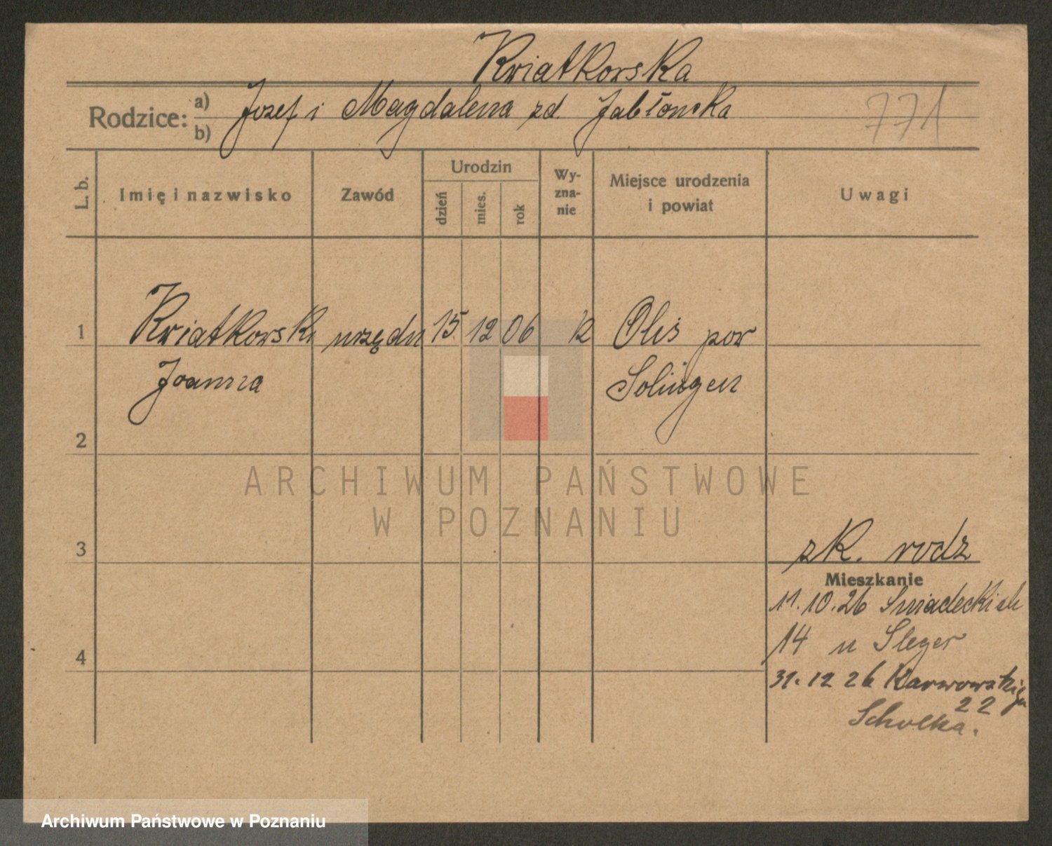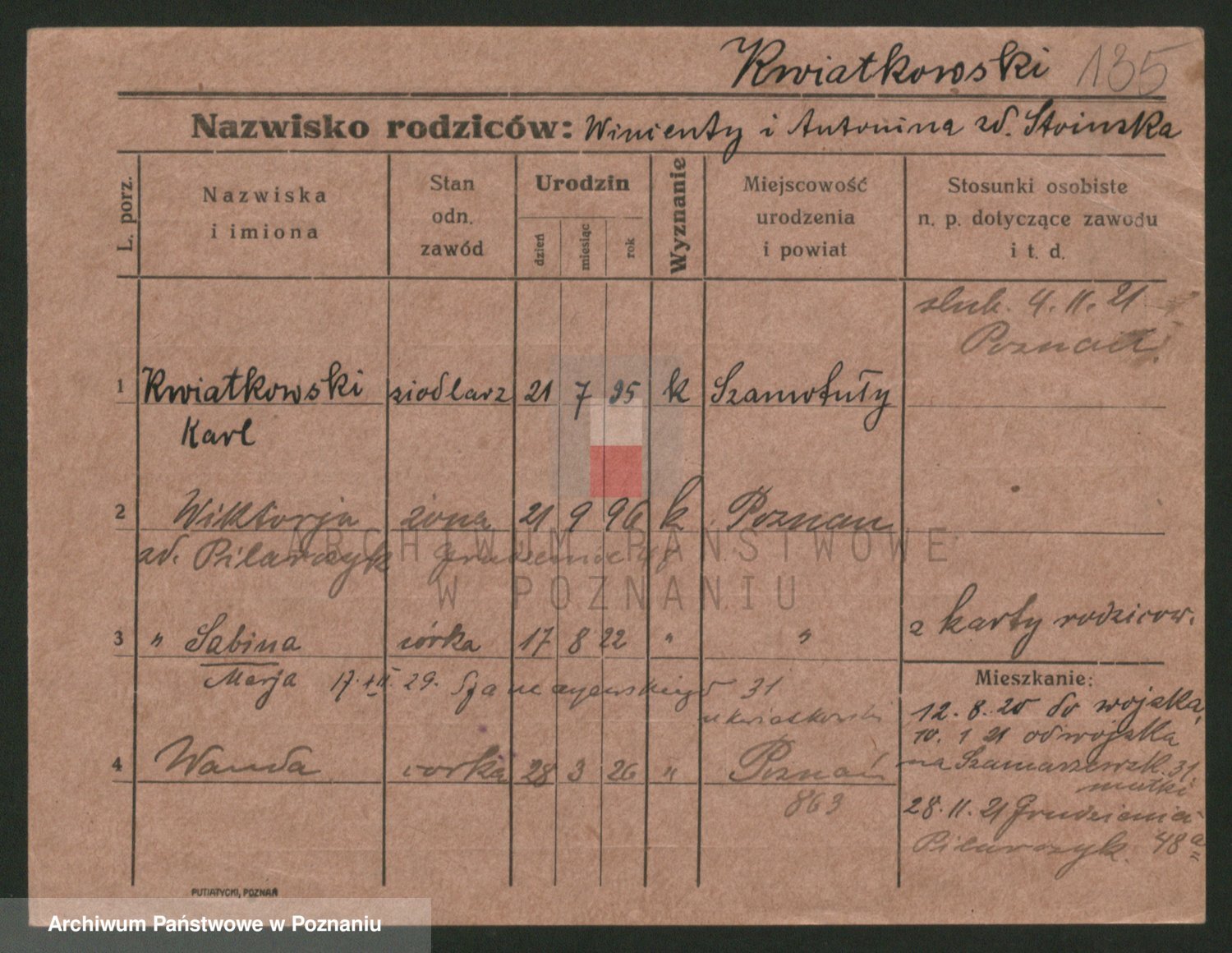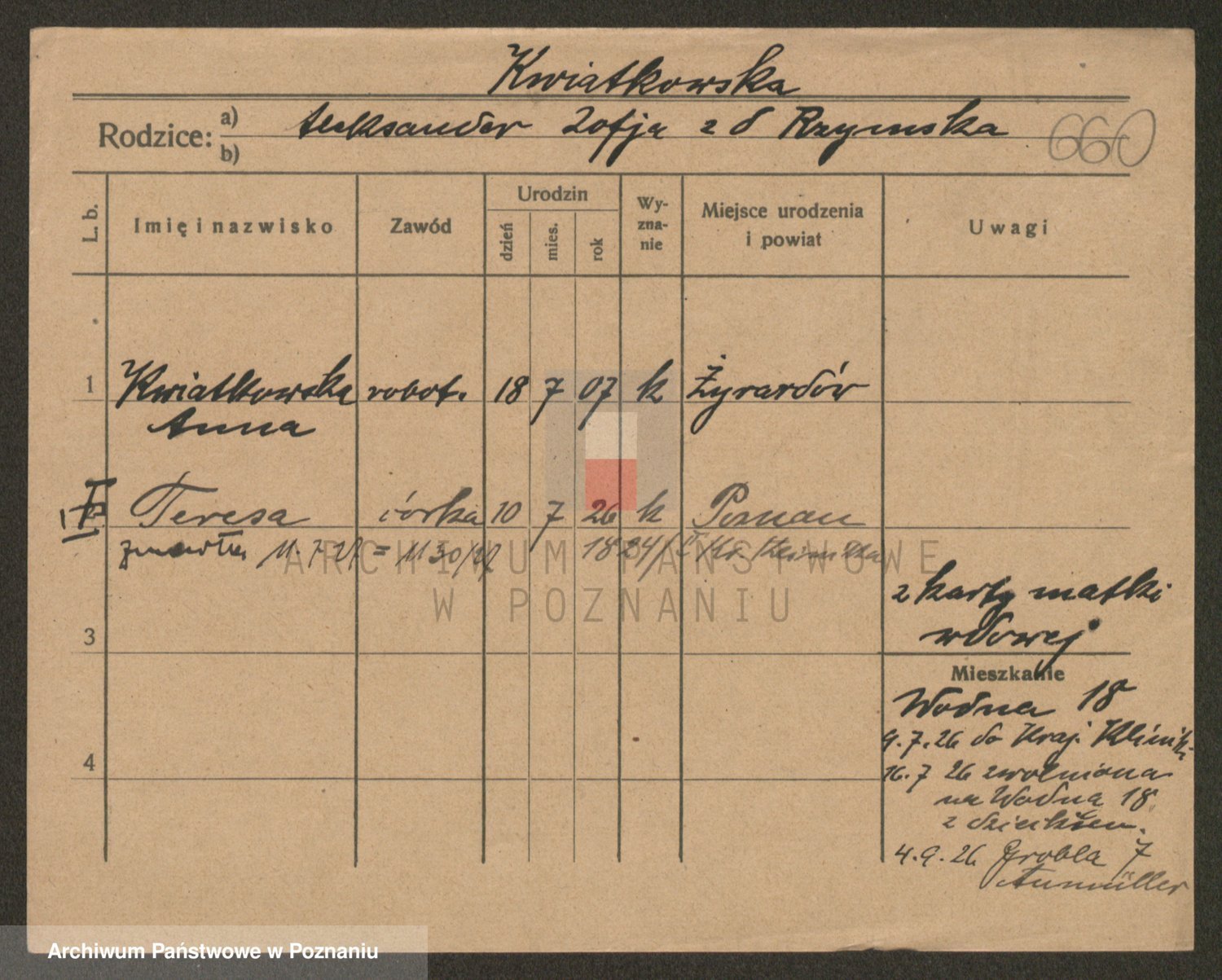 Podgląd karty osobowej dostępny jest po kliknięciu na nazwisko lub ikonkę karty. Można dokonywać powiększenia (ikony na górze) lub przechodzić między kolejnymi skanami (strzałki po bokach).