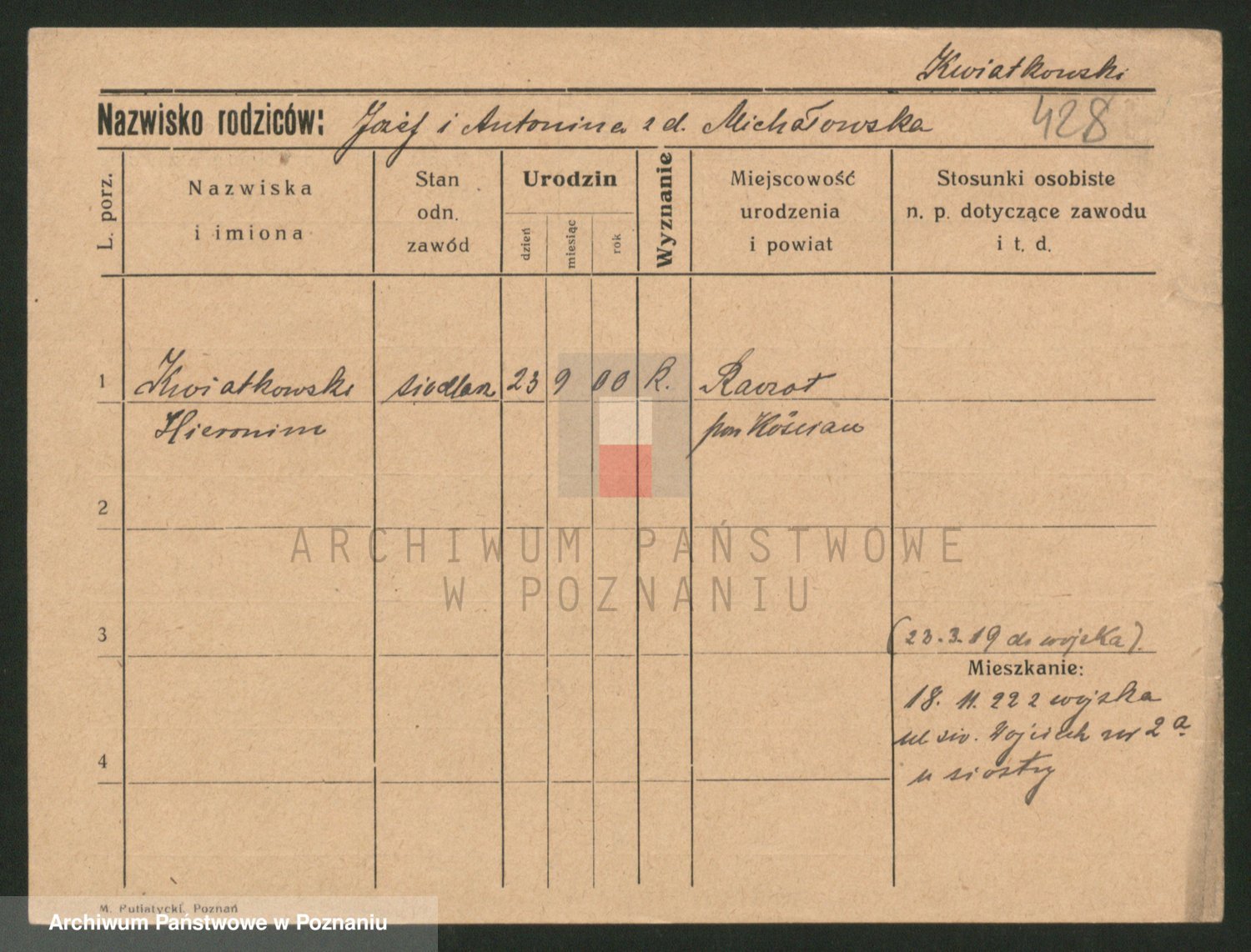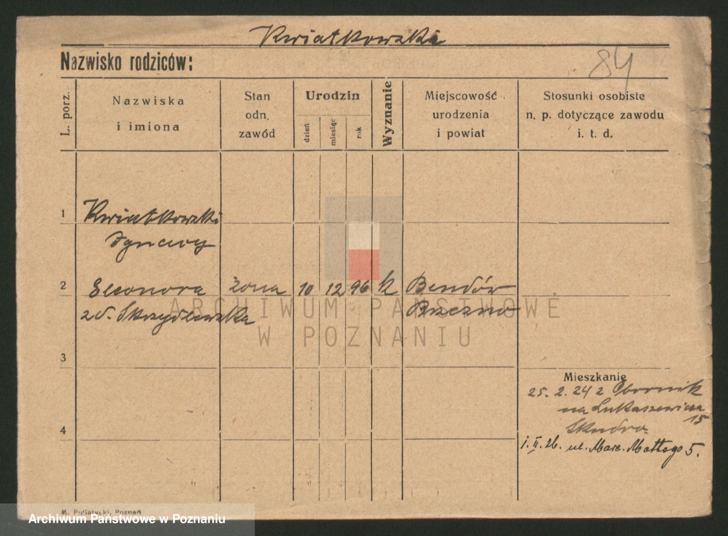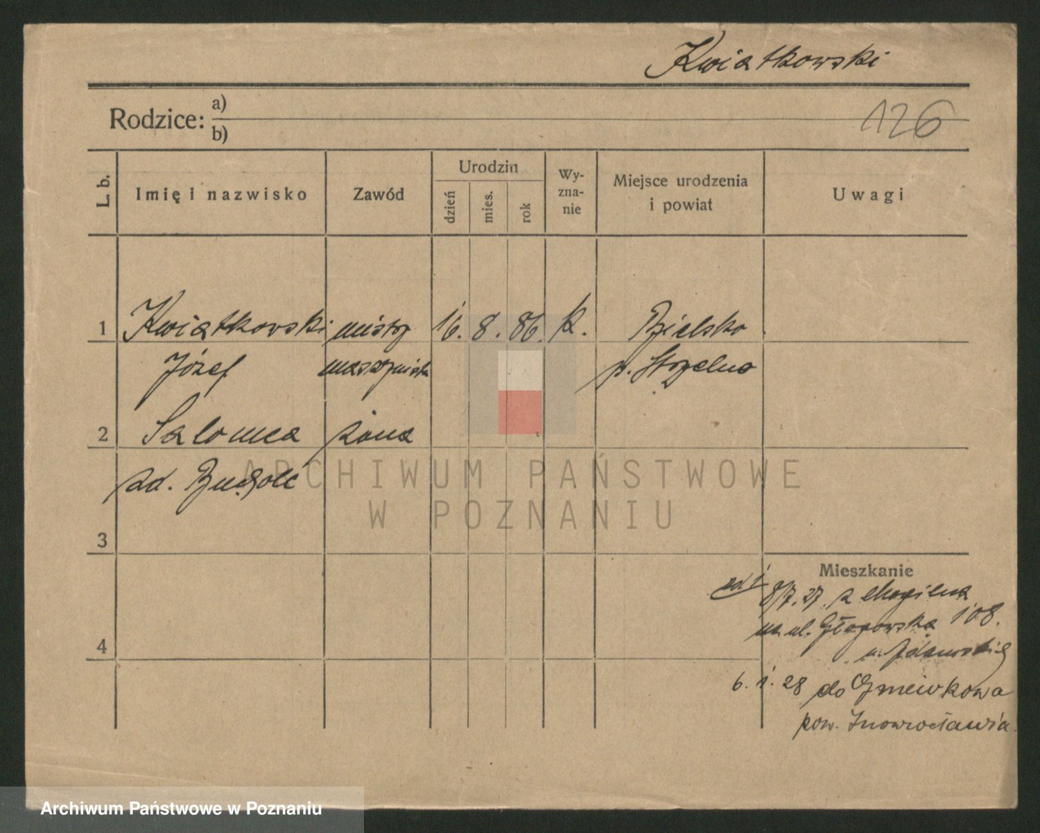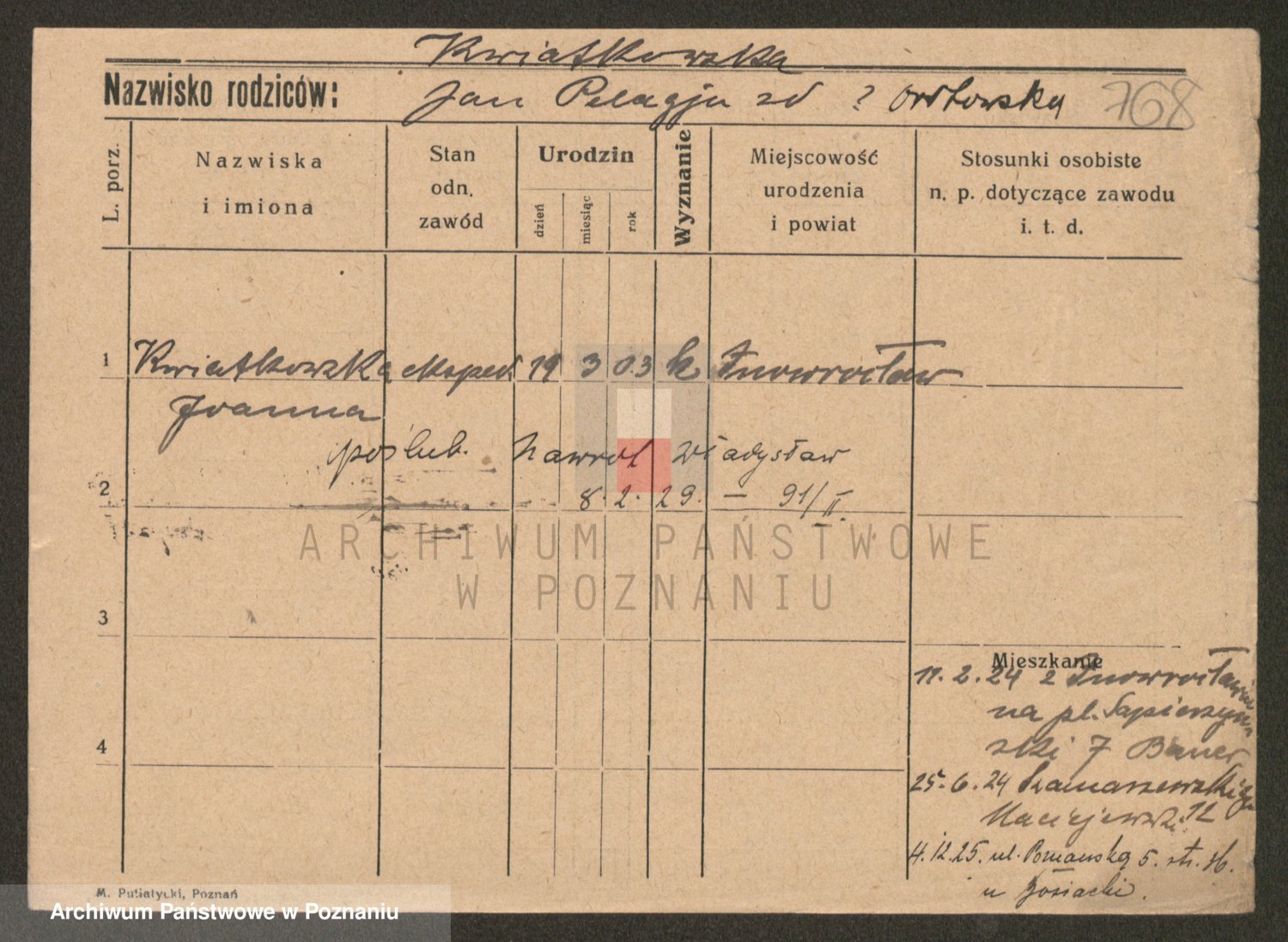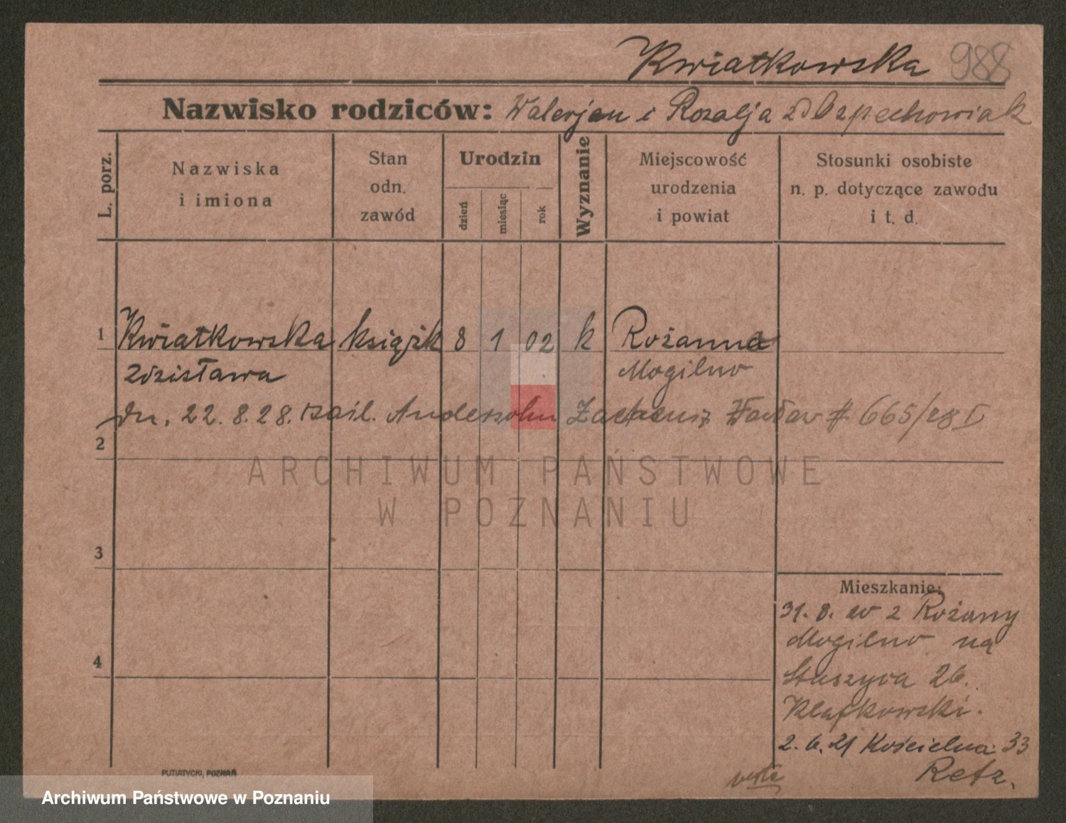 Podgląd karty osobowej dostępny jest po kliknięciu na nazwisko lub ikonkę karty. Można dokonywać powiększenia (ikony na górze) lub przechodzić między kolejnymi skanami (strzałki po bokach).