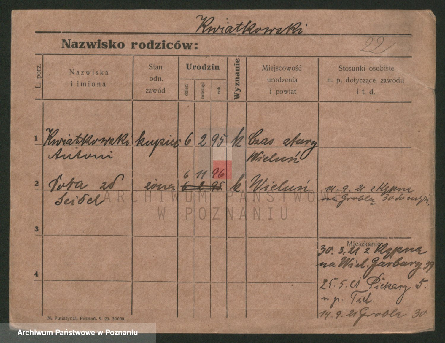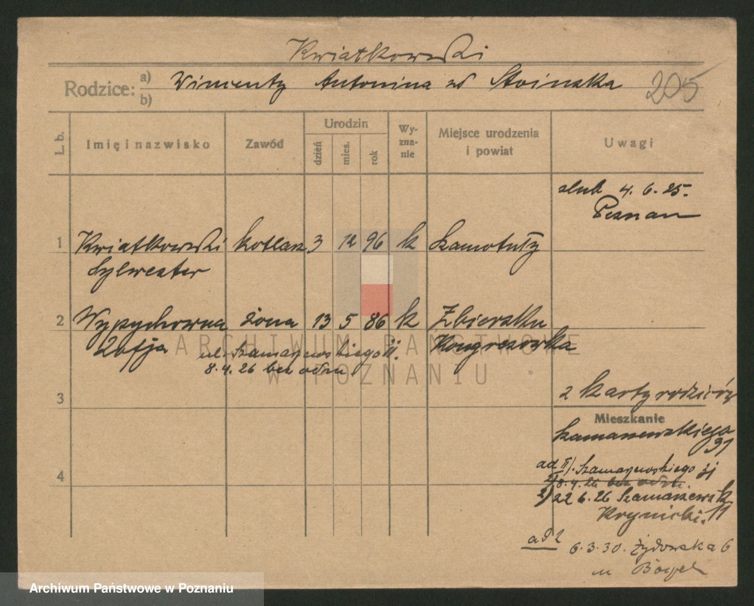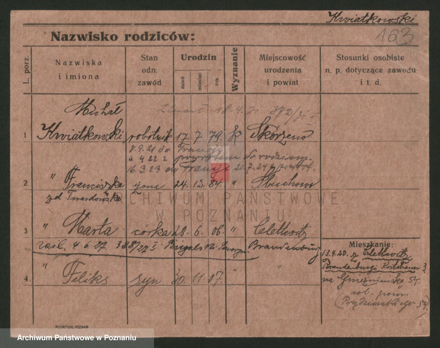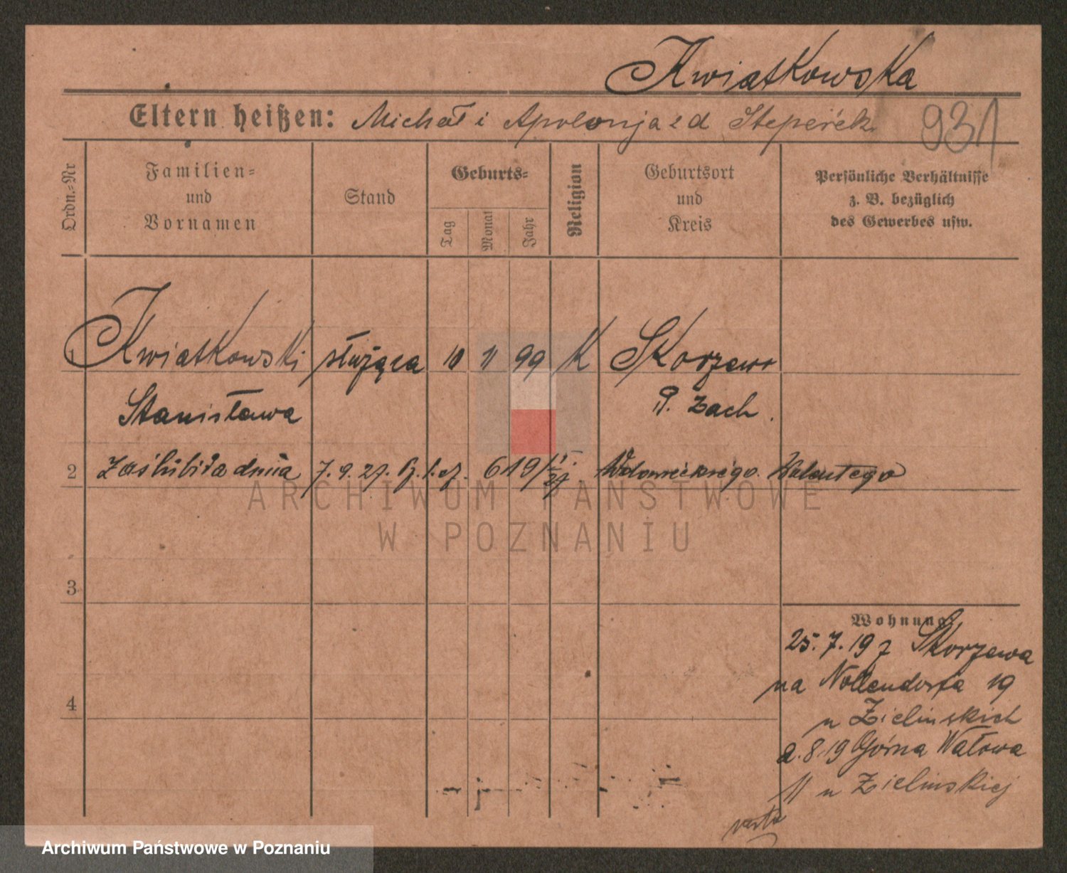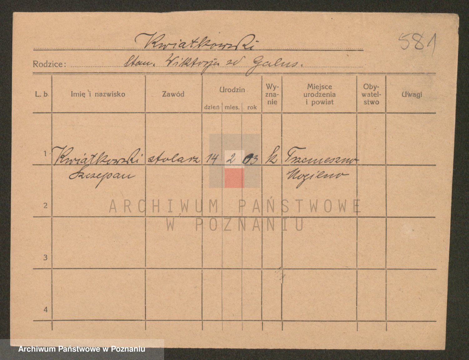 Podgląd karty osobowej dostępny jest po kliknięciu na nazwisko lub ikonkę karty. Można dokonywać powiększenia (ikony na górze) lub przechodzić między kolejnymi skanami (strzałki po bokach).