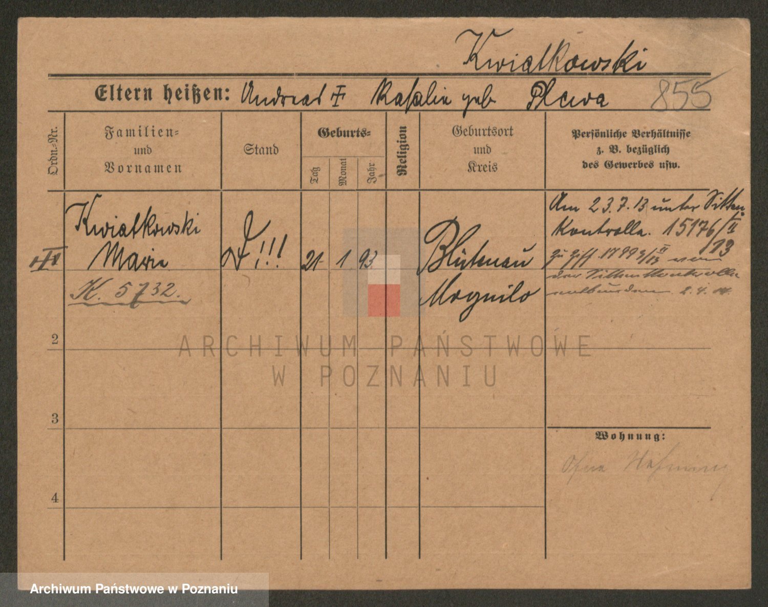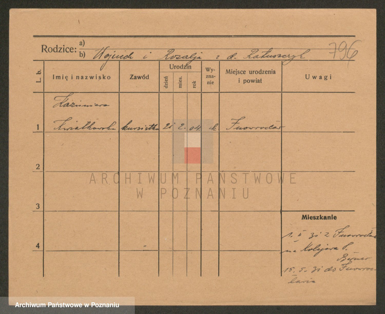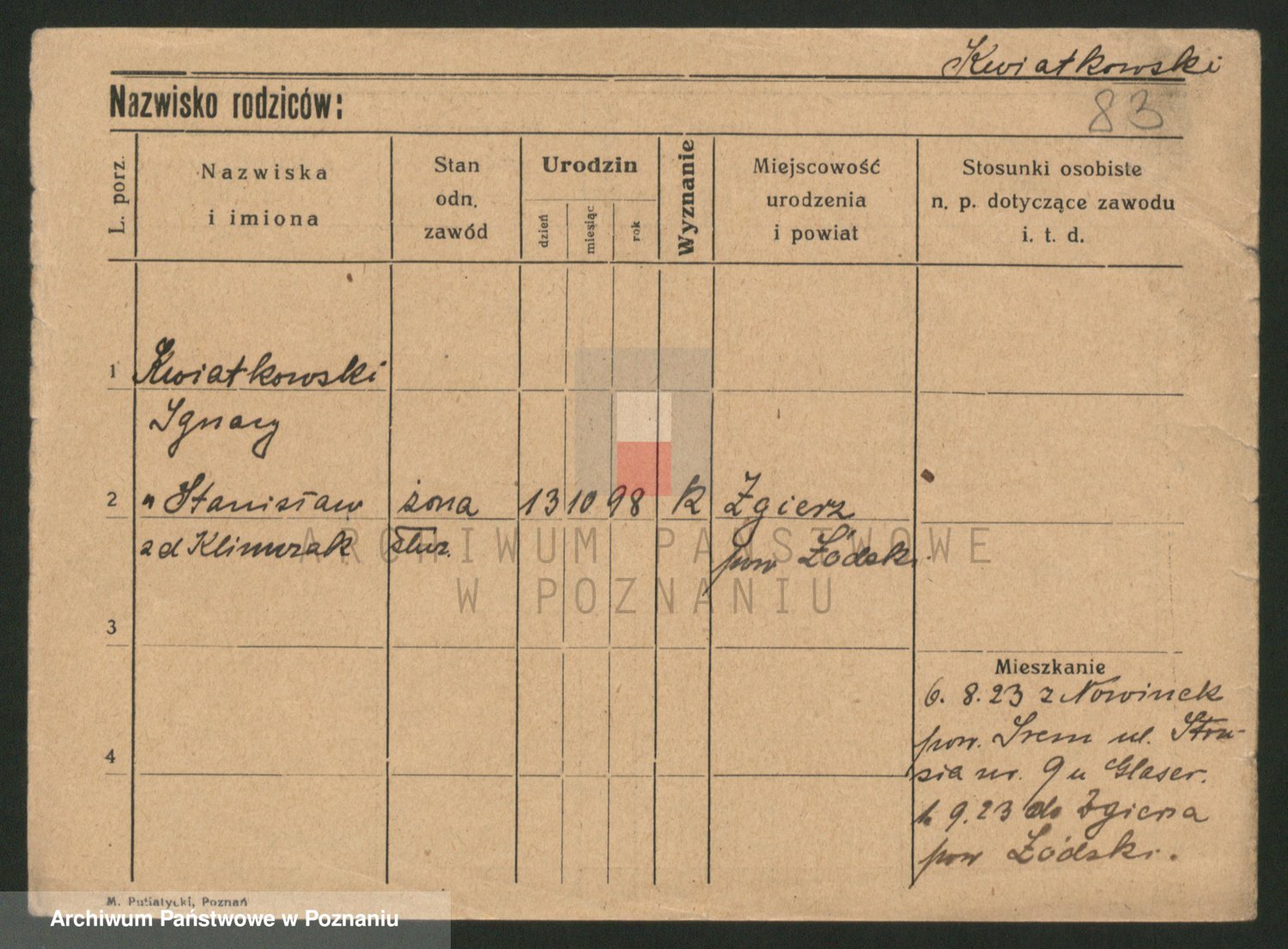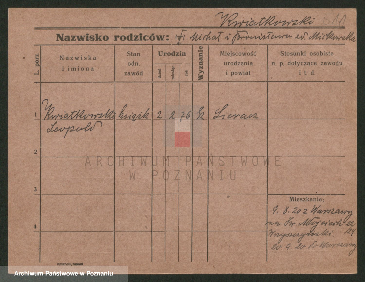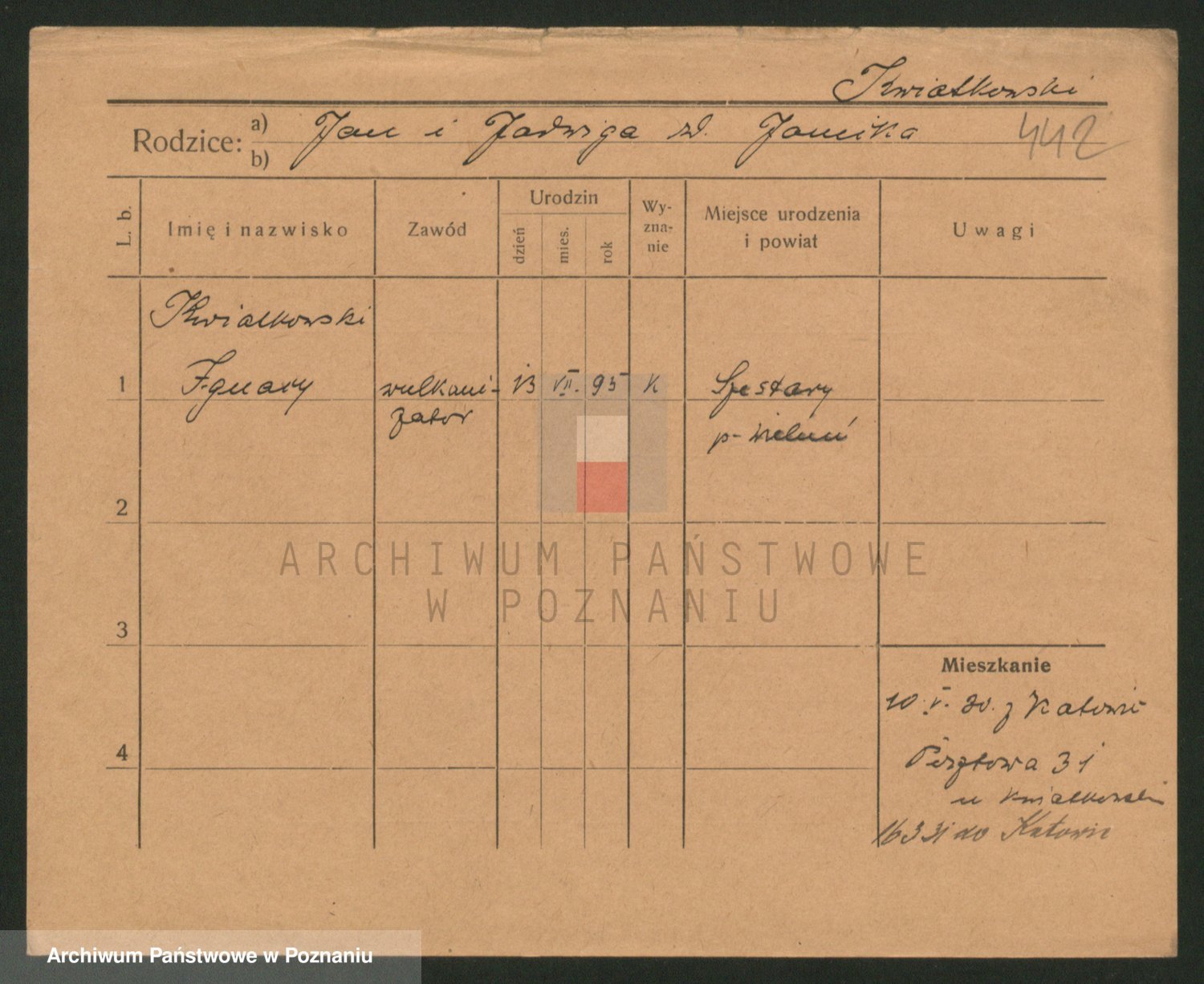 Podgląd karty osobowej dostępny jest po kliknięciu na nazwisko lub ikonkę karty. Można dokonywać powiększenia (ikony na górze) lub przechodzić między kolejnymi skanami (strzałki po bokach).