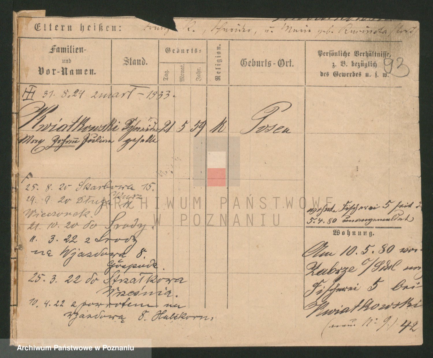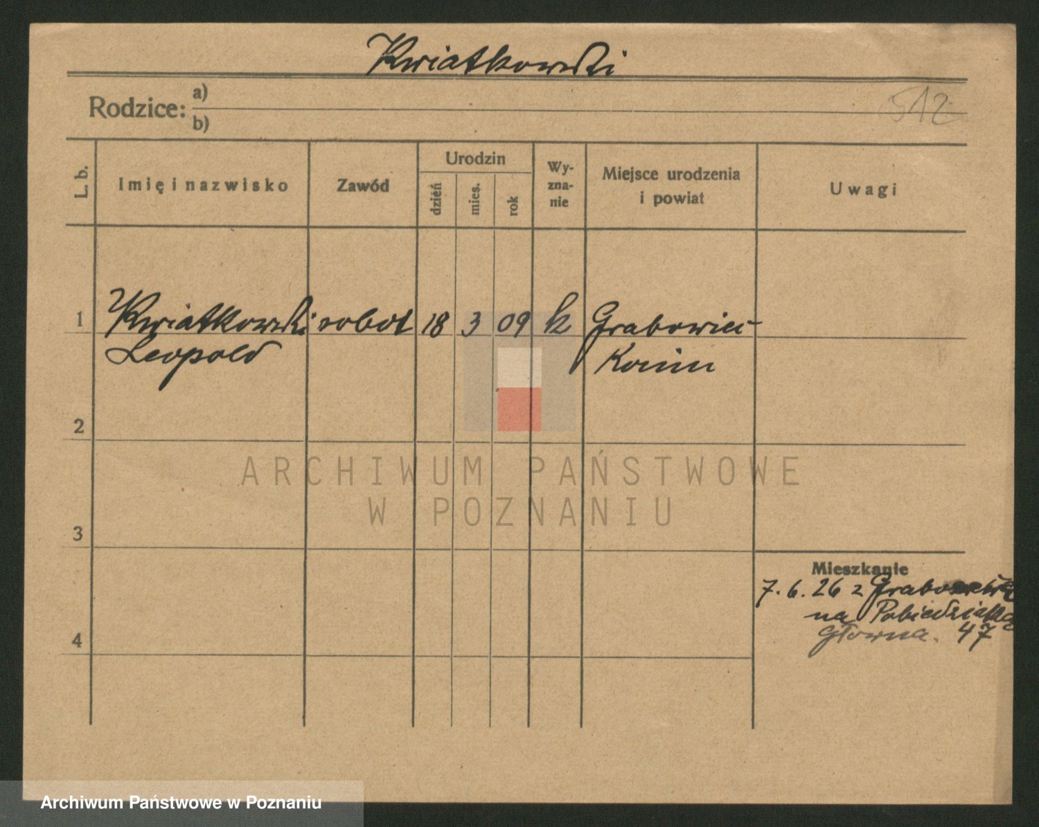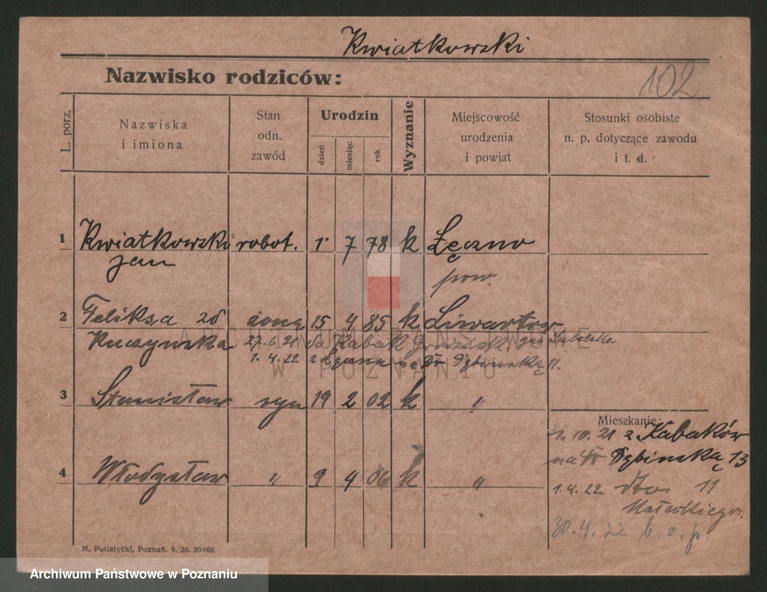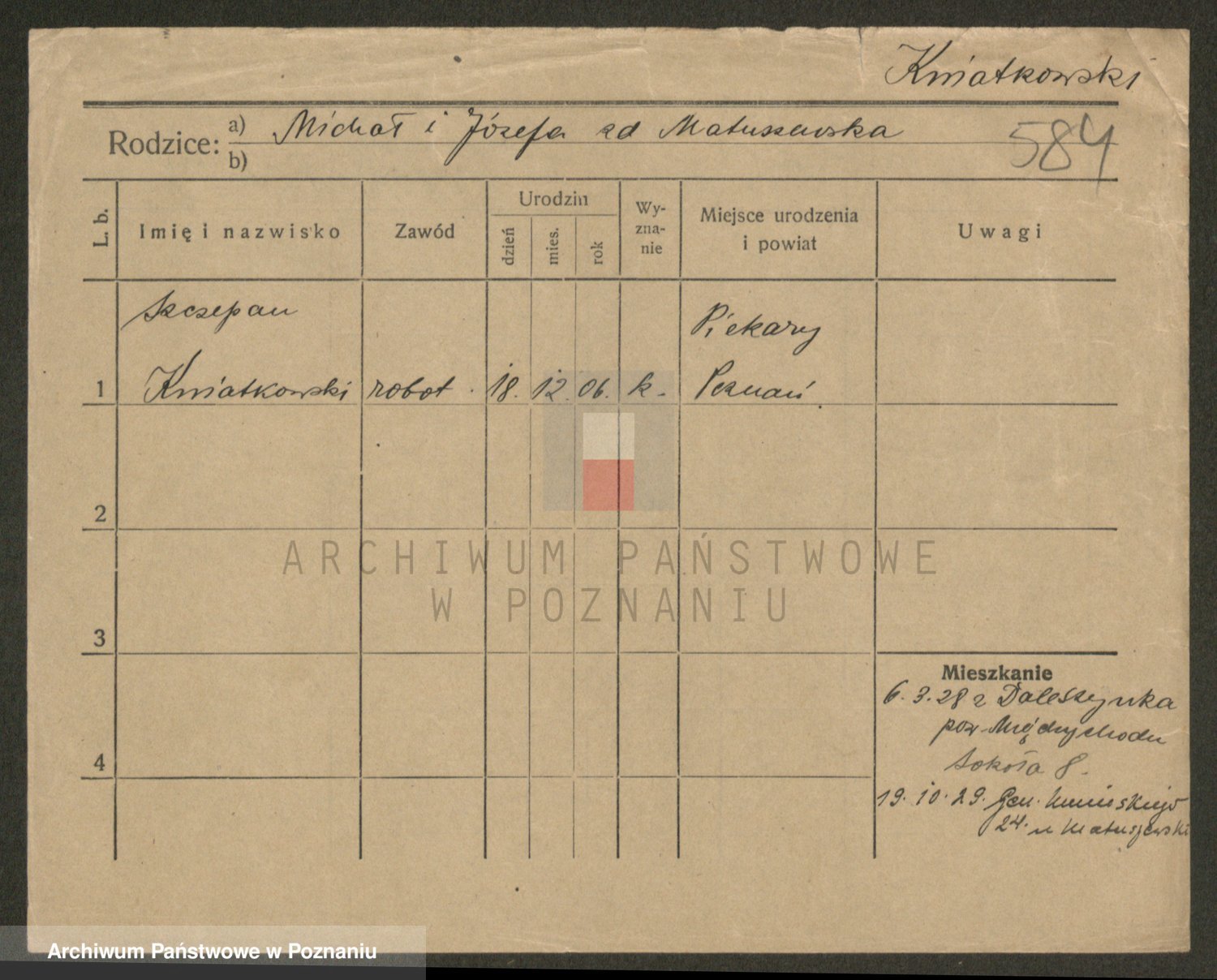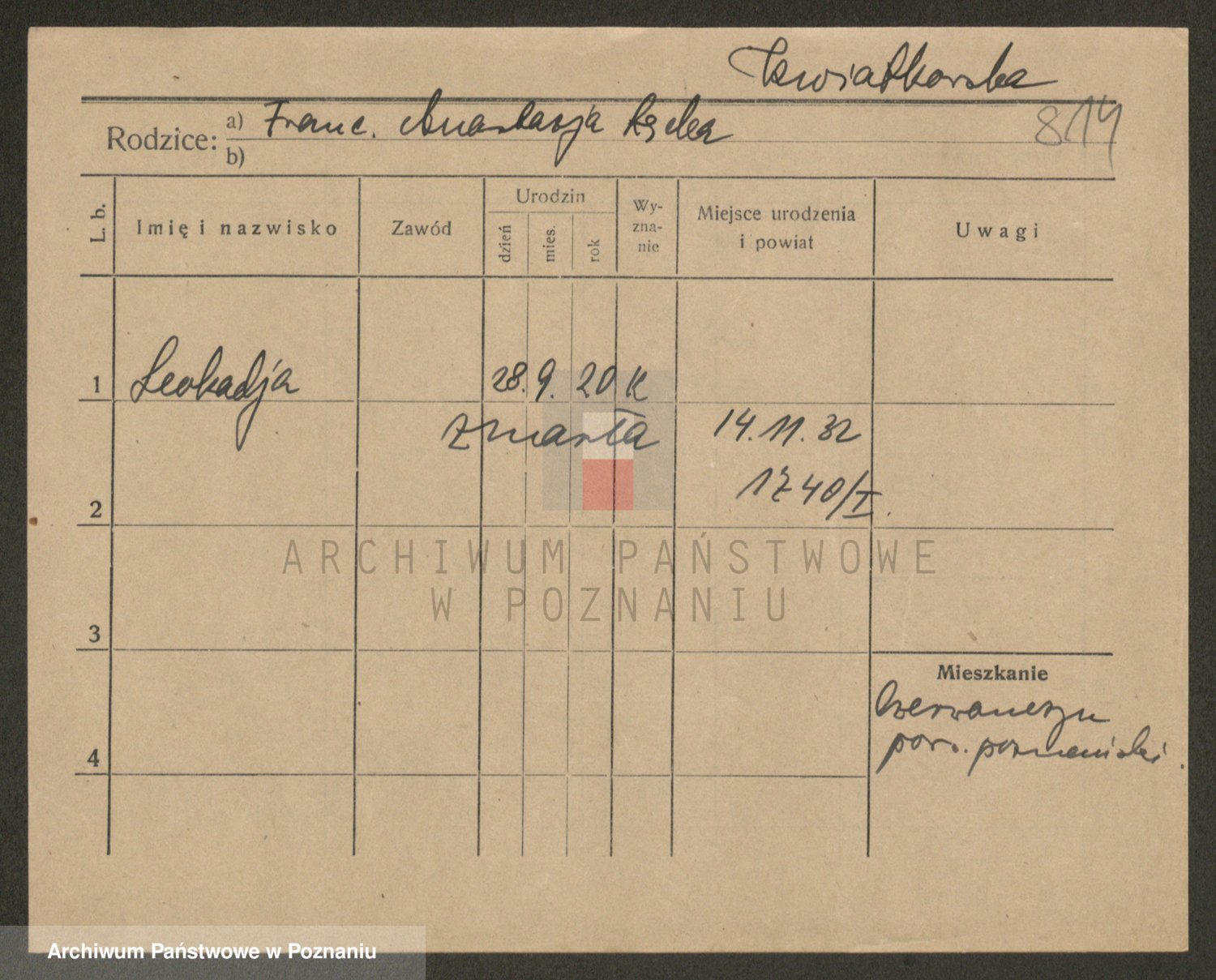 Podgląd karty osobowej dostępny jest po kliknięciu na nazwisko lub ikonkę karty. Można dokonywać powiększenia (ikony na górze) lub przechodzić między kolejnymi skanami (strzałki po bokach).
