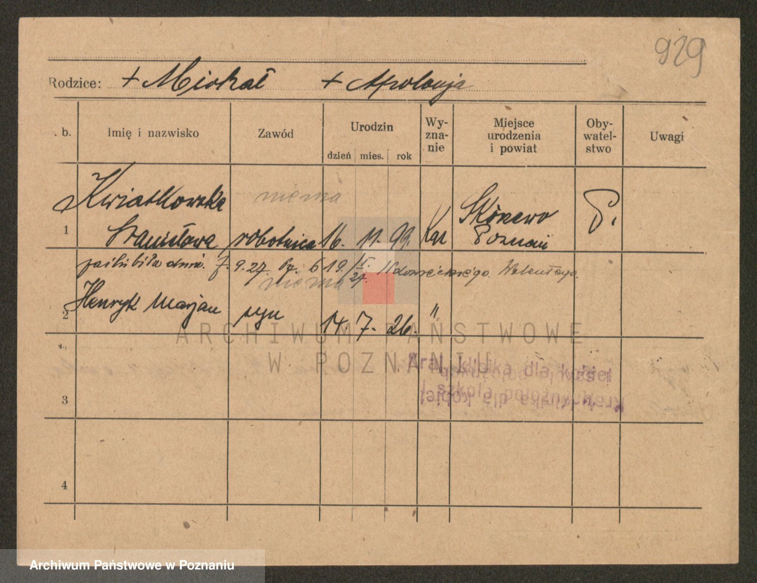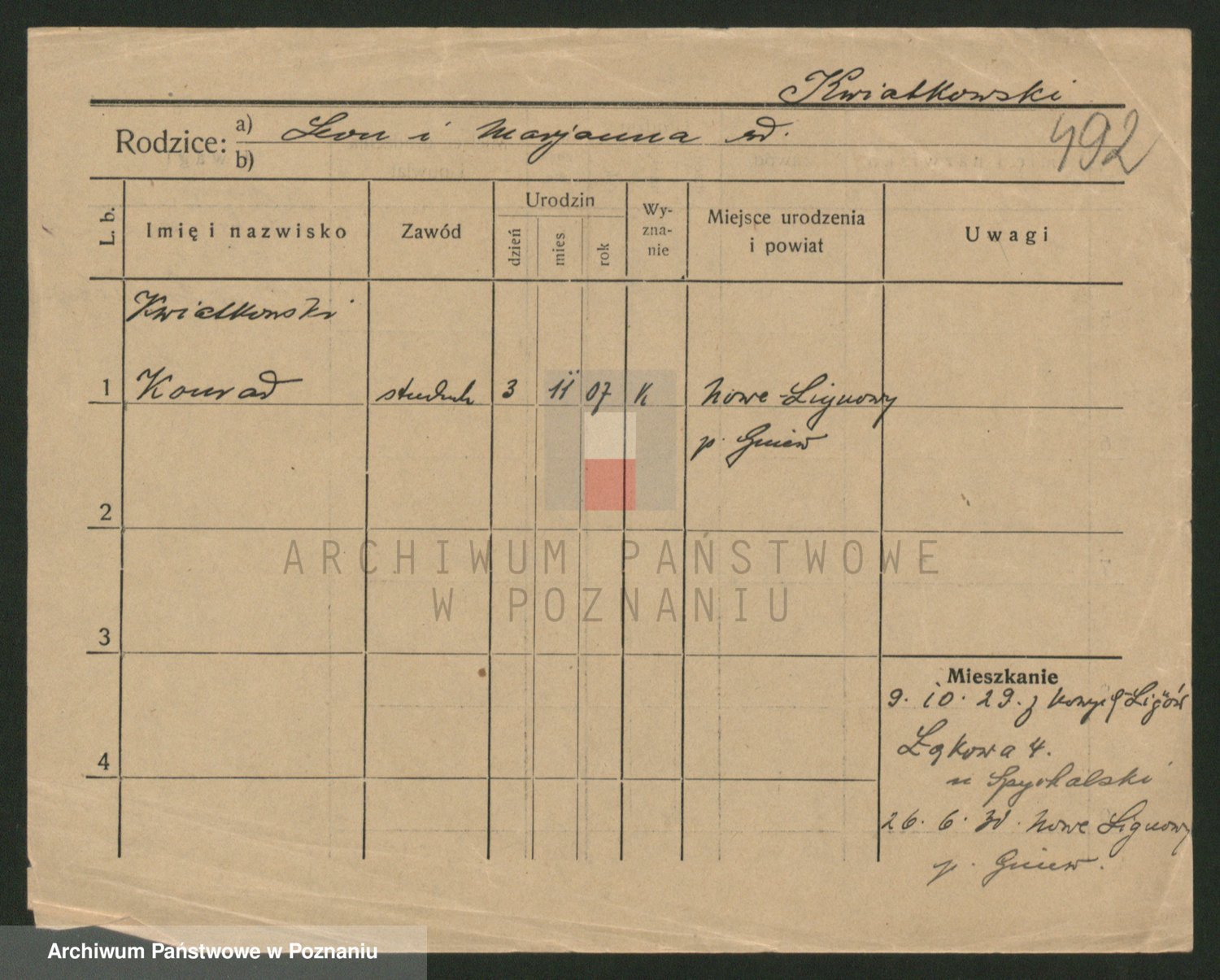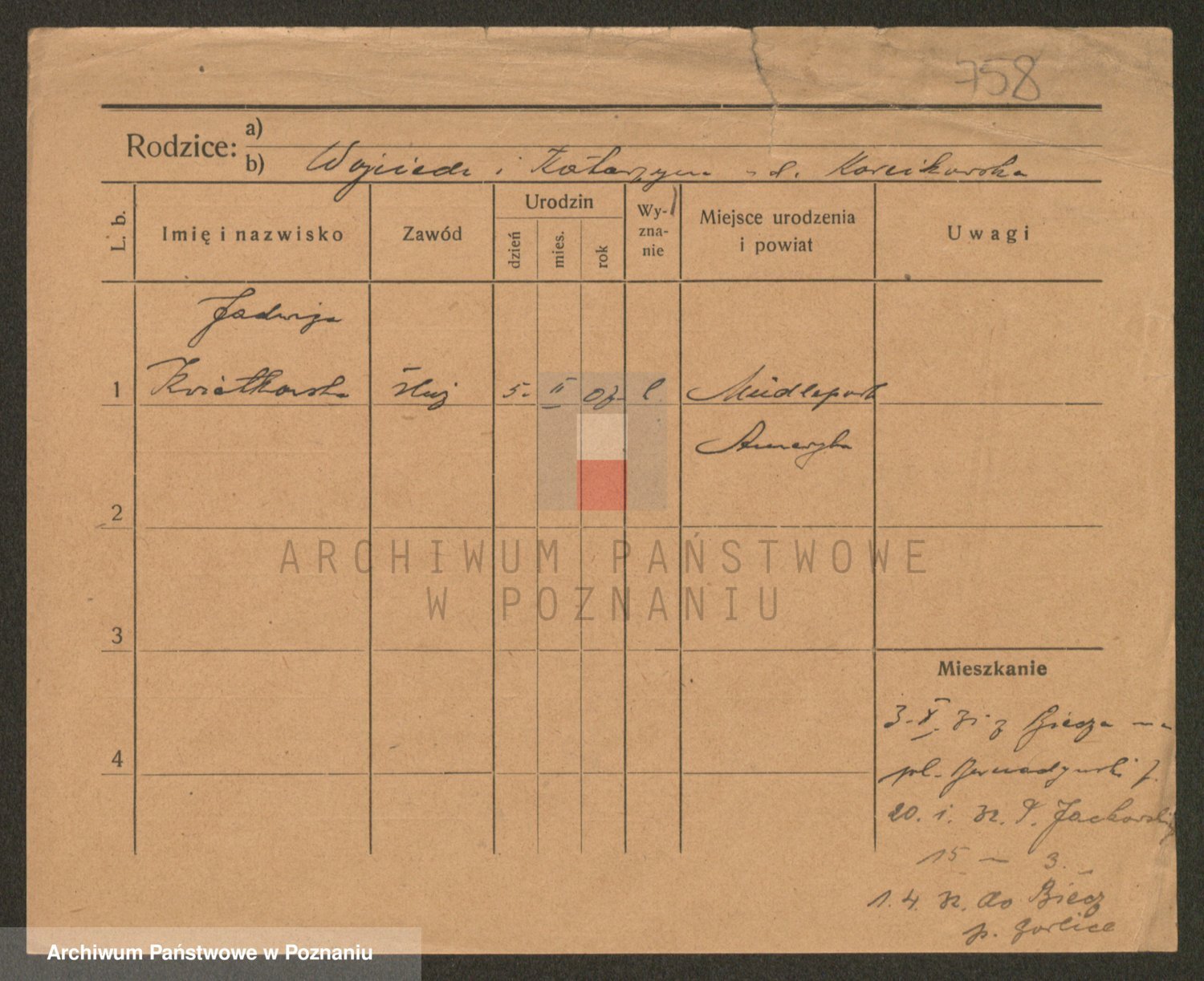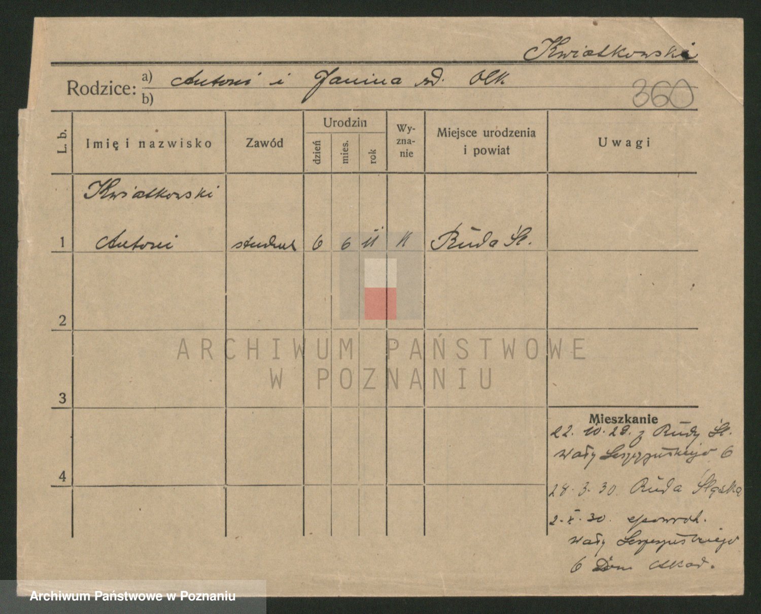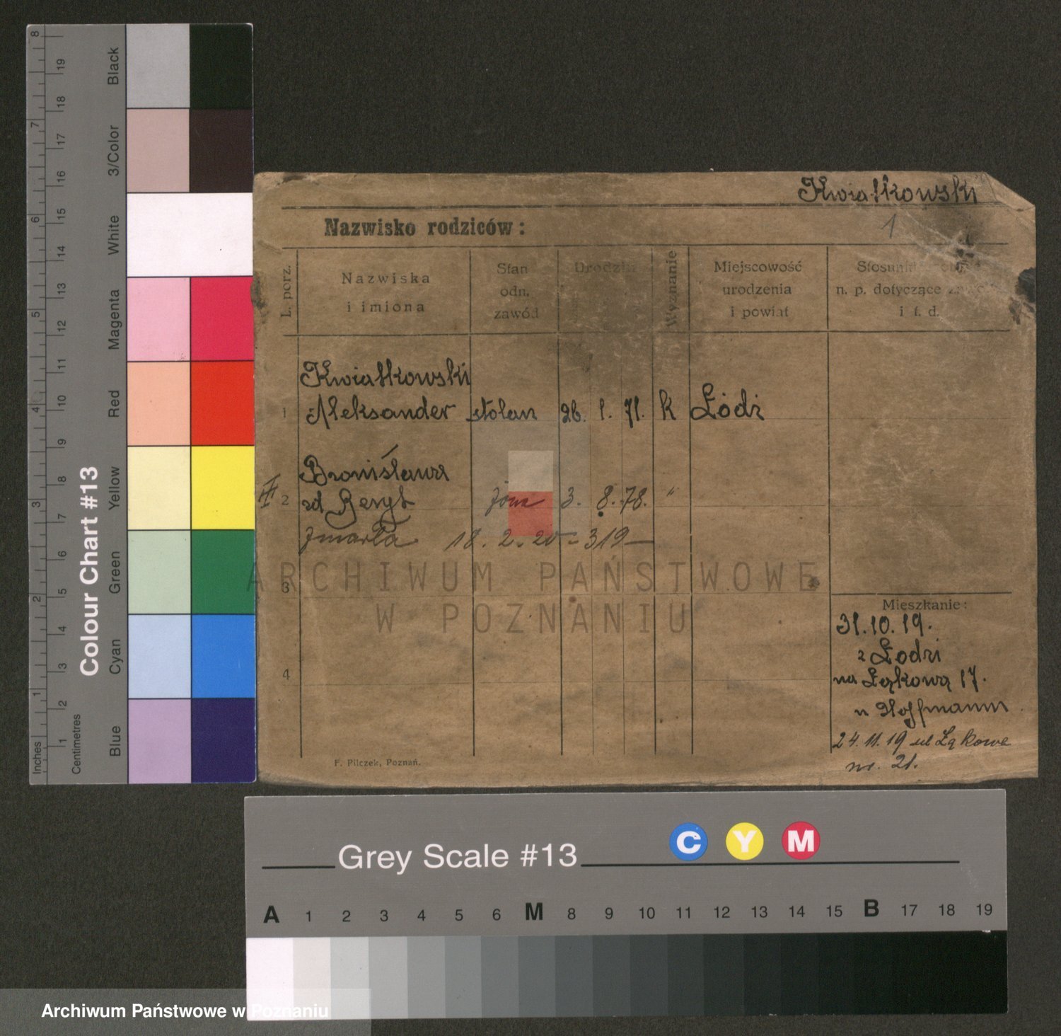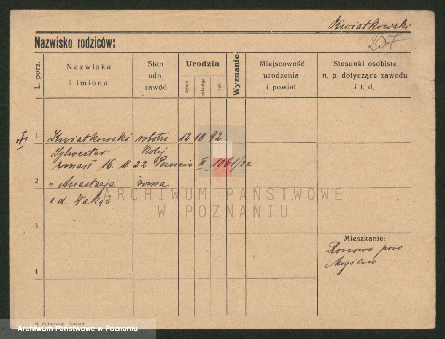 Podgląd karty osobowej dostępny jest po kliknięciu na nazwisko lub ikonkę karty. Można dokonywać powiększenia (ikony na górze) lub przechodzić między kolejnymi skanami (strzałki po bokach).