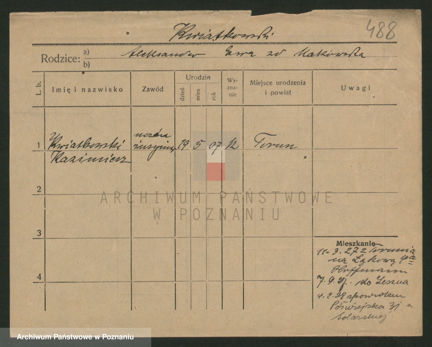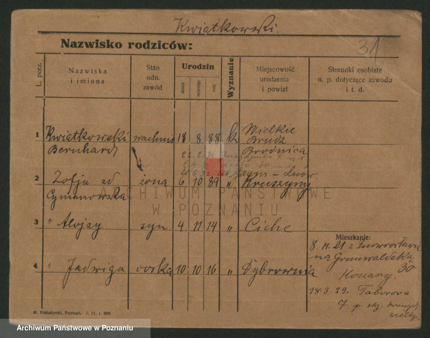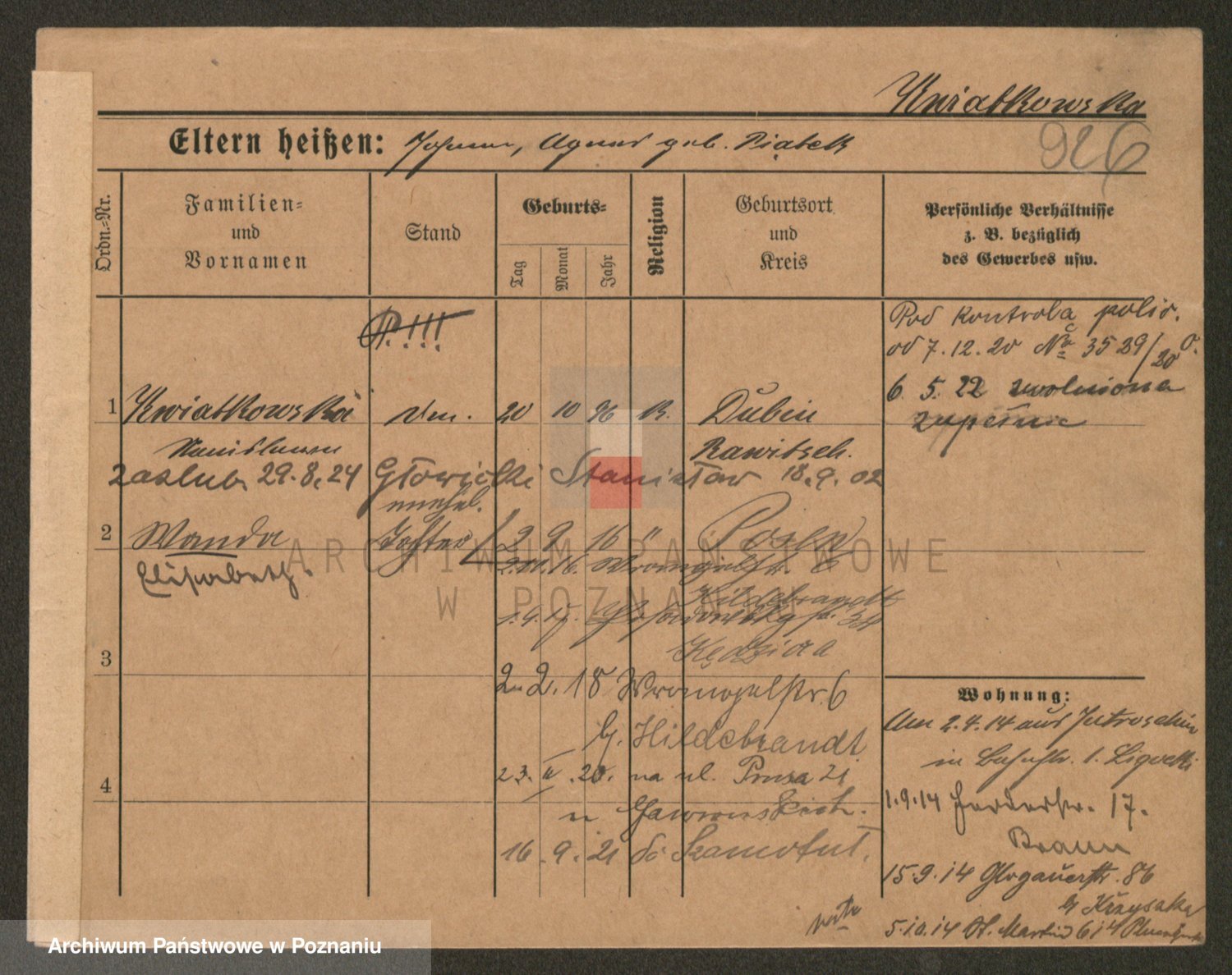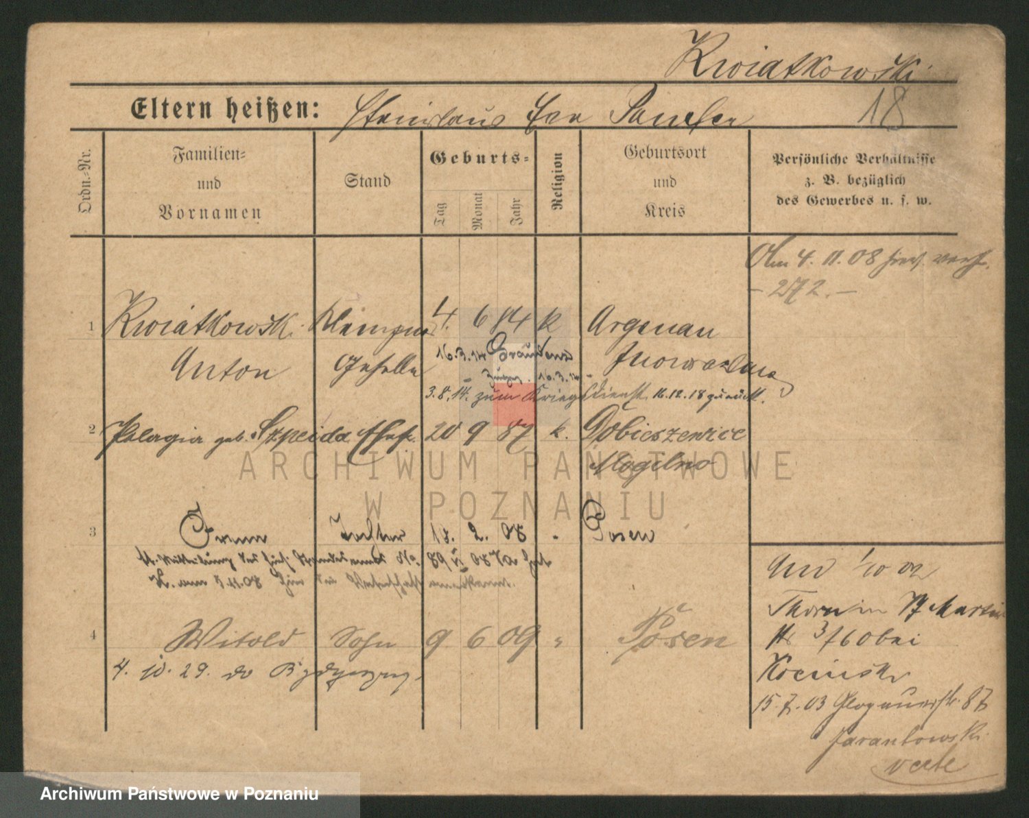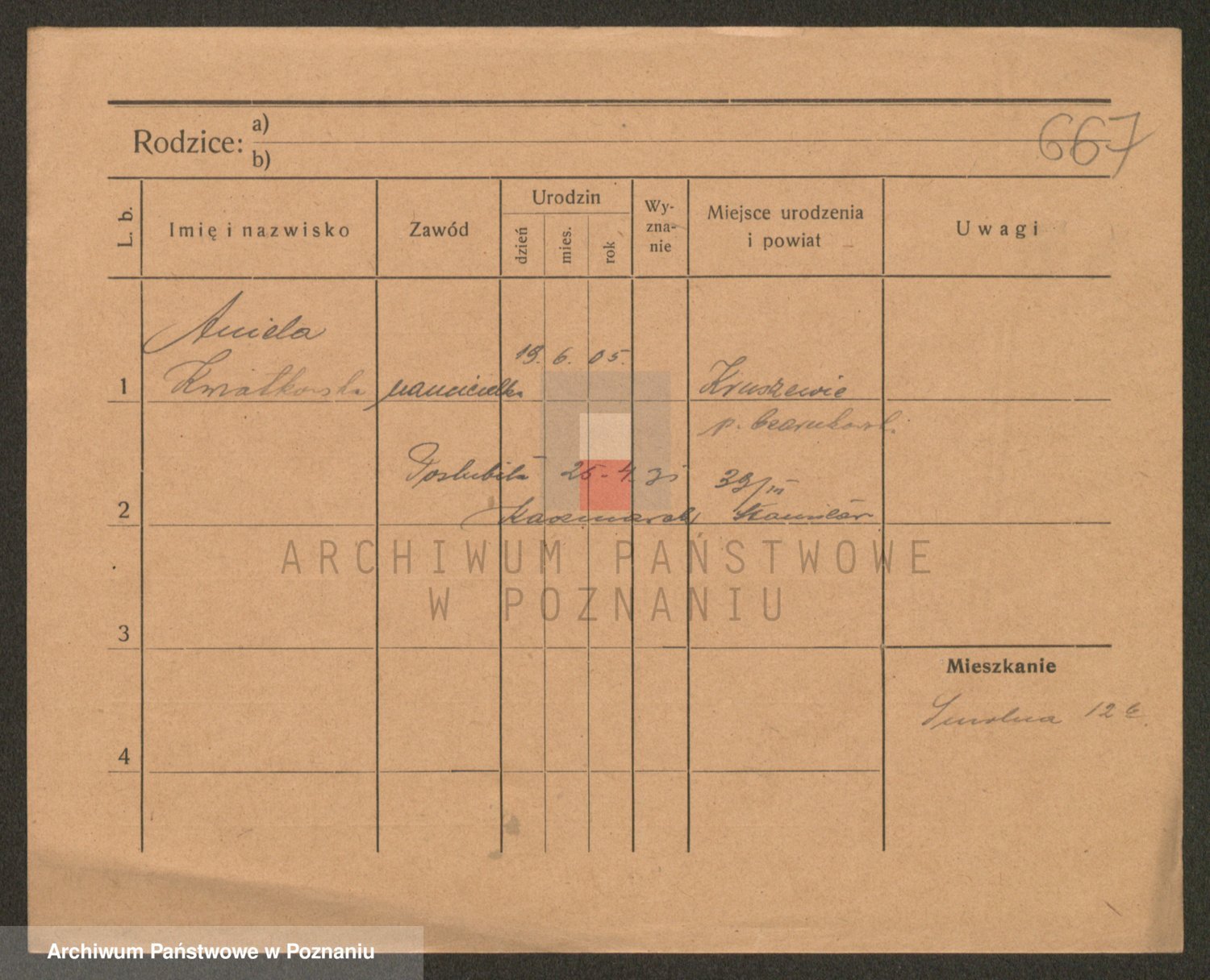 Podgląd karty osobowej dostępny jest po kliknięciu na nazwisko lub ikonkę karty. Można dokonywać powiększenia (ikony na górze) lub przechodzić między kolejnymi skanami (strzałki po bokach).