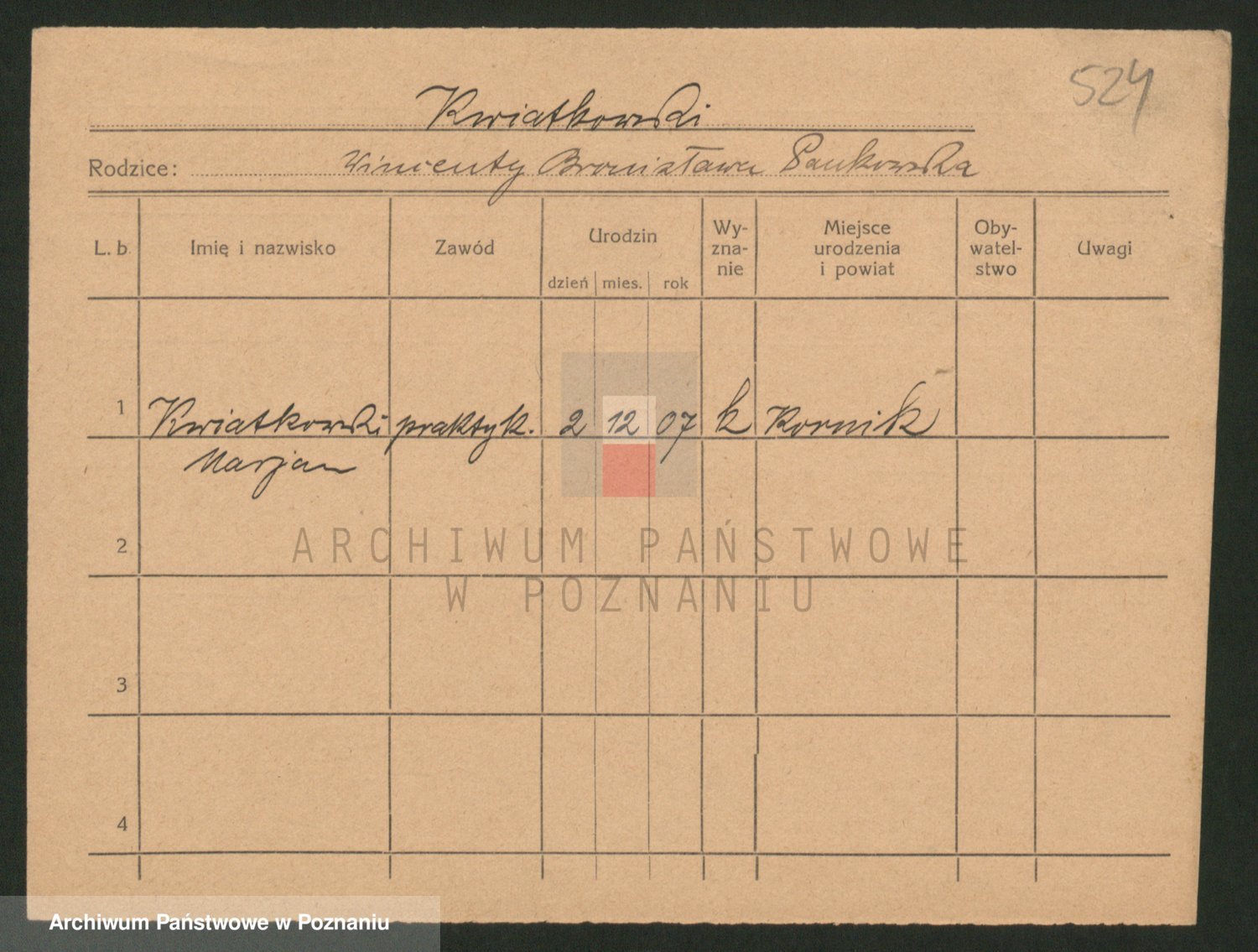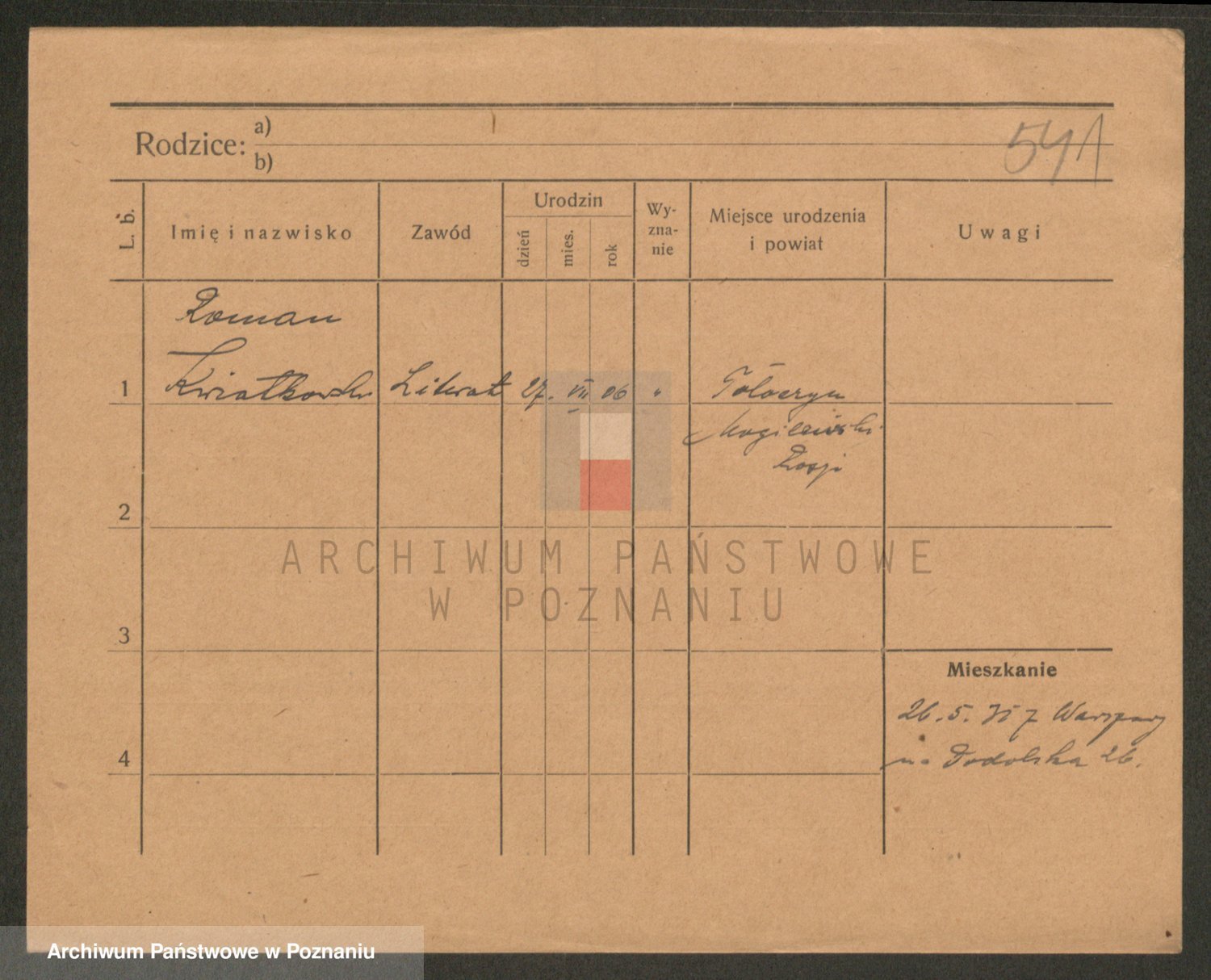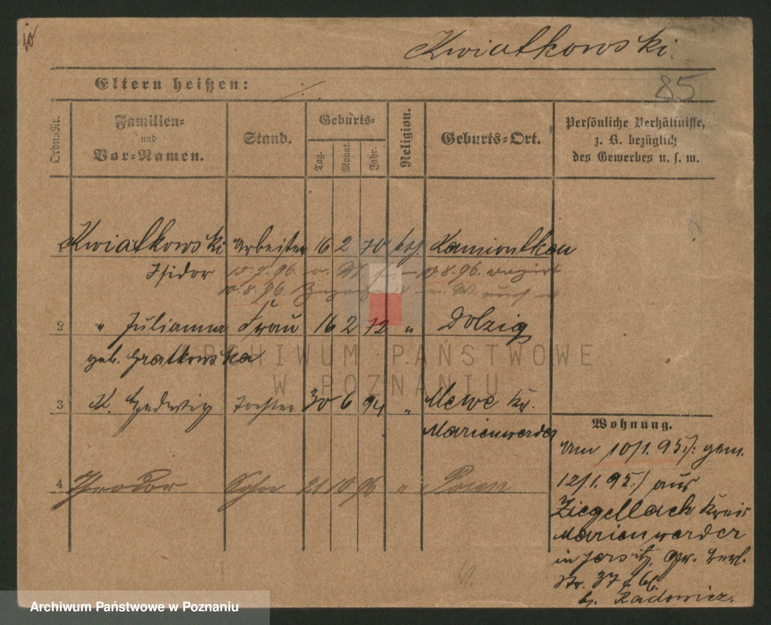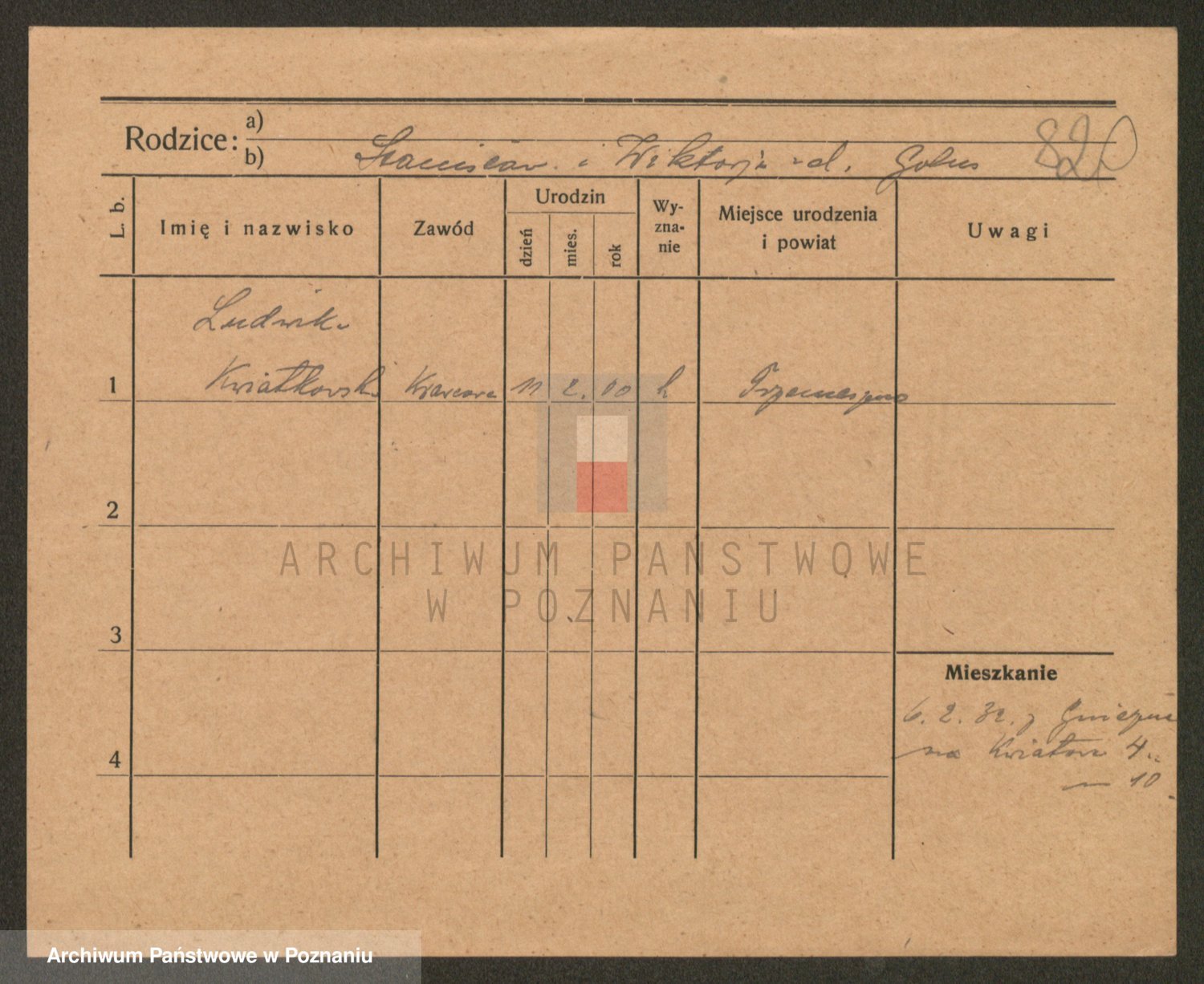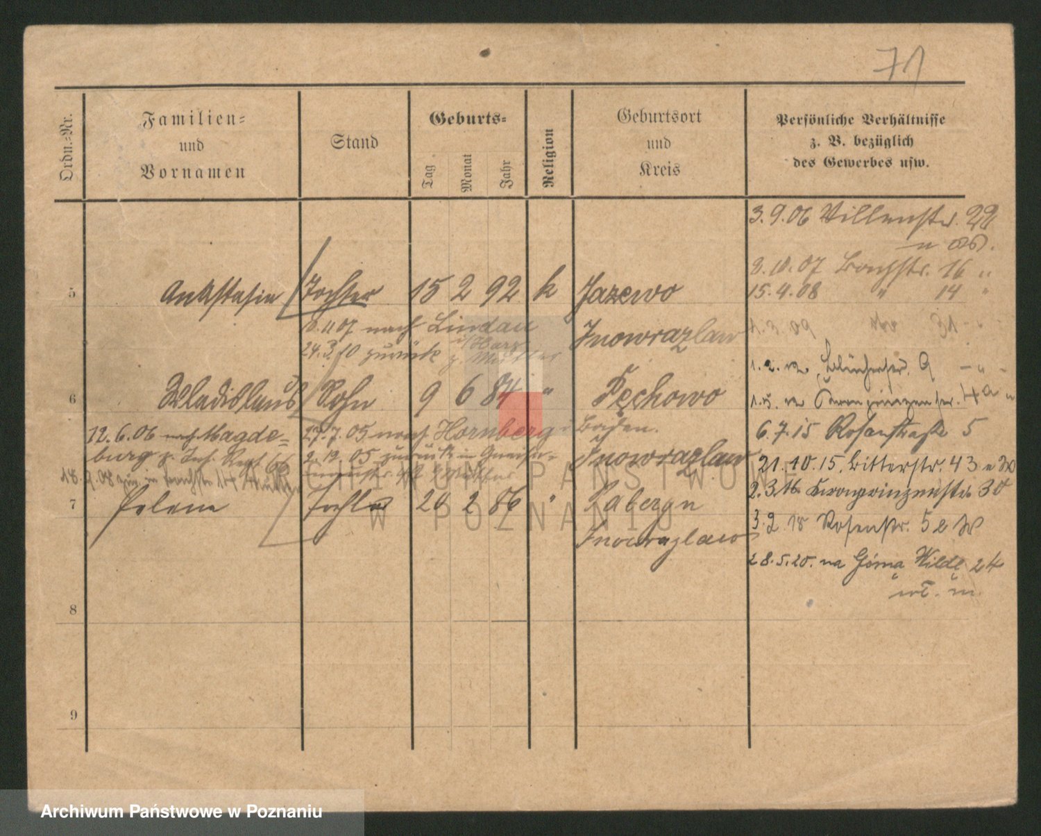 Podgląd karty osobowej dostępny jest po kliknięciu na nazwisko lub ikonkę karty. Można dokonywać powiększenia (ikony na górze) lub przechodzić między kolejnymi skanami (strzałki po bokach).