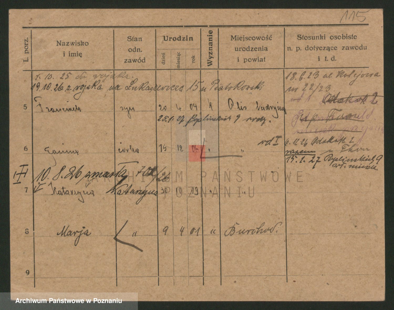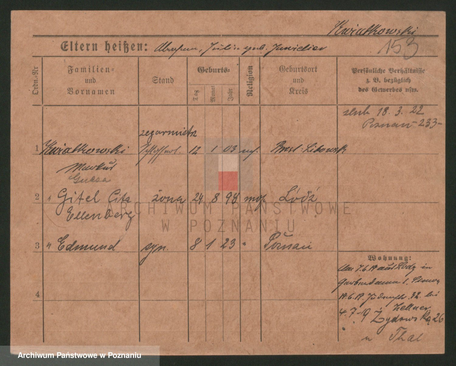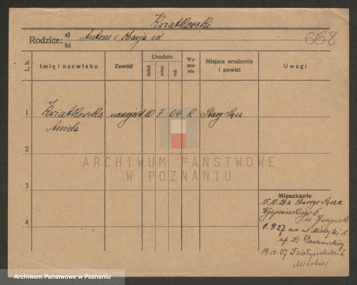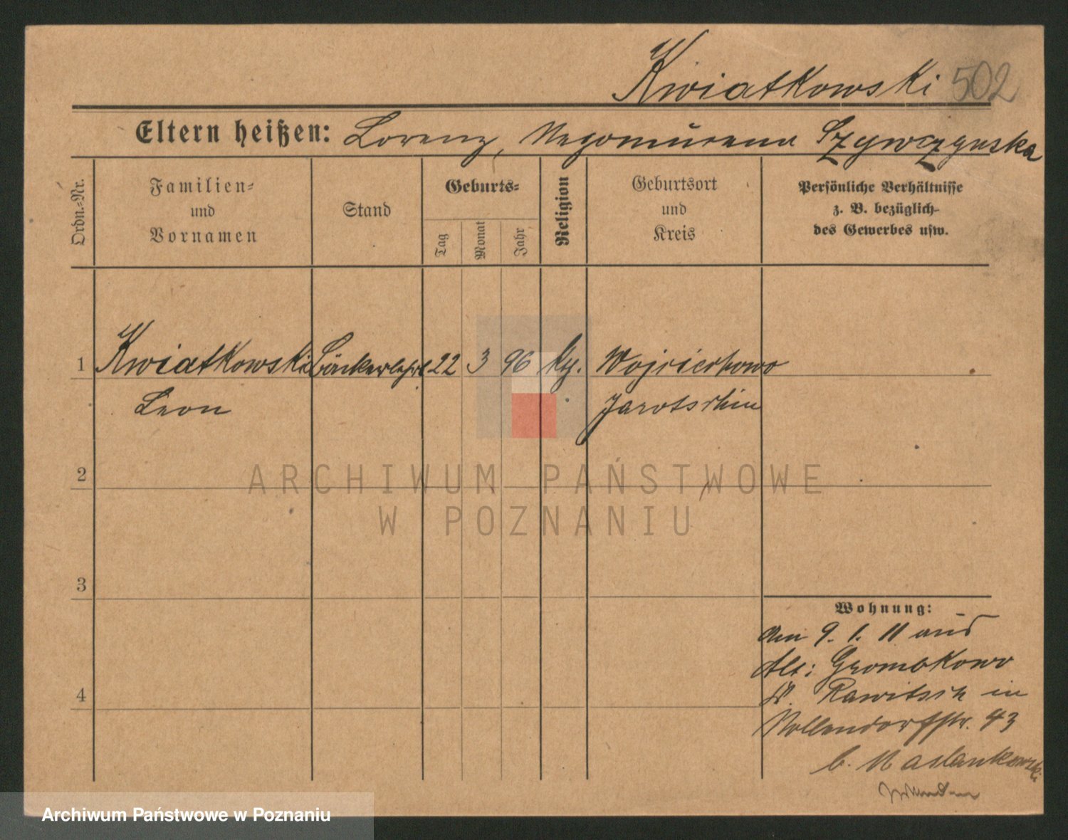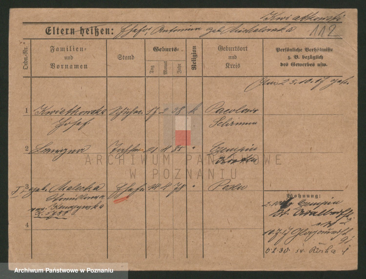 Podgląd karty osobowej dostępny jest po kliknięciu na nazwisko lub ikonkę karty. Można dokonywać powiększenia (ikony na górze) lub przechodzić między kolejnymi skanami (strzałki po bokach).