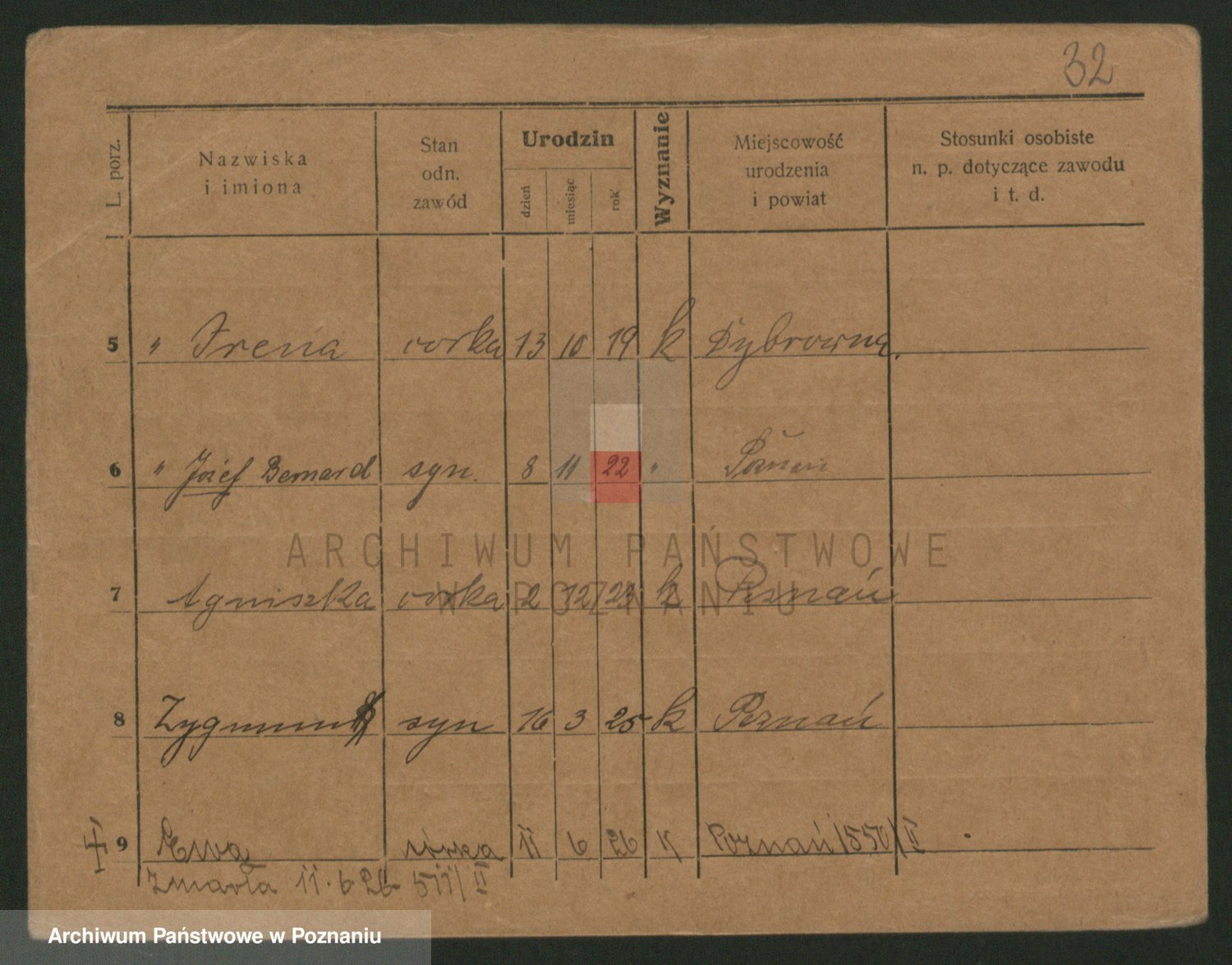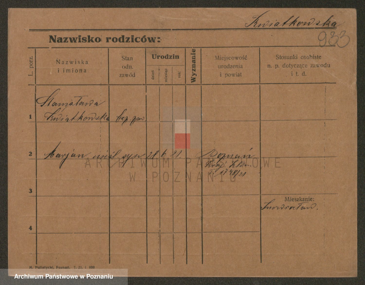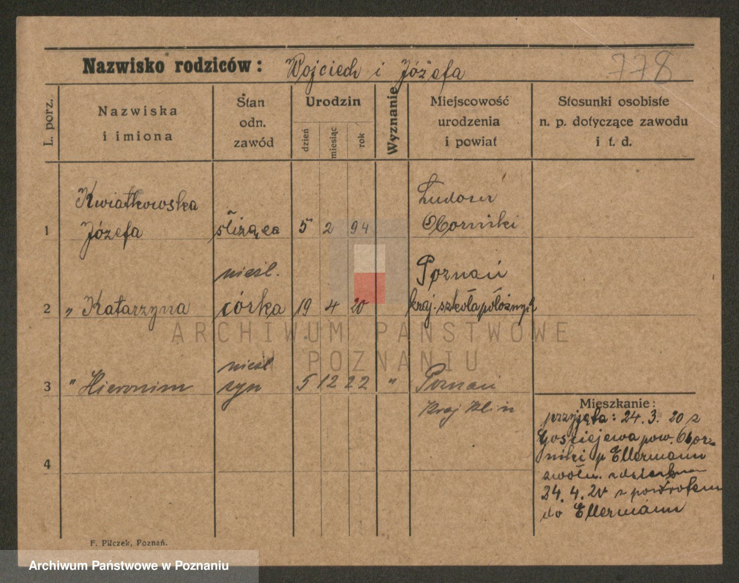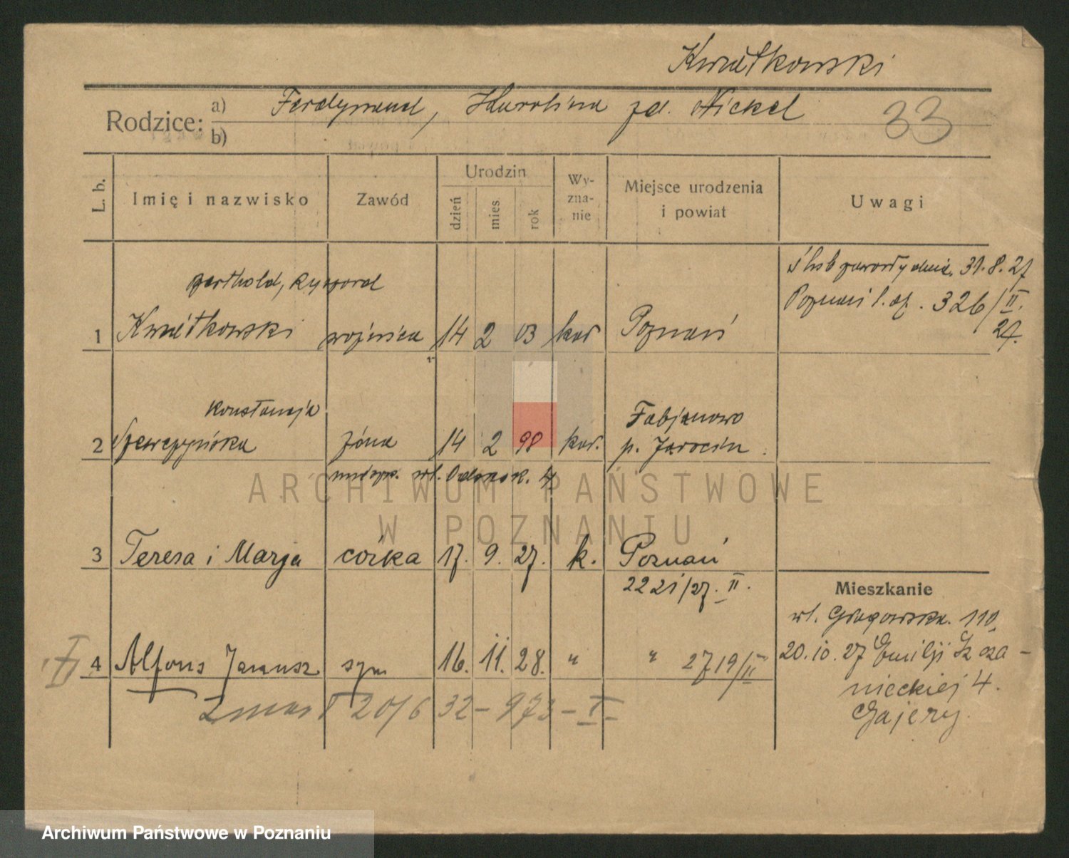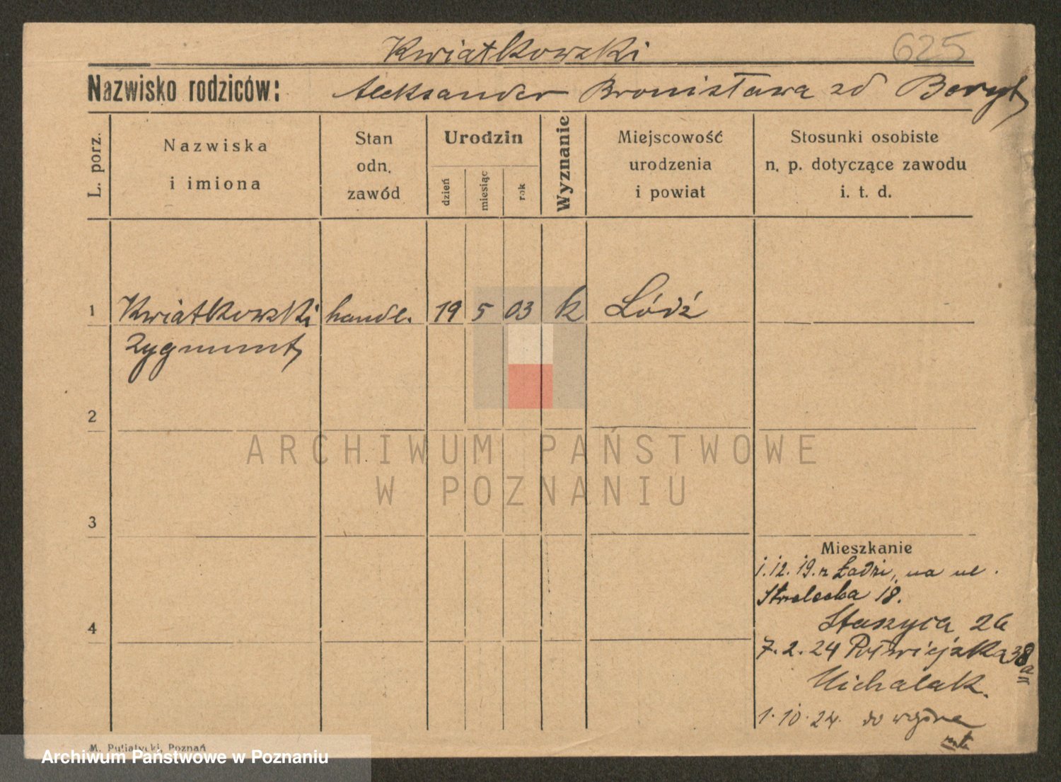 Podgląd karty osobowej dostępny jest po kliknięciu na nazwisko lub ikonkę karty. Można dokonywać powiększenia (ikony na górze) lub przechodzić między kolejnymi skanami (strzałki po bokach).