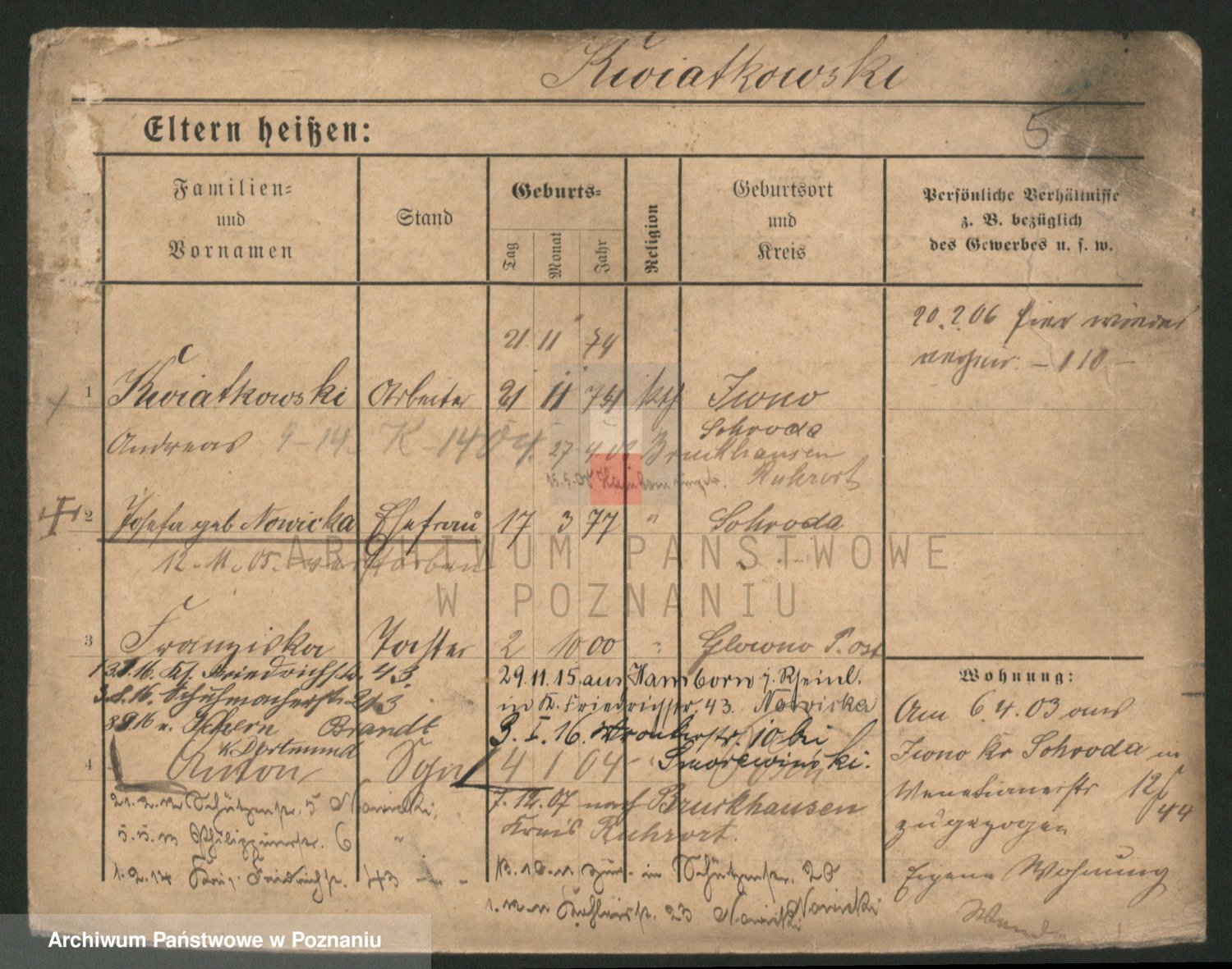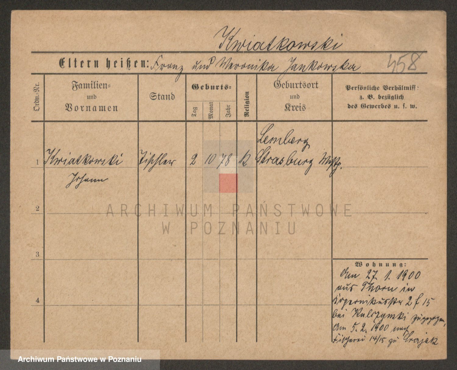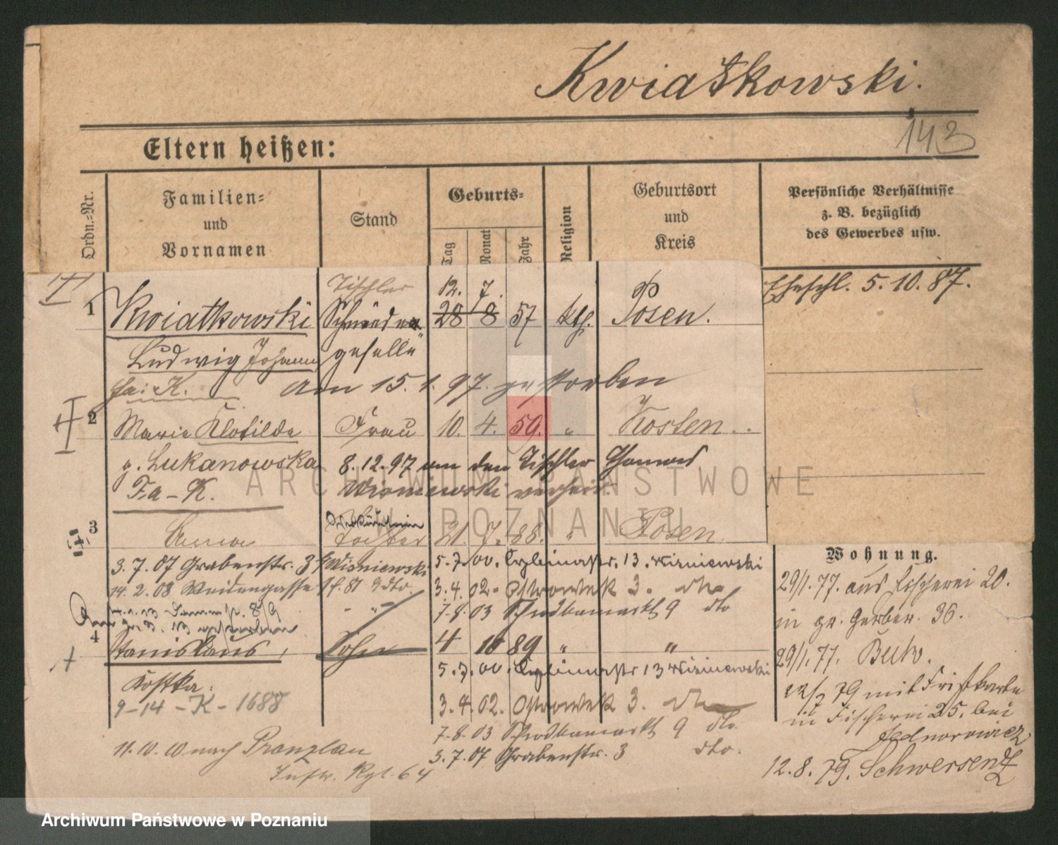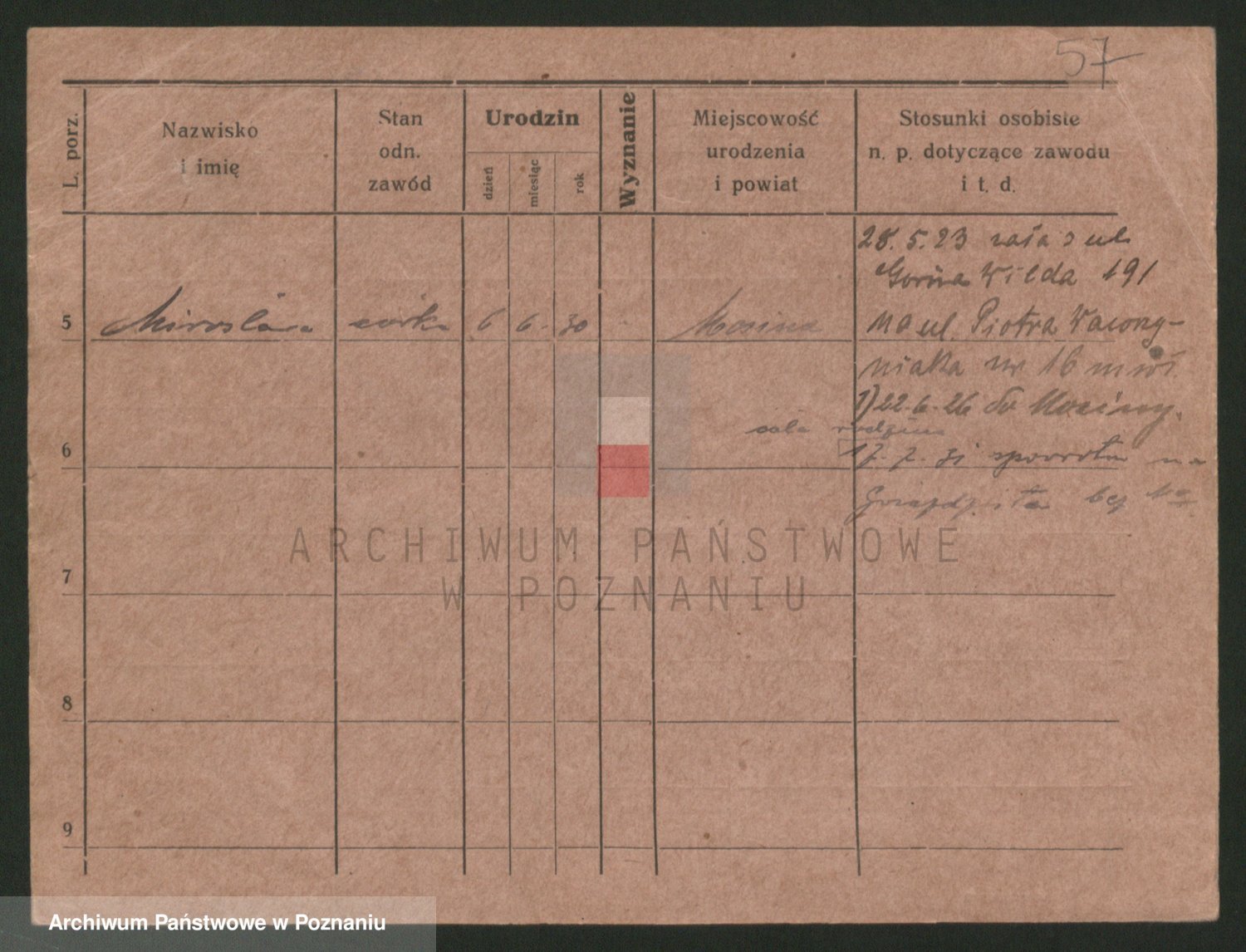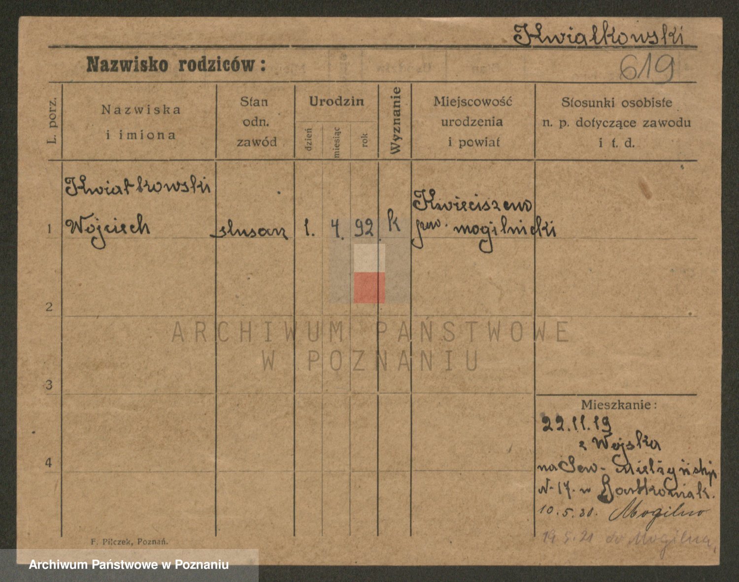 Podgląd karty osobowej dostępny jest po kliknięciu na nazwisko lub ikonkę karty. Można dokonywać powiększenia (ikony na górze) lub przechodzić między kolejnymi skanami (strzałki po bokach).