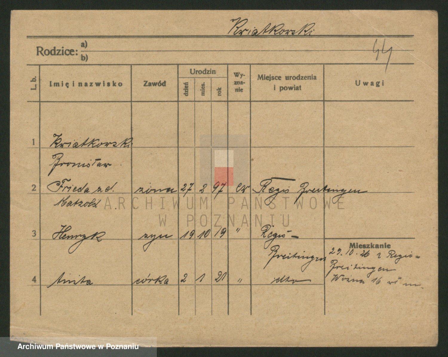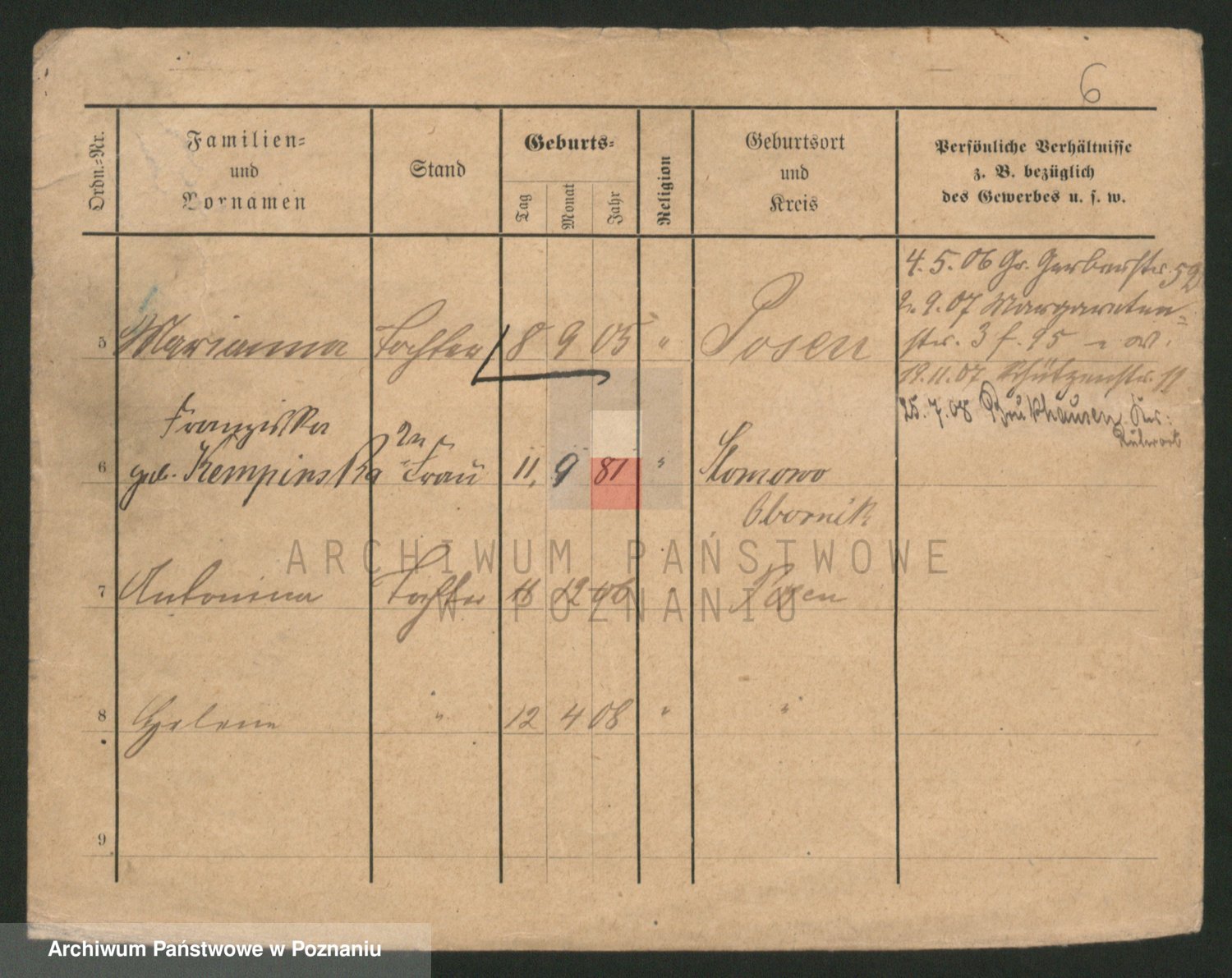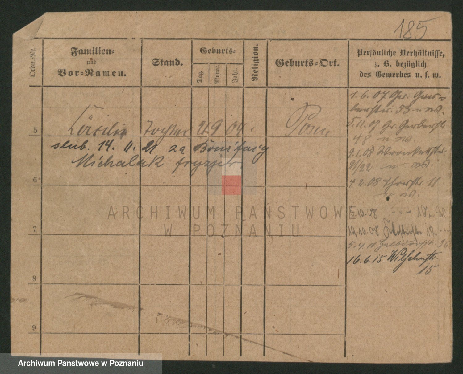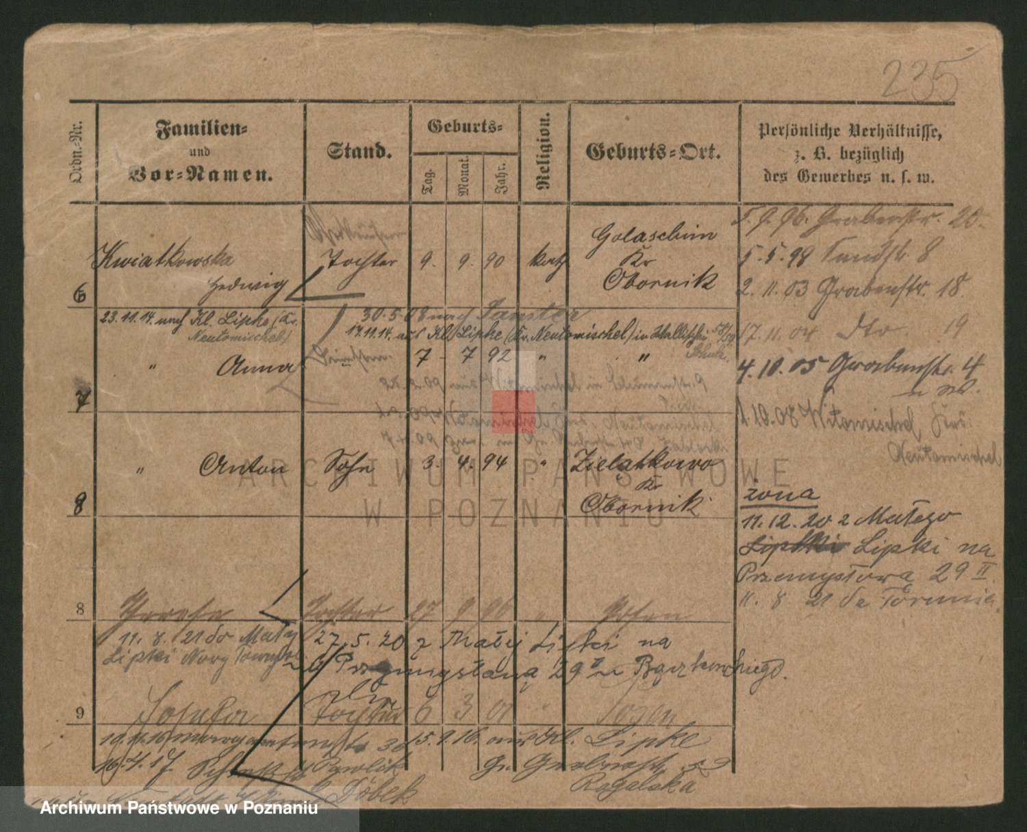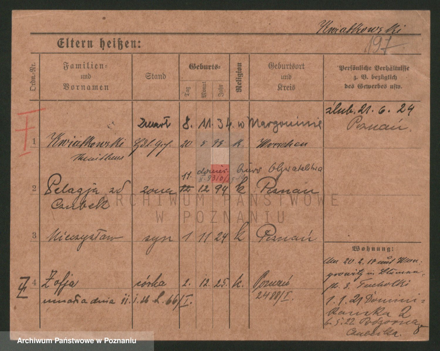 Podgląd karty osobowej dostępny jest po kliknięciu na nazwisko lub ikonkę karty. Można dokonywać powiększenia (ikony na górze) lub przechodzić między kolejnymi skanami (strzałki po bokach).