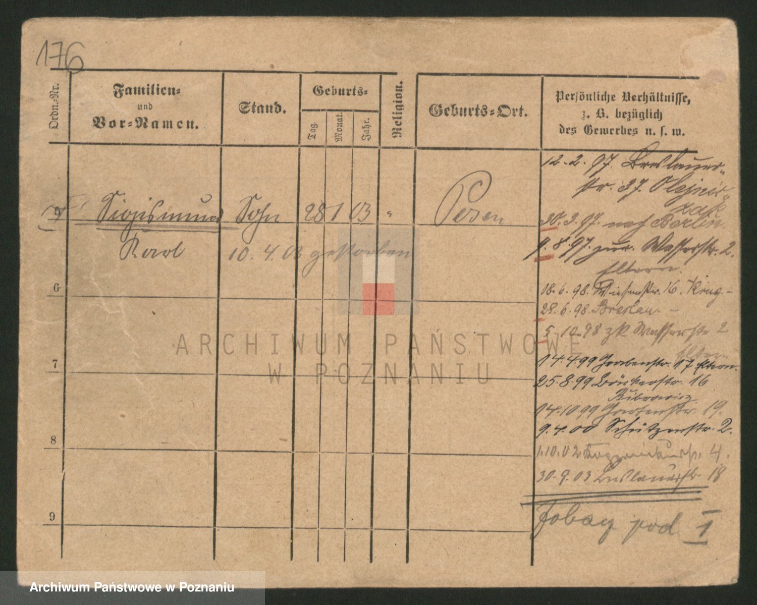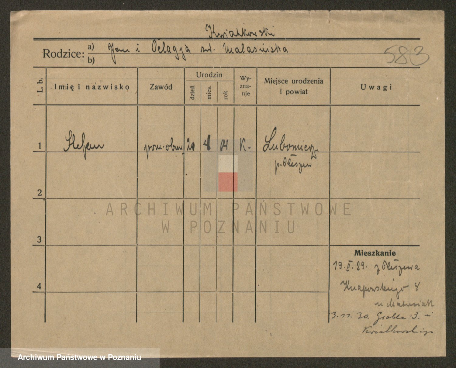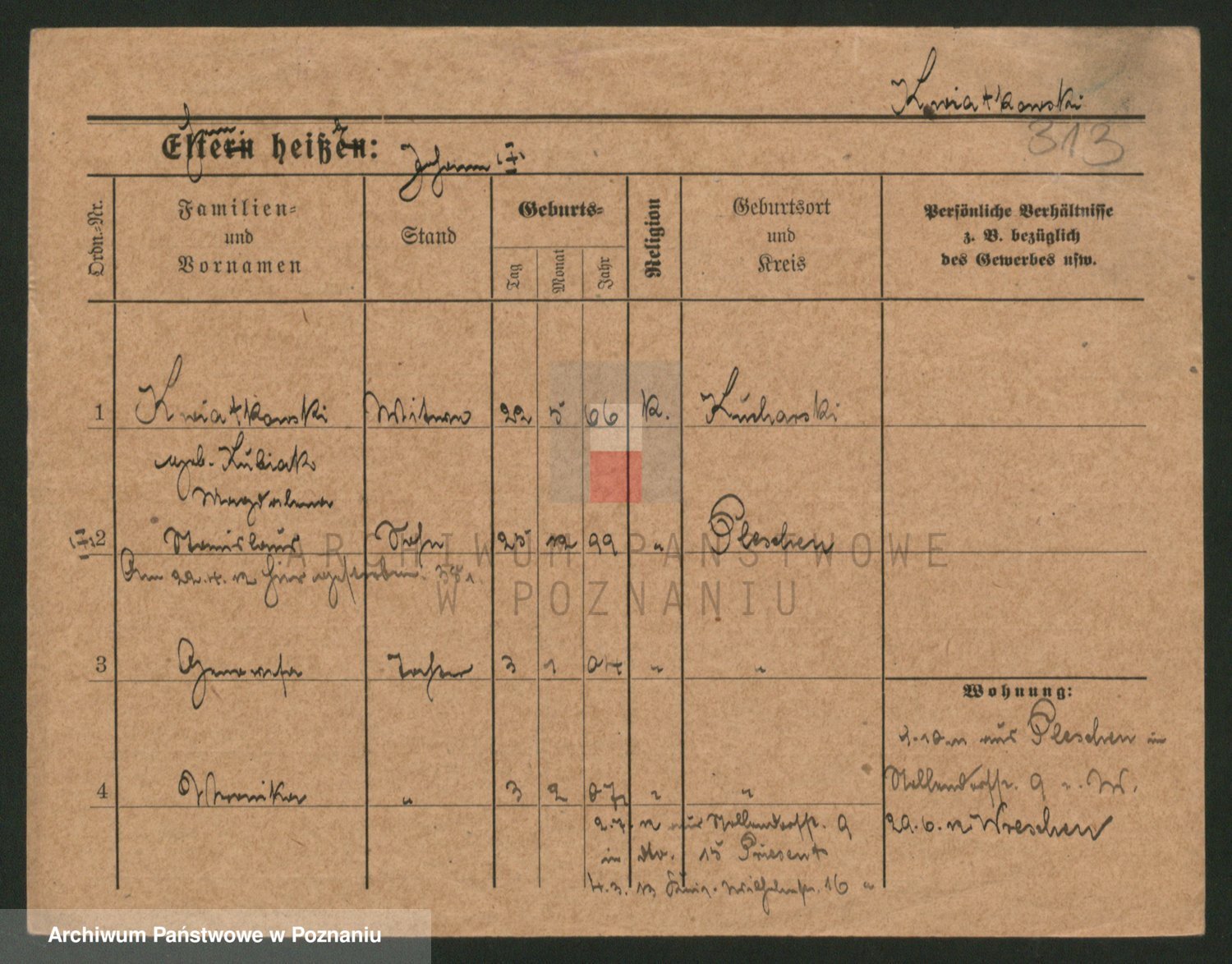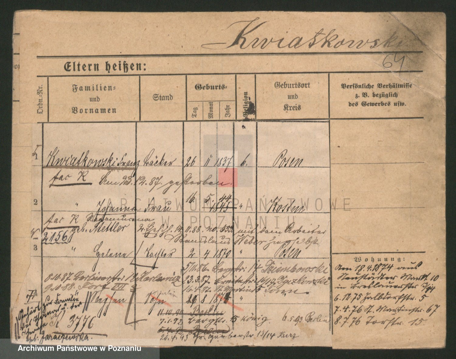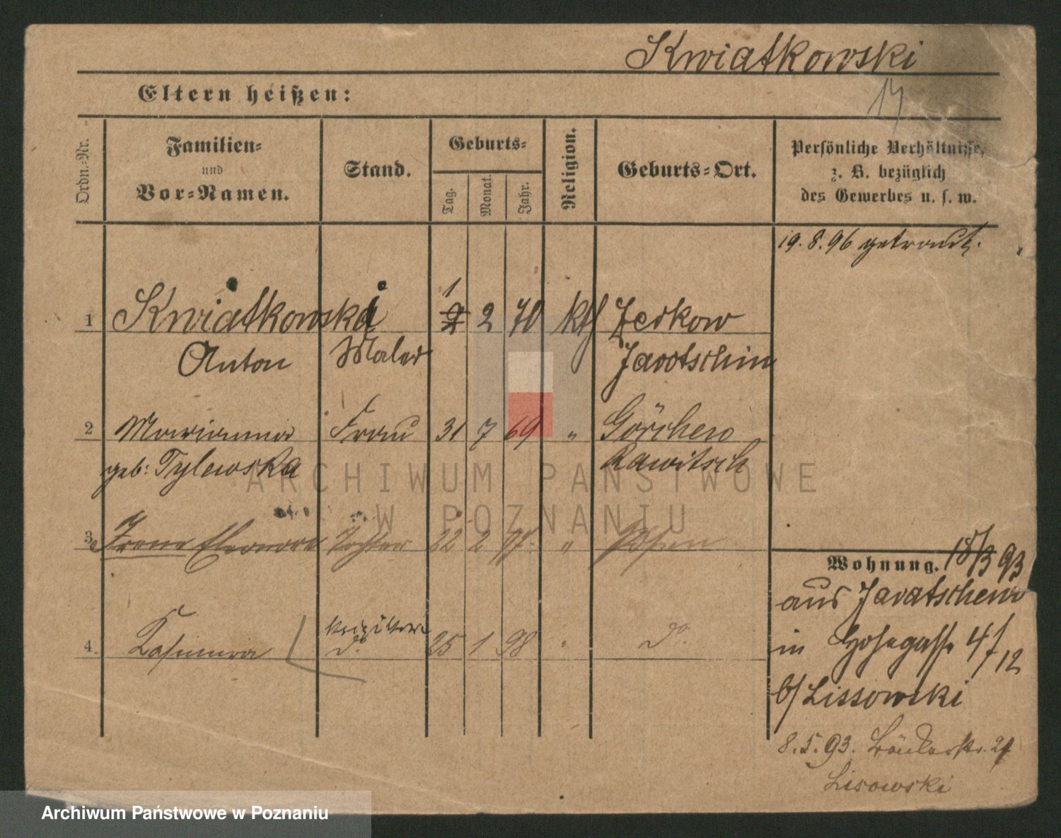 Podgląd karty osobowej dostępny jest po kliknięciu na nazwisko lub ikonkę karty. Można dokonywać powiększenia (ikony na górze) lub przechodzić między kolejnymi skanami (strzałki po bokach).