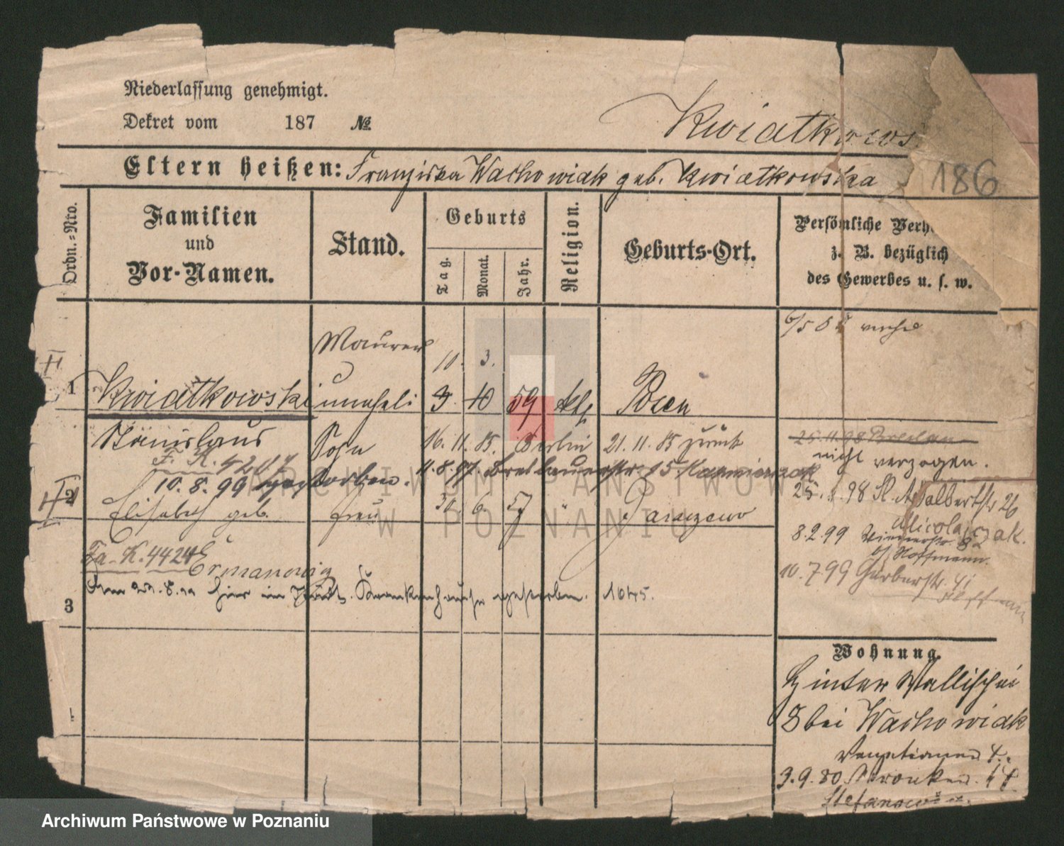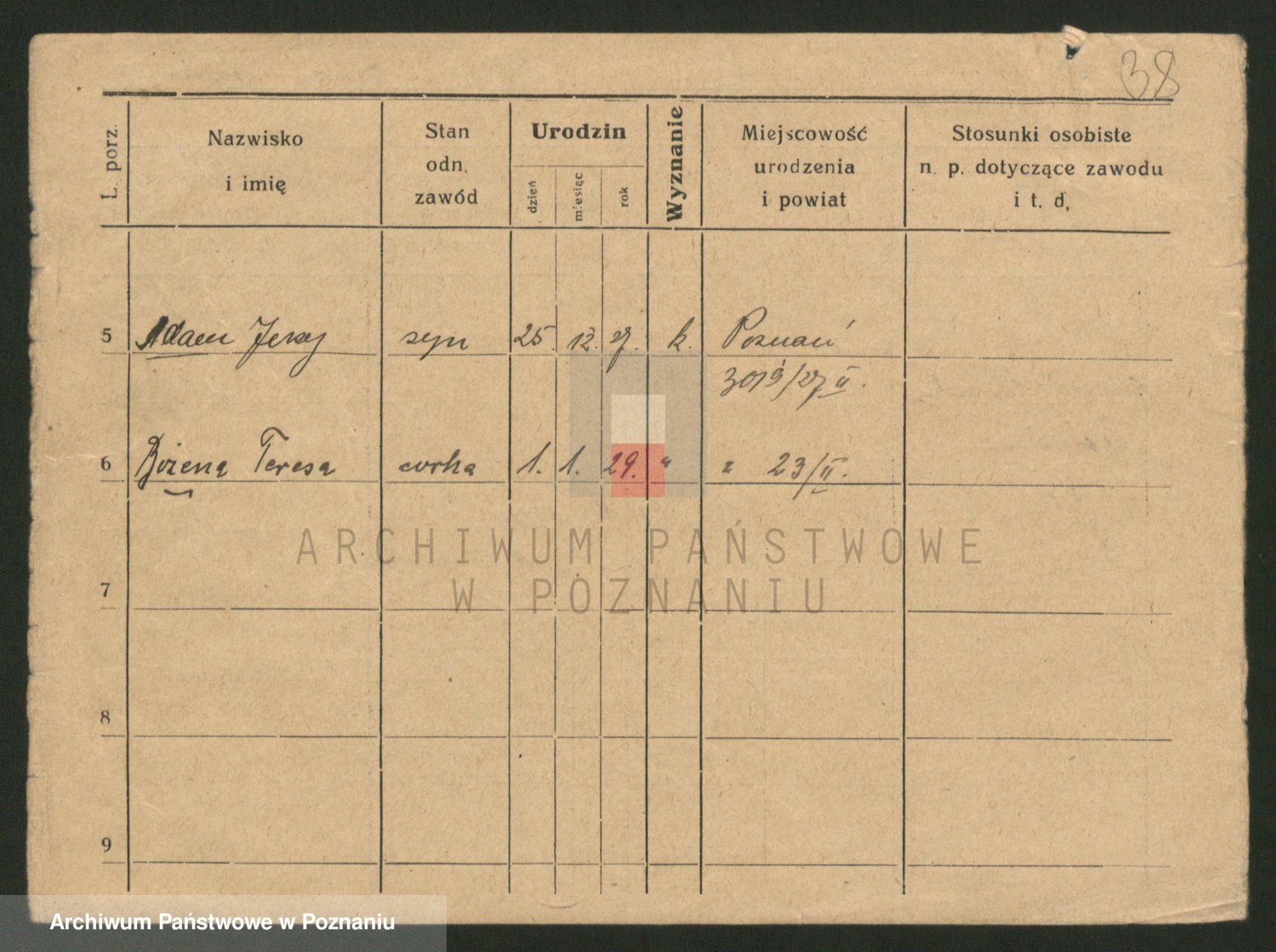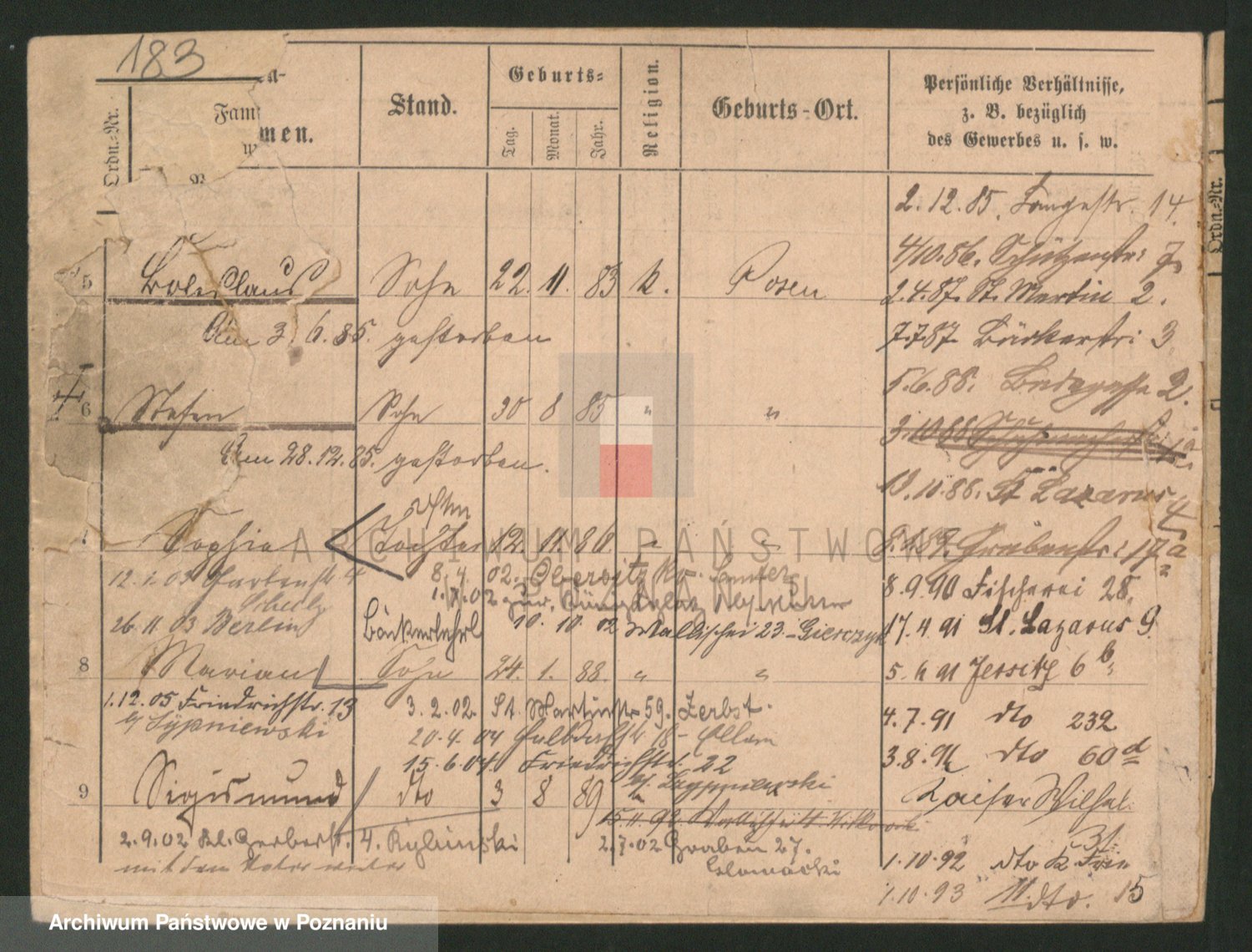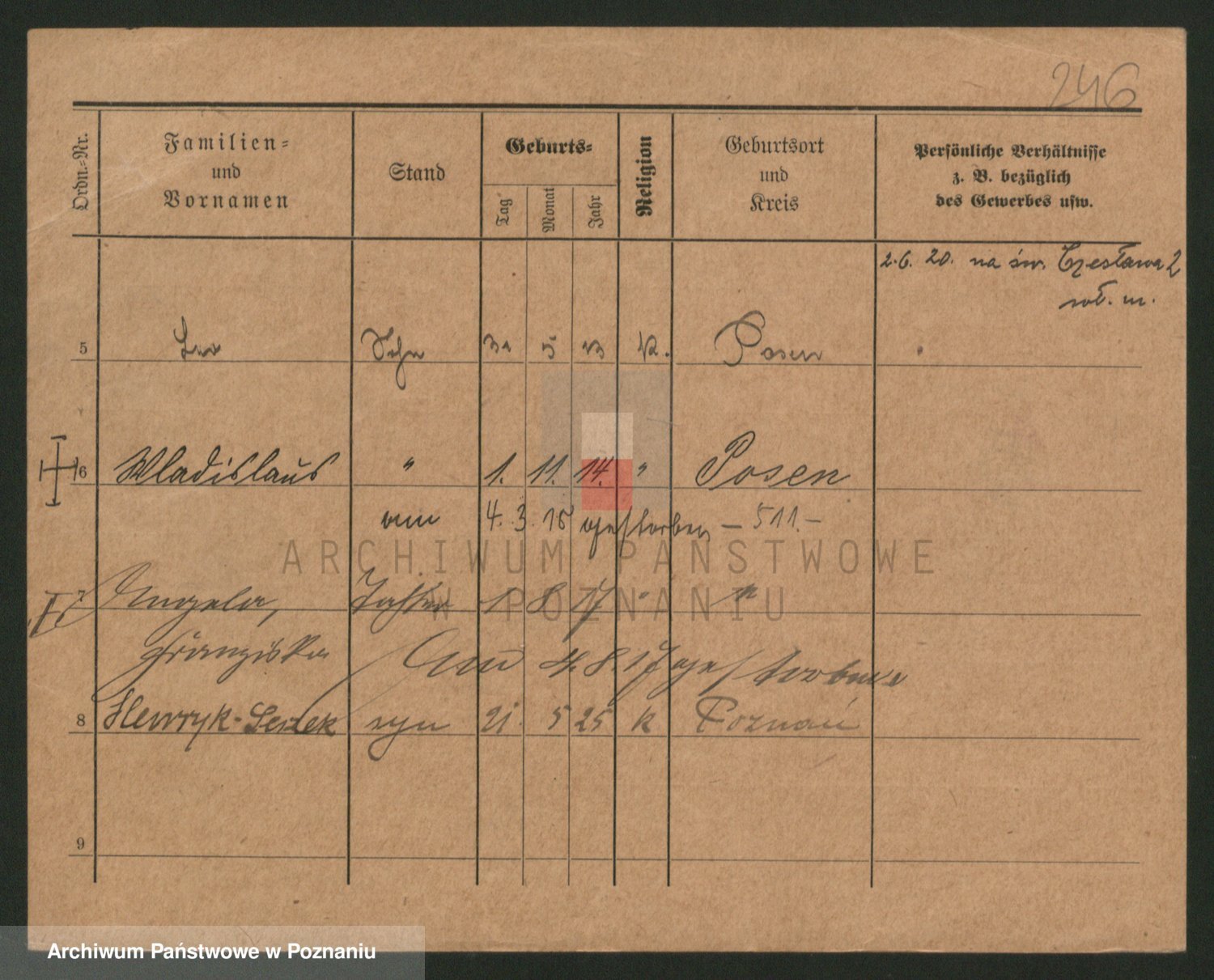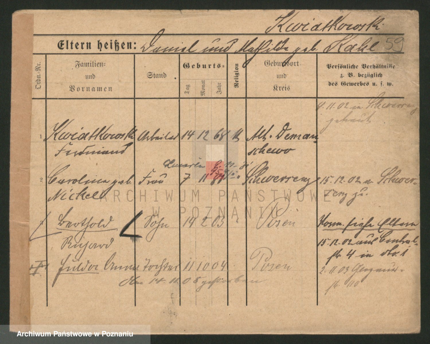 Podgląd karty osobowej dostępny jest po kliknięciu na nazwisko lub ikonkę karty. Można dokonywać powiększenia (ikony na górze) lub przechodzić między kolejnymi skanami (strzałki po bokach).