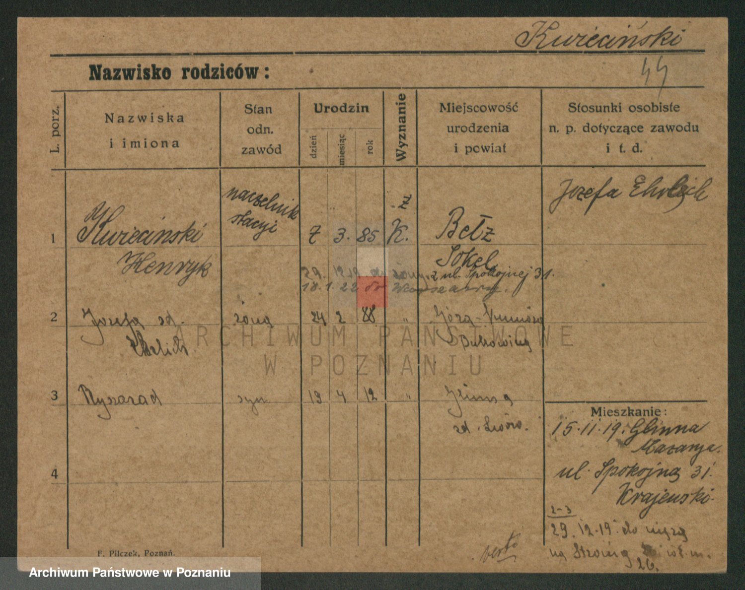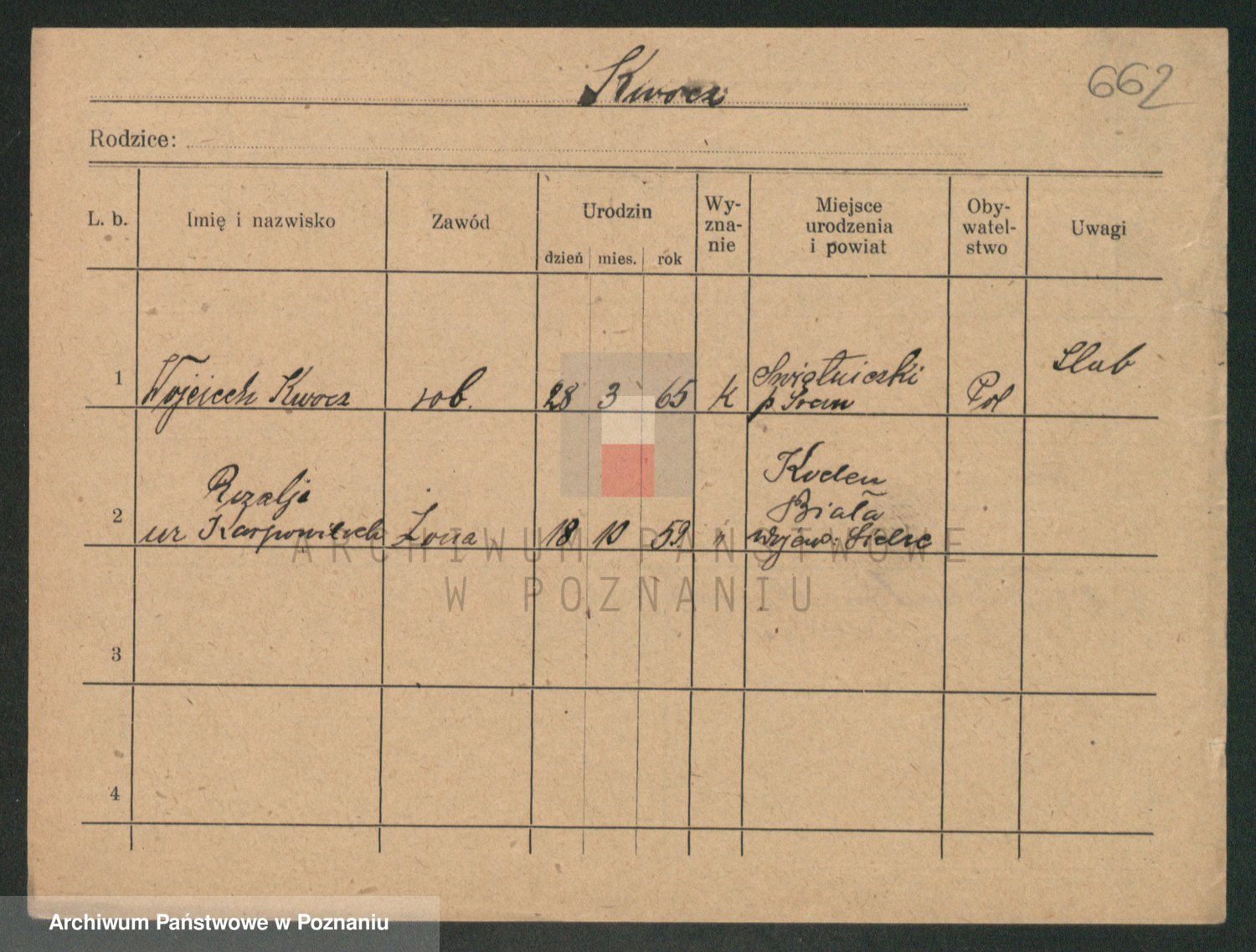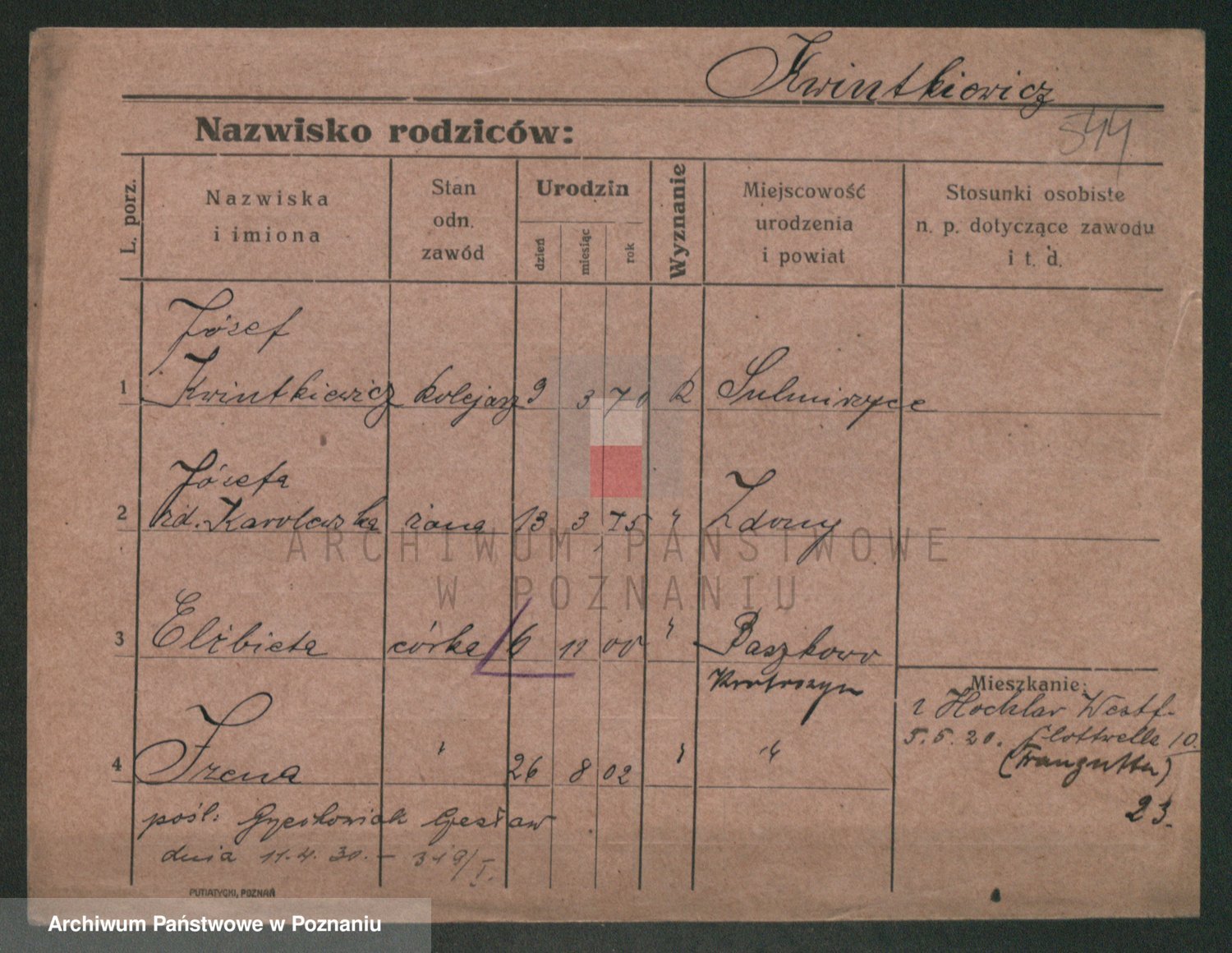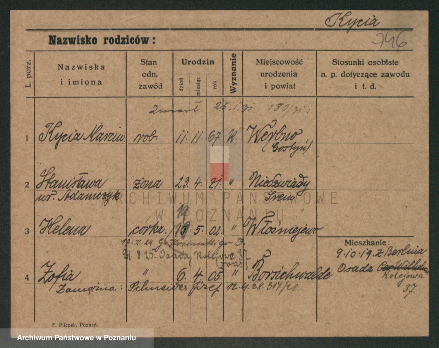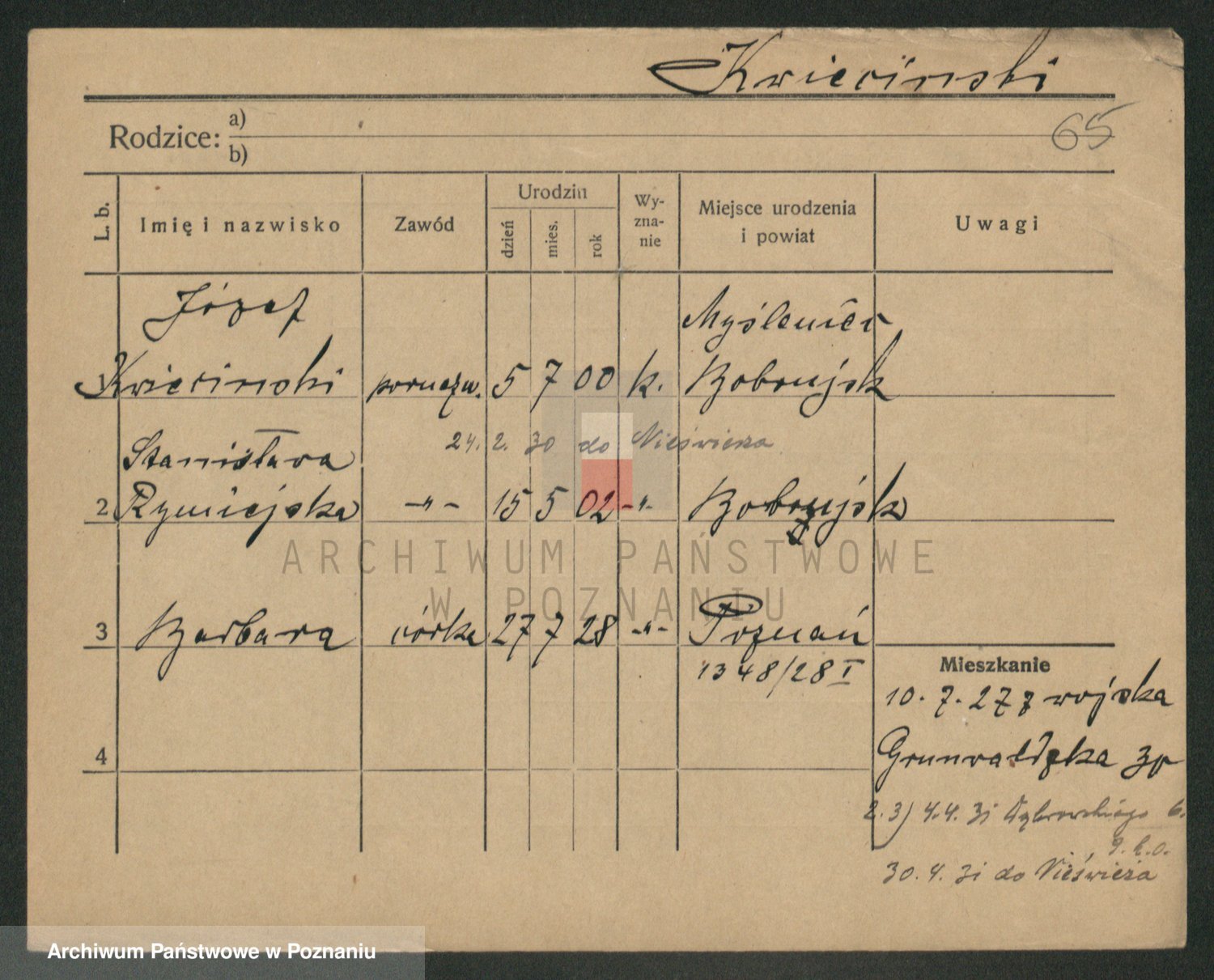 Podgląd karty osobowej dostępny jest po kliknięciu na nazwisko lub ikonkę karty. Można dokonywać powiększenia (ikony na górze) lub przechodzić między kolejnymi skanami (strzałki po bokach).