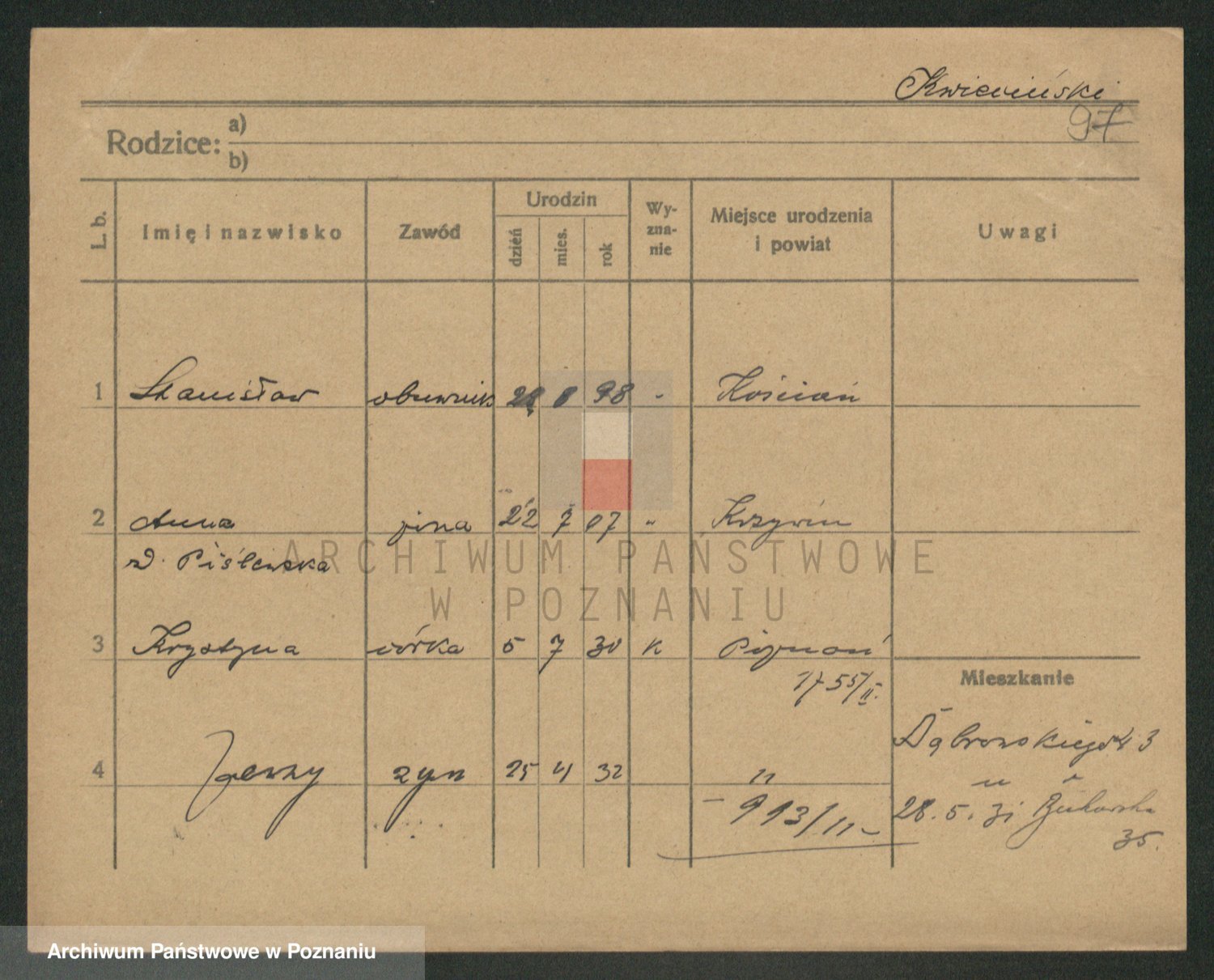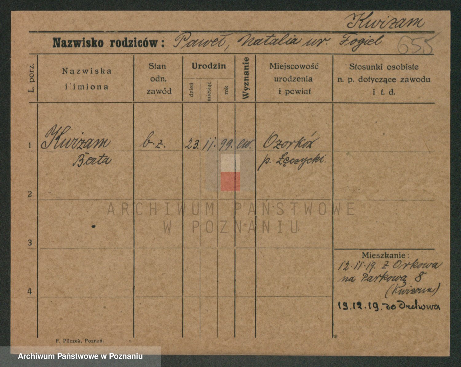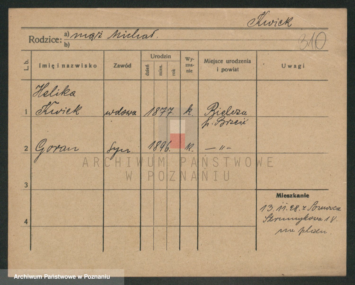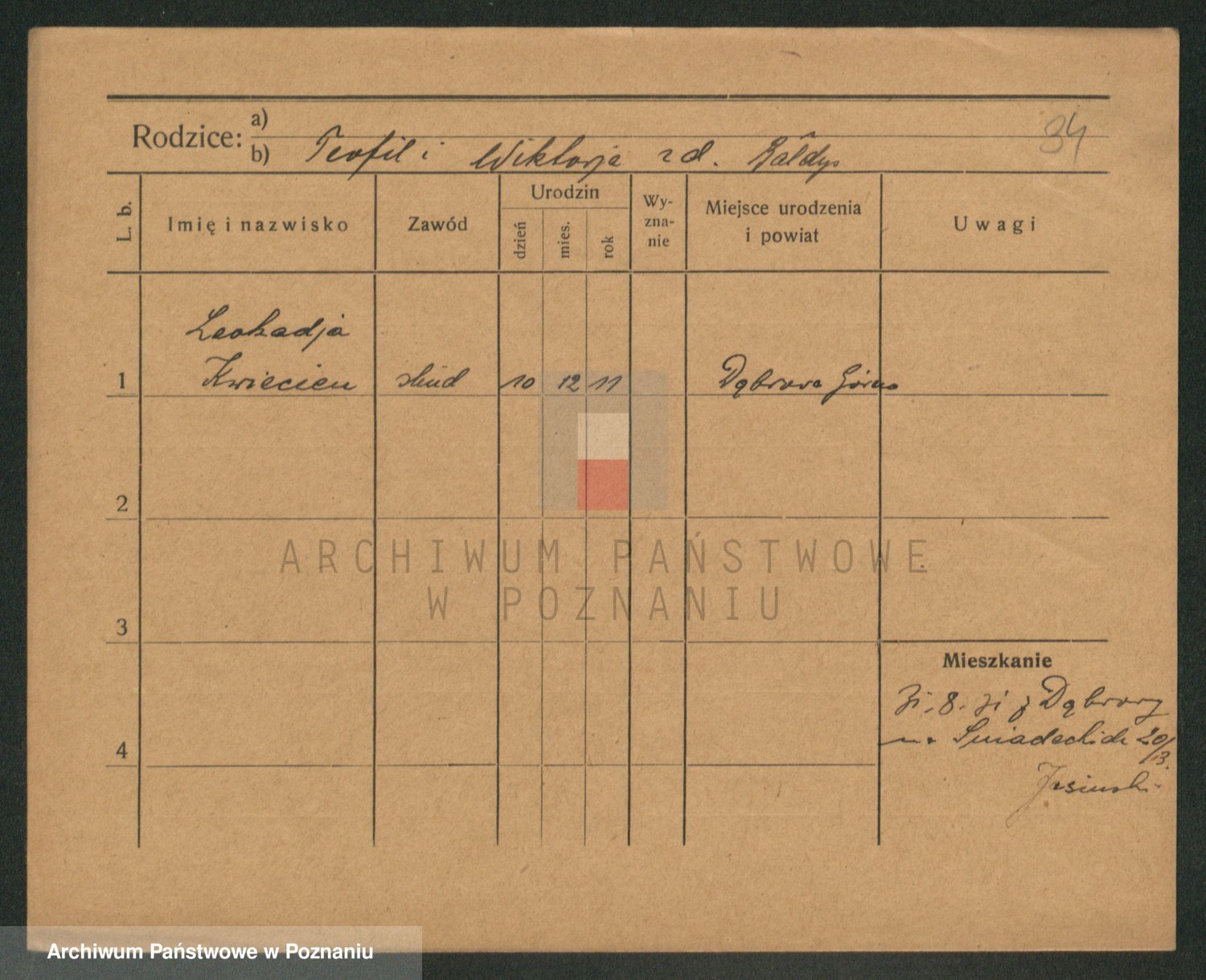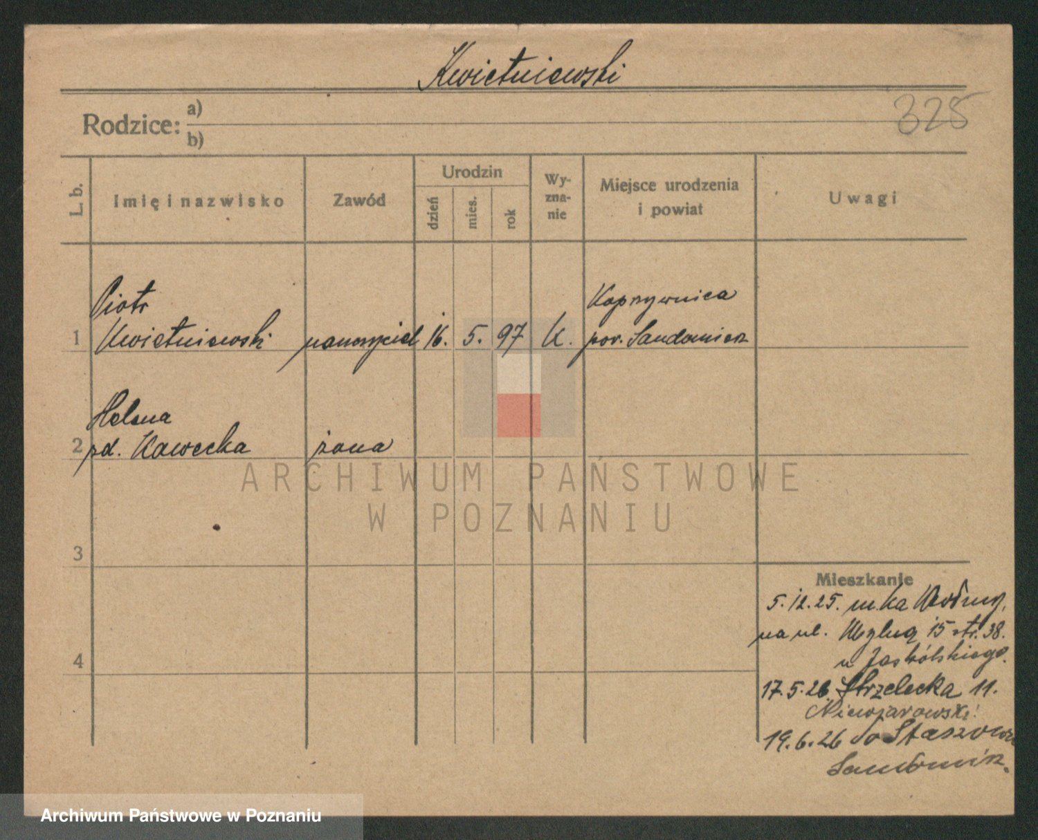 Podgląd karty osobowej dostępny jest po kliknięciu na nazwisko lub ikonkę karty. Można dokonywać powiększenia (ikony na górze) lub przechodzić między kolejnymi skanami (strzałki po bokach).