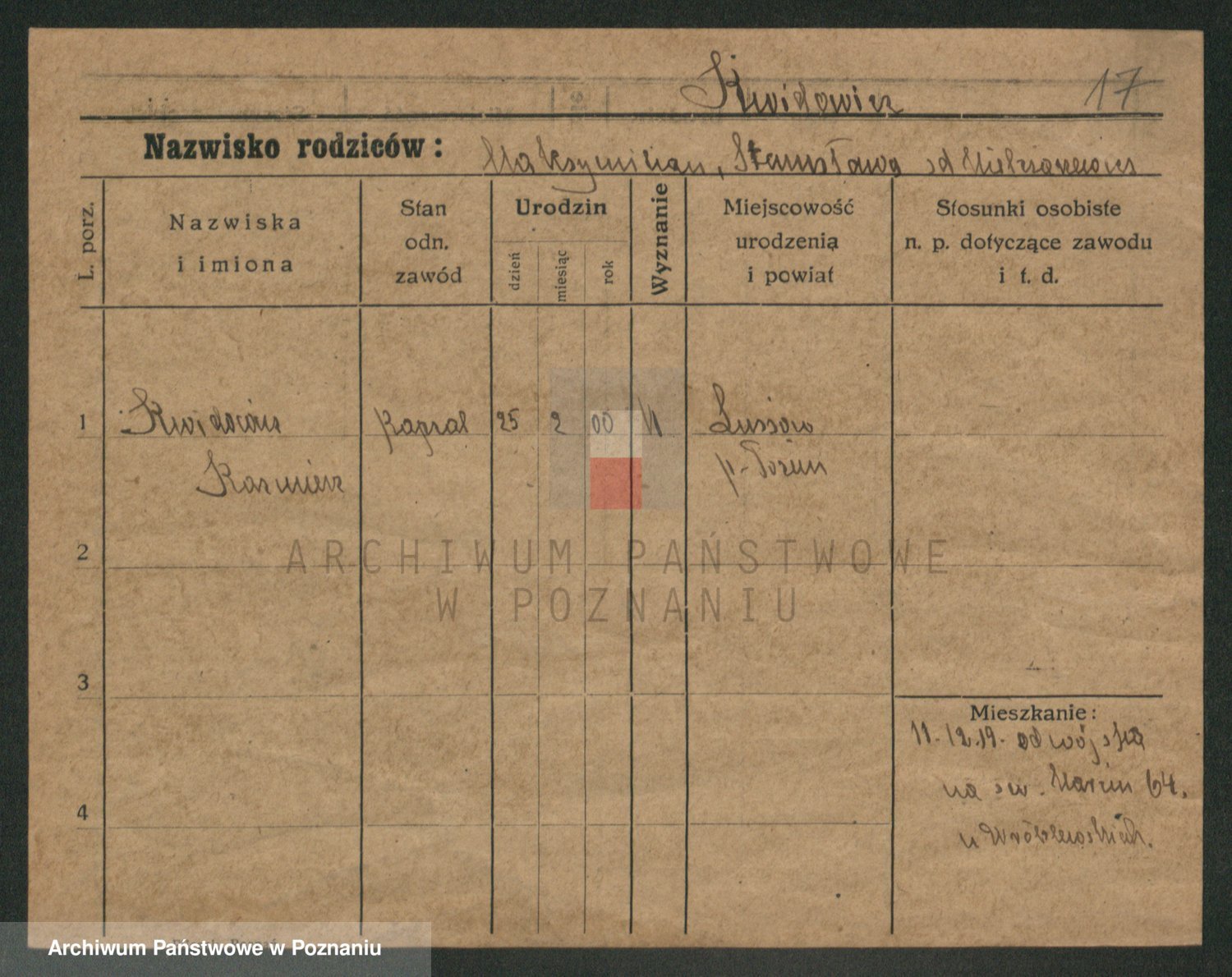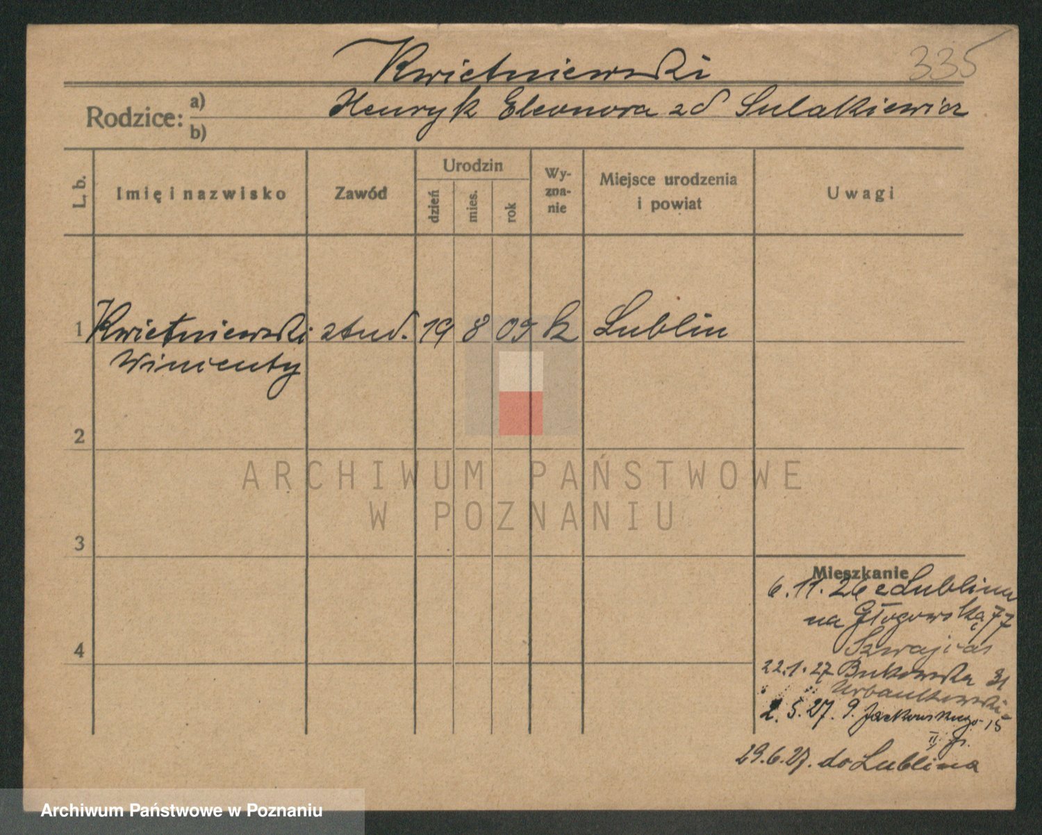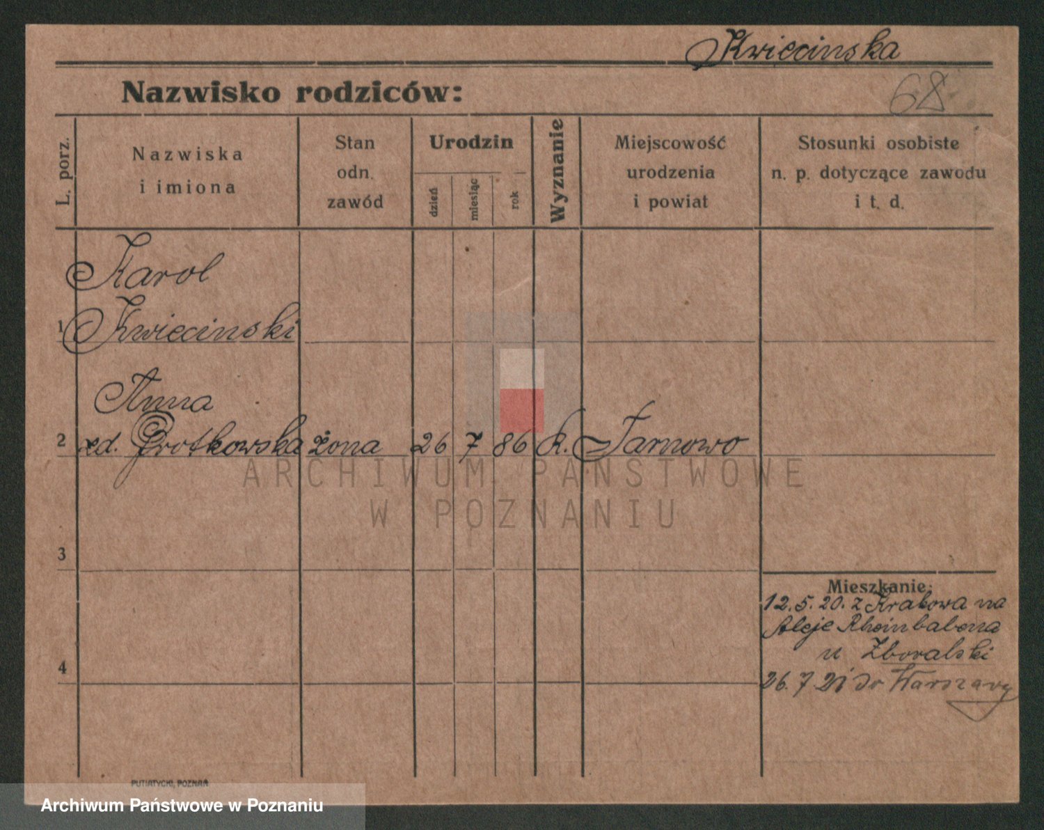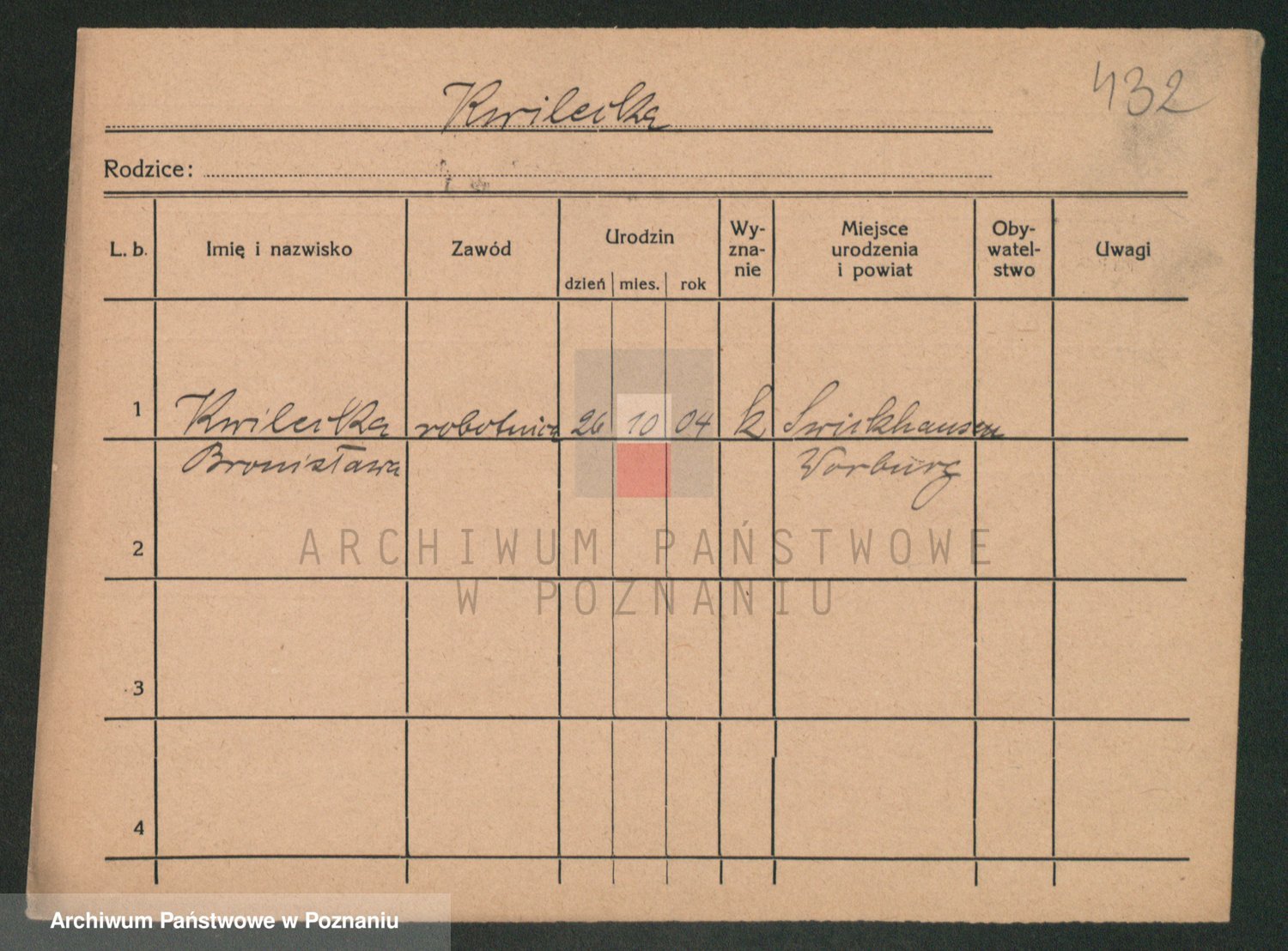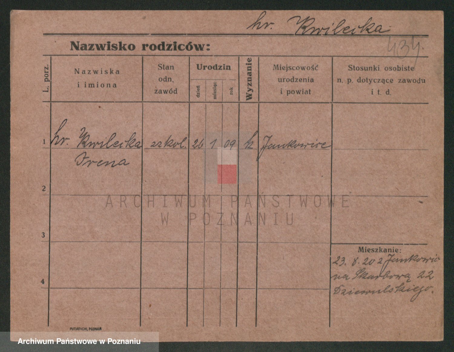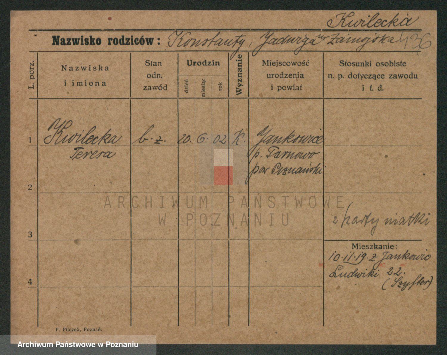 Podgląd karty osobowej dostępny jest po kliknięciu na nazwisko lub ikonkę karty. Można dokonywać powiększenia (ikony na górze) lub przechodzić między kolejnymi skanami (strzałki po bokach).