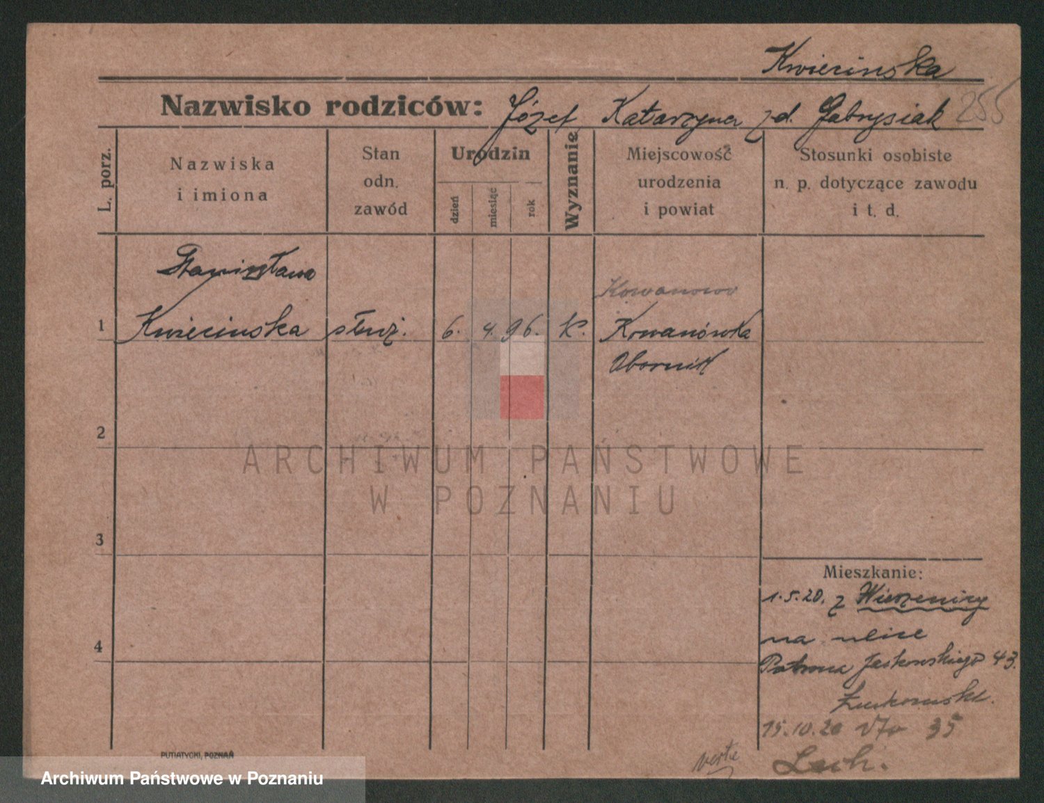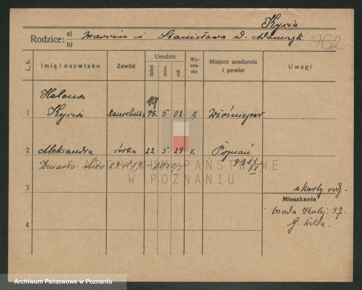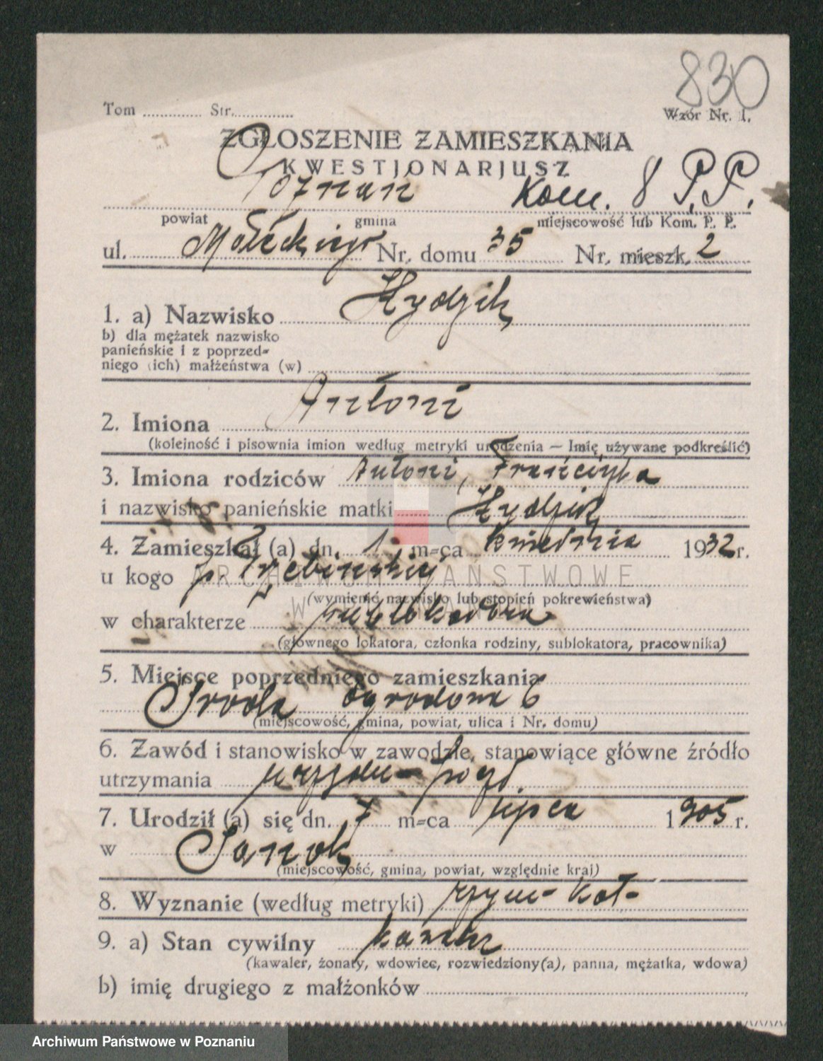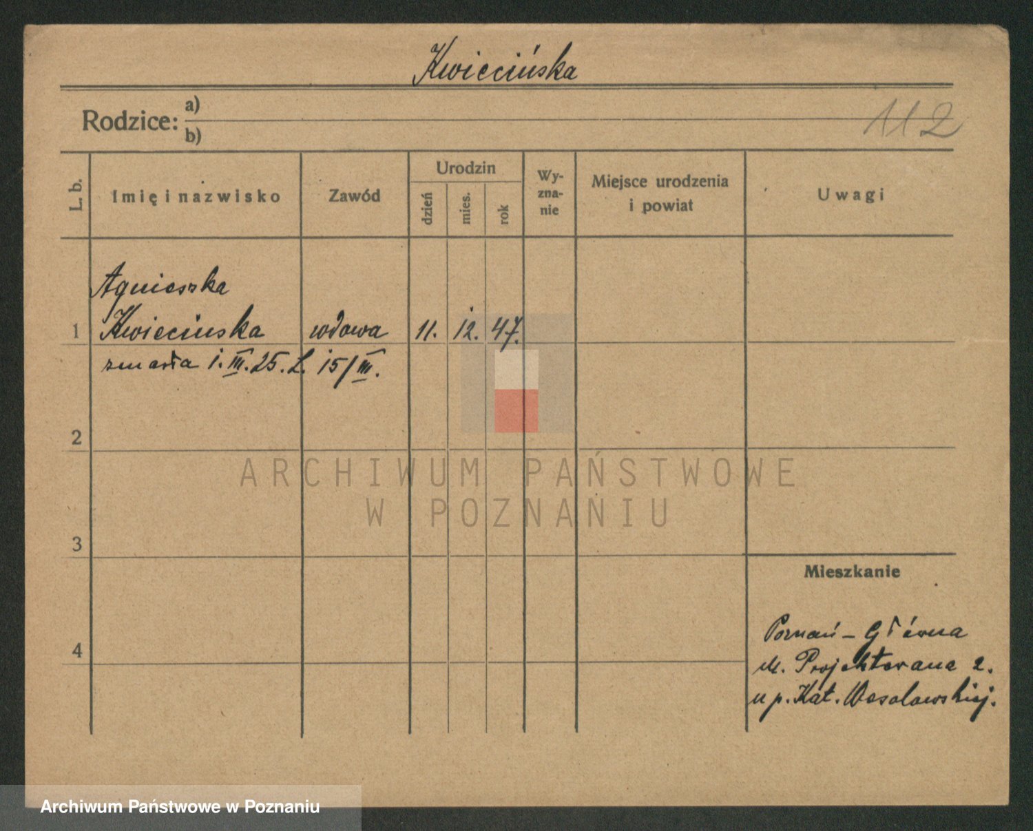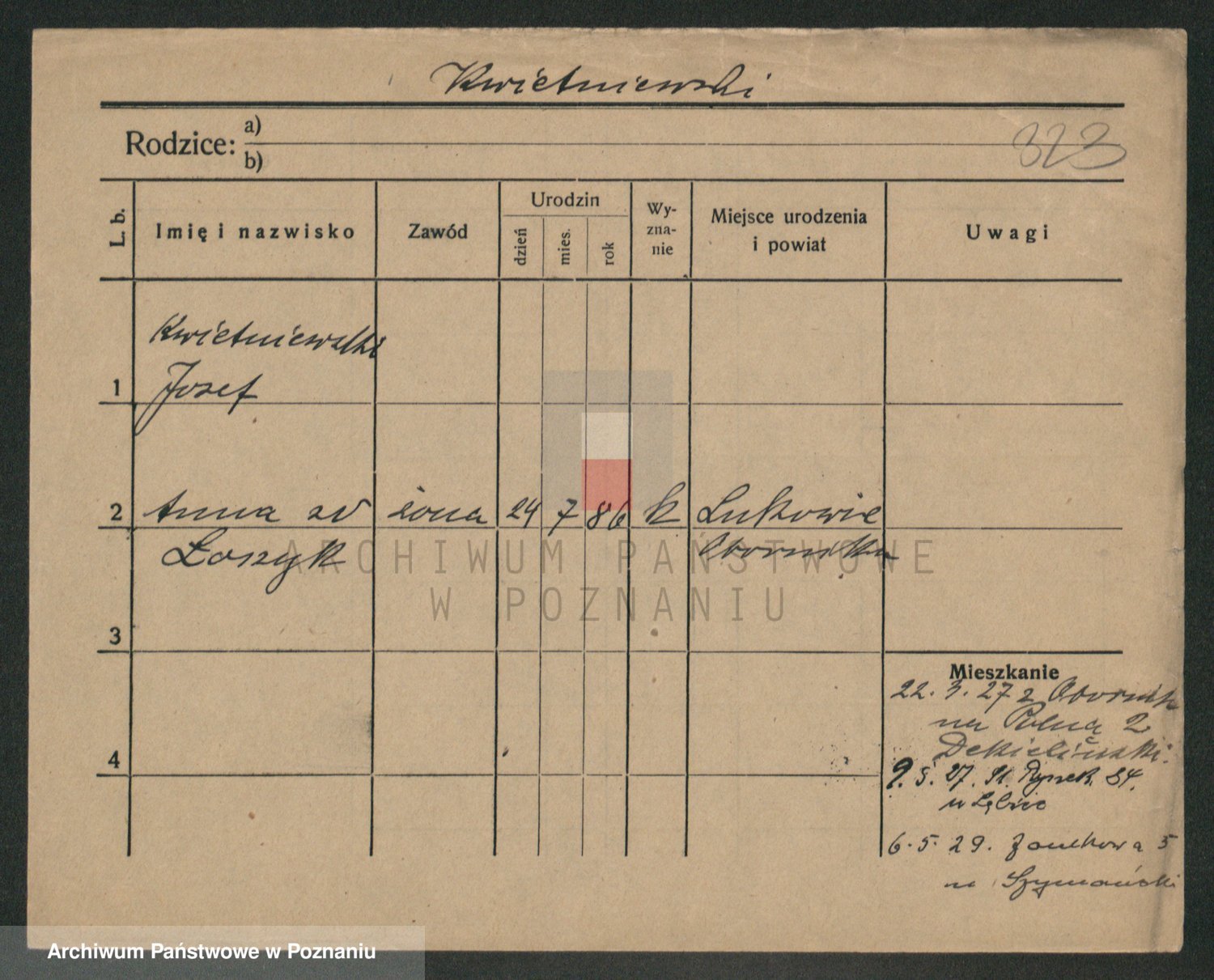 Podgląd karty osobowej dostępny jest po kliknięciu na nazwisko lub ikonkę karty. Można dokonywać powiększenia (ikony na górze) lub przechodzić między kolejnymi skanami (strzałki po bokach).