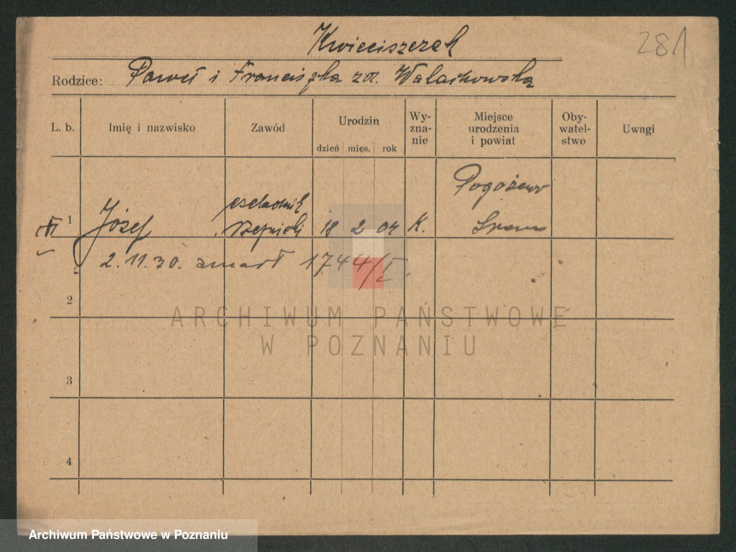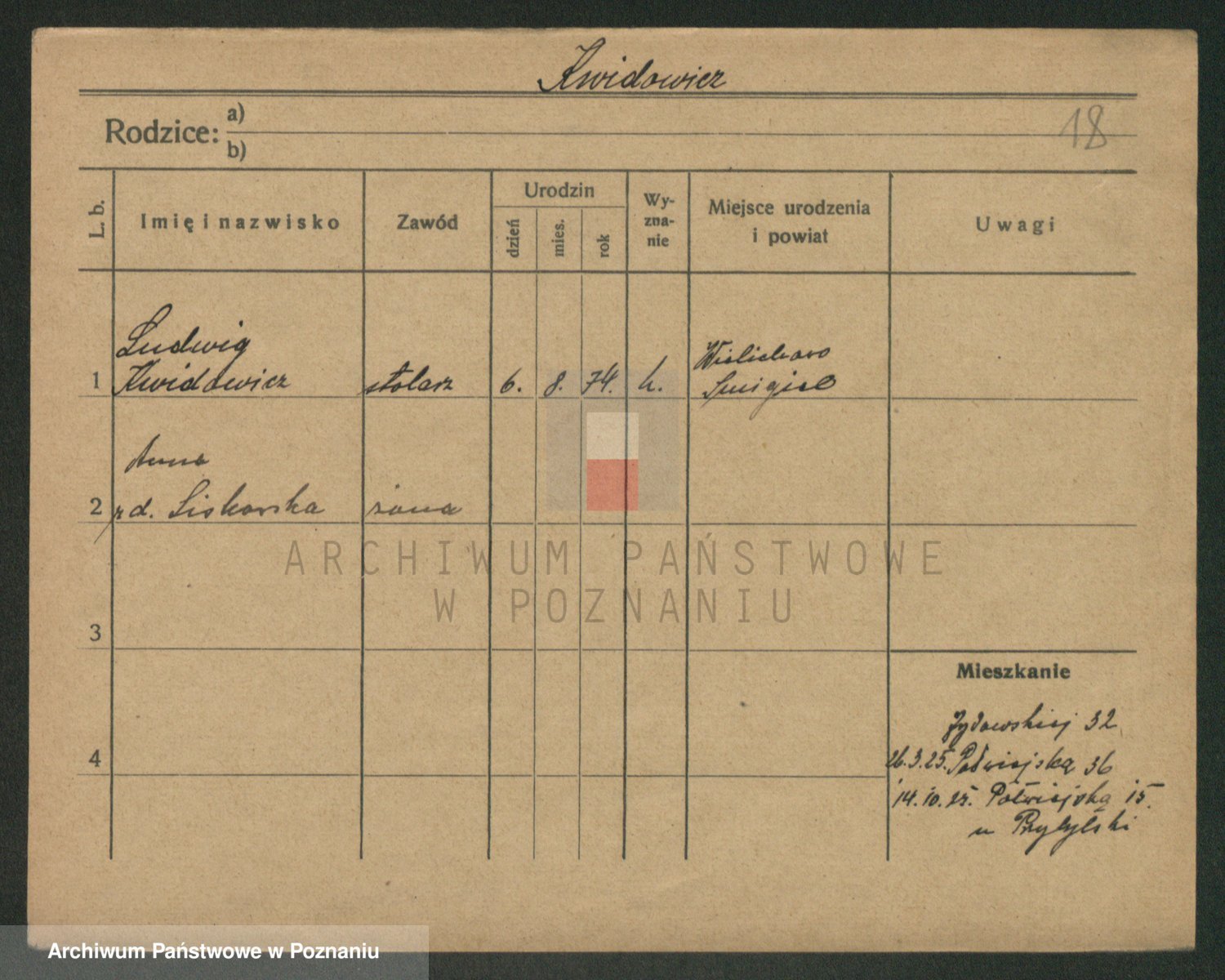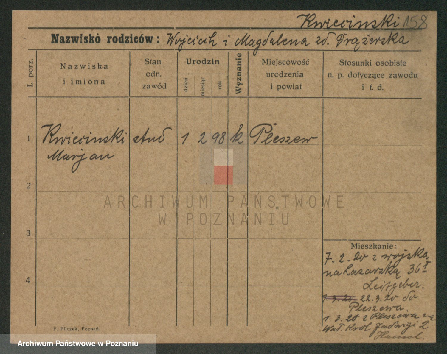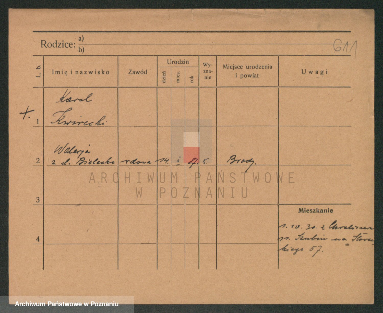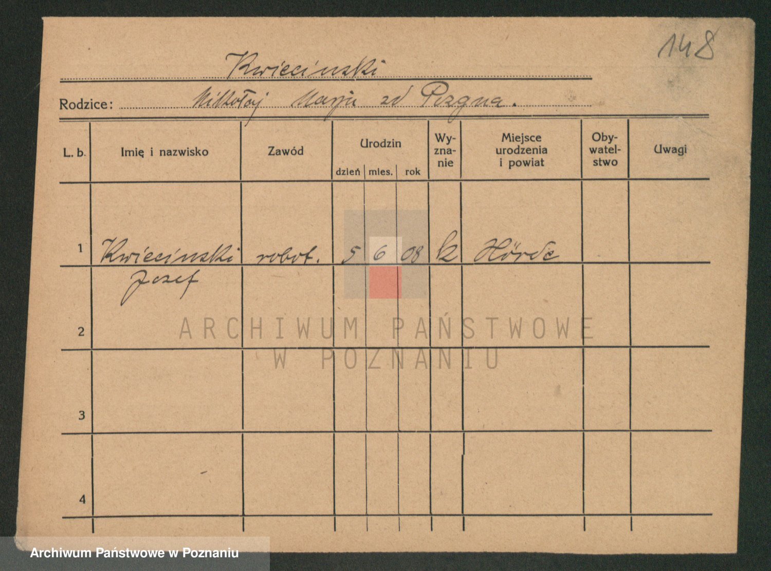 Podgląd karty osobowej dostępny jest po kliknięciu na nazwisko lub ikonkę karty. Można dokonywać powiększenia (ikony na górze) lub przechodzić między kolejnymi skanami (strzałki po bokach).