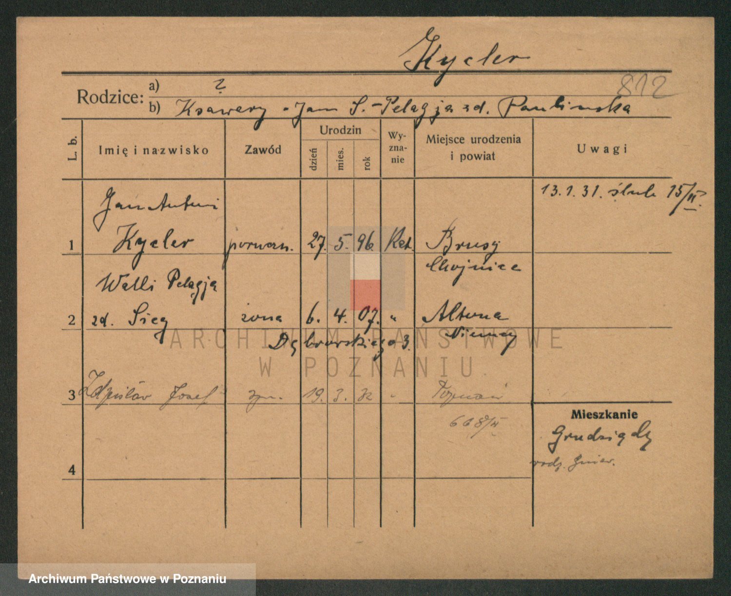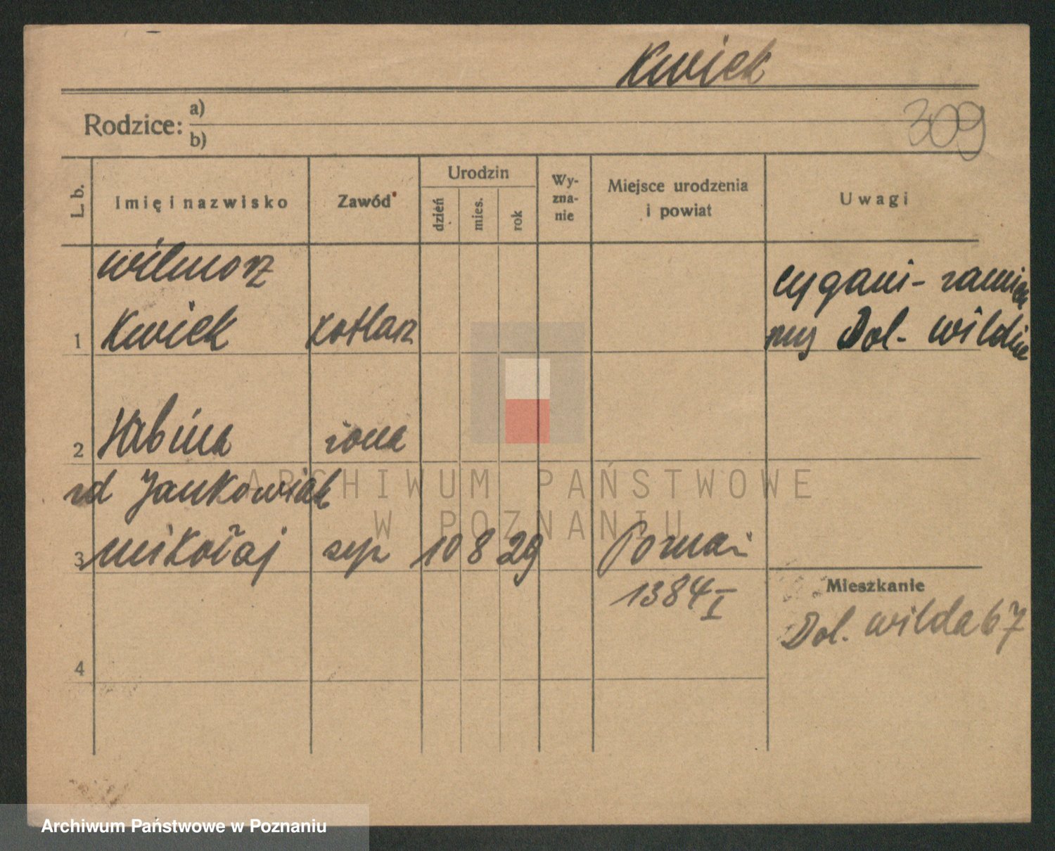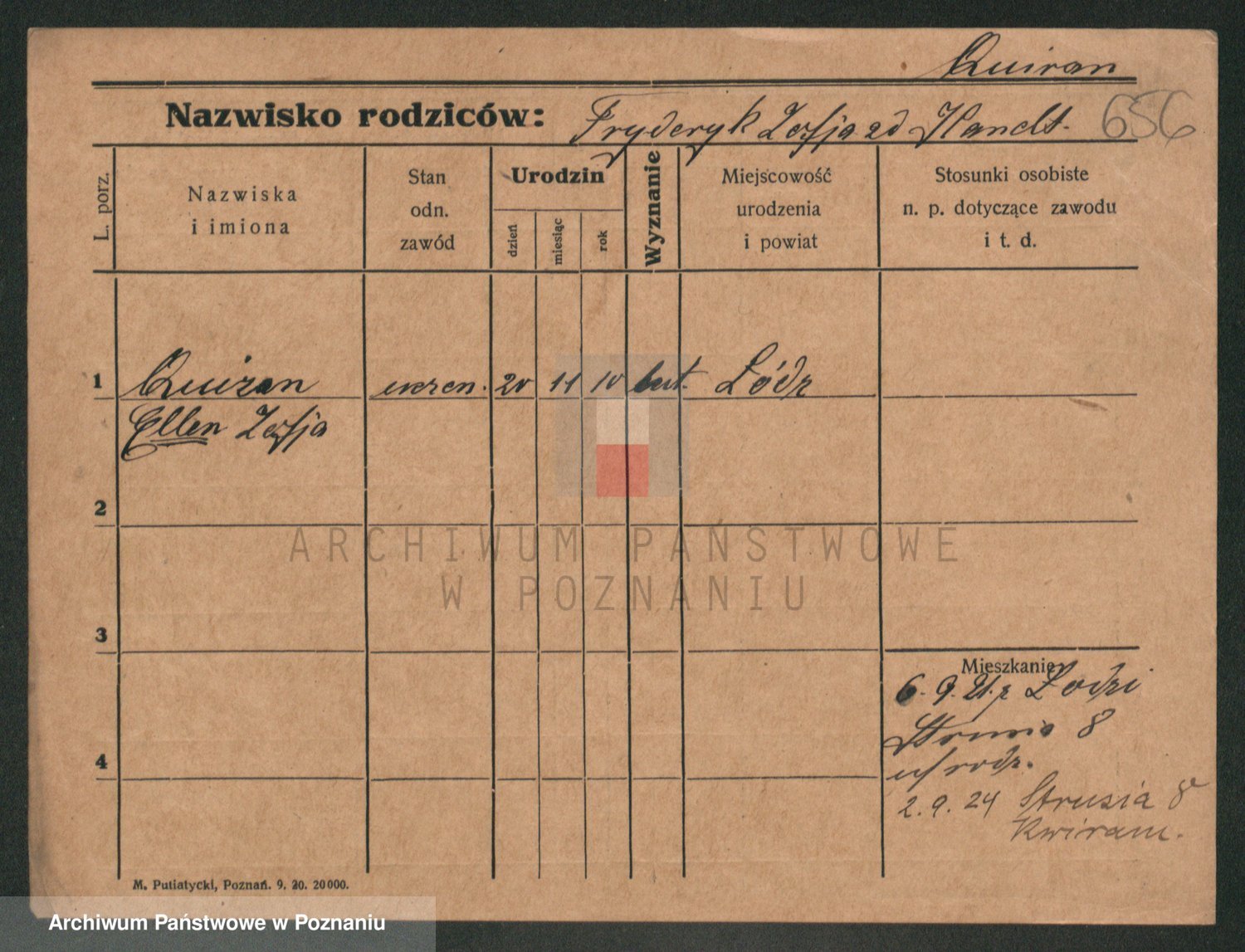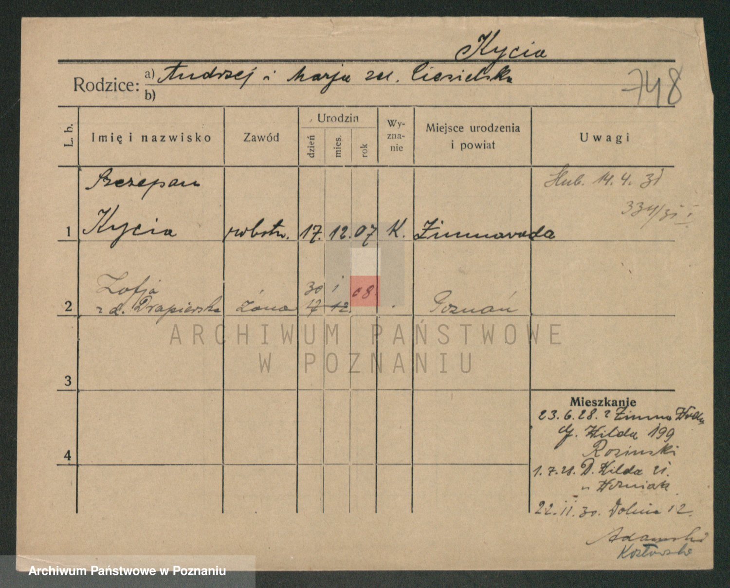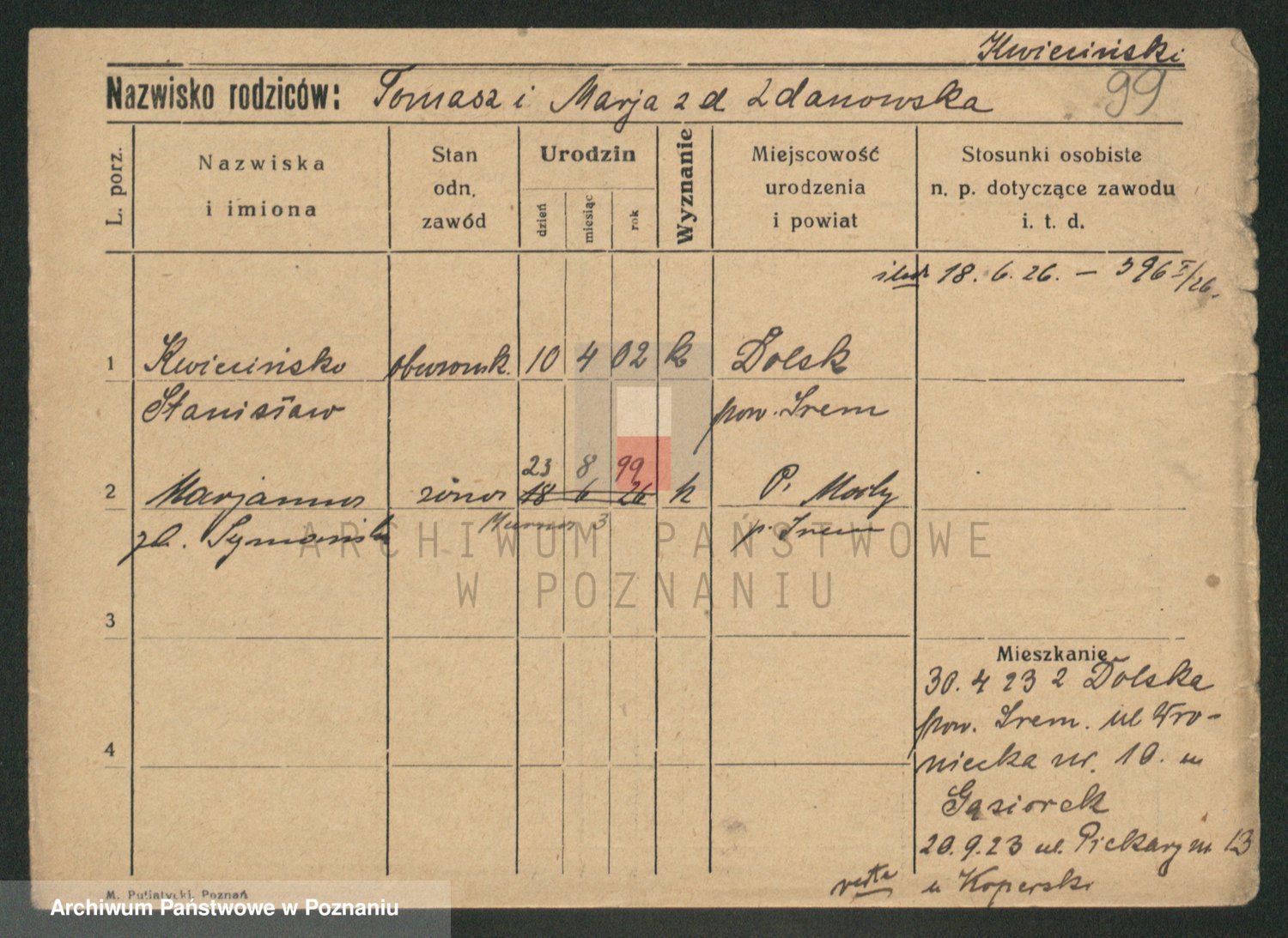 Podgląd karty osobowej dostępny jest po kliknięciu na nazwisko lub ikonkę karty. Można dokonywać powiększenia (ikony na górze) lub przechodzić między kolejnymi skanami (strzałki po bokach).