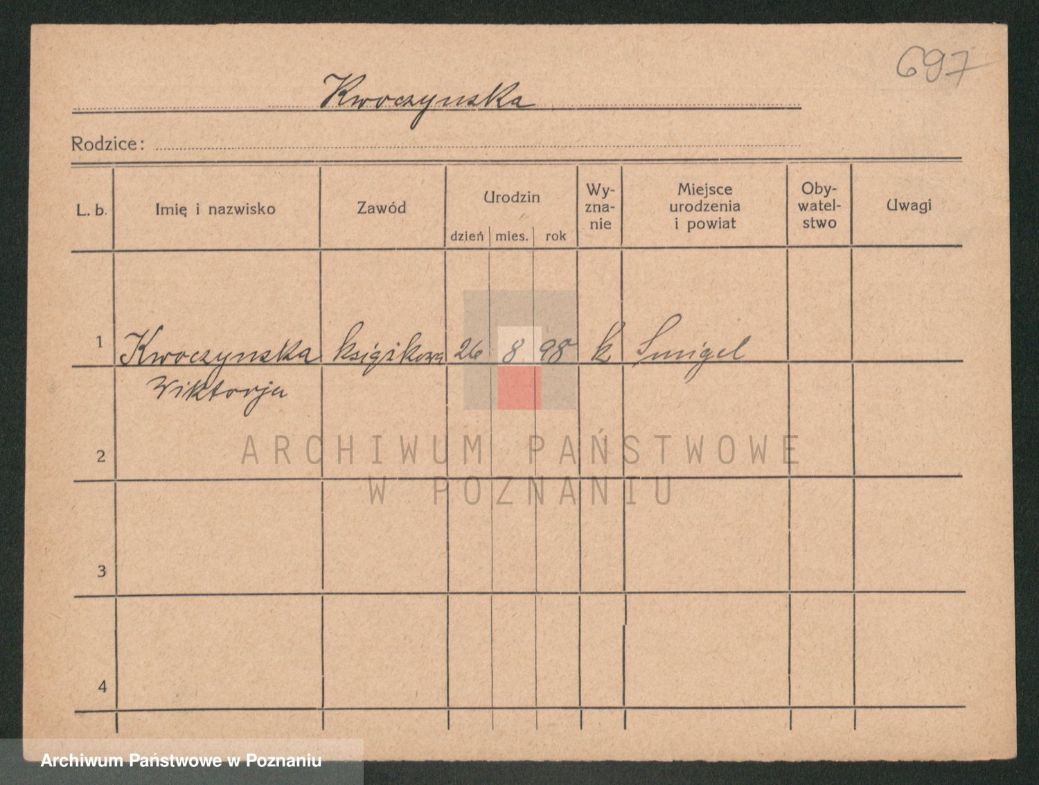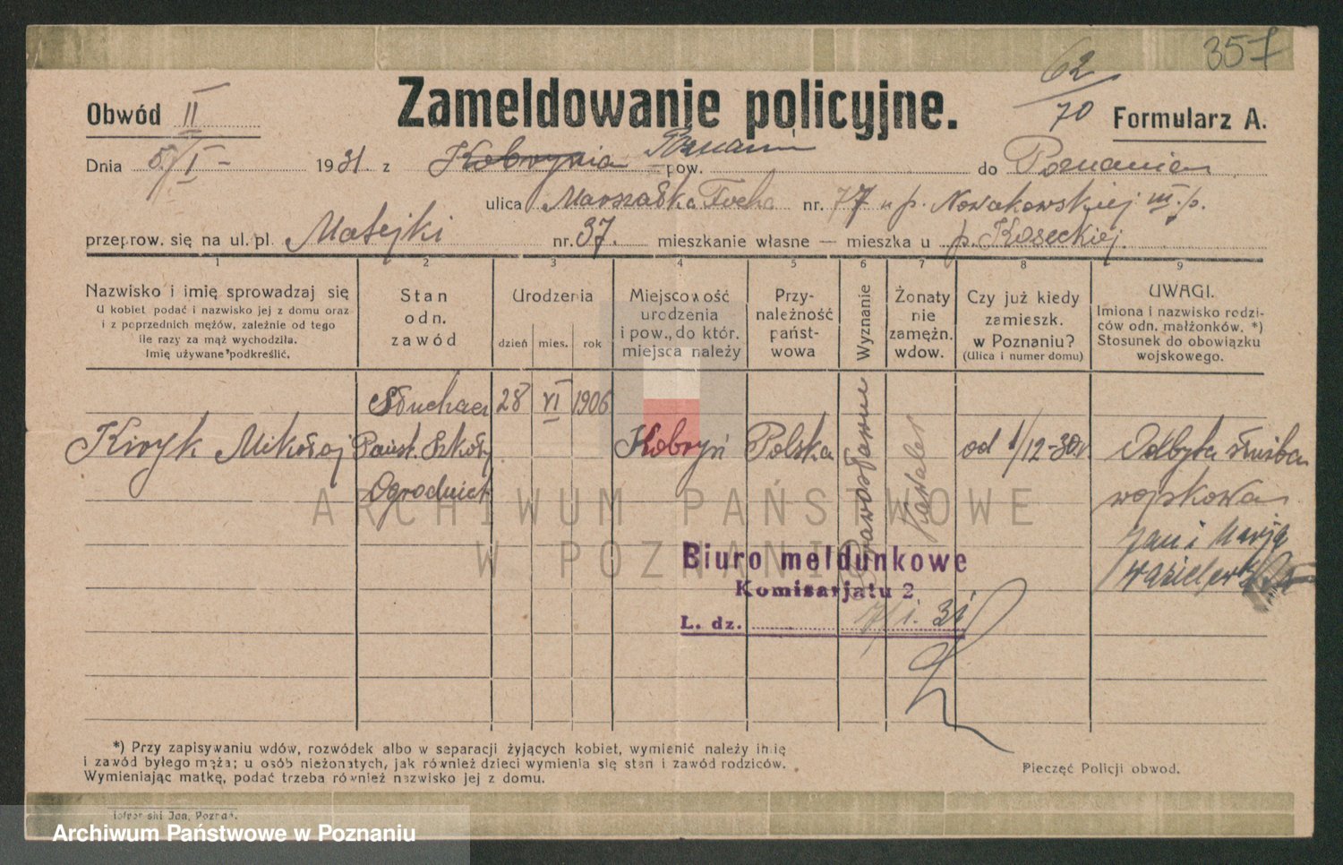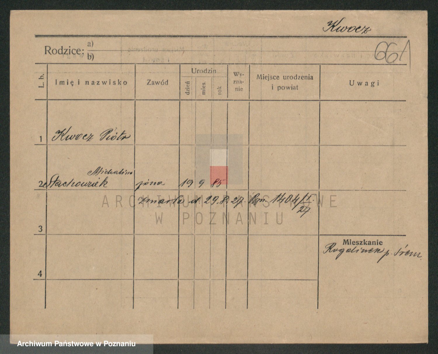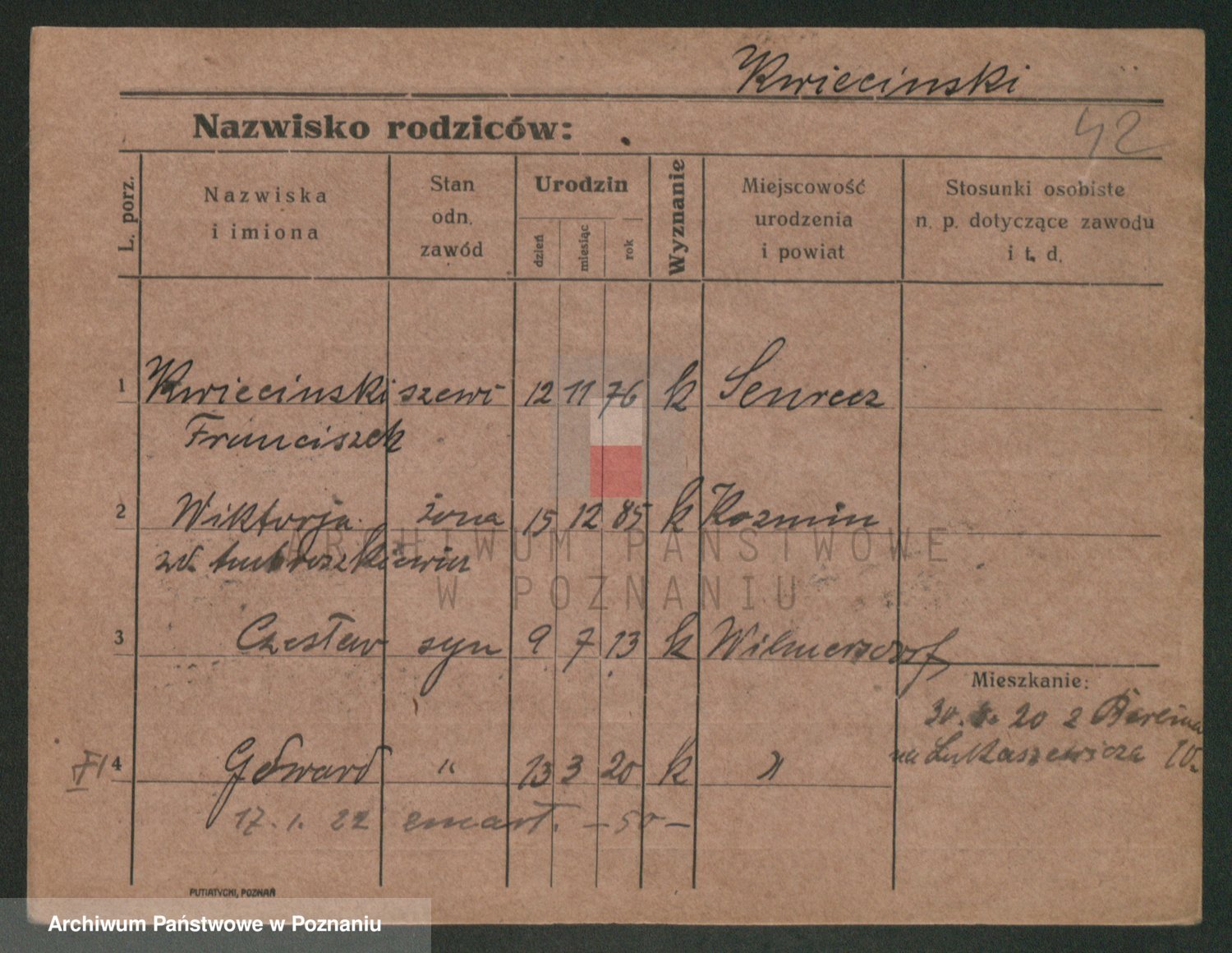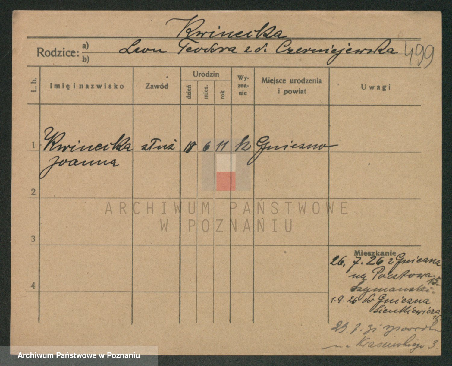 Podgląd karty osobowej dostępny jest po kliknięciu na nazwisko lub ikonkę karty. Można dokonywać powiększenia (ikony na górze) lub przechodzić między kolejnymi skanami (strzałki po bokach).
