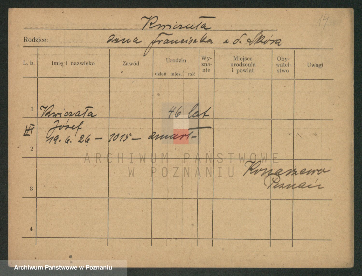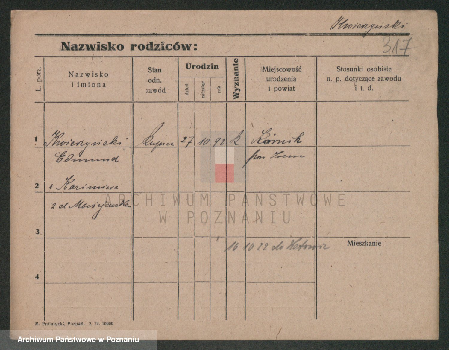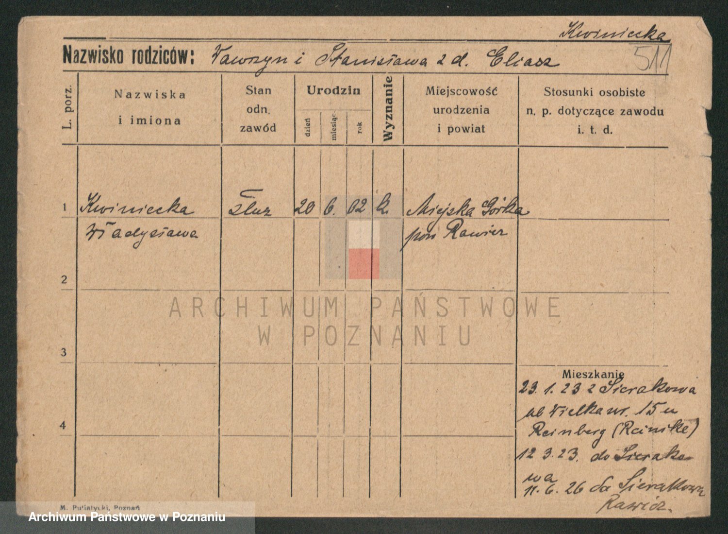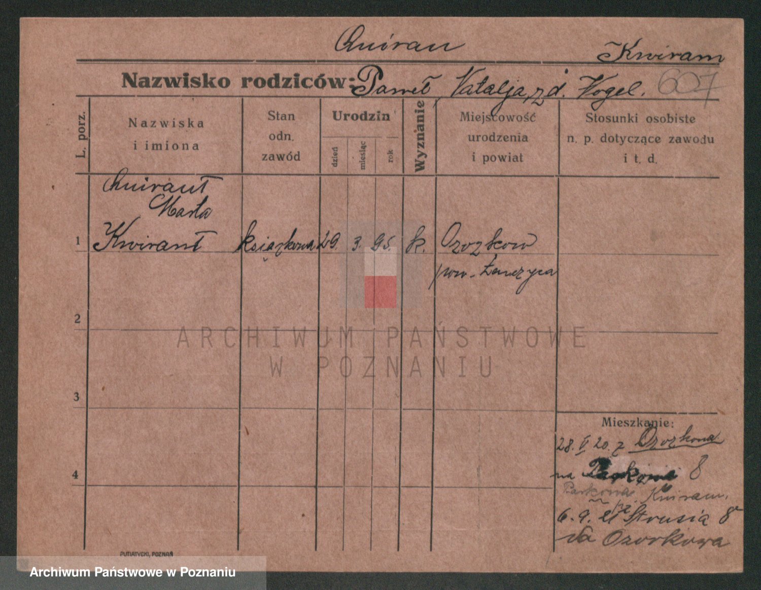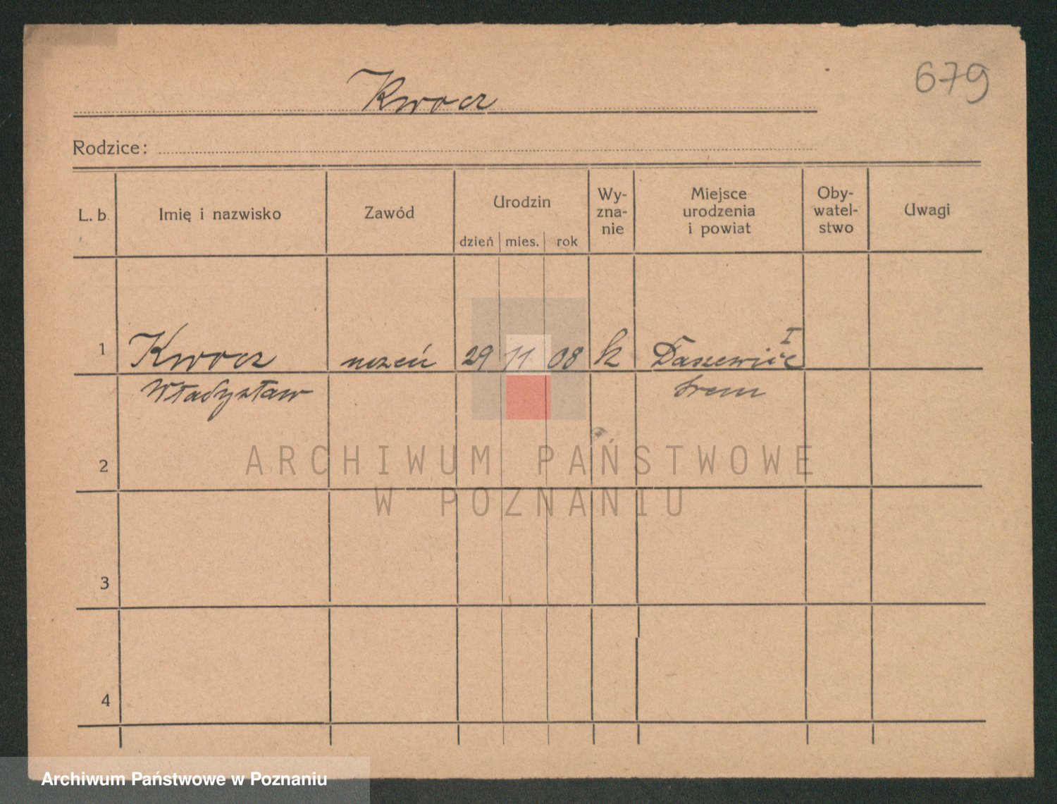 Podgląd karty osobowej dostępny jest po kliknięciu na nazwisko lub ikonkę karty. Można dokonywać powiększenia (ikony na górze) lub przechodzić między kolejnymi skanami (strzałki po bokach).