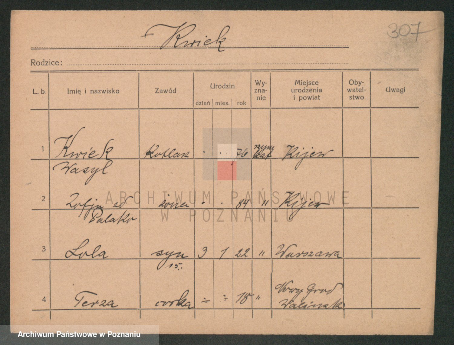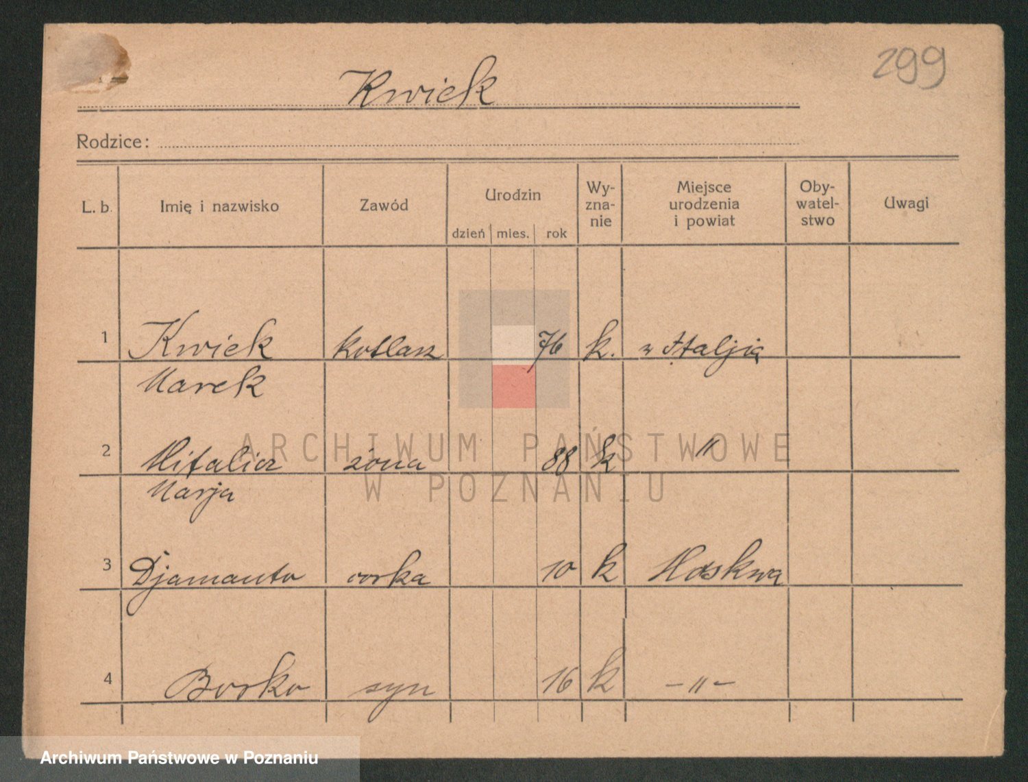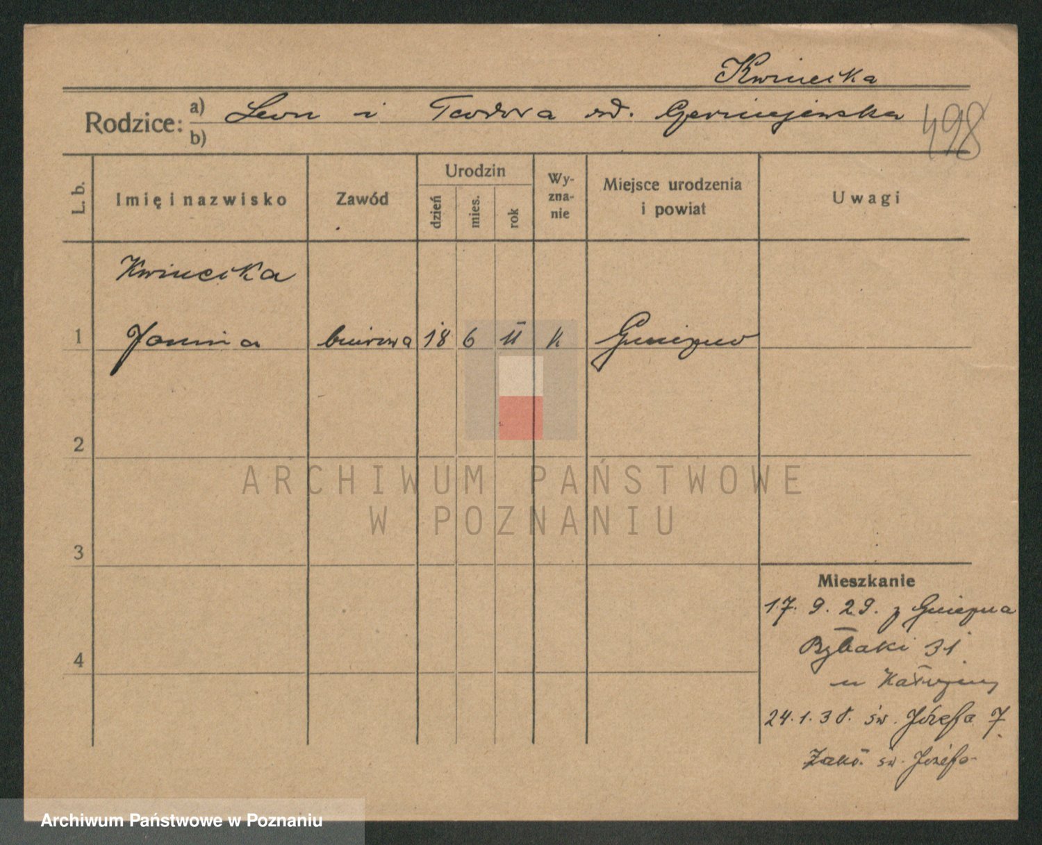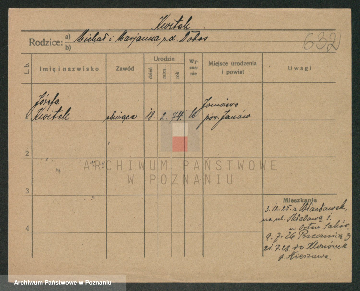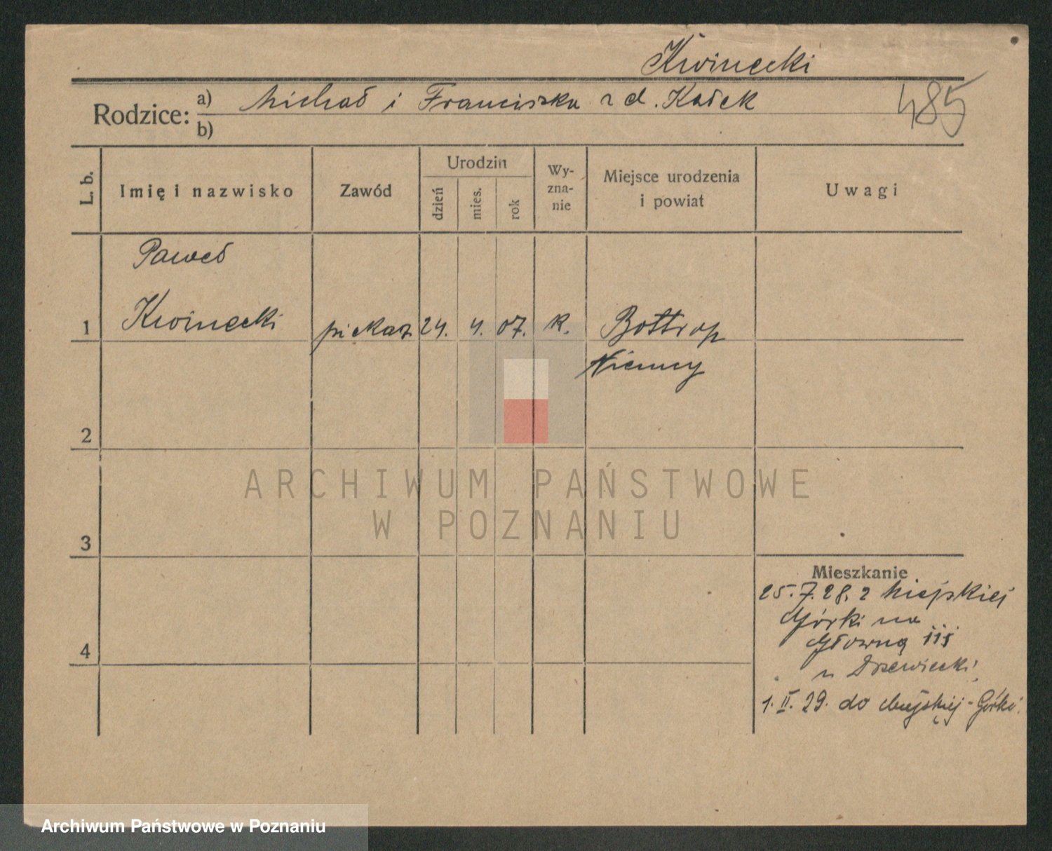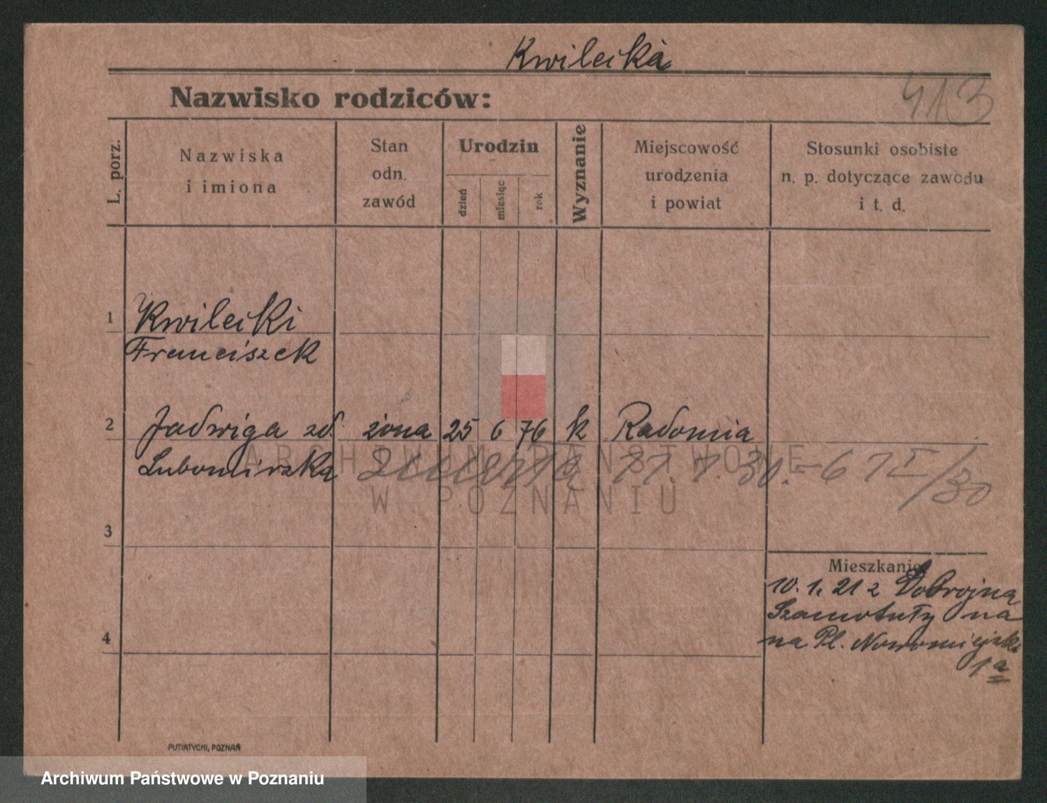 Podgląd karty osobowej dostępny jest po kliknięciu na nazwisko lub ikonkę karty. Można dokonywać powiększenia (ikony na górze) lub przechodzić między kolejnymi skanami (strzałki po bokach).