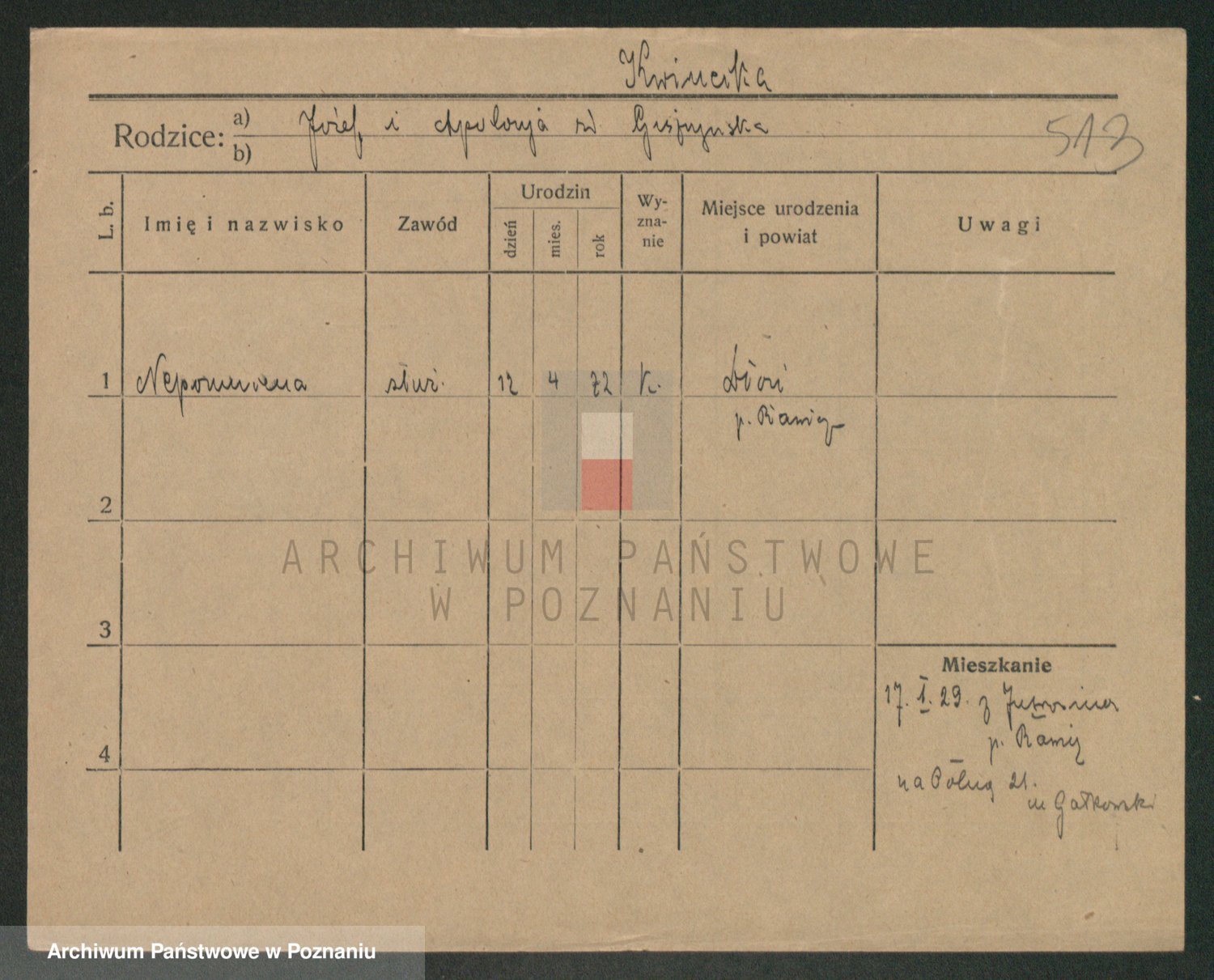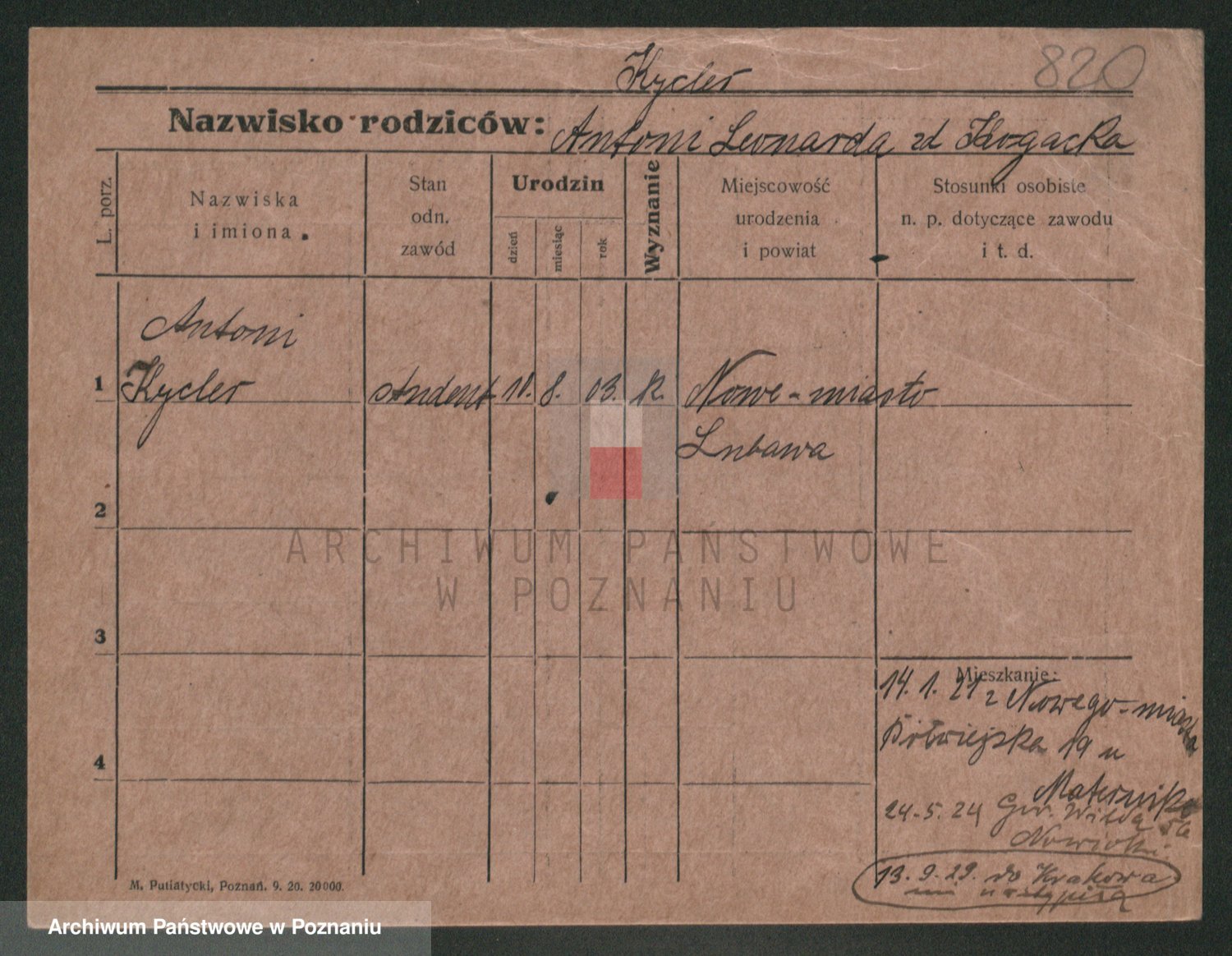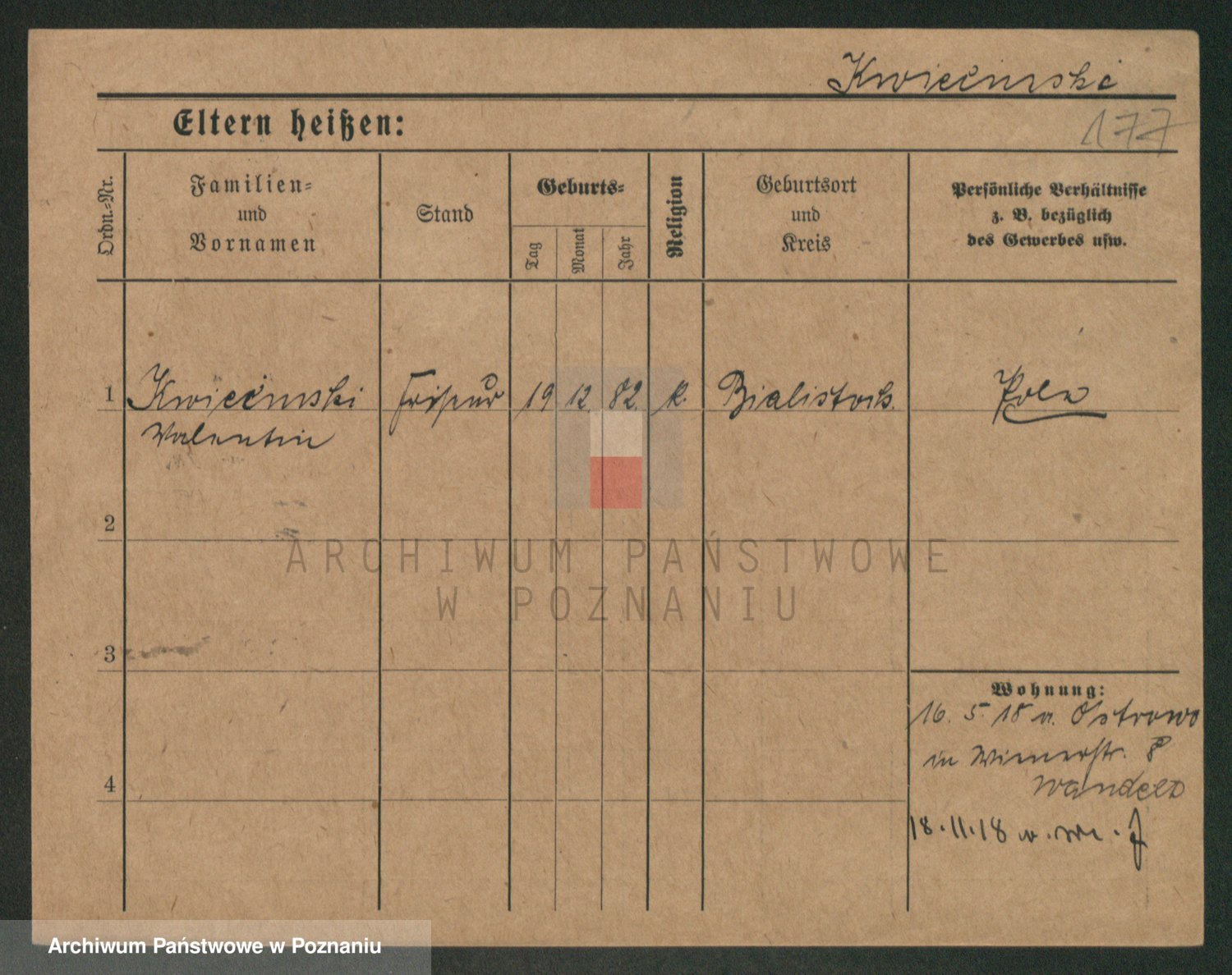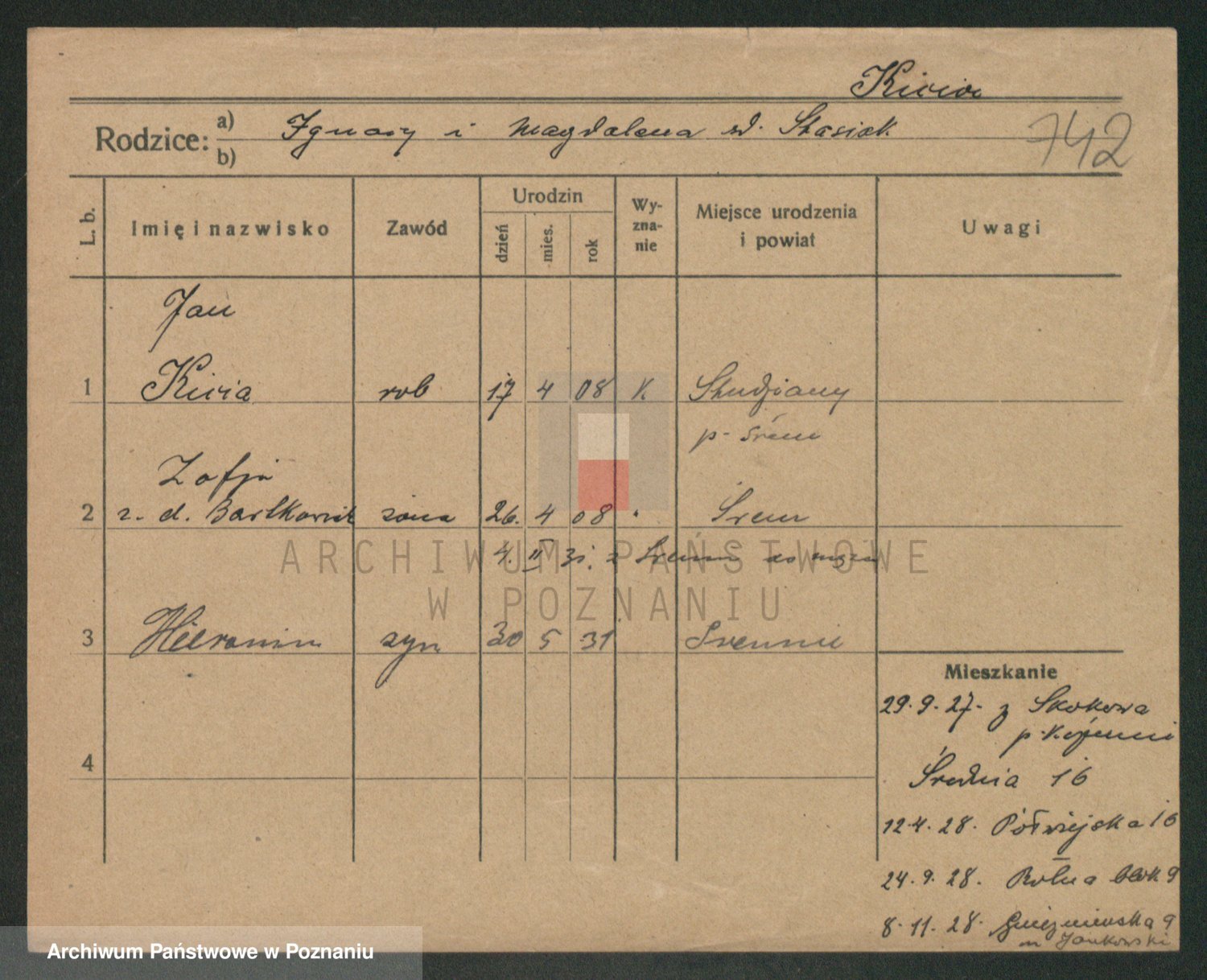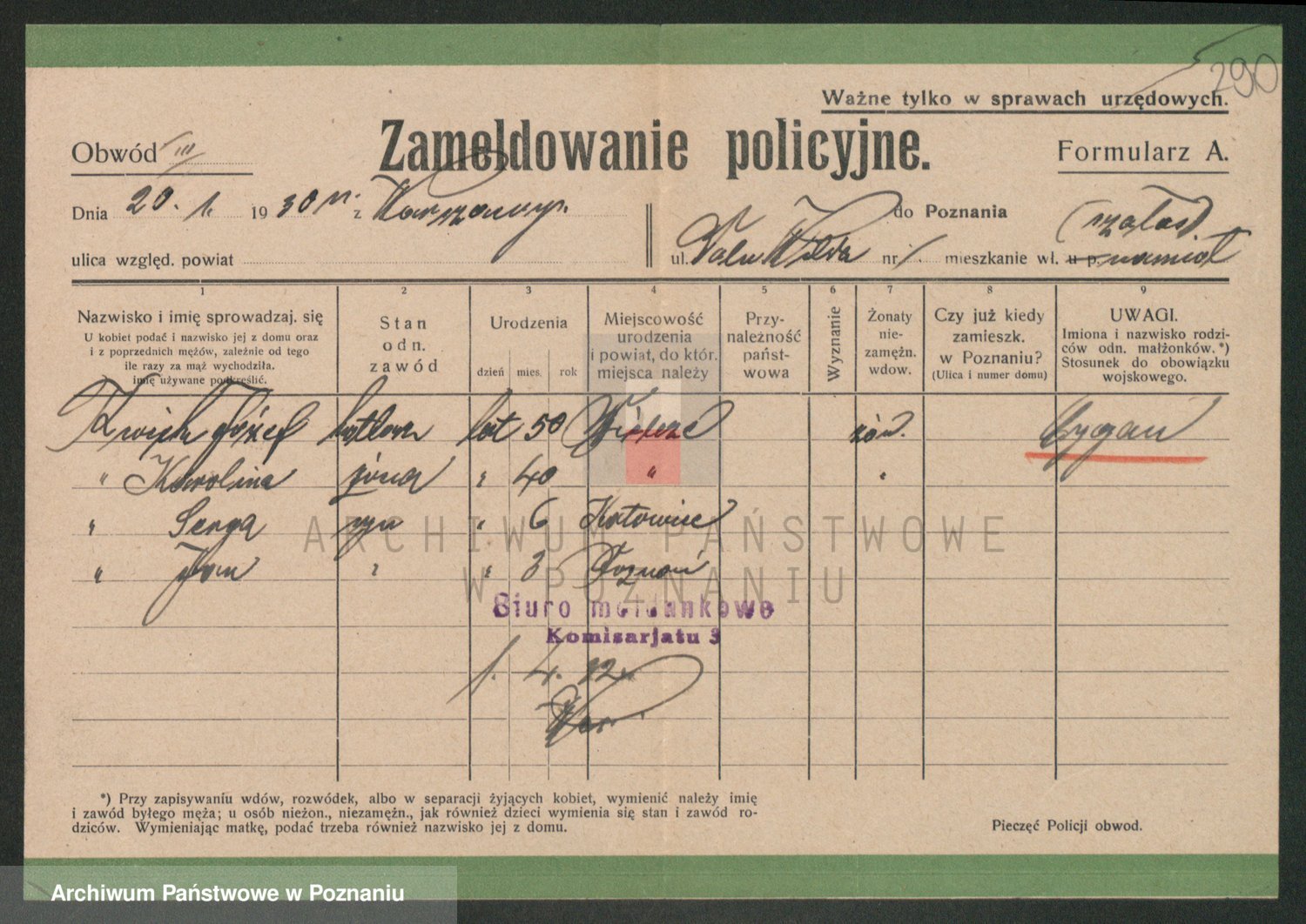 Podgląd karty osobowej dostępny jest po kliknięciu na nazwisko lub ikonkę karty. Można dokonywać powiększenia (ikony na górze) lub przechodzić między kolejnymi skanami (strzałki po bokach).