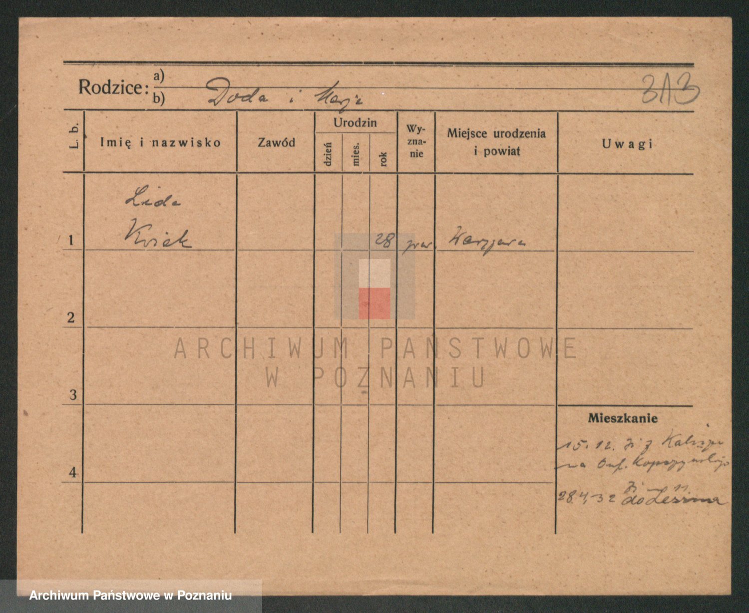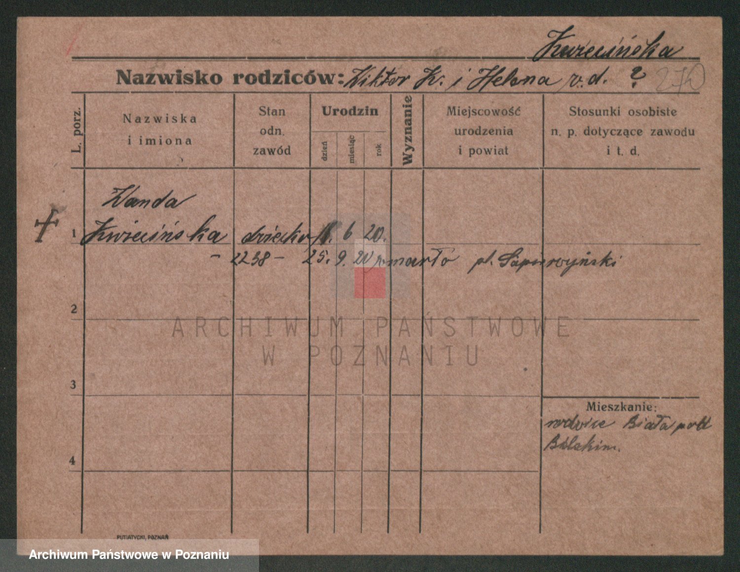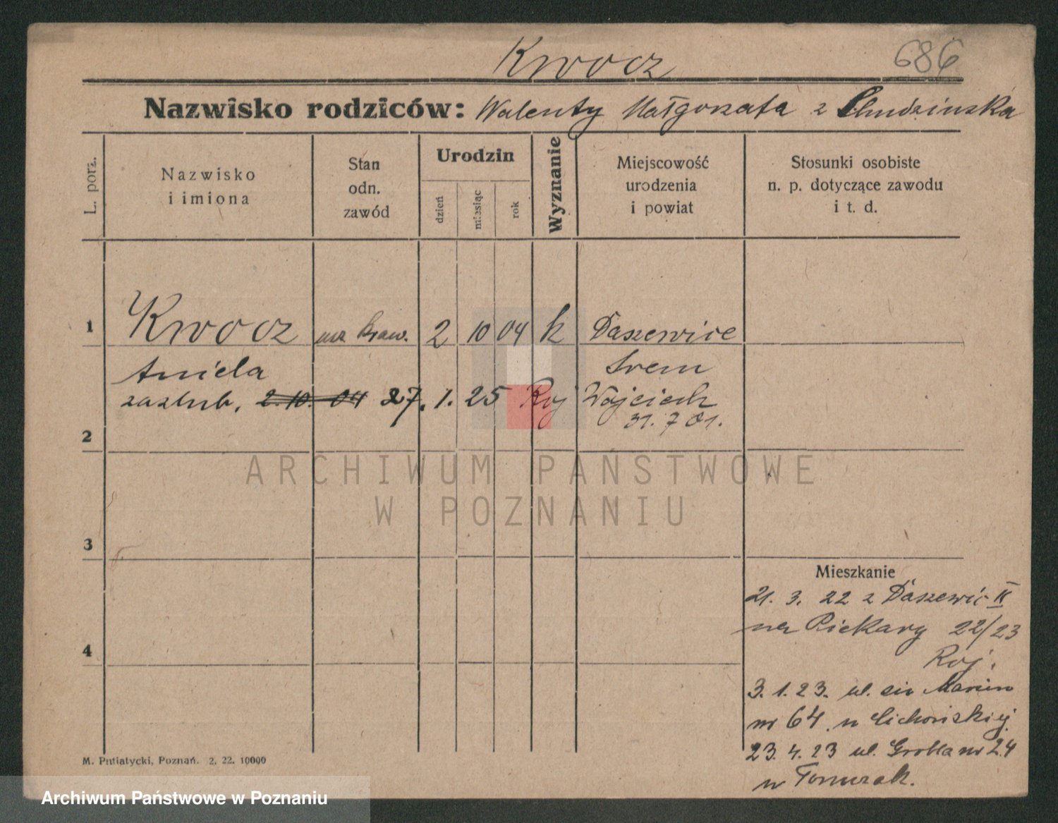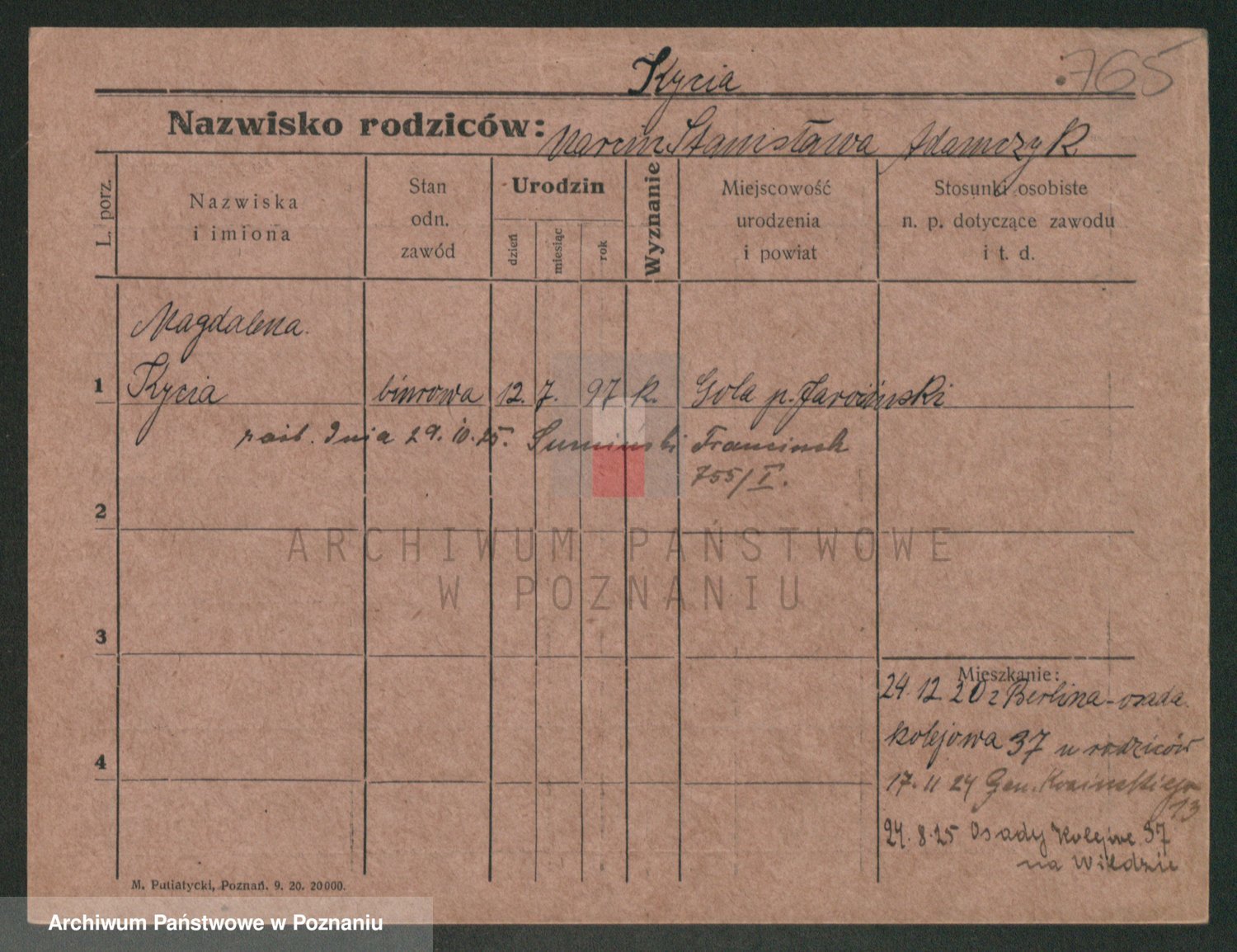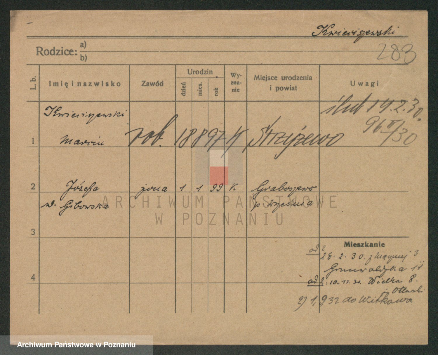 Podgląd karty osobowej dostępny jest po kliknięciu na nazwisko lub ikonkę karty. Można dokonywać powiększenia (ikony na górze) lub przechodzić między kolejnymi skanami (strzałki po bokach).