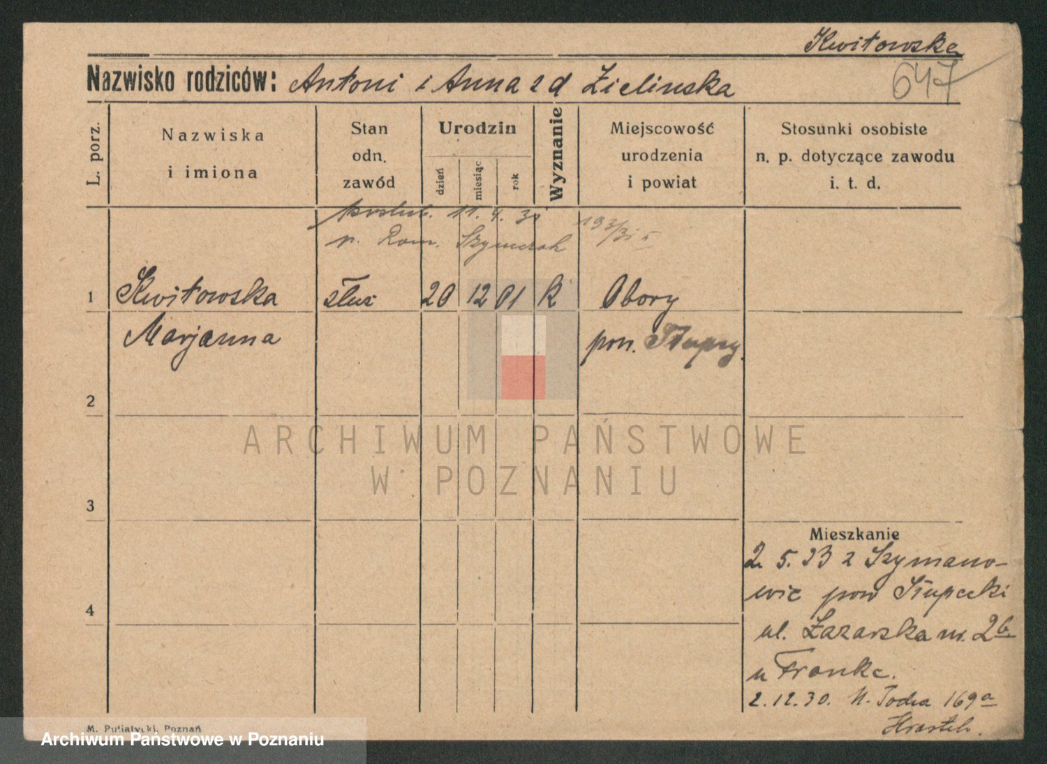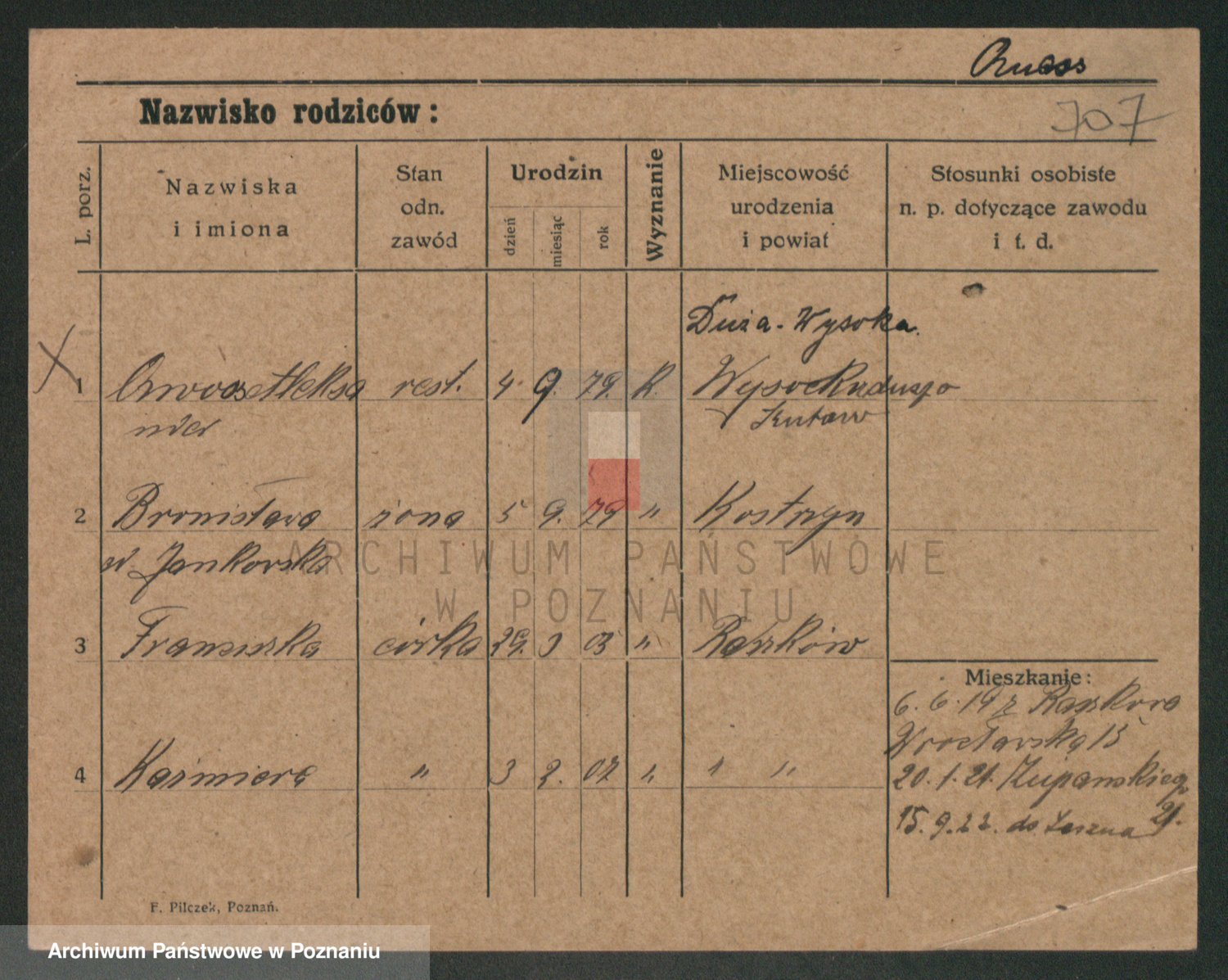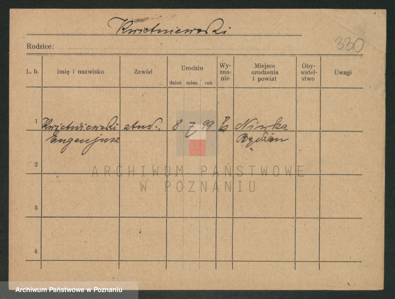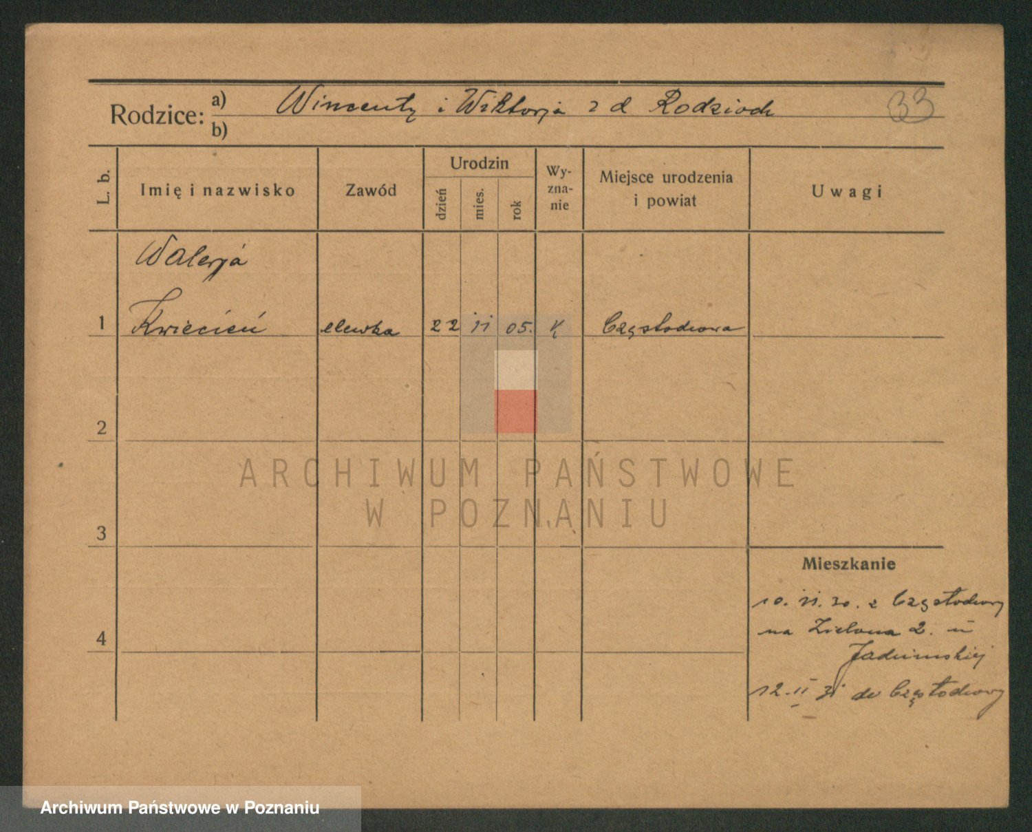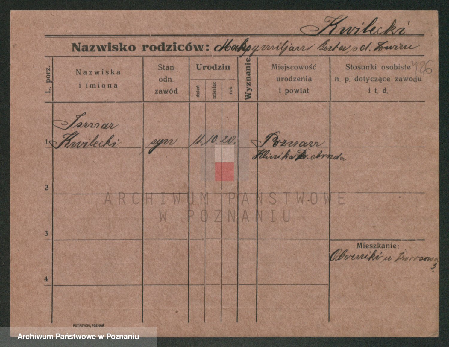 Podgląd karty osobowej dostępny jest po kliknięciu na nazwisko lub ikonkę karty. Można dokonywać powiększenia (ikony na górze) lub przechodzić między kolejnymi skanami (strzałki po bokach).