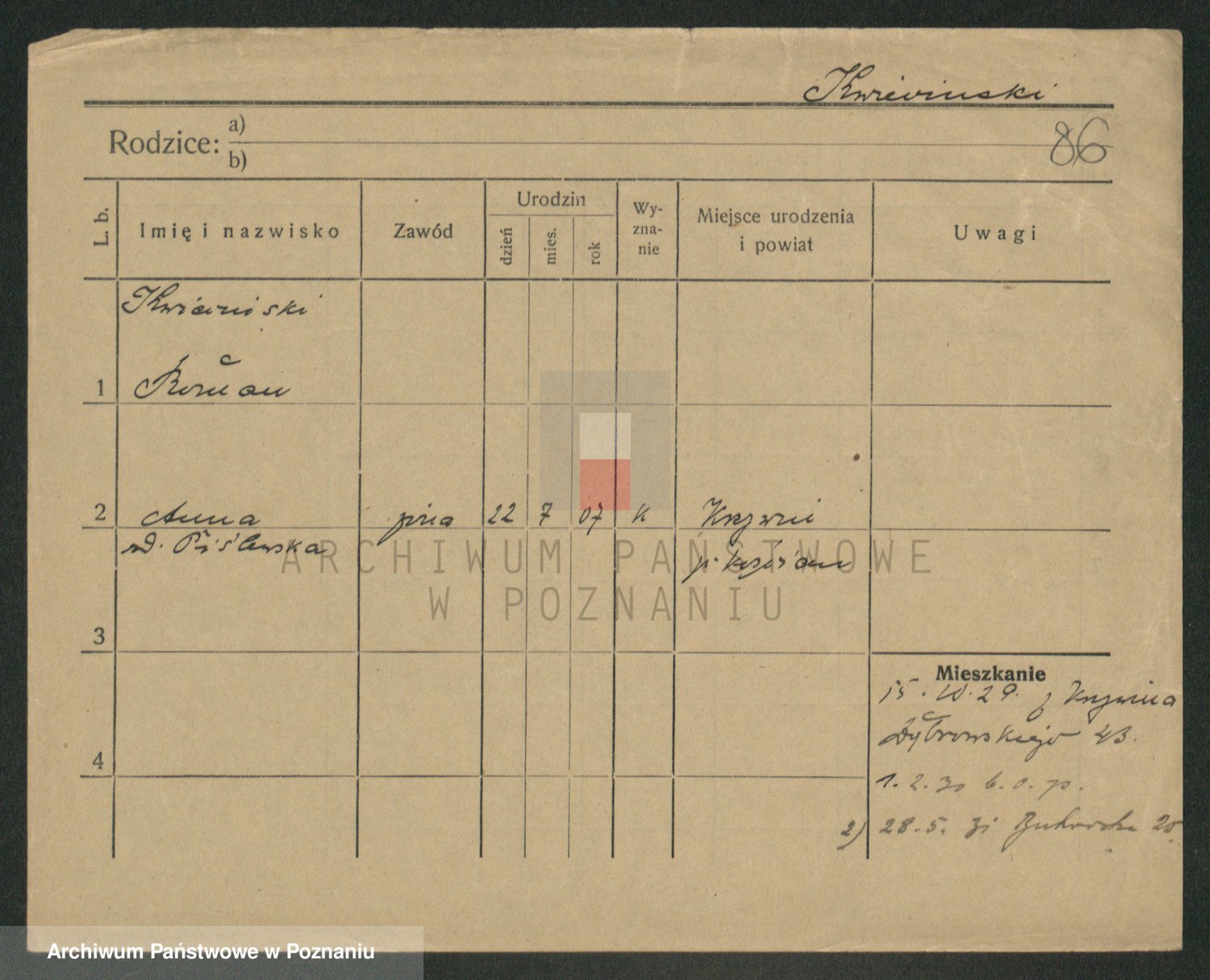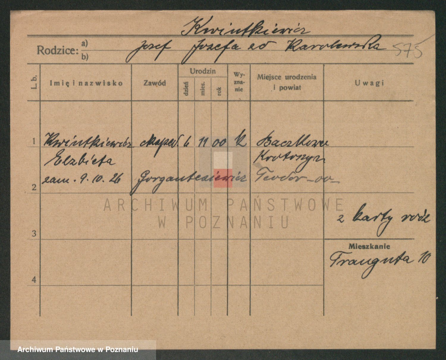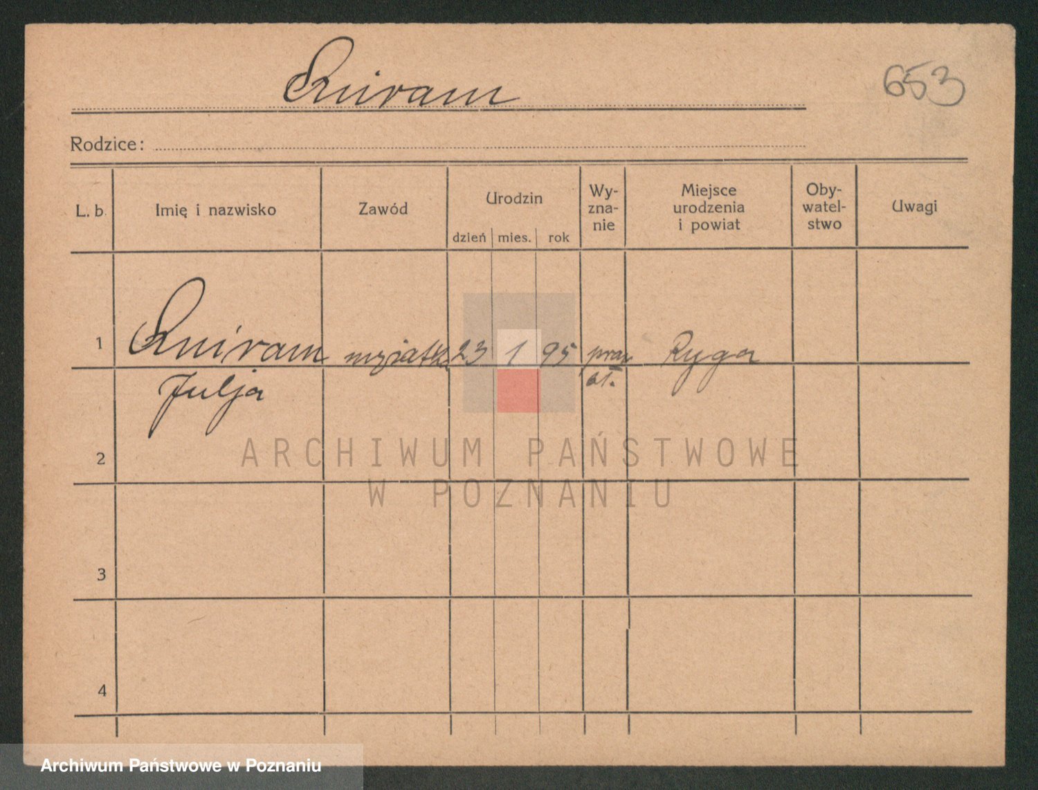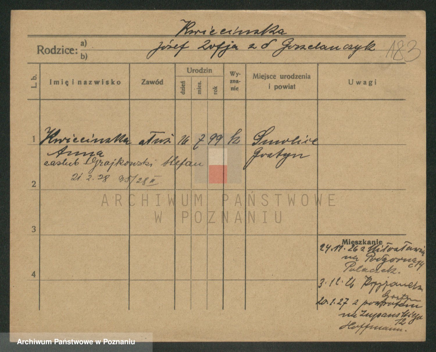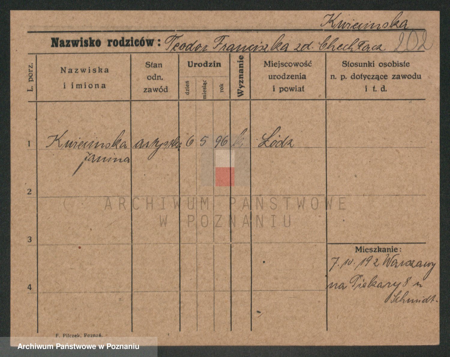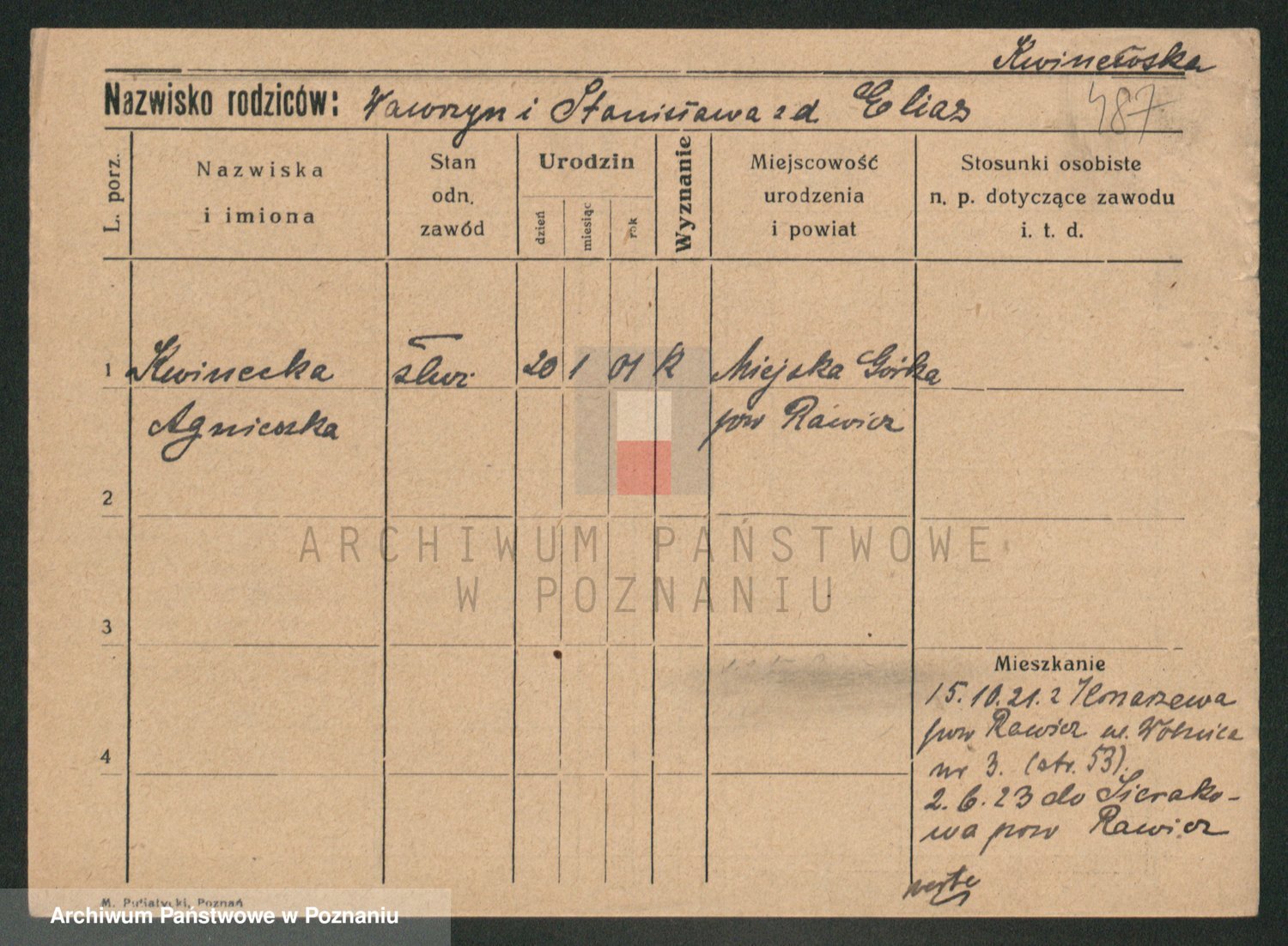 Podgląd karty osobowej dostępny jest po kliknięciu na nazwisko lub ikonkę karty. Można dokonywać powiększenia (ikony na górze) lub przechodzić między kolejnymi skanami (strzałki po bokach).