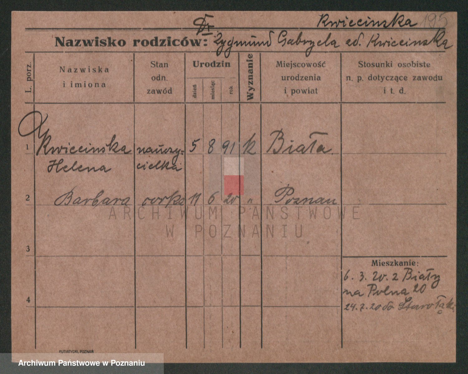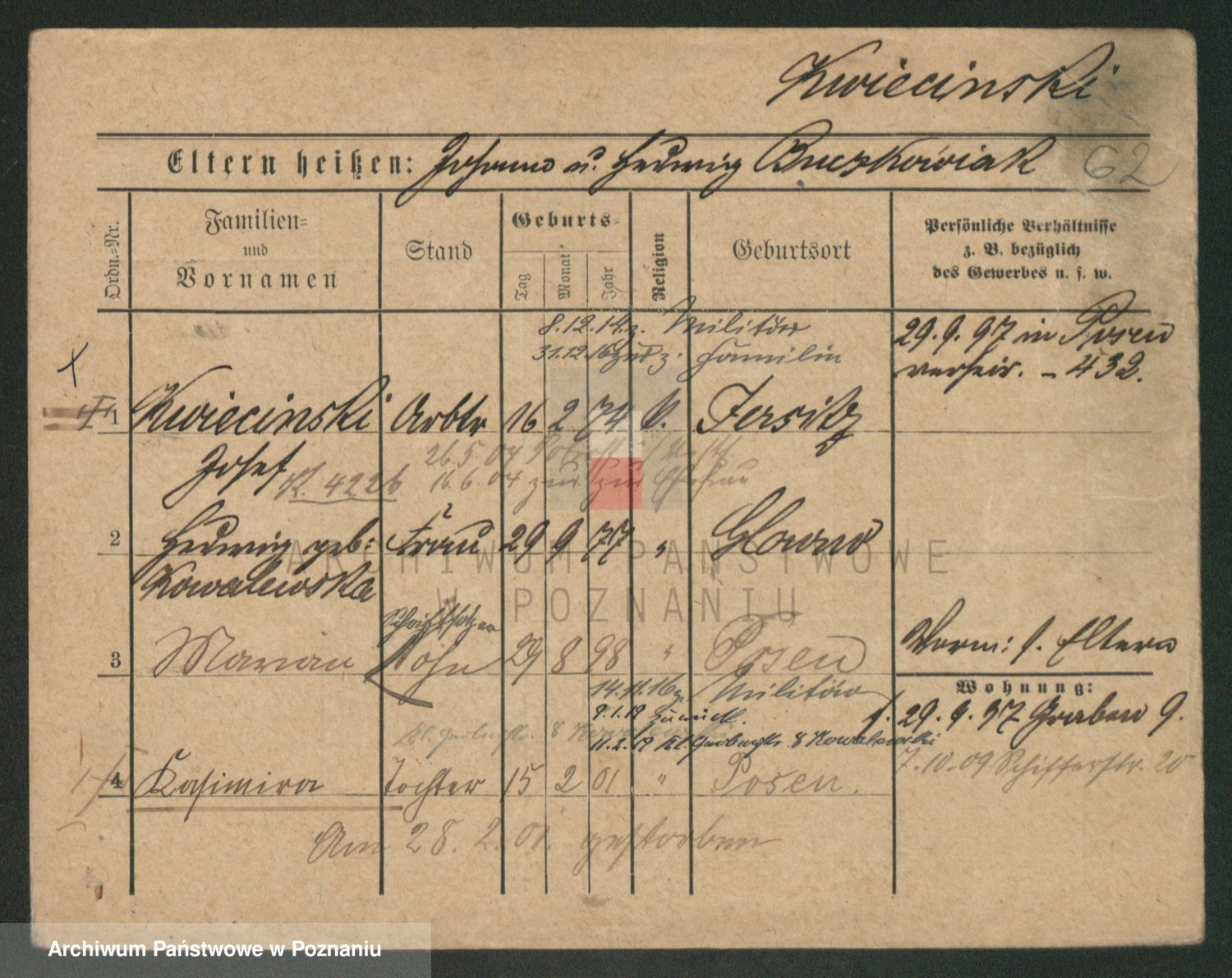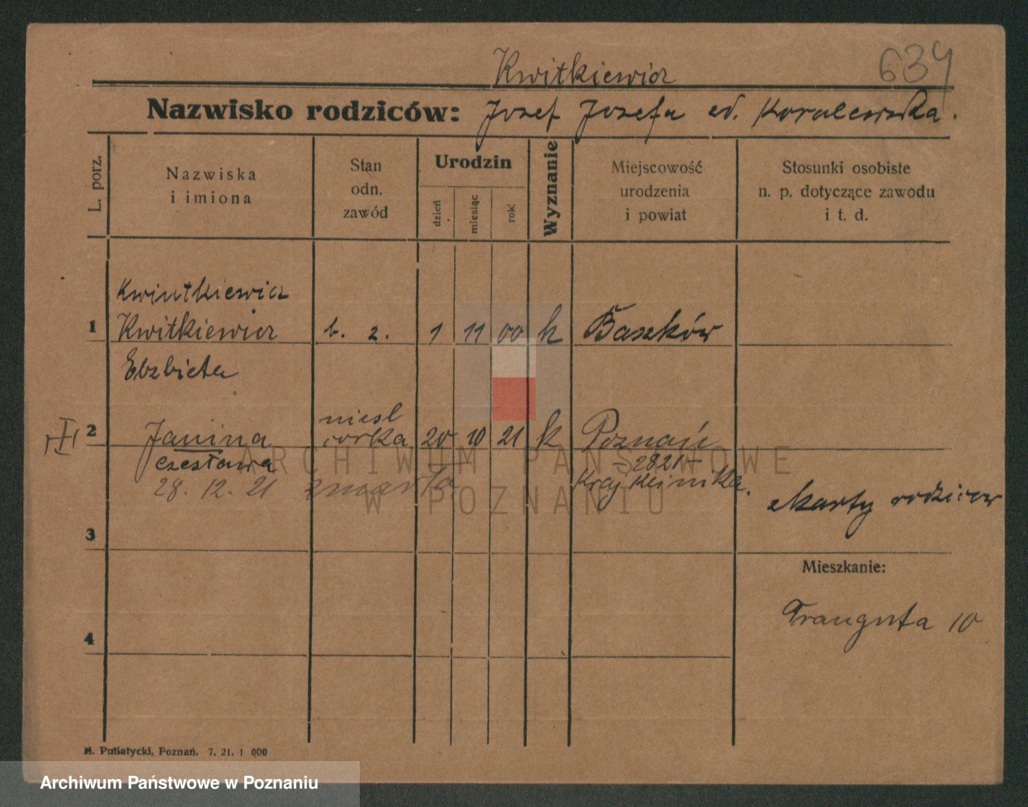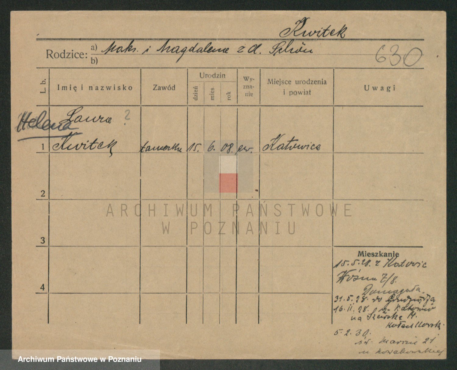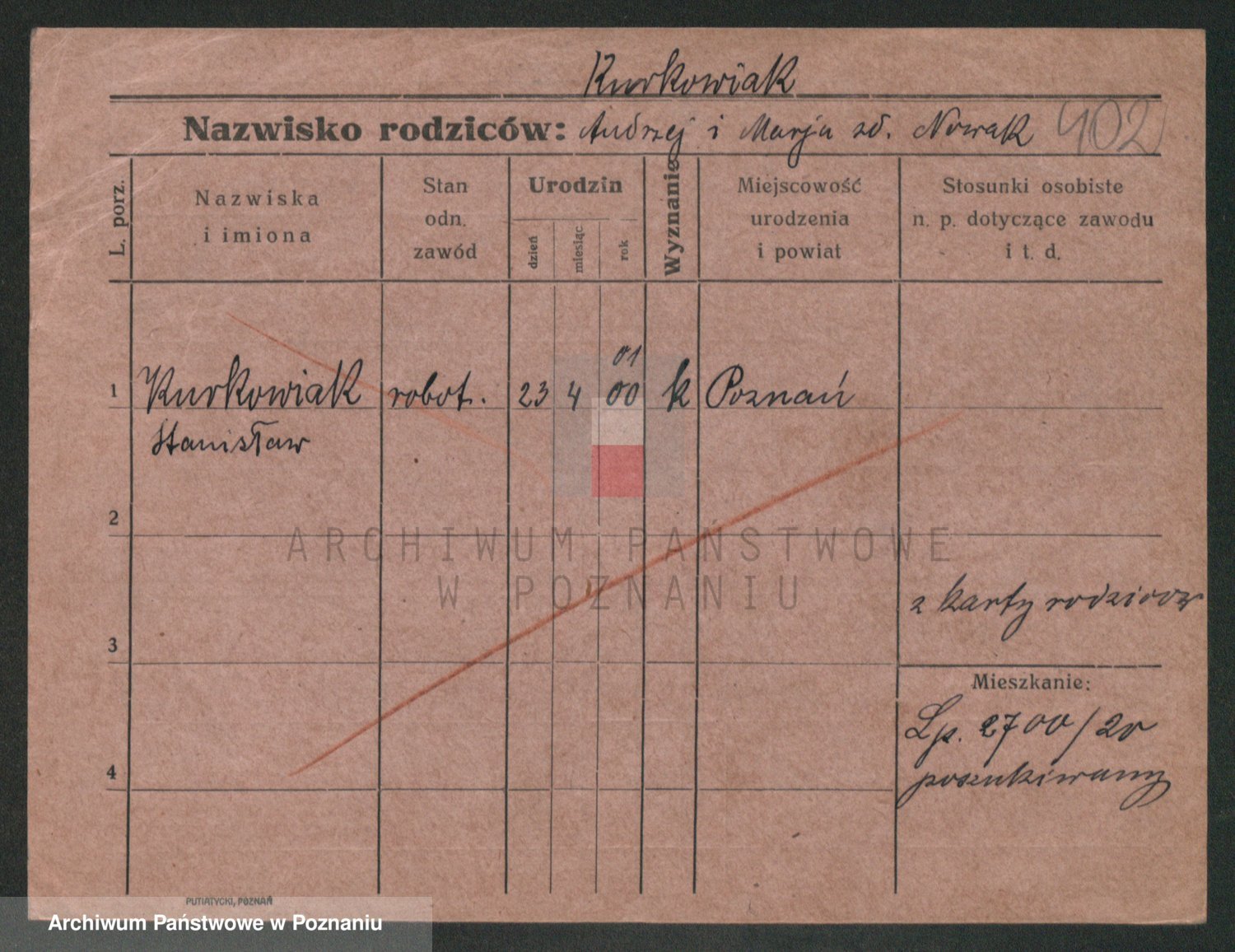 Podgląd karty osobowej dostępny jest po kliknięciu na nazwisko lub ikonkę karty. Można dokonywać powiększenia (ikony na górze) lub przechodzić między kolejnymi skanami (strzałki po bokach).