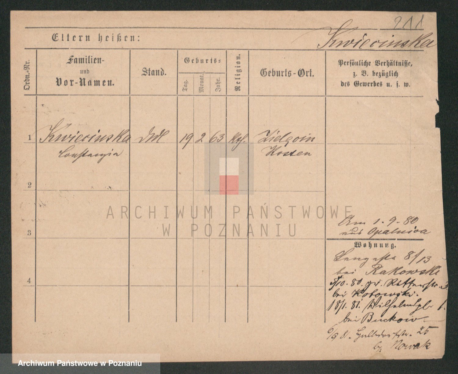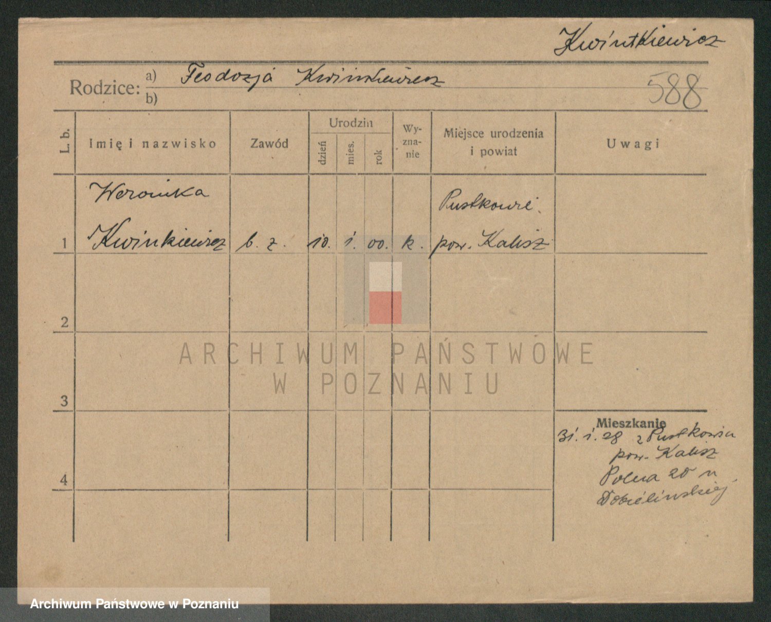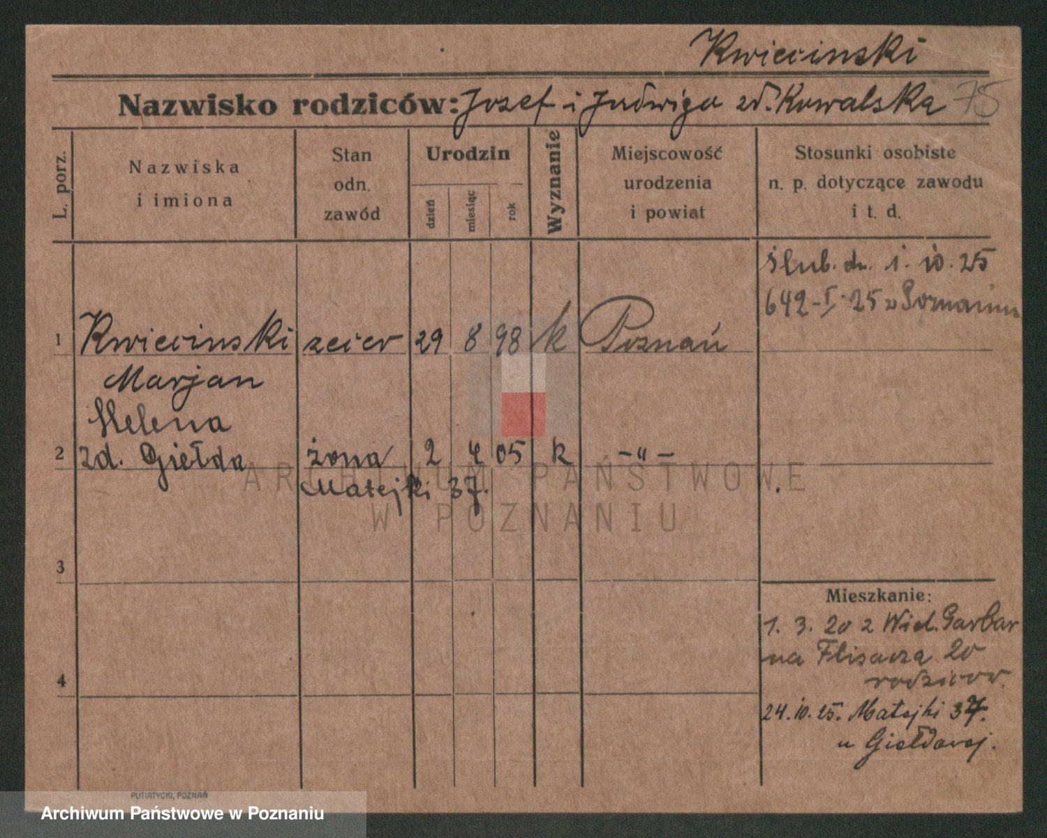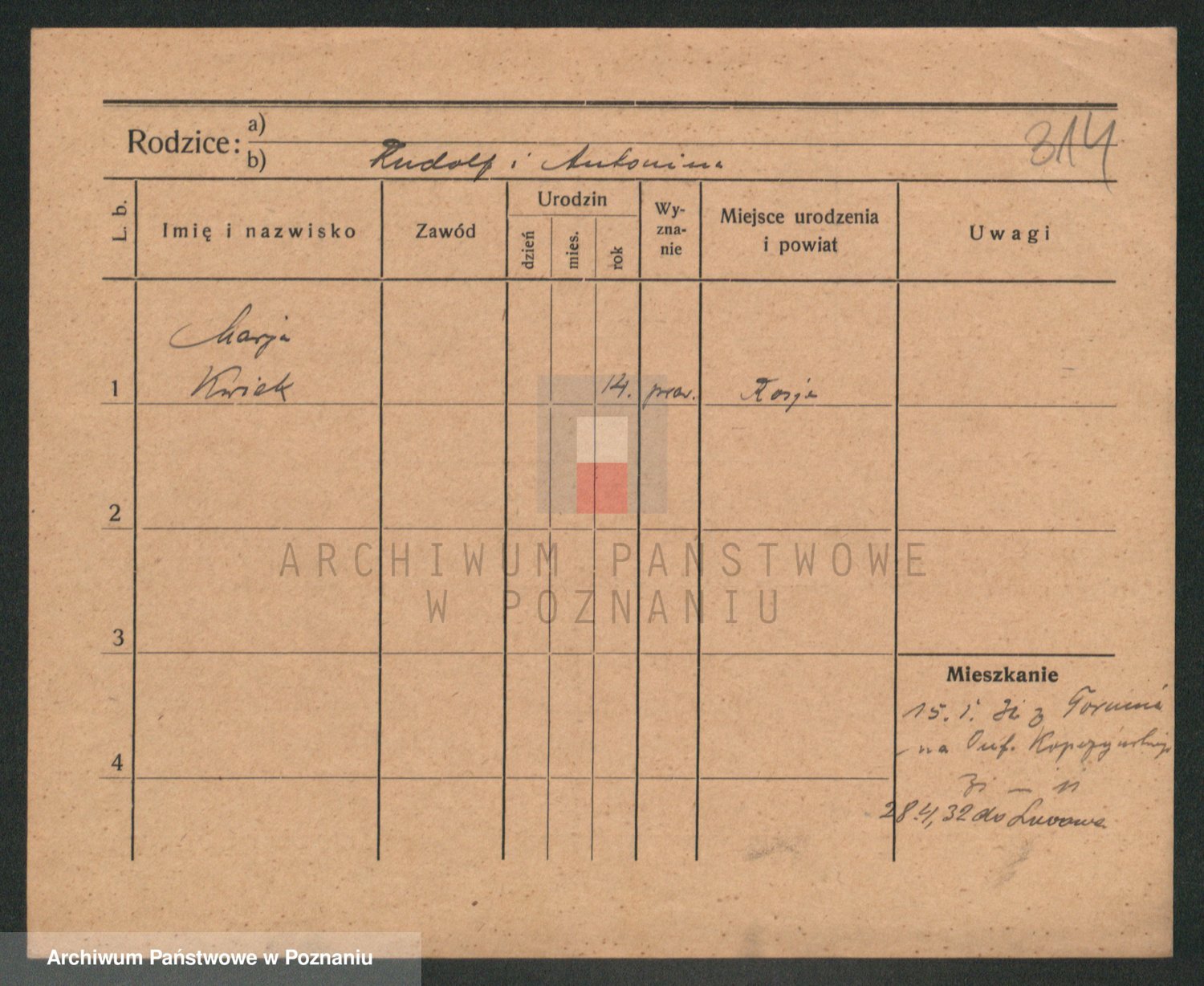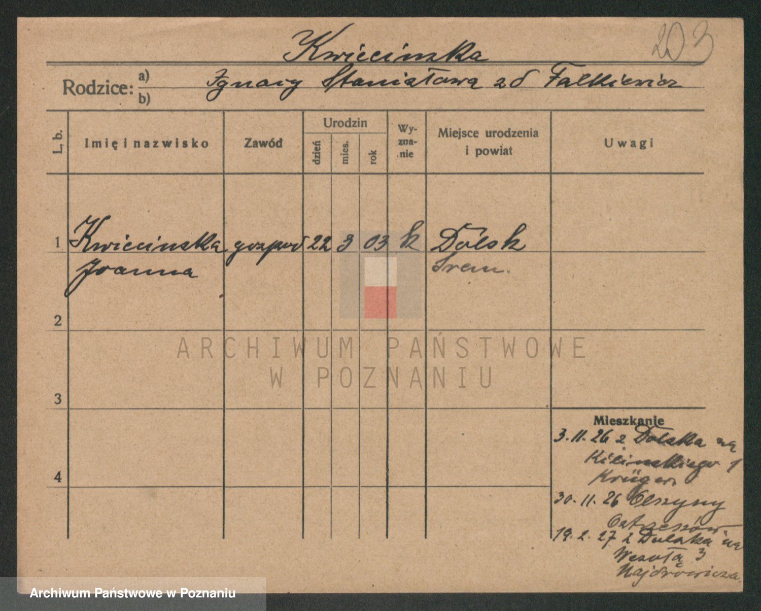 Podgląd karty osobowej dostępny jest po kliknięciu na nazwisko lub ikonkę karty. Można dokonywać powiększenia (ikony na górze) lub przechodzić między kolejnymi skanami (strzałki po bokach).