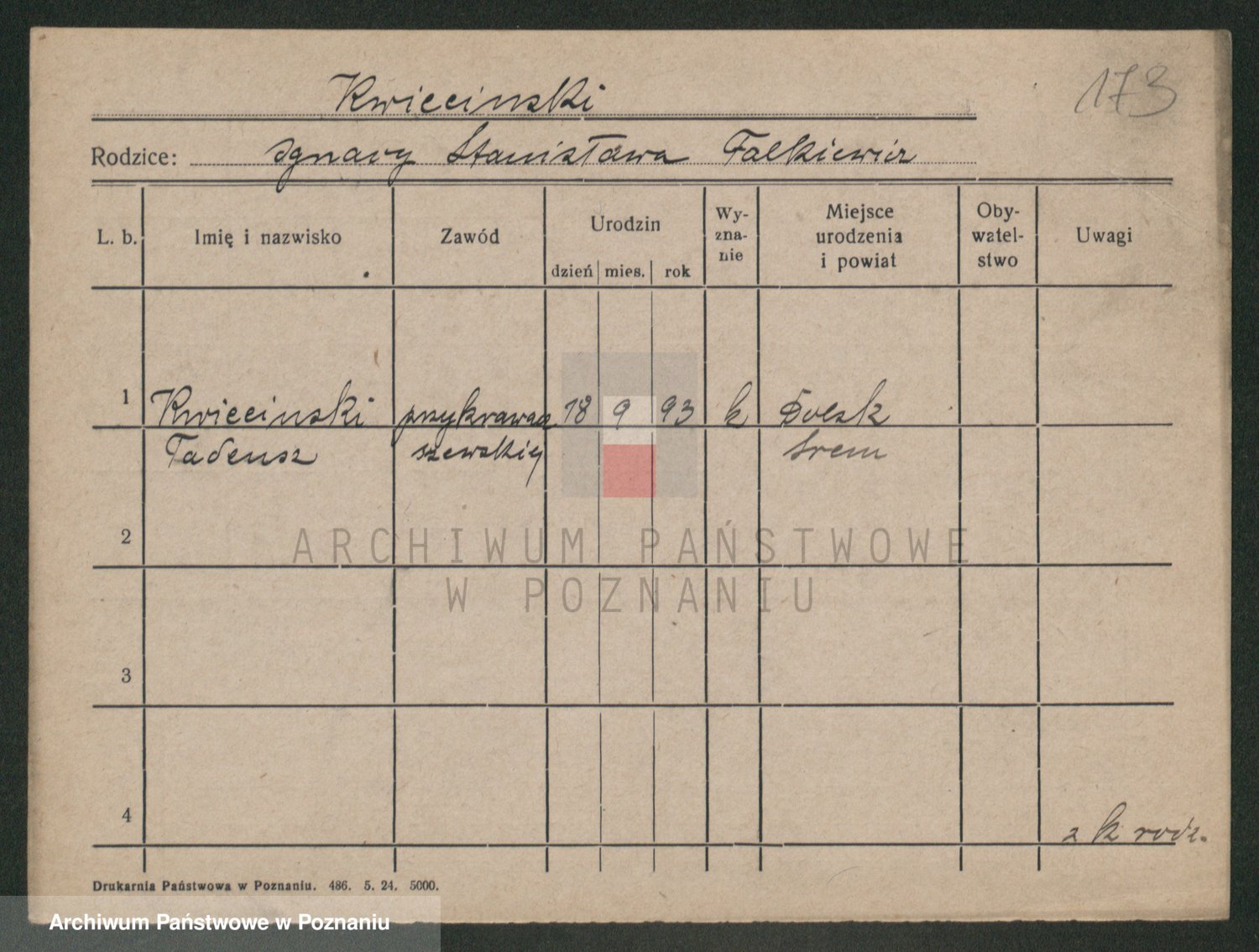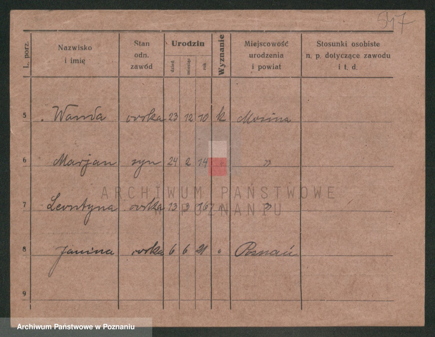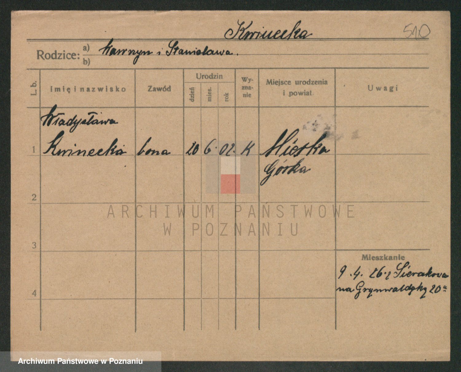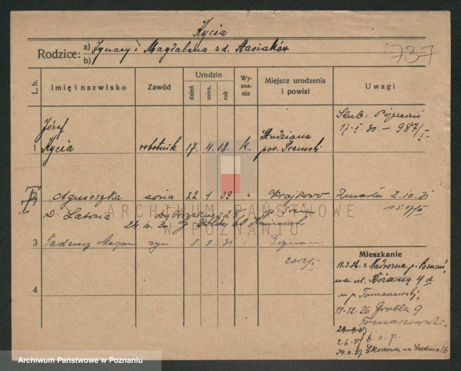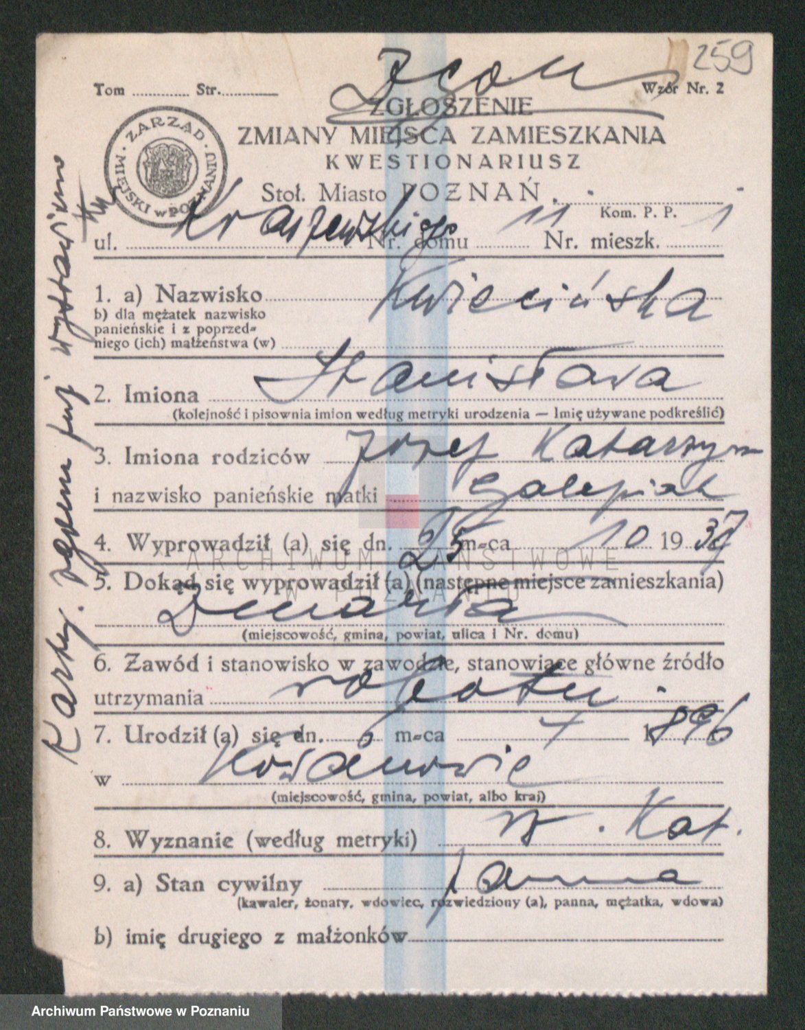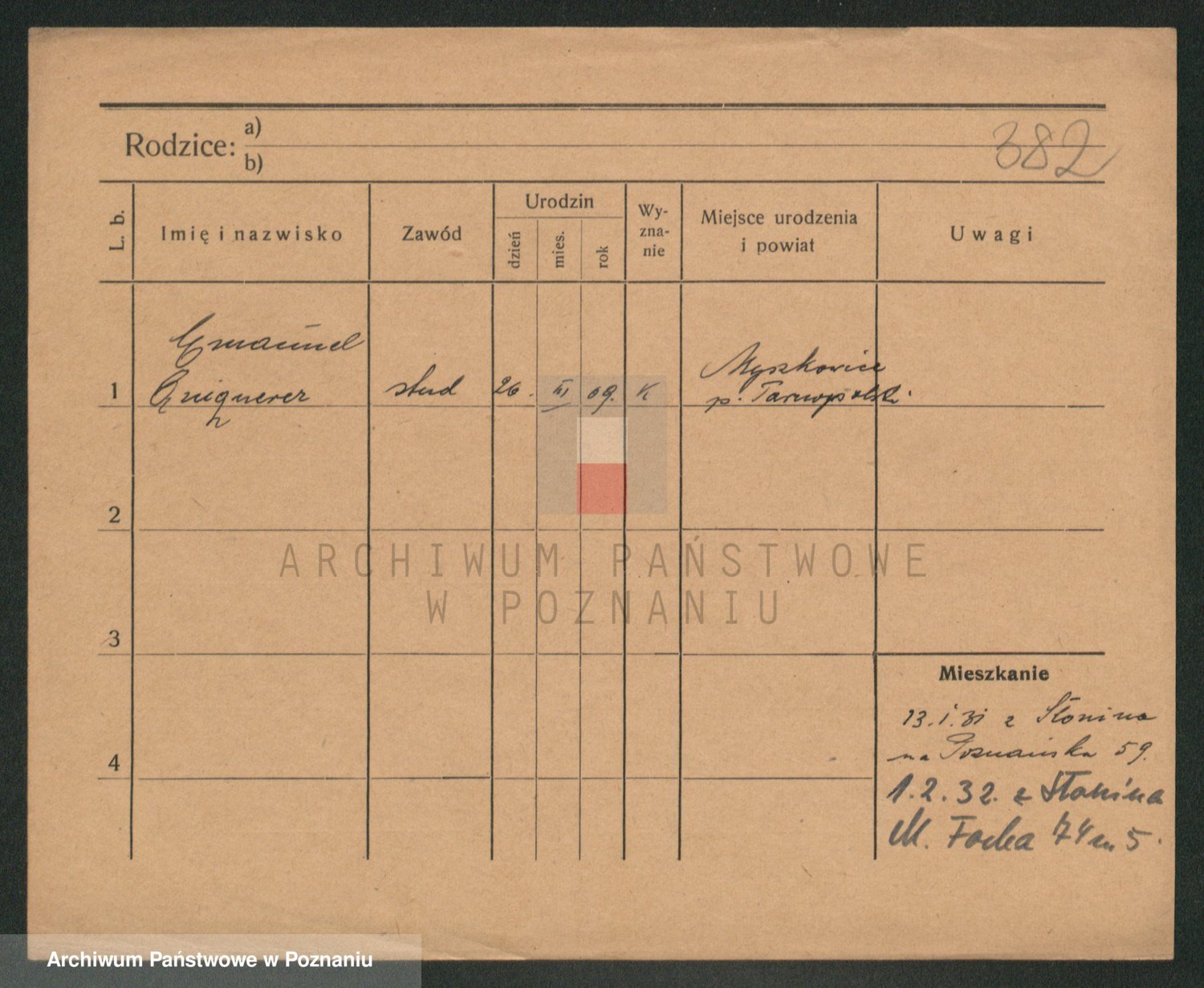 Podgląd karty osobowej dostępny jest po kliknięciu na nazwisko lub ikonkę karty. Można dokonywać powiększenia (ikony na górze) lub przechodzić między kolejnymi skanami (strzałki po bokach).