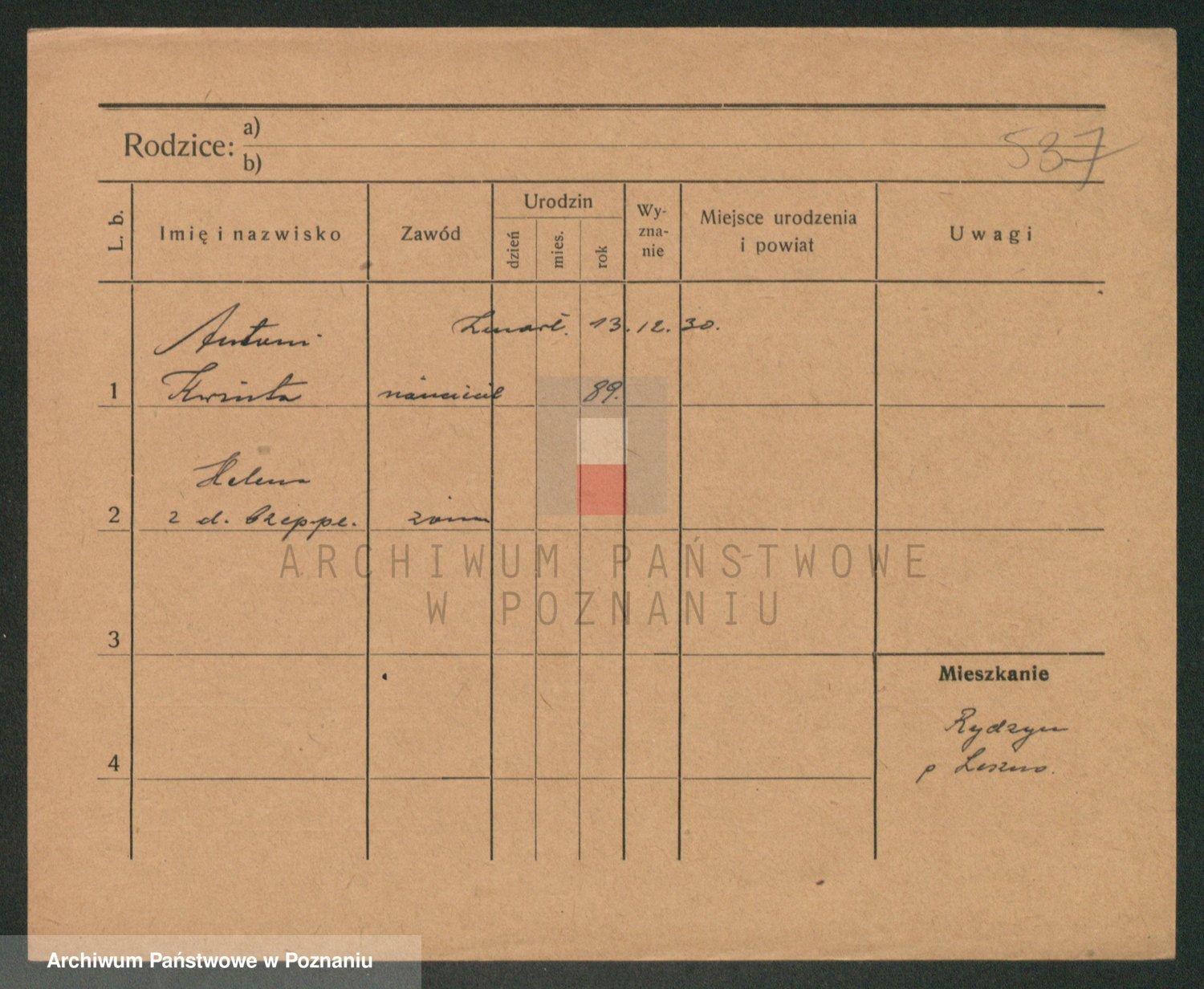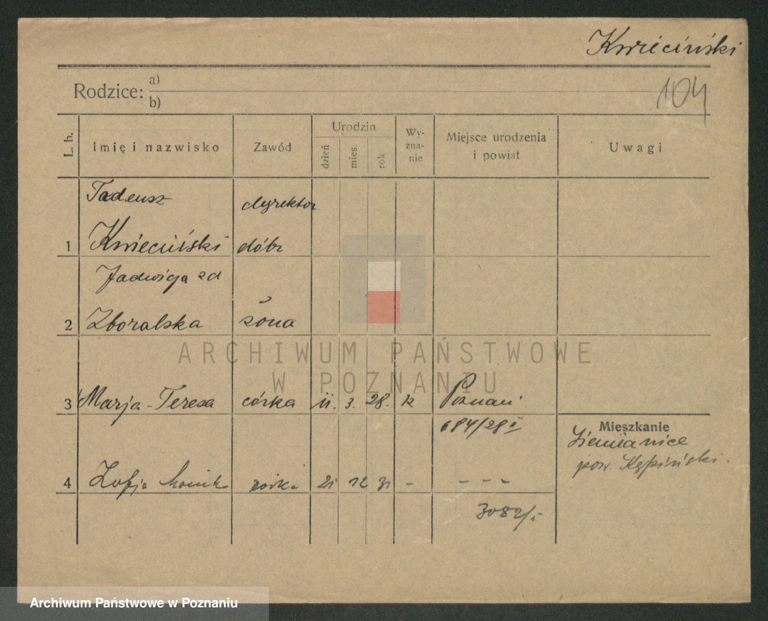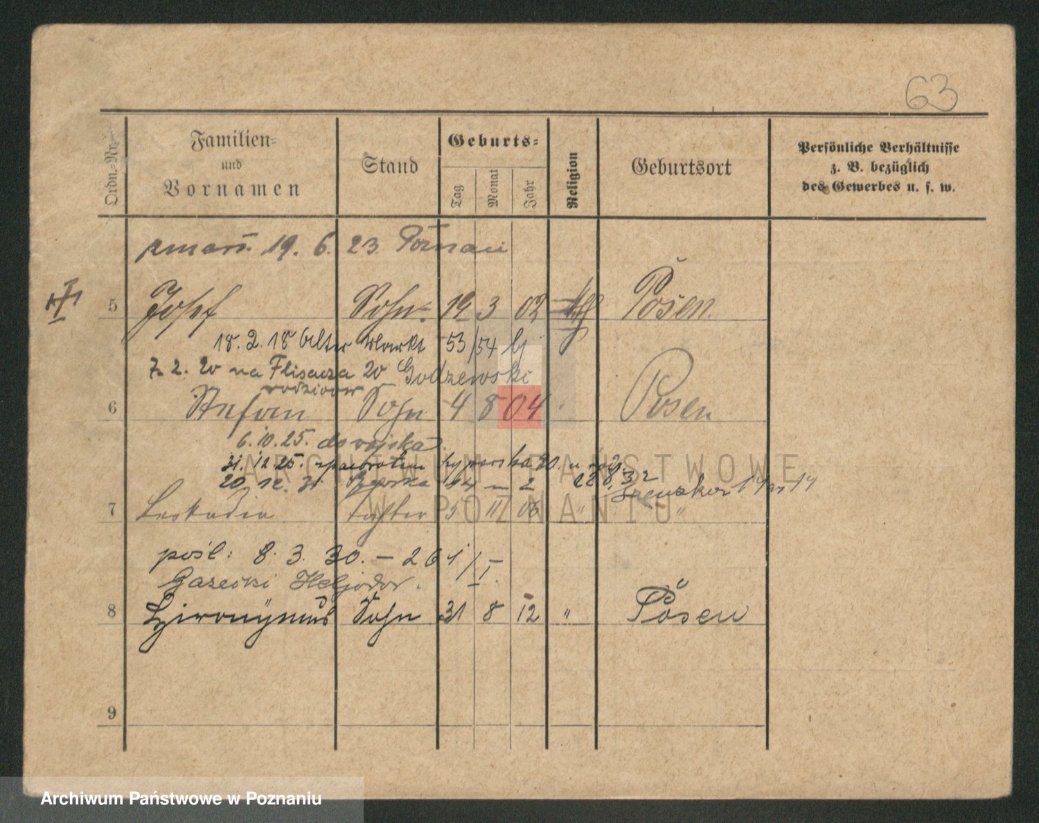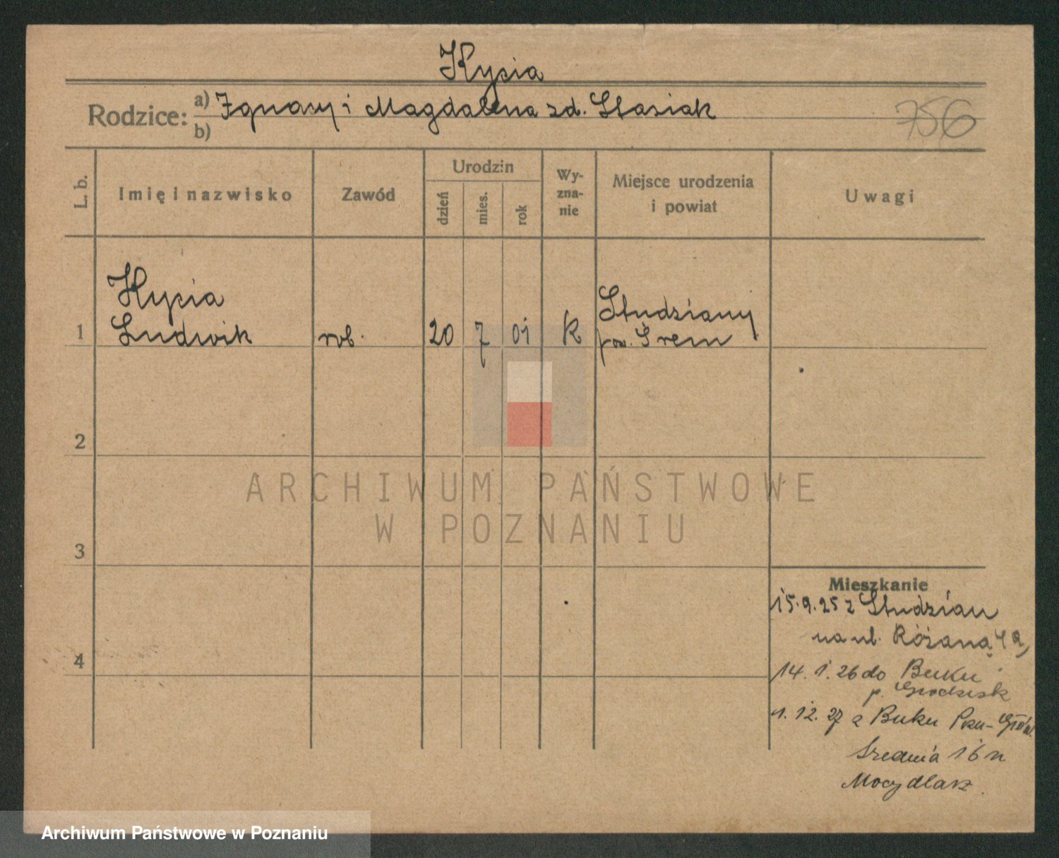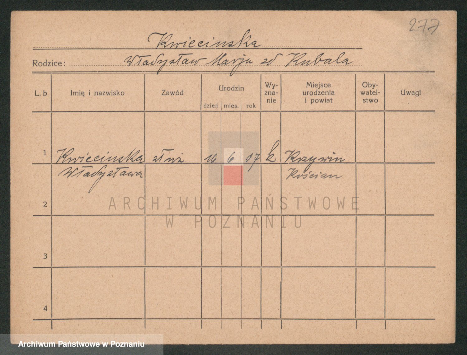 Podgląd karty osobowej dostępny jest po kliknięciu na nazwisko lub ikonkę karty. Można dokonywać powiększenia (ikony na górze) lub przechodzić między kolejnymi skanami (strzałki po bokach).