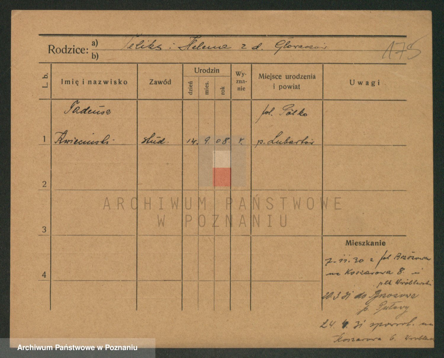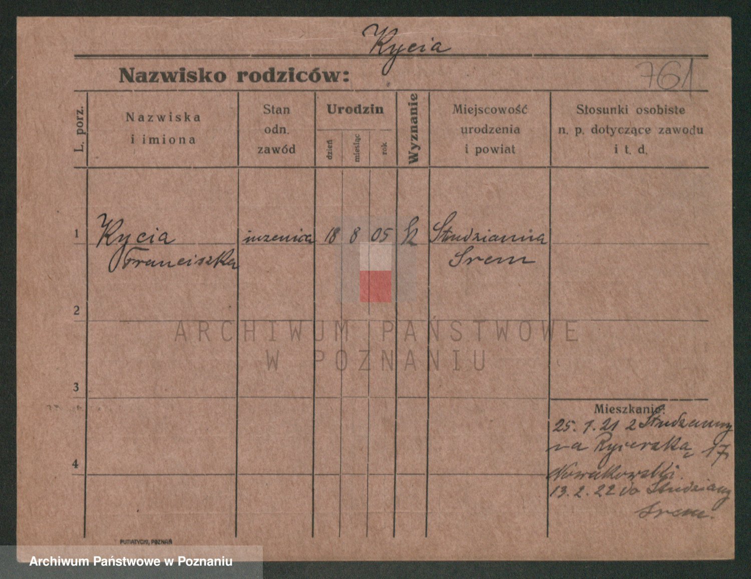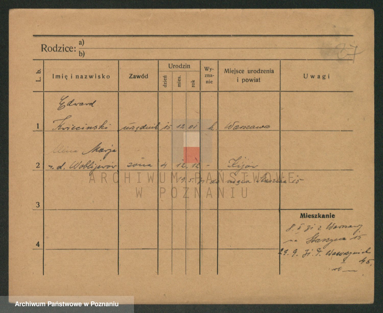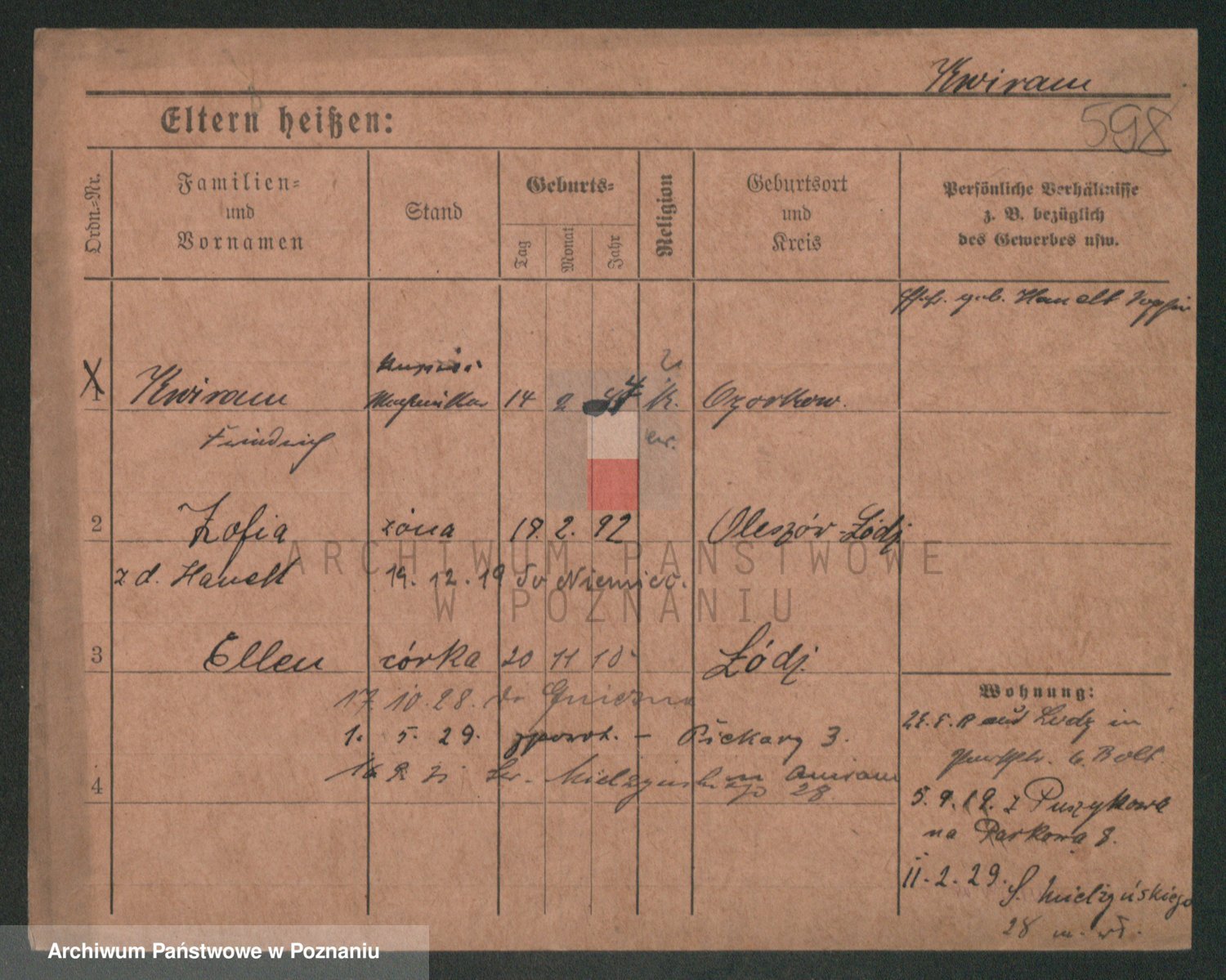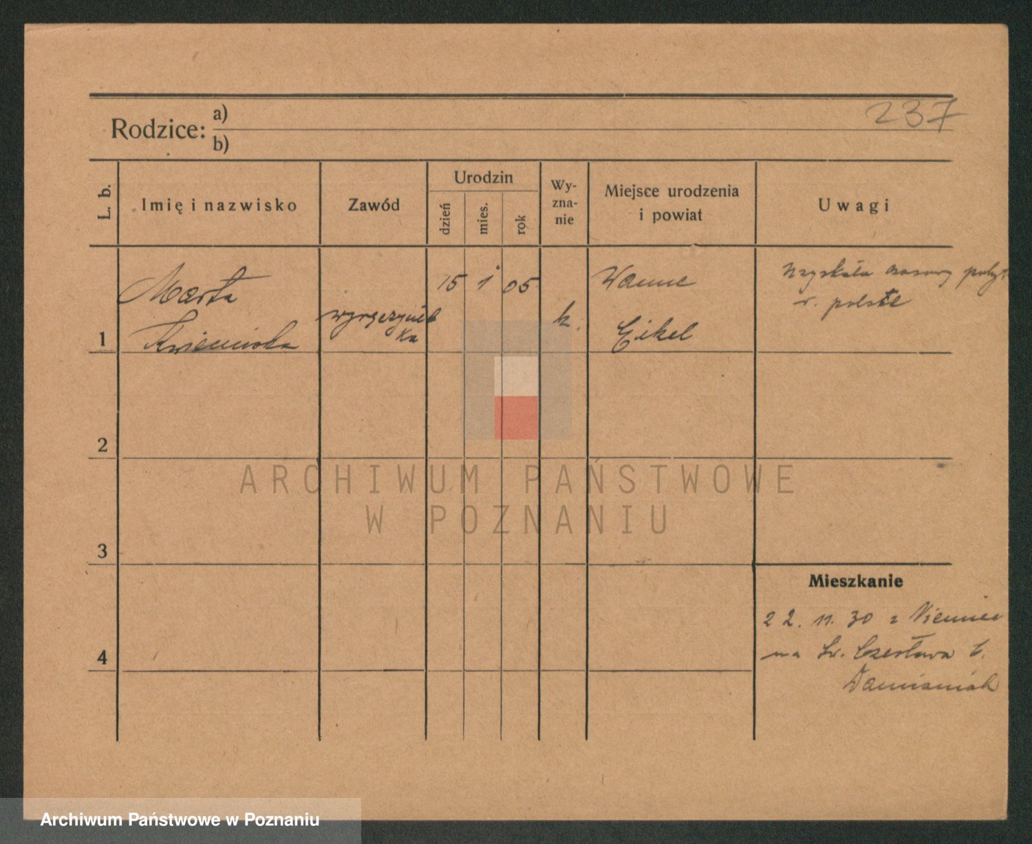Podgląd karty osobowej dostępny jest po kliknięciu na nazwisko lub ikonkę karty. Można dokonywać powiększenia (ikony na górze) lub przechodzić między kolejnymi skanami (strzałki po bokach).