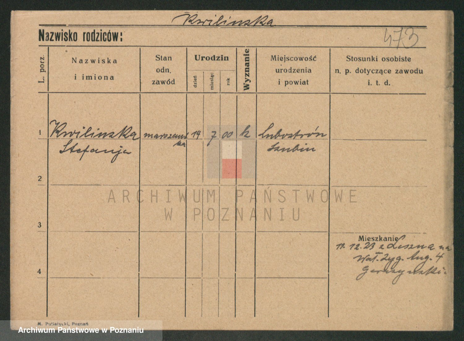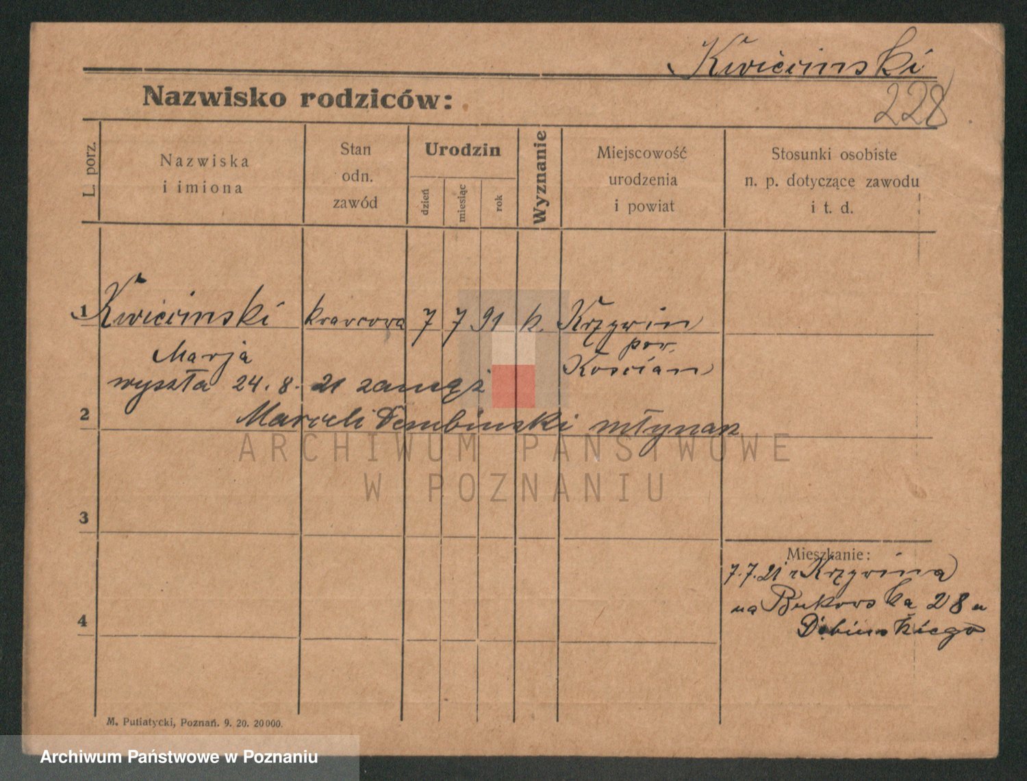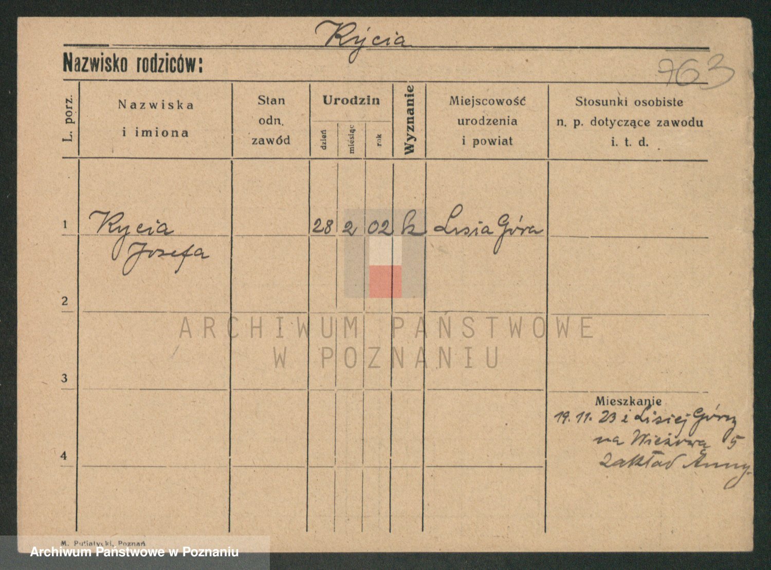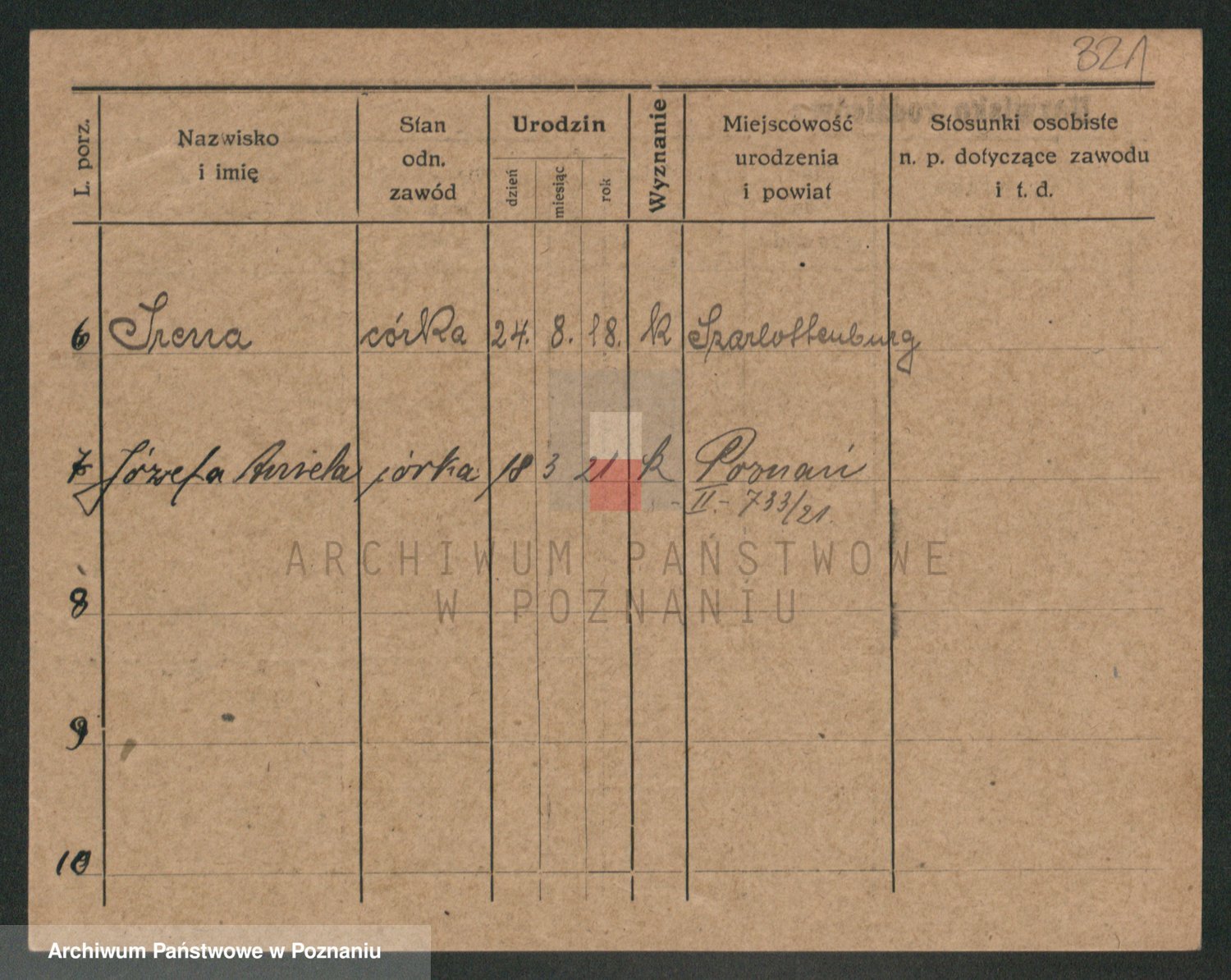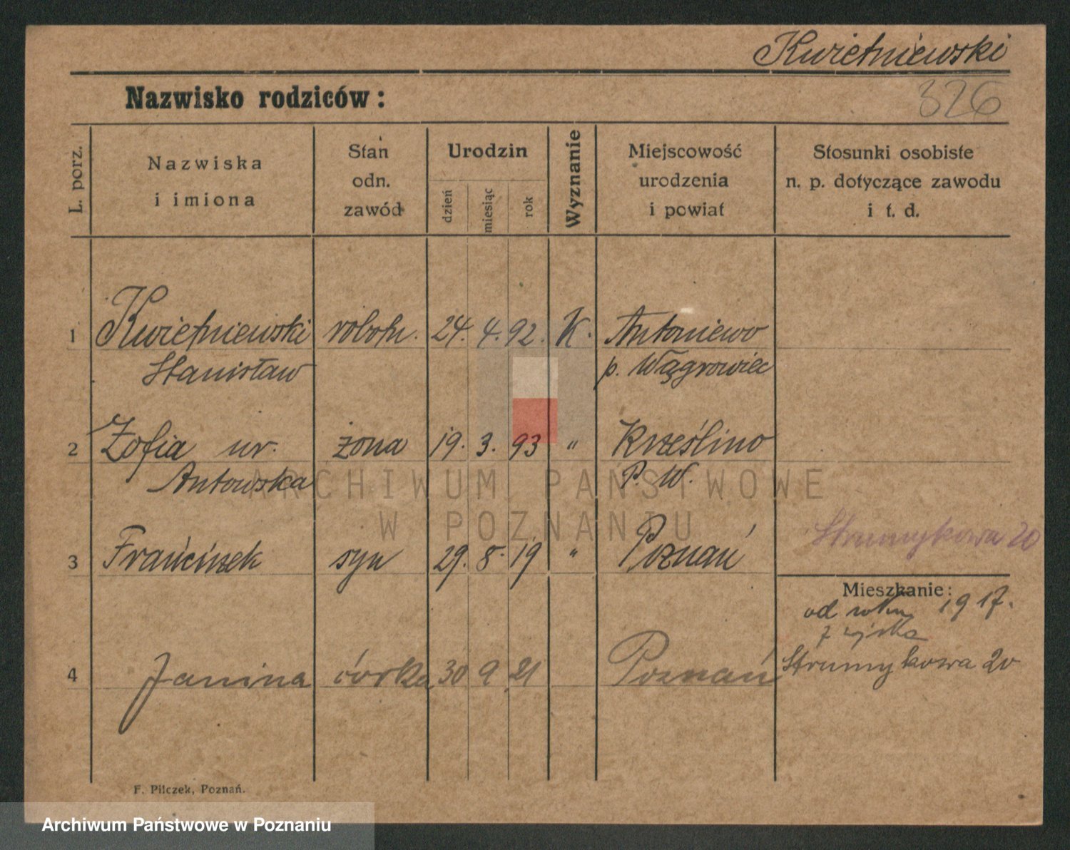Podgląd karty osobowej dostępny jest po kliknięciu na nazwisko lub ikonkę karty. Można dokonywać powiększenia (ikony na górze) lub przechodzić między kolejnymi skanami (strzałki po bokach).