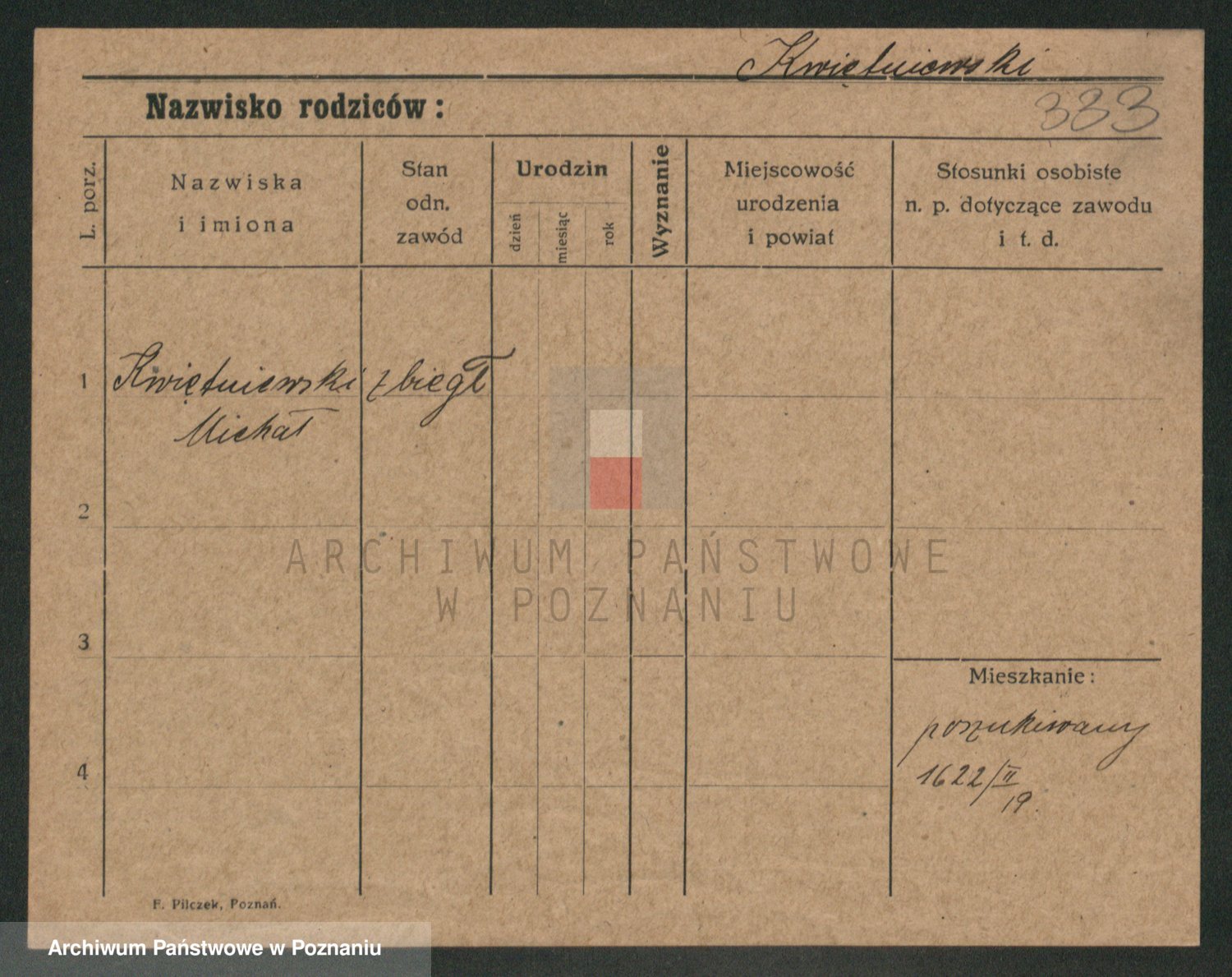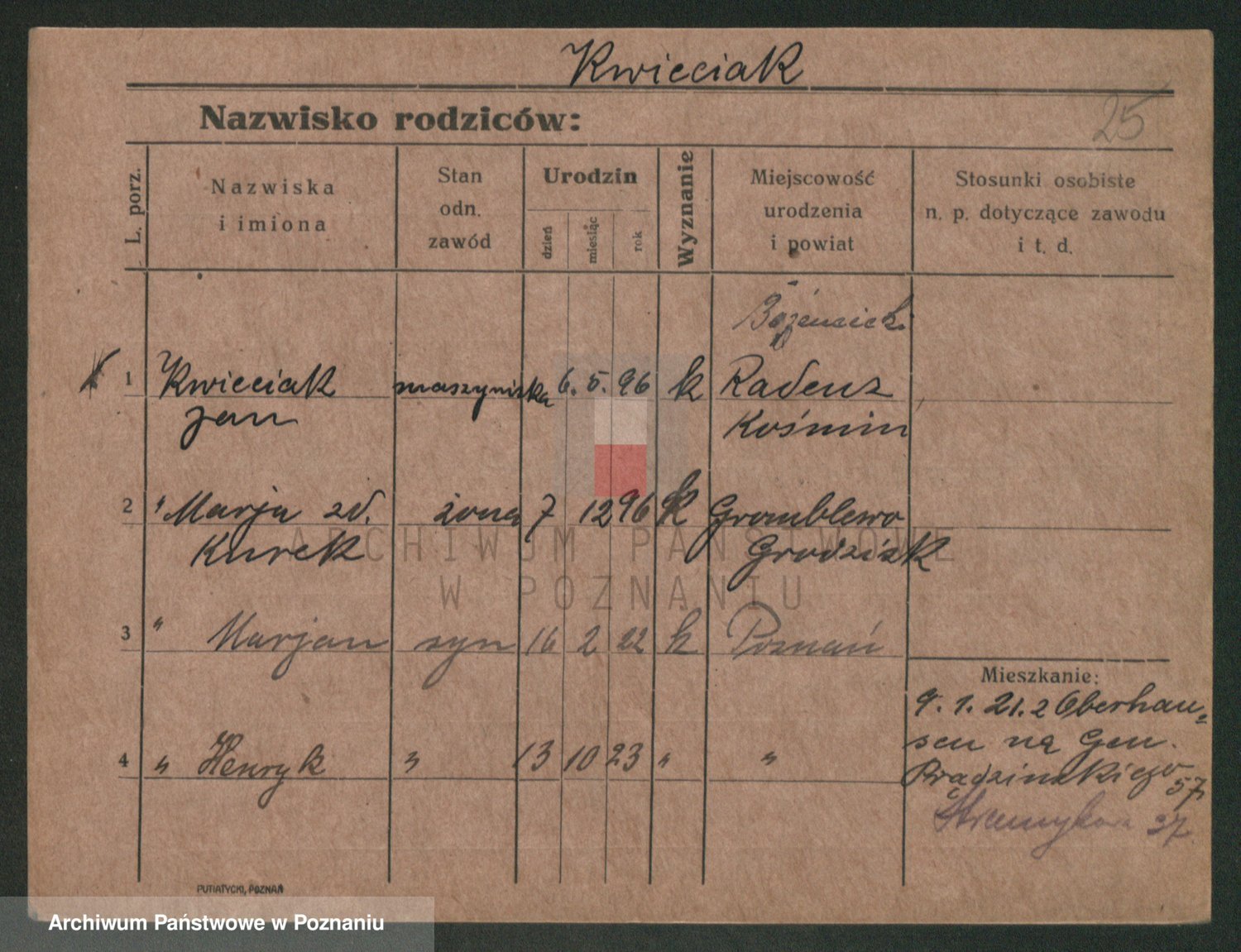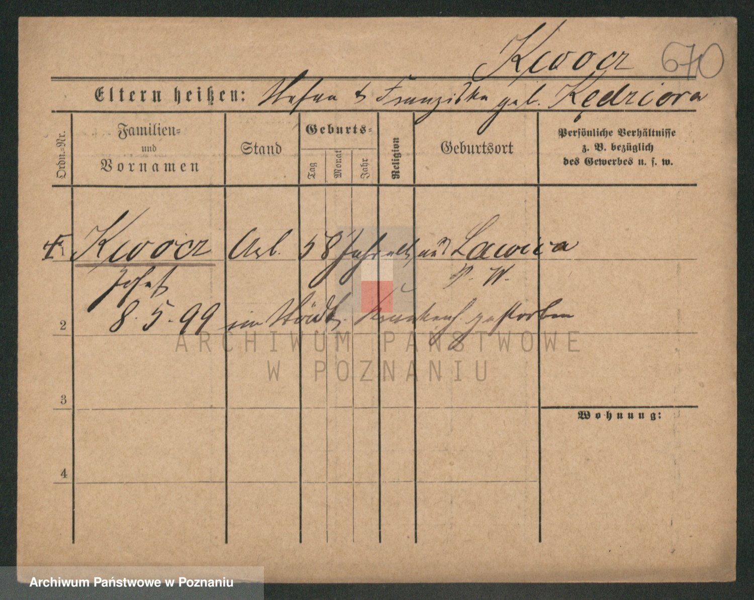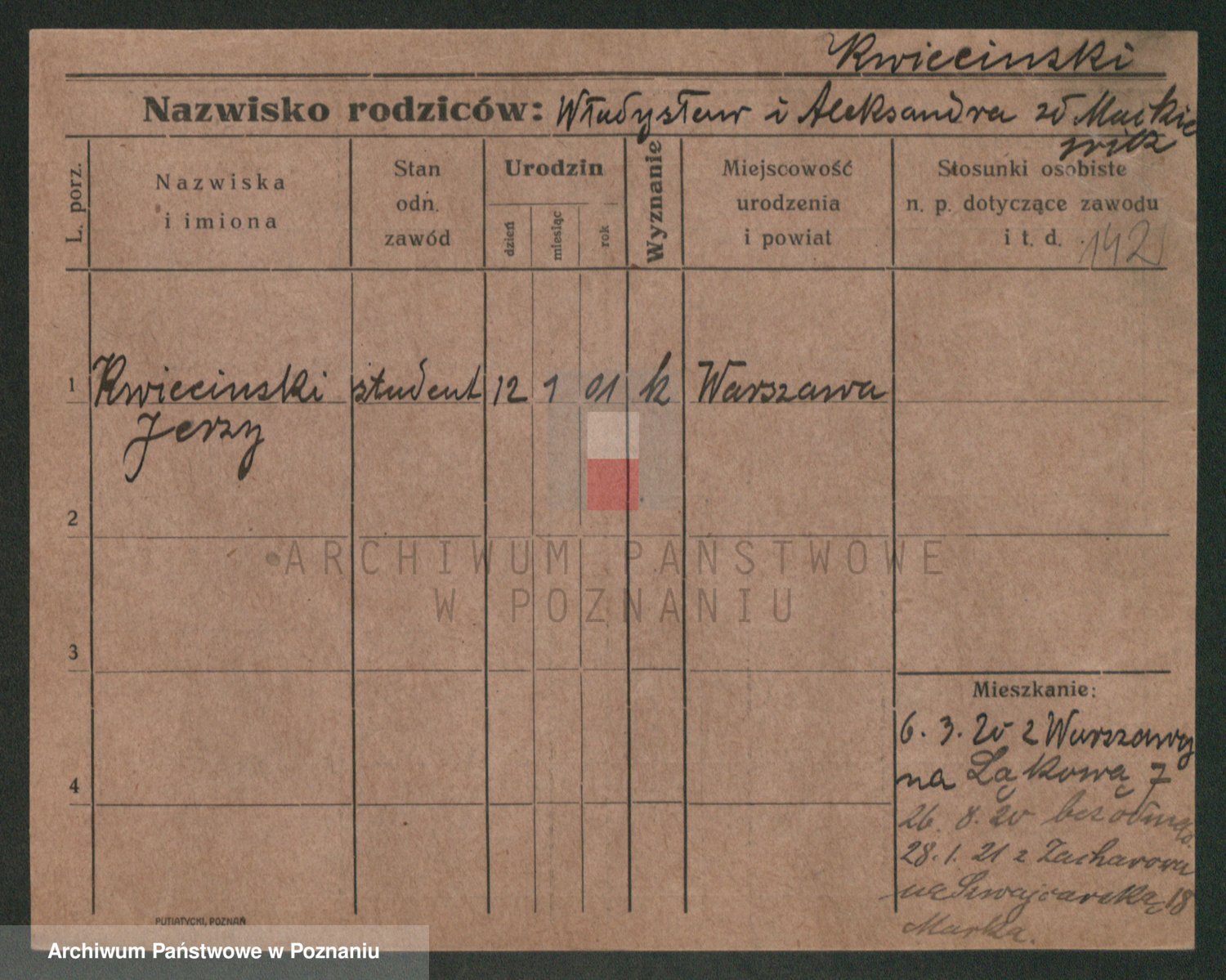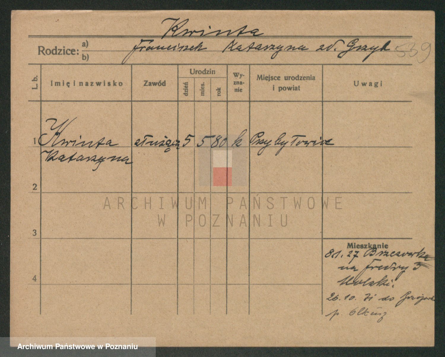 Podgląd karty osobowej dostępny jest po kliknięciu na nazwisko lub ikonkę karty. Można dokonywać powiększenia (ikony na górze) lub przechodzić między kolejnymi skanami (strzałki po bokach).