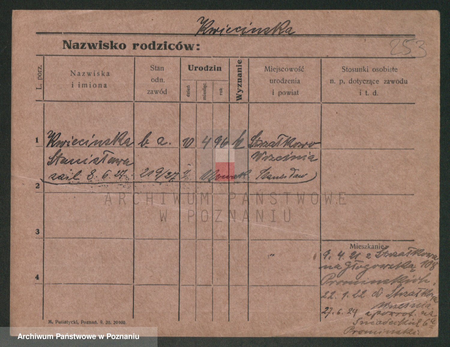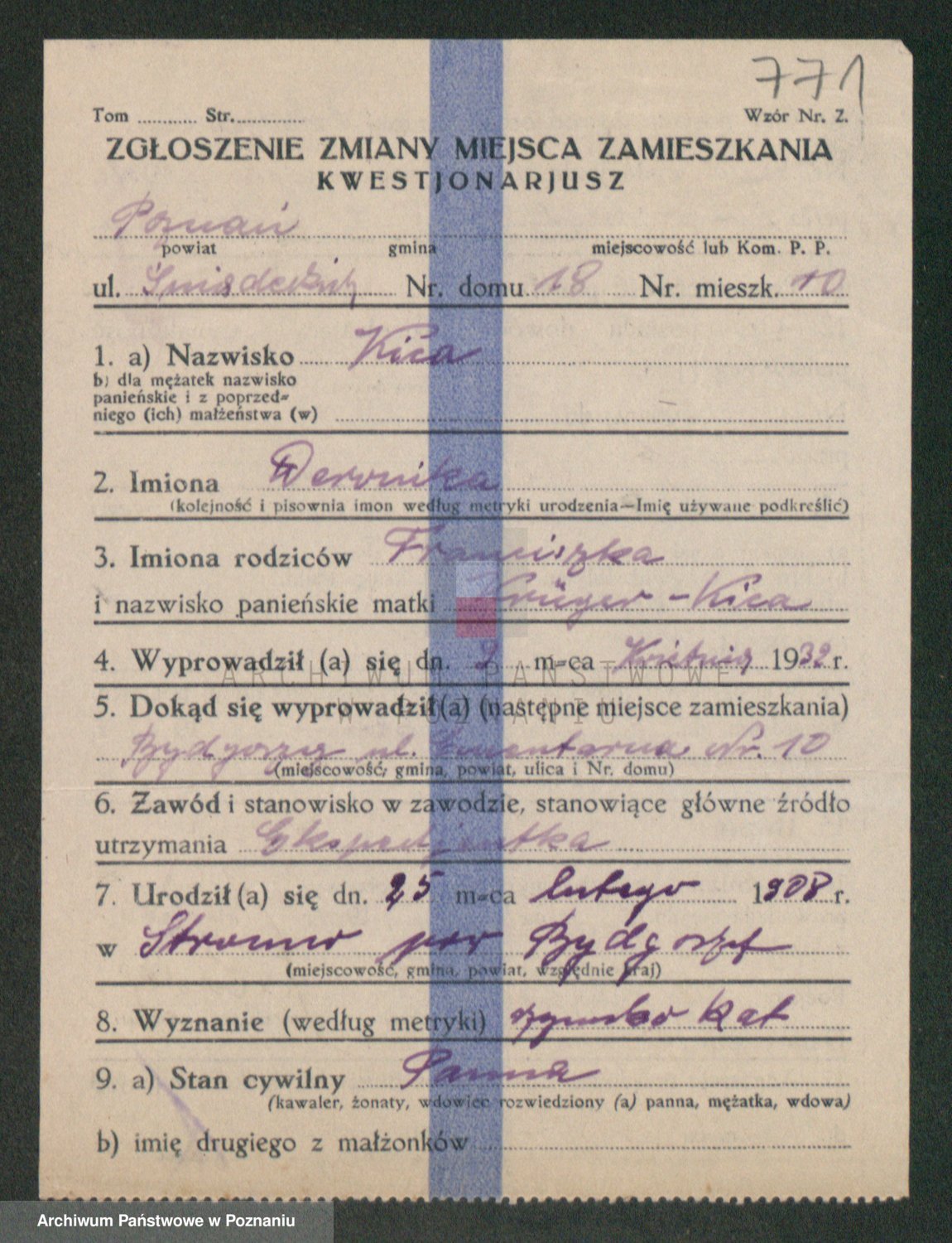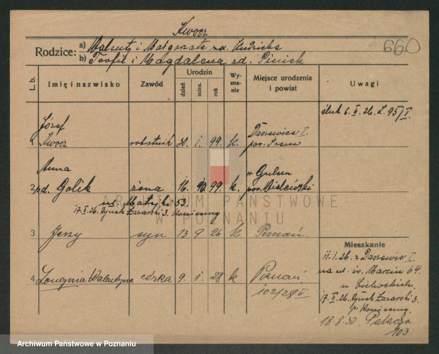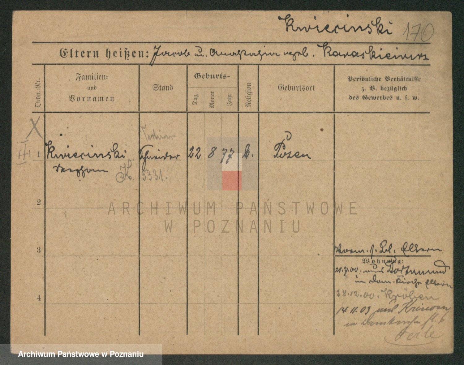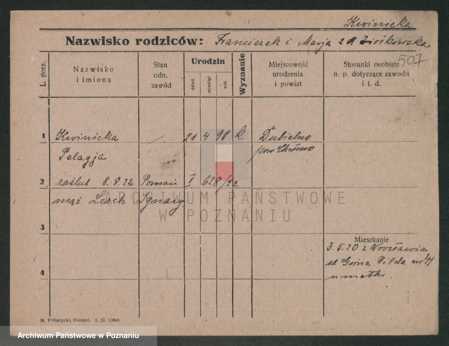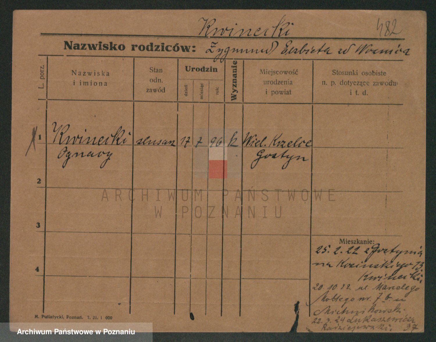 Podgląd karty osobowej dostępny jest po kliknięciu na nazwisko lub ikonkę karty. Można dokonywać powiększenia (ikony na górze) lub przechodzić między kolejnymi skanami (strzałki po bokach).
