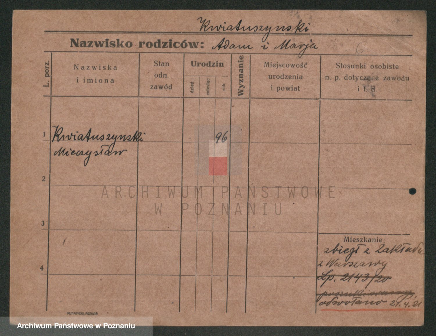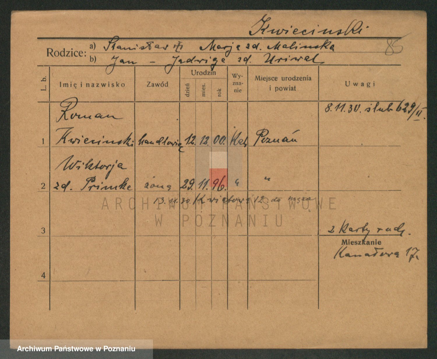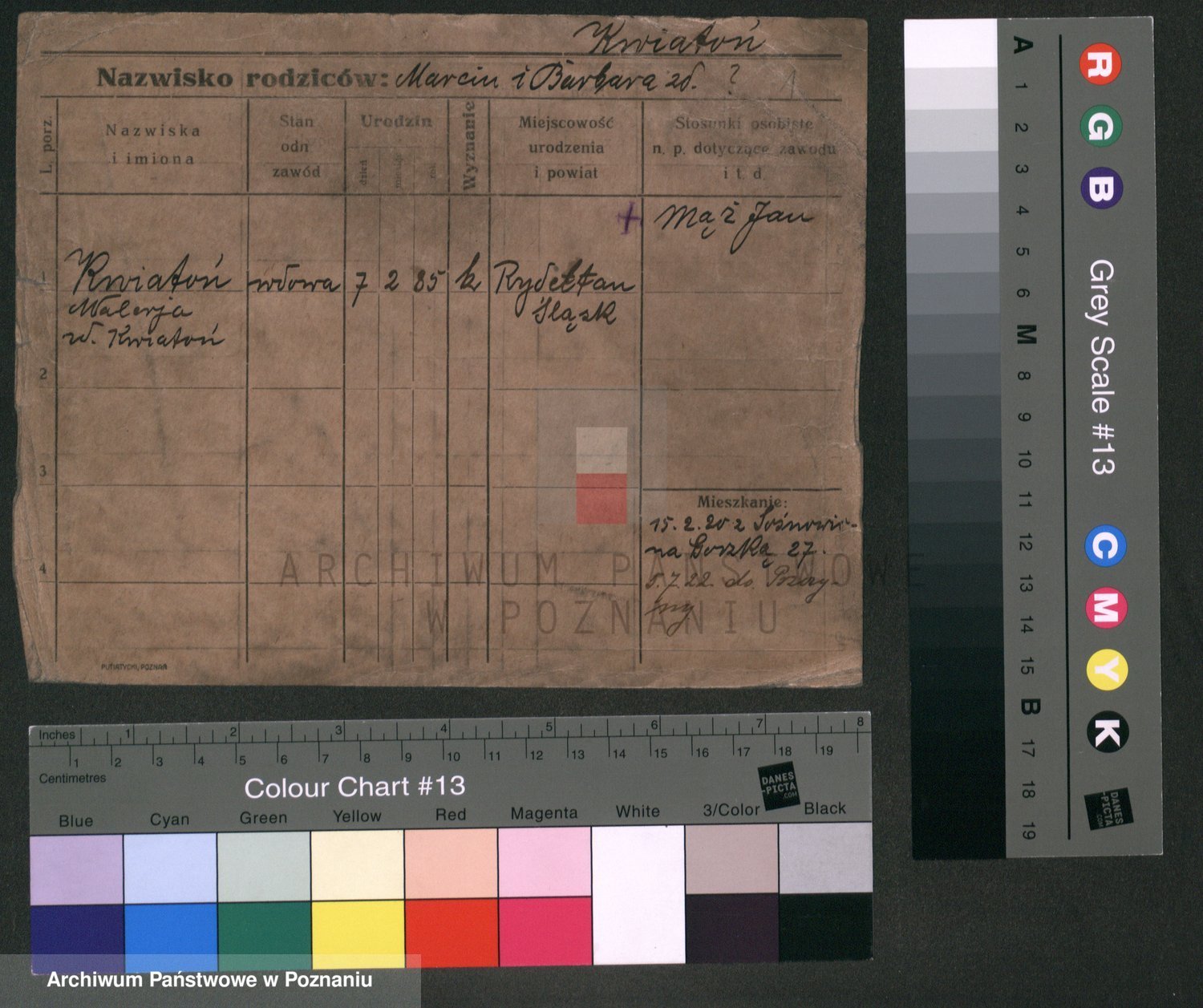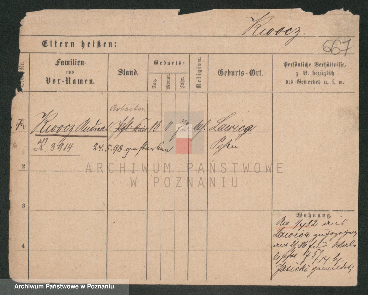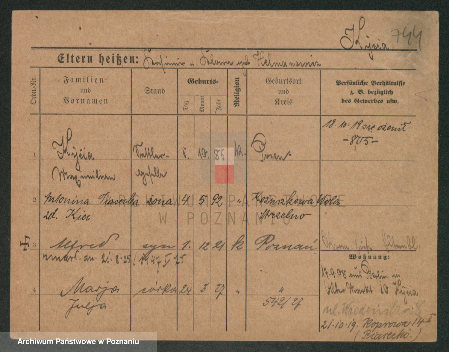 Podgląd karty osobowej dostępny jest po kliknięciu na nazwisko lub ikonkę karty. Można dokonywać powiększenia (ikony na górze) lub przechodzić między kolejnymi skanami (strzałki po bokach).