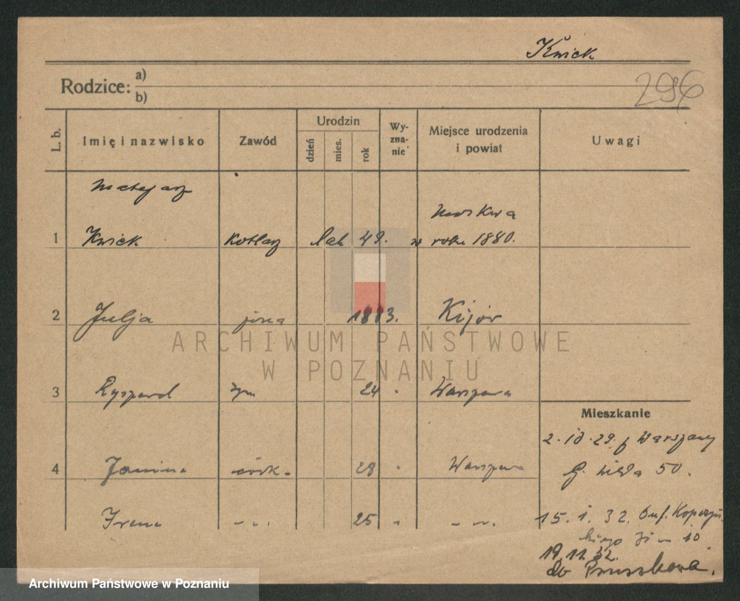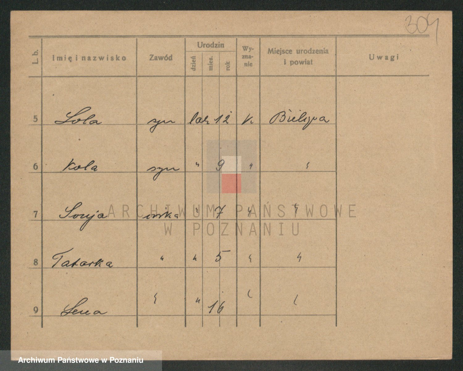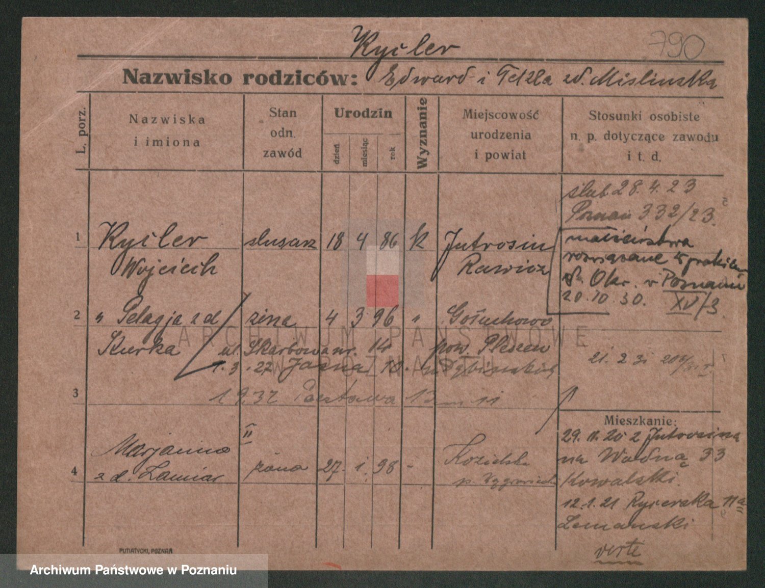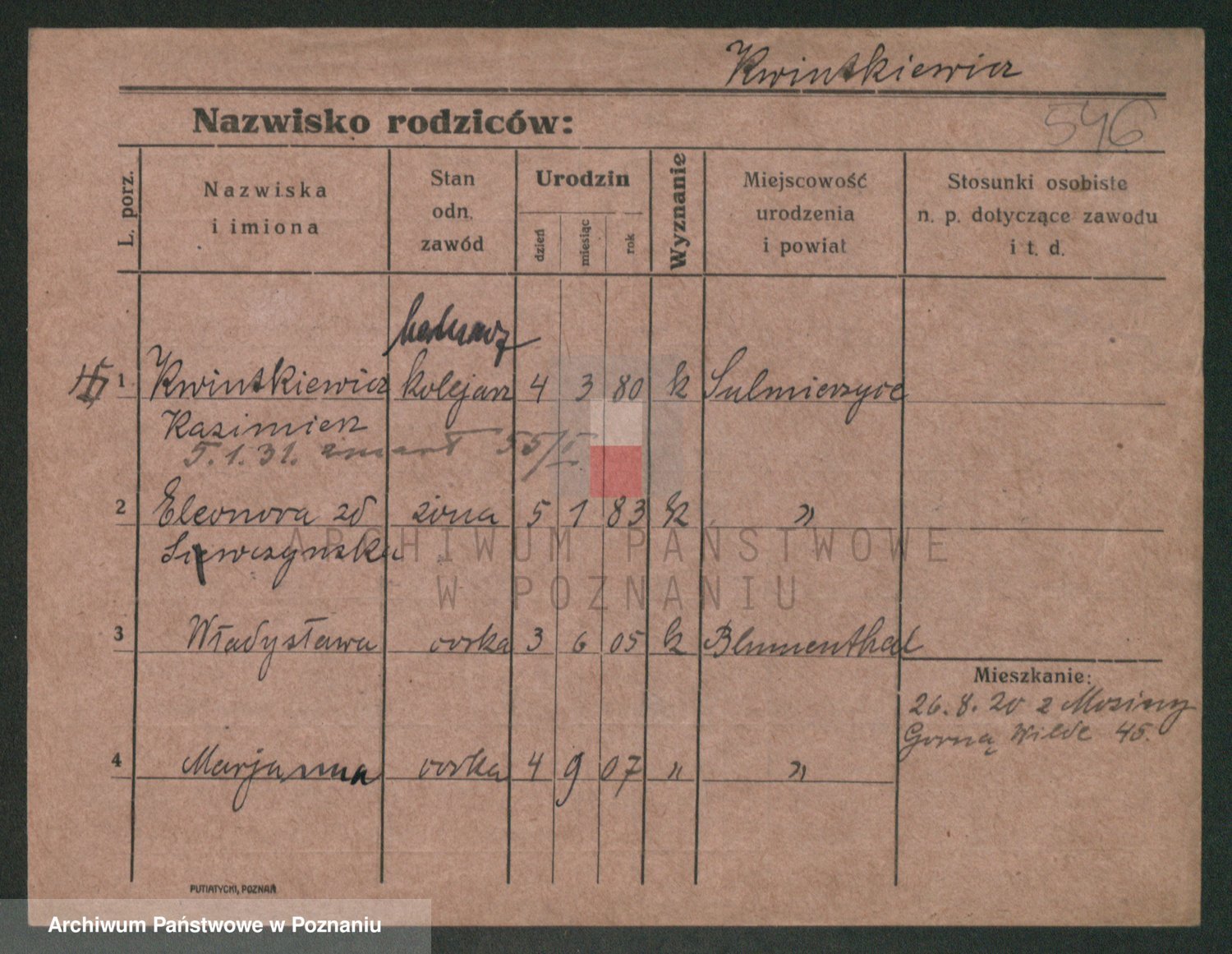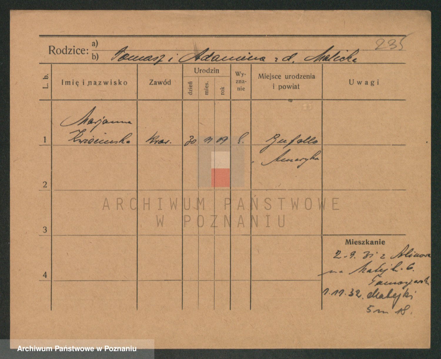 Podgląd karty osobowej dostępny jest po kliknięciu na nazwisko lub ikonkę karty. Można dokonywać powiększenia (ikony na górze) lub przechodzić między kolejnymi skanami (strzałki po bokach).
