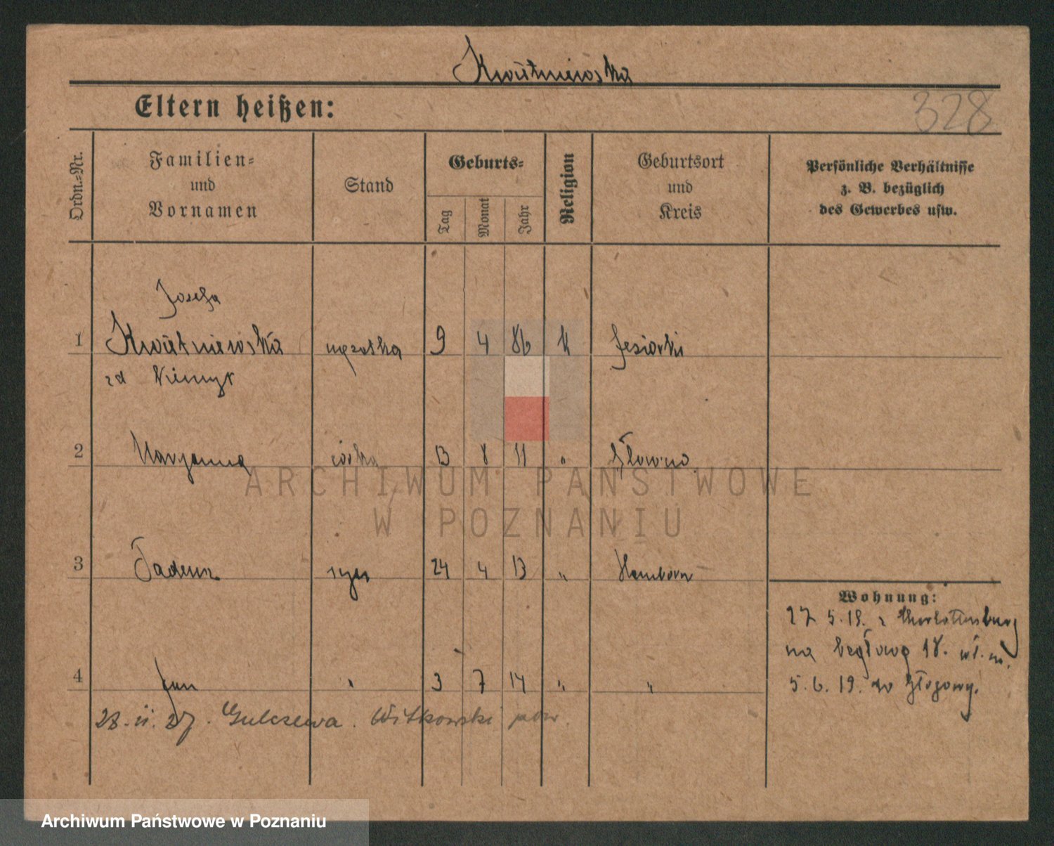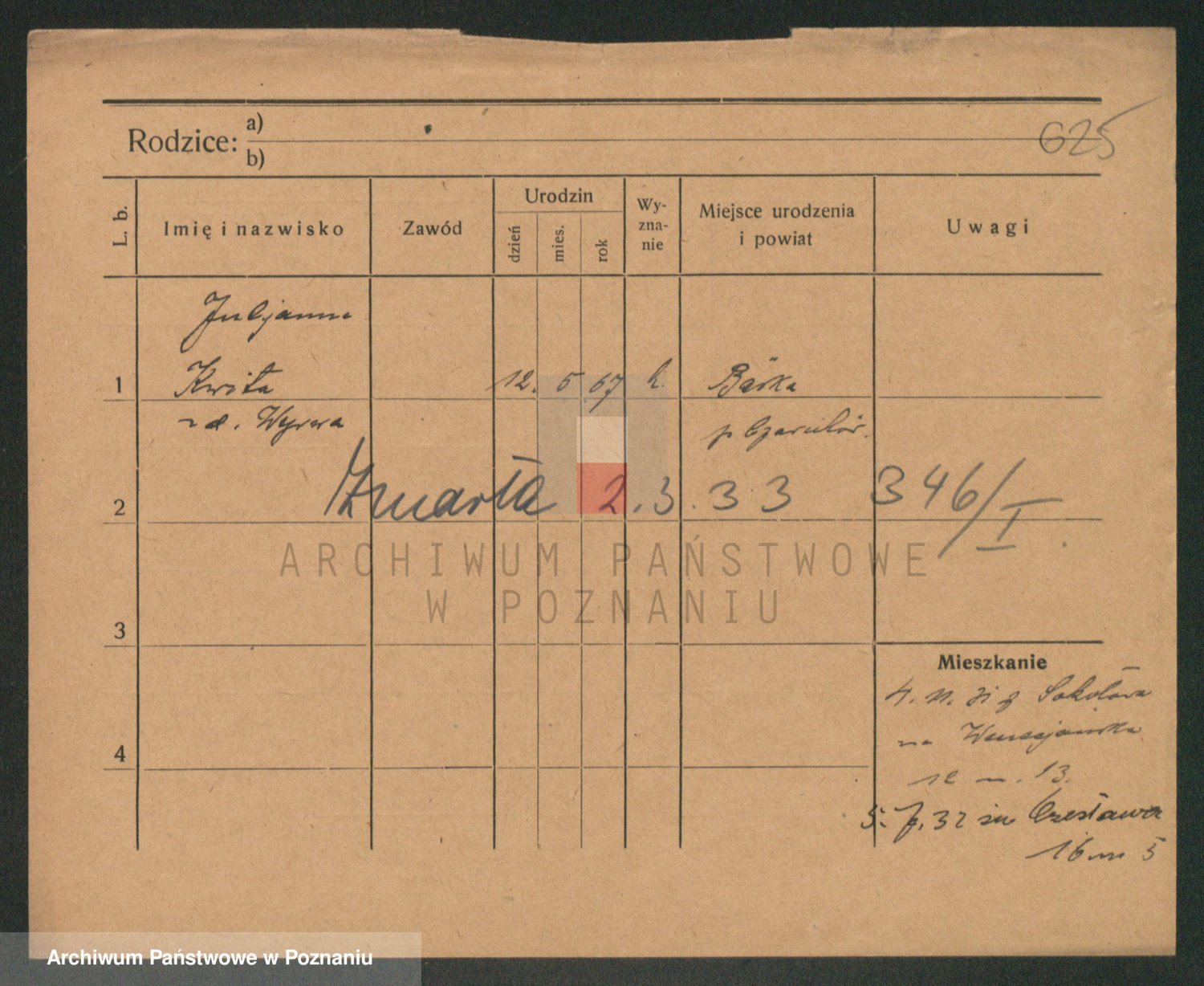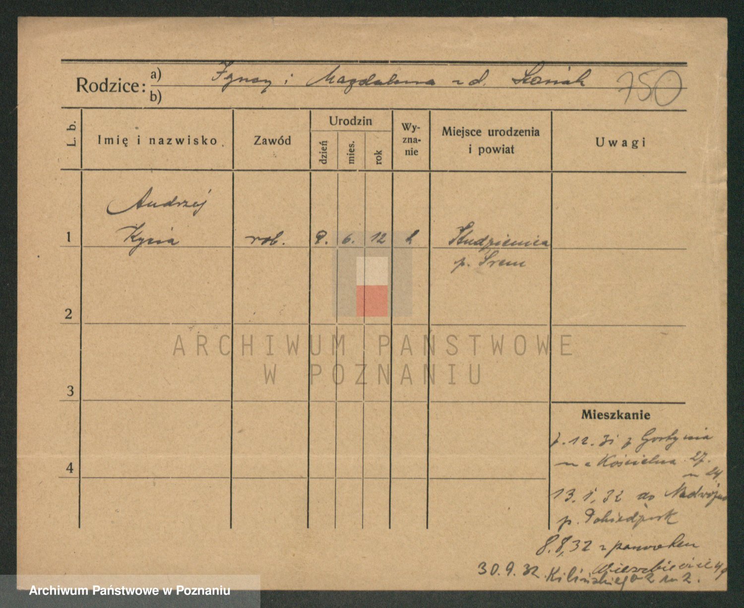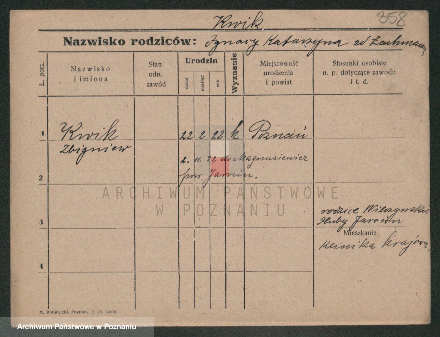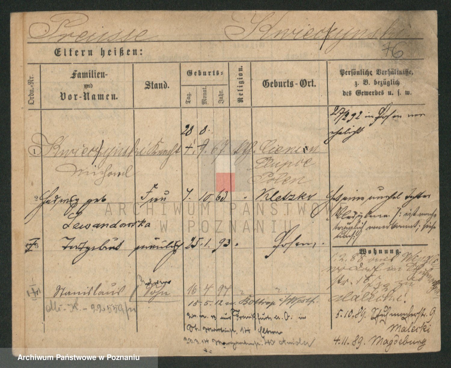 Podgląd karty osobowej dostępny jest po kliknięciu na nazwisko lub ikonkę karty. Można dokonywać powiększenia (ikony na górze) lub przechodzić między kolejnymi skanami (strzałki po bokach).