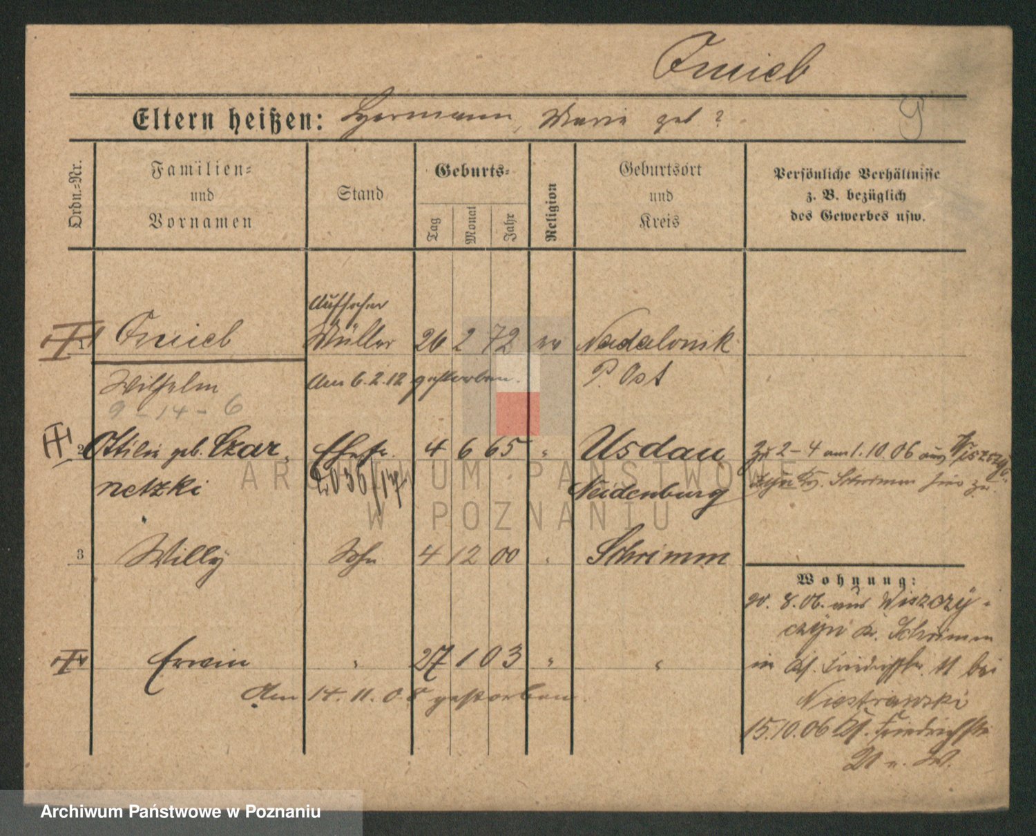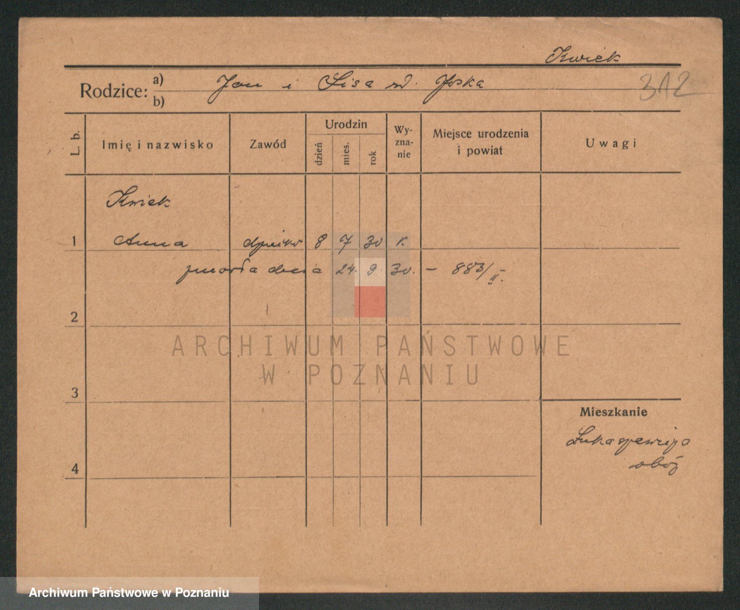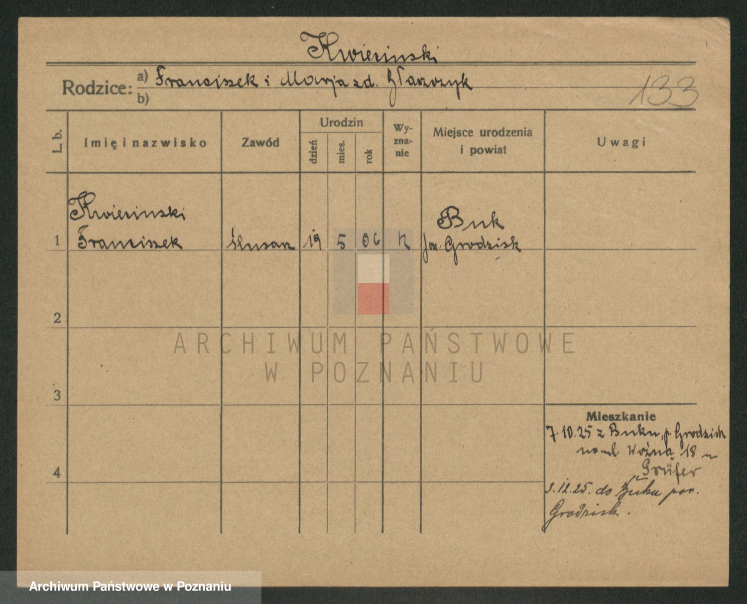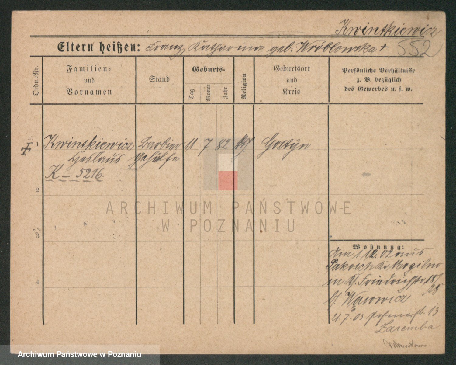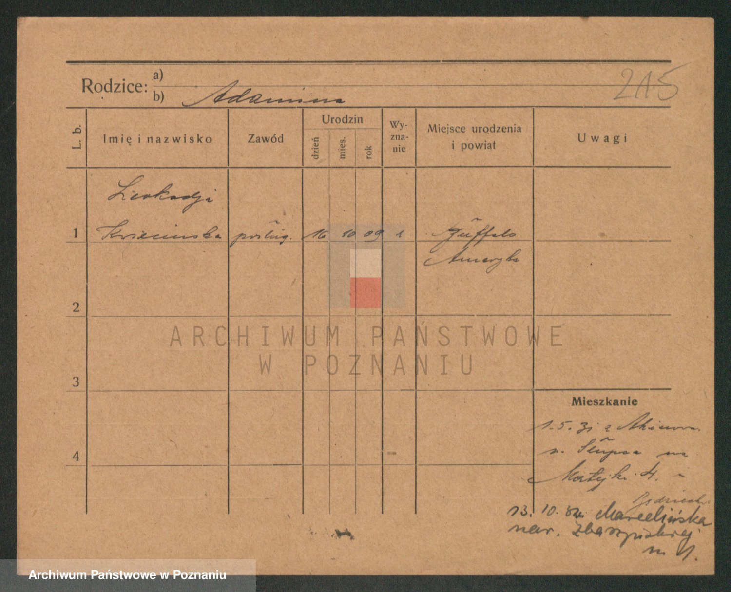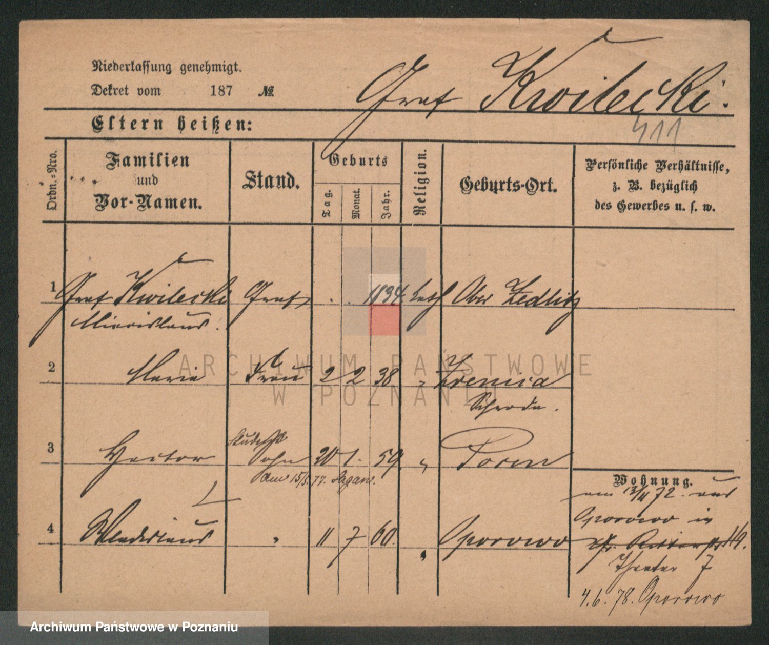 Podgląd karty osobowej dostępny jest po kliknięciu na nazwisko lub ikonkę karty. Można dokonywać powiększenia (ikony na górze) lub przechodzić między kolejnymi skanami (strzałki po bokach).