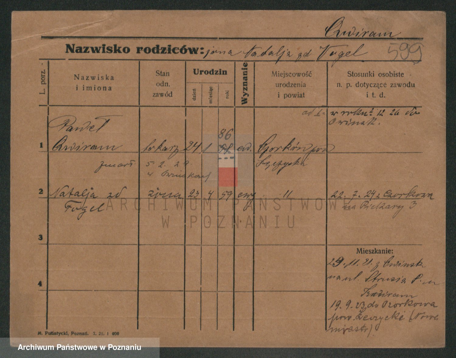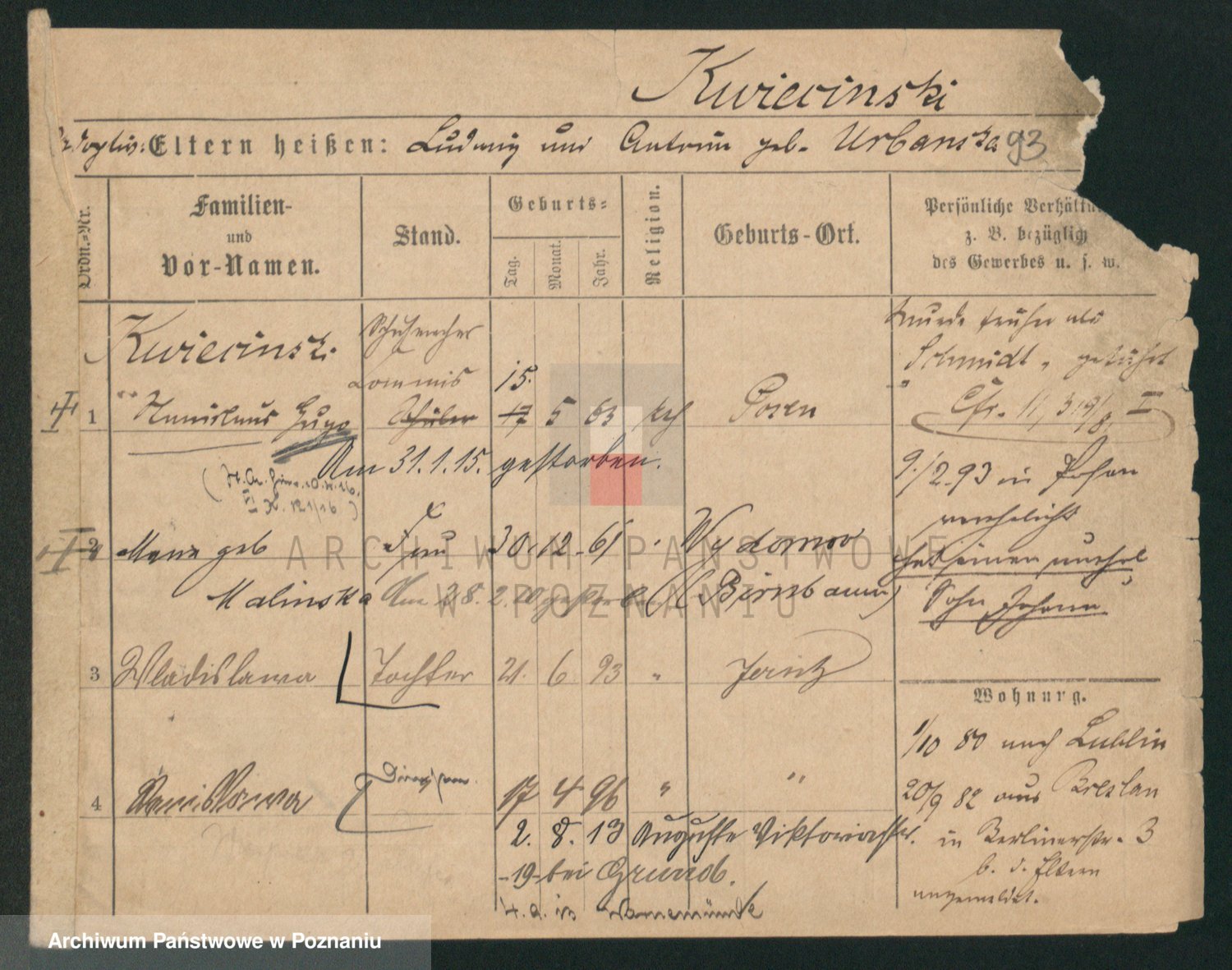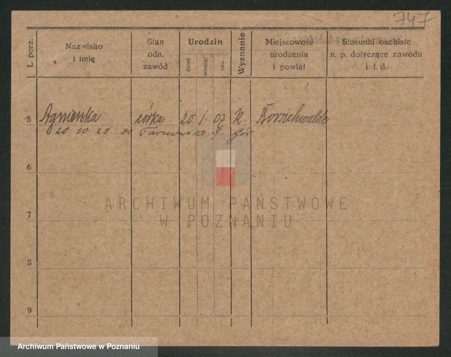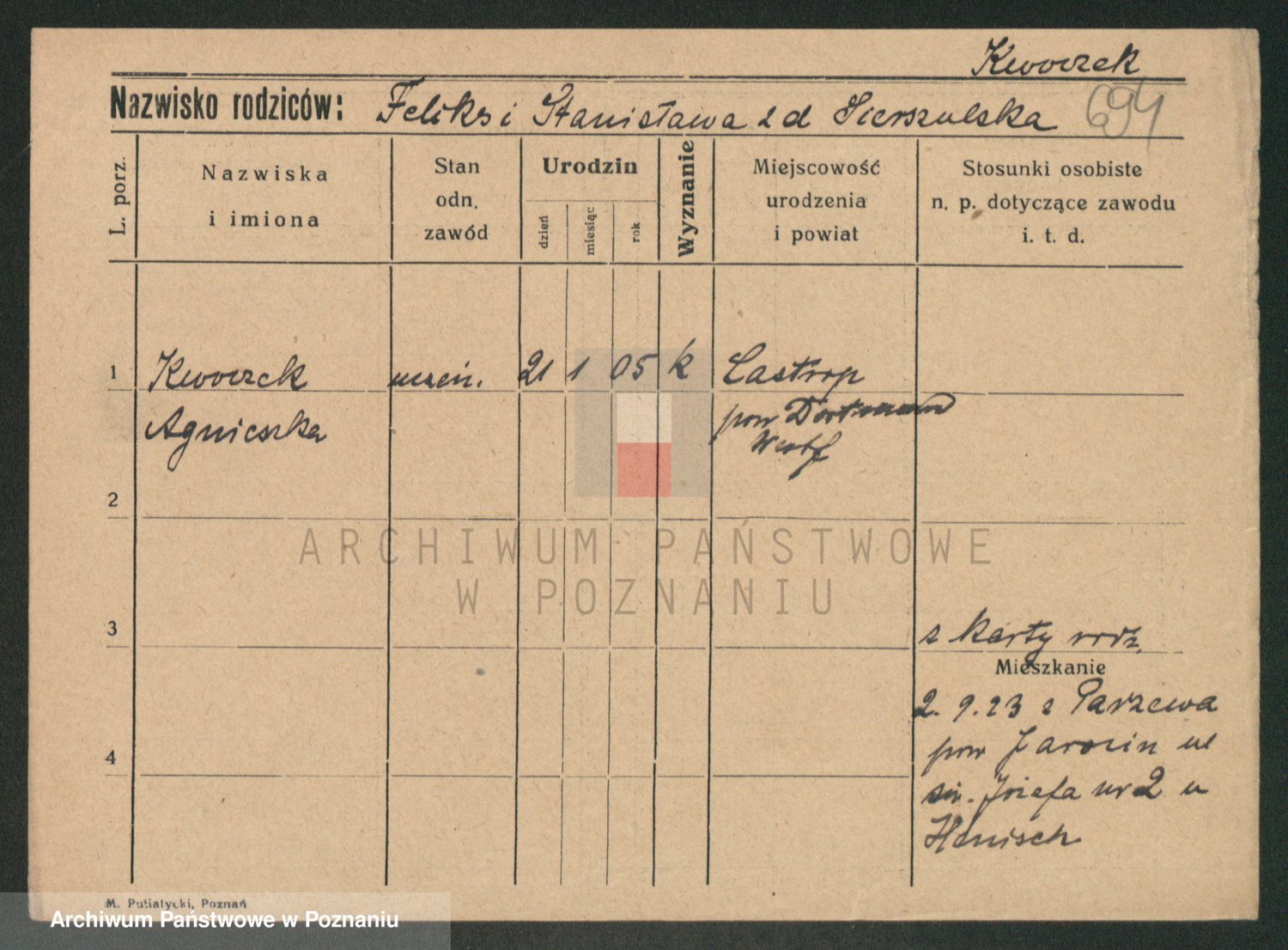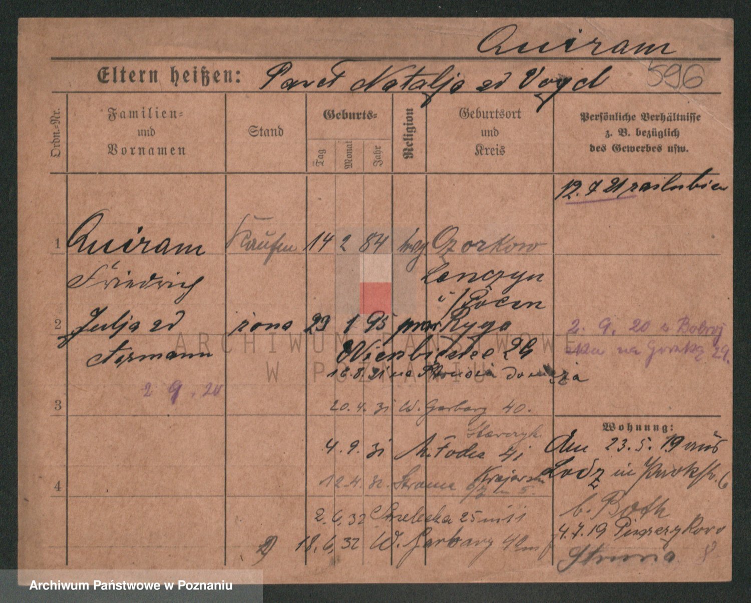 Podgląd karty osobowej dostępny jest po kliknięciu na nazwisko lub ikonkę karty. Można dokonywać powiększenia (ikony na górze) lub przechodzić między kolejnymi skanami (strzałki po bokach).