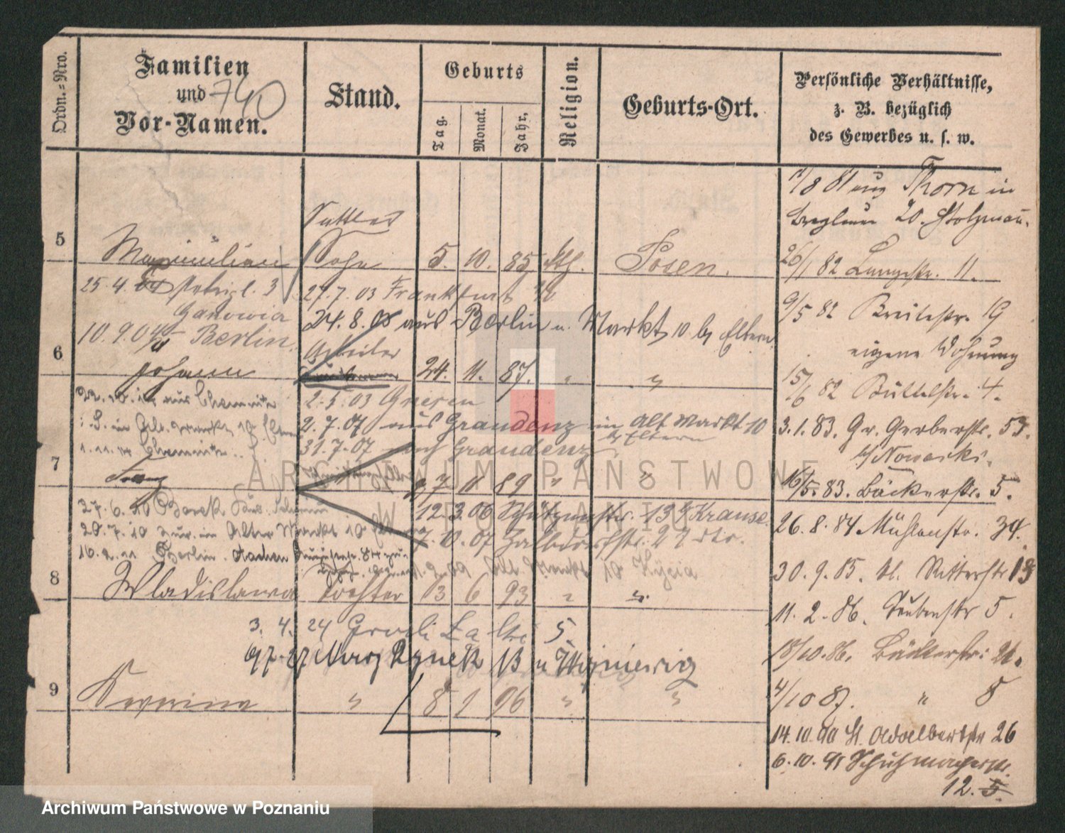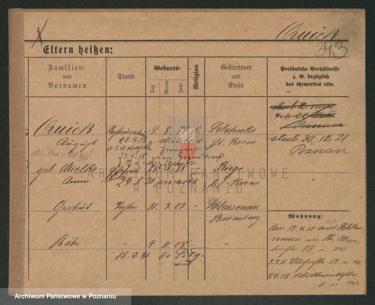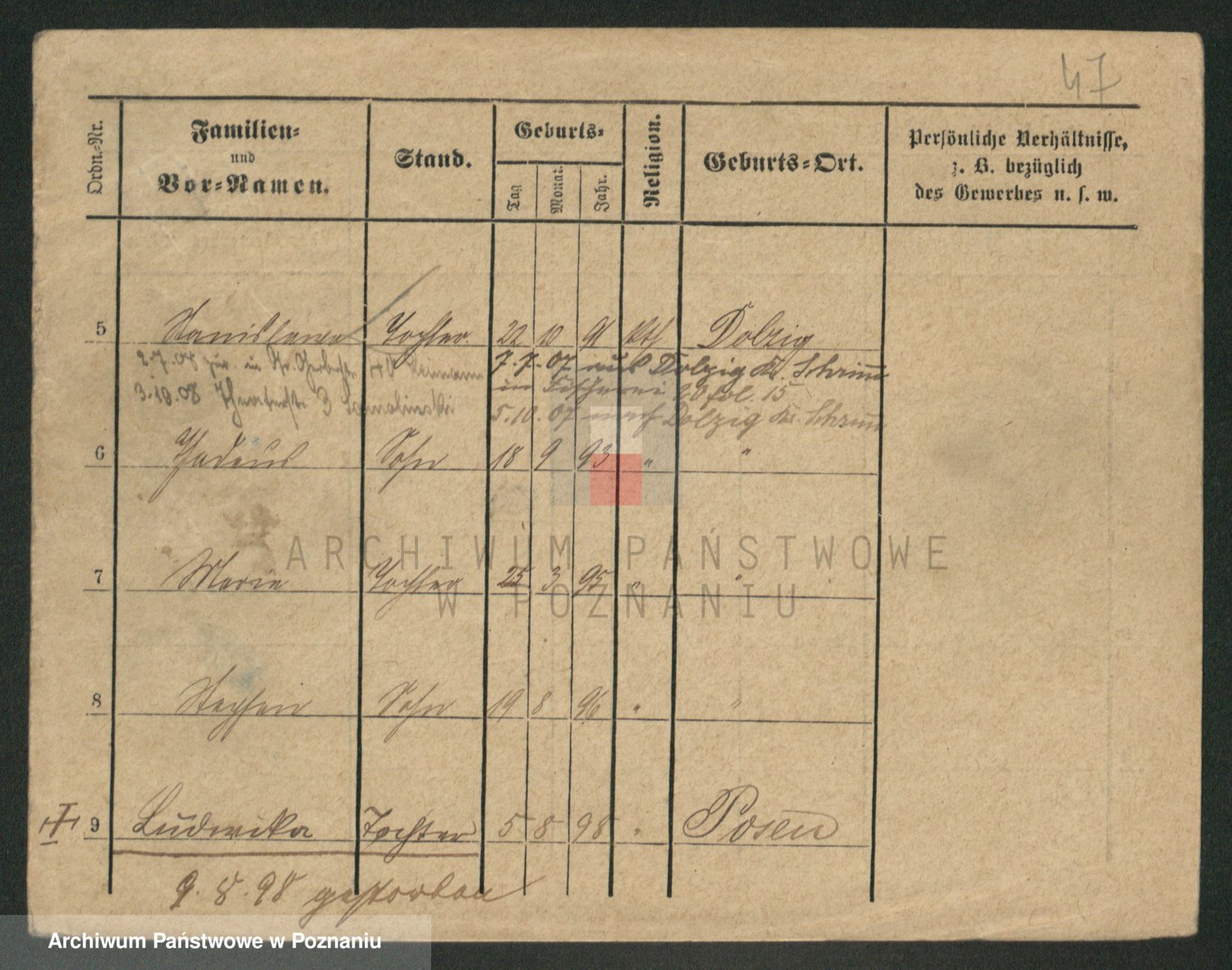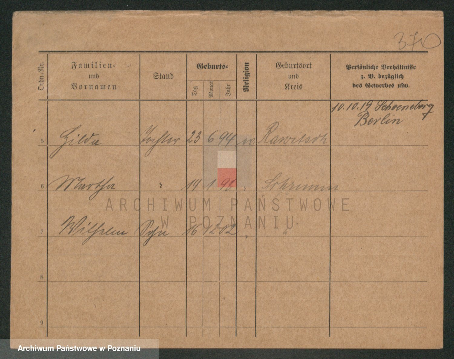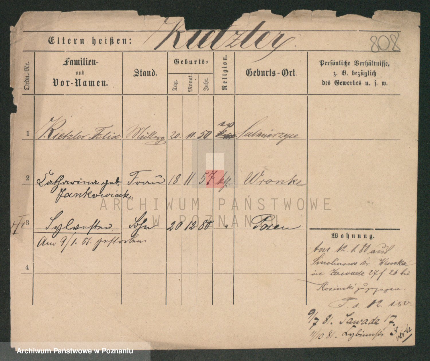 Podgląd karty osobowej dostępny jest po kliknięciu na nazwisko lub ikonkę karty. Można dokonywać powiększenia (ikony na górze) lub przechodzić między kolejnymi skanami (strzałki po bokach).