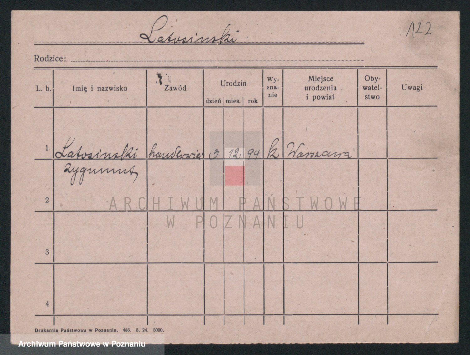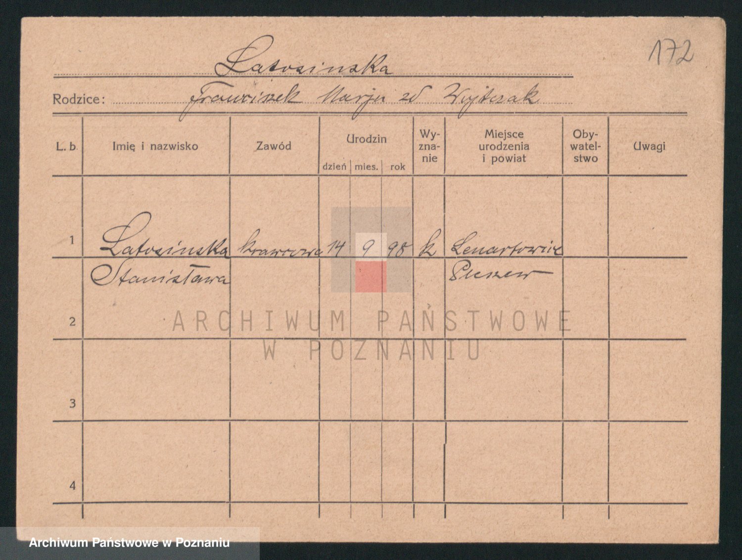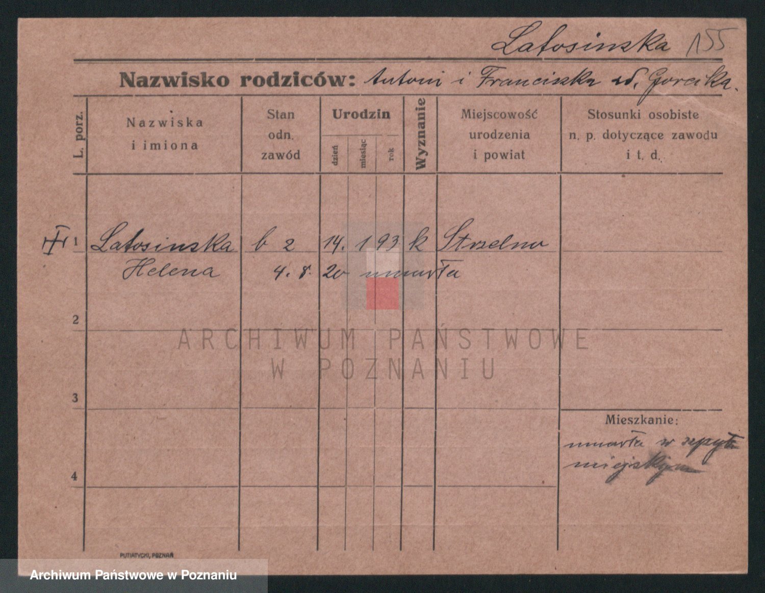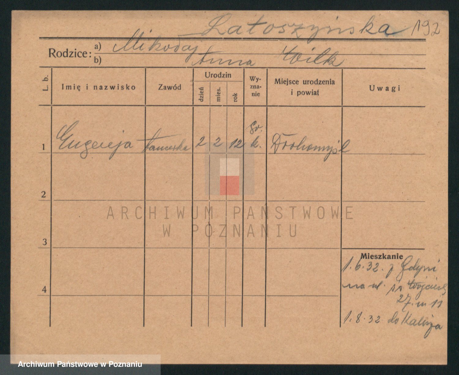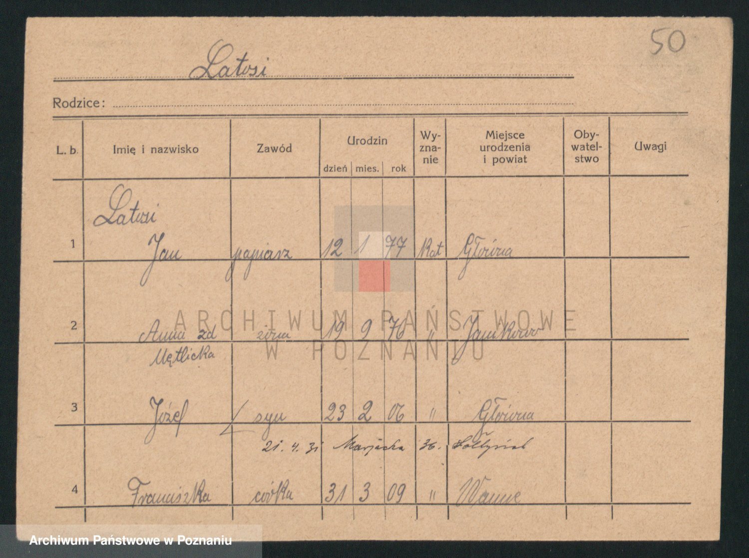 Podgląd karty osobowej dostępny jest po kliknięciu na nazwisko lub ikonkę karty. Można dokonywać powiększenia (ikony na górze) lub przechodzić między kolejnymi skanami (strzałki po bokach).