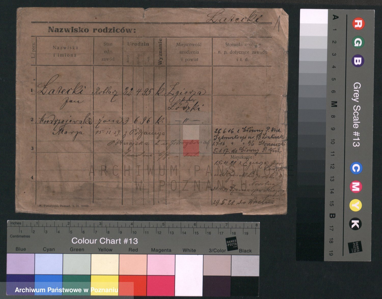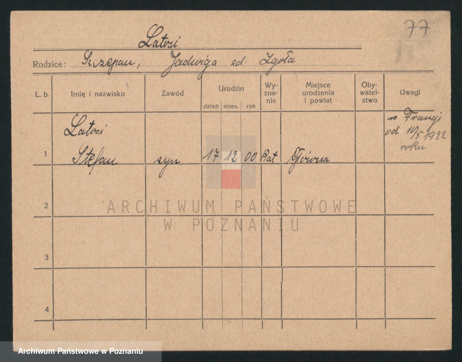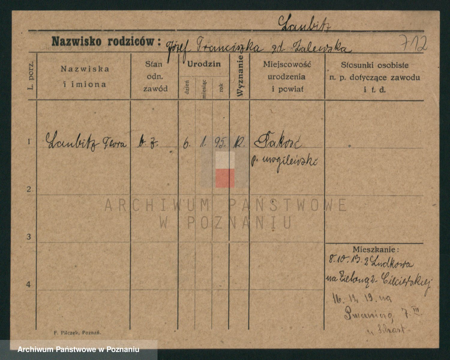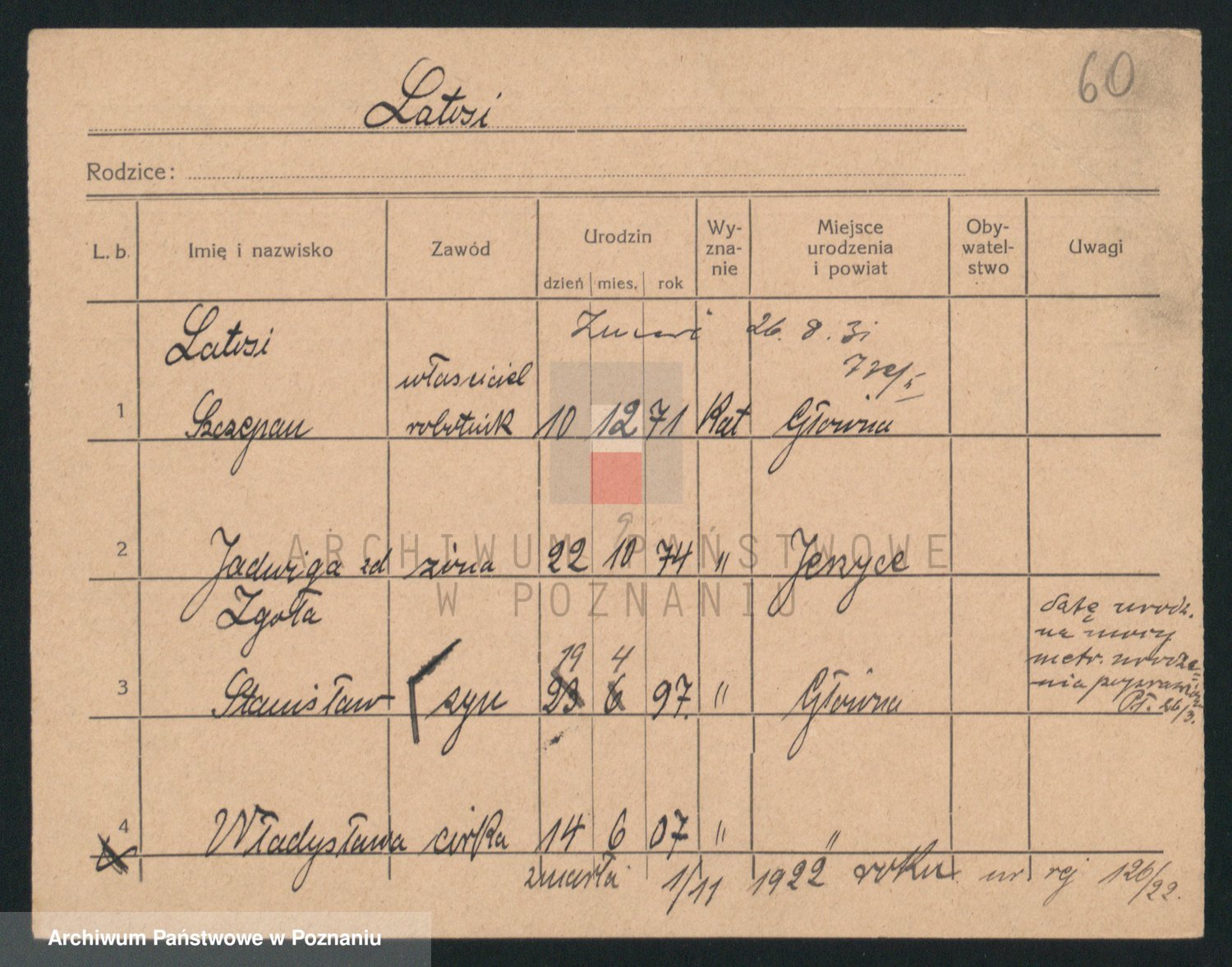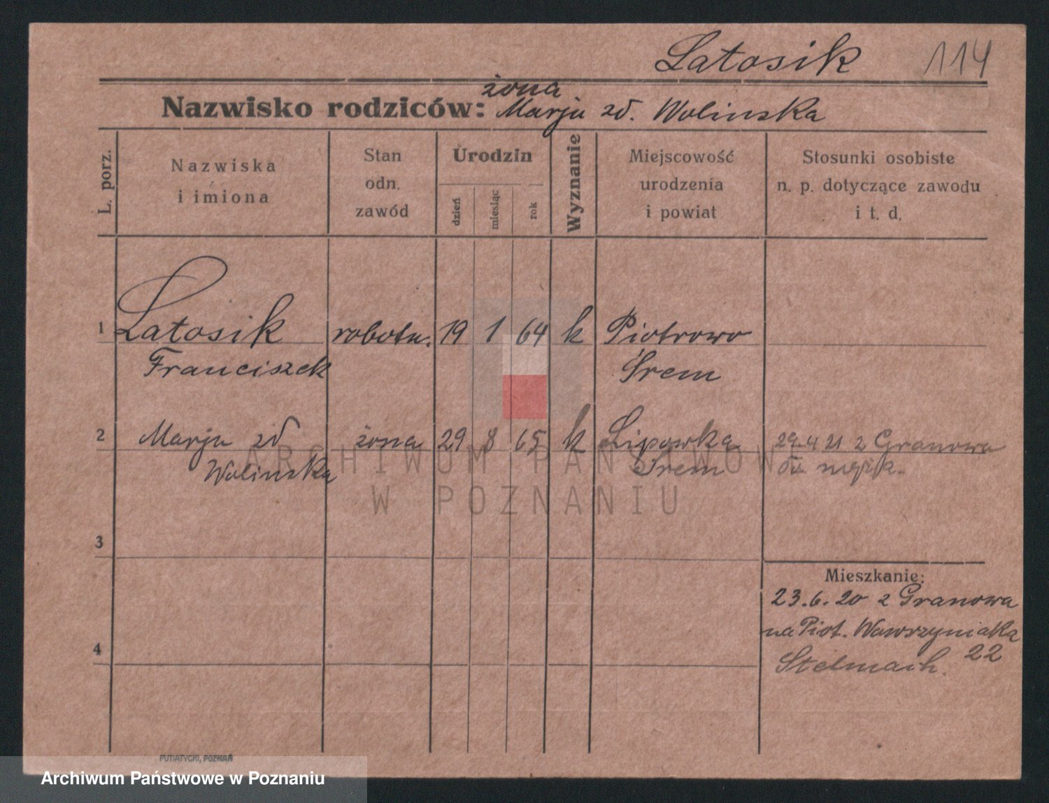 Podgląd karty osobowej dostępny jest po kliknięciu na nazwisko lub ikonkę karty. Można dokonywać powiększenia (ikony na górze) lub przechodzić między kolejnymi skanami (strzałki po bokach).