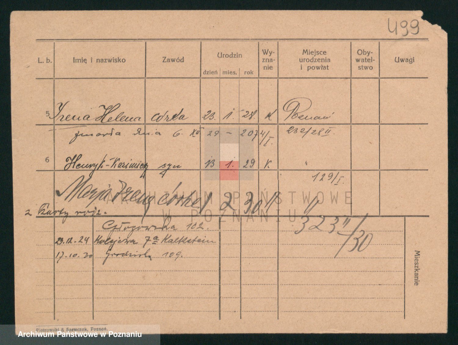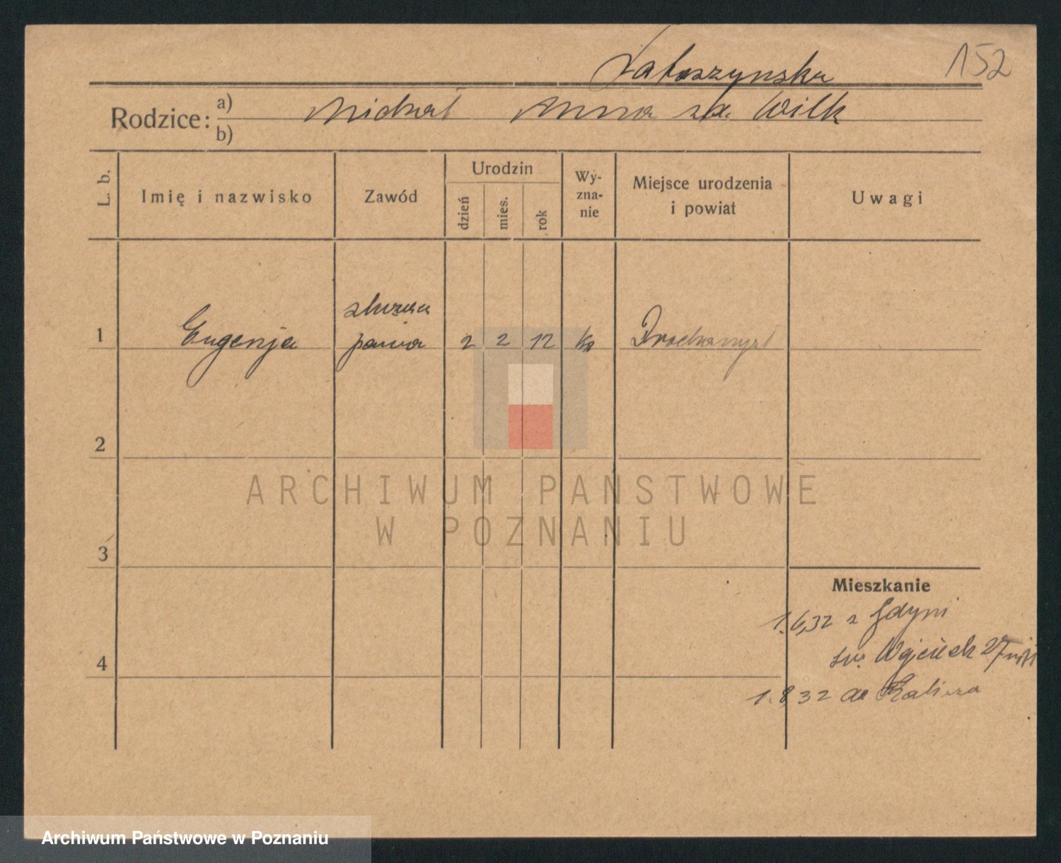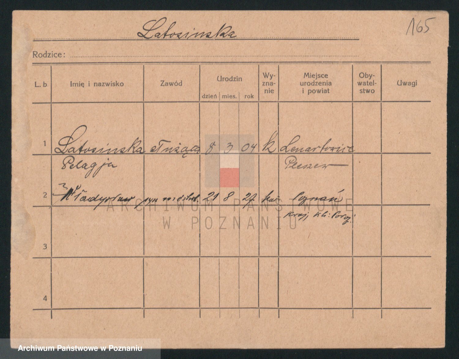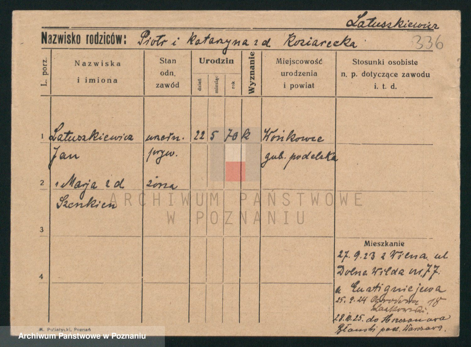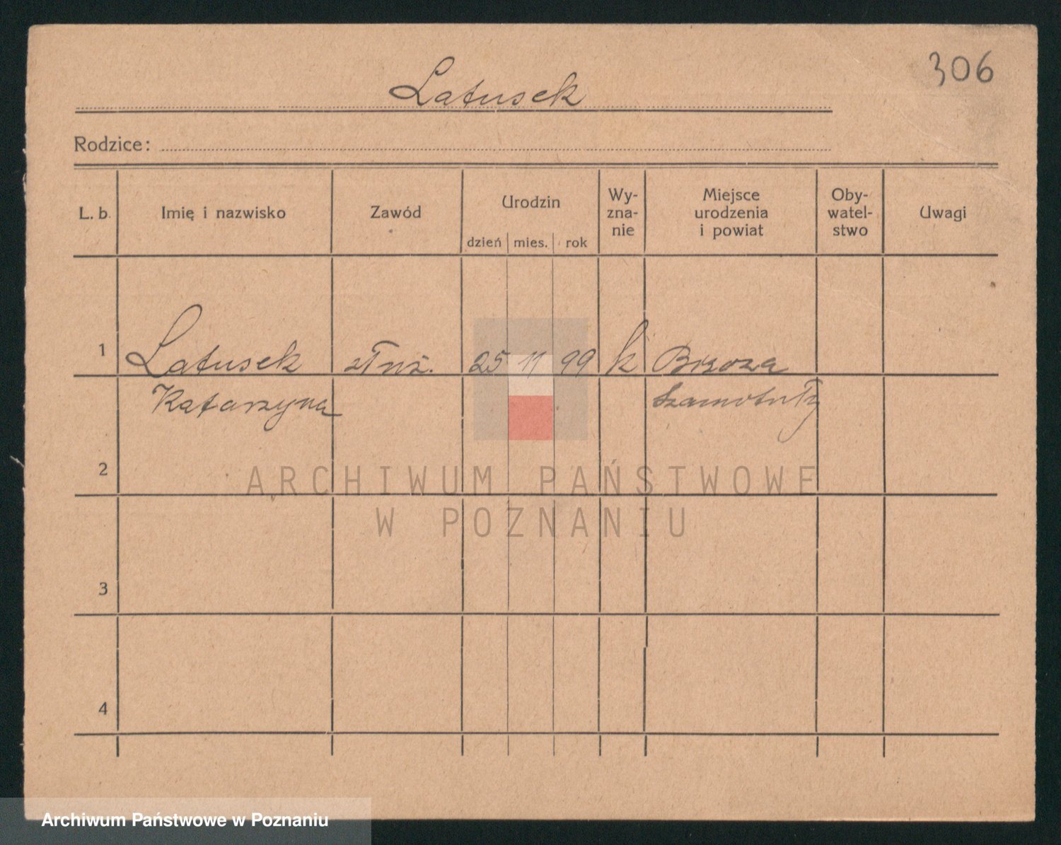 Podgląd karty osobowej dostępny jest po kliknięciu na nazwisko lub ikonkę karty. Można dokonywać powiększenia (ikony na górze) lub przechodzić między kolejnymi skanami (strzałki po bokach).
