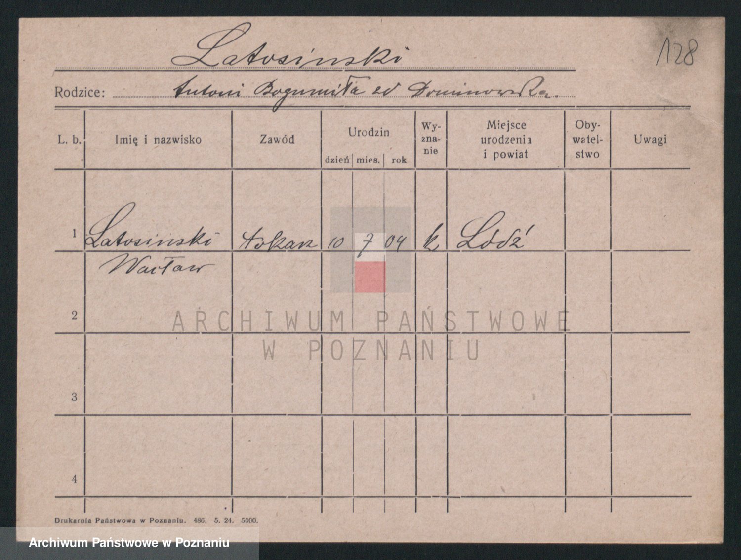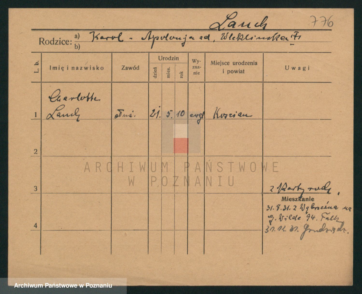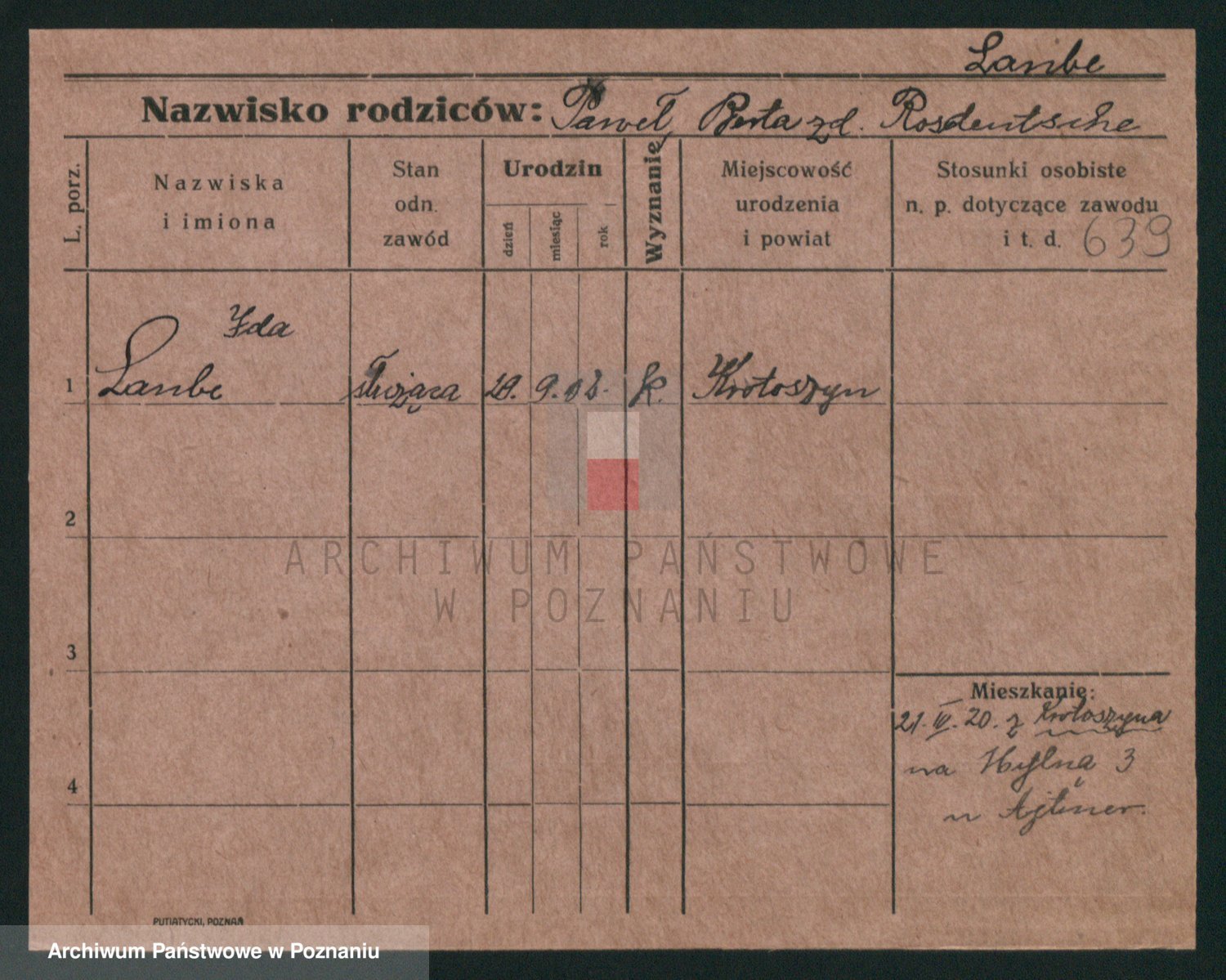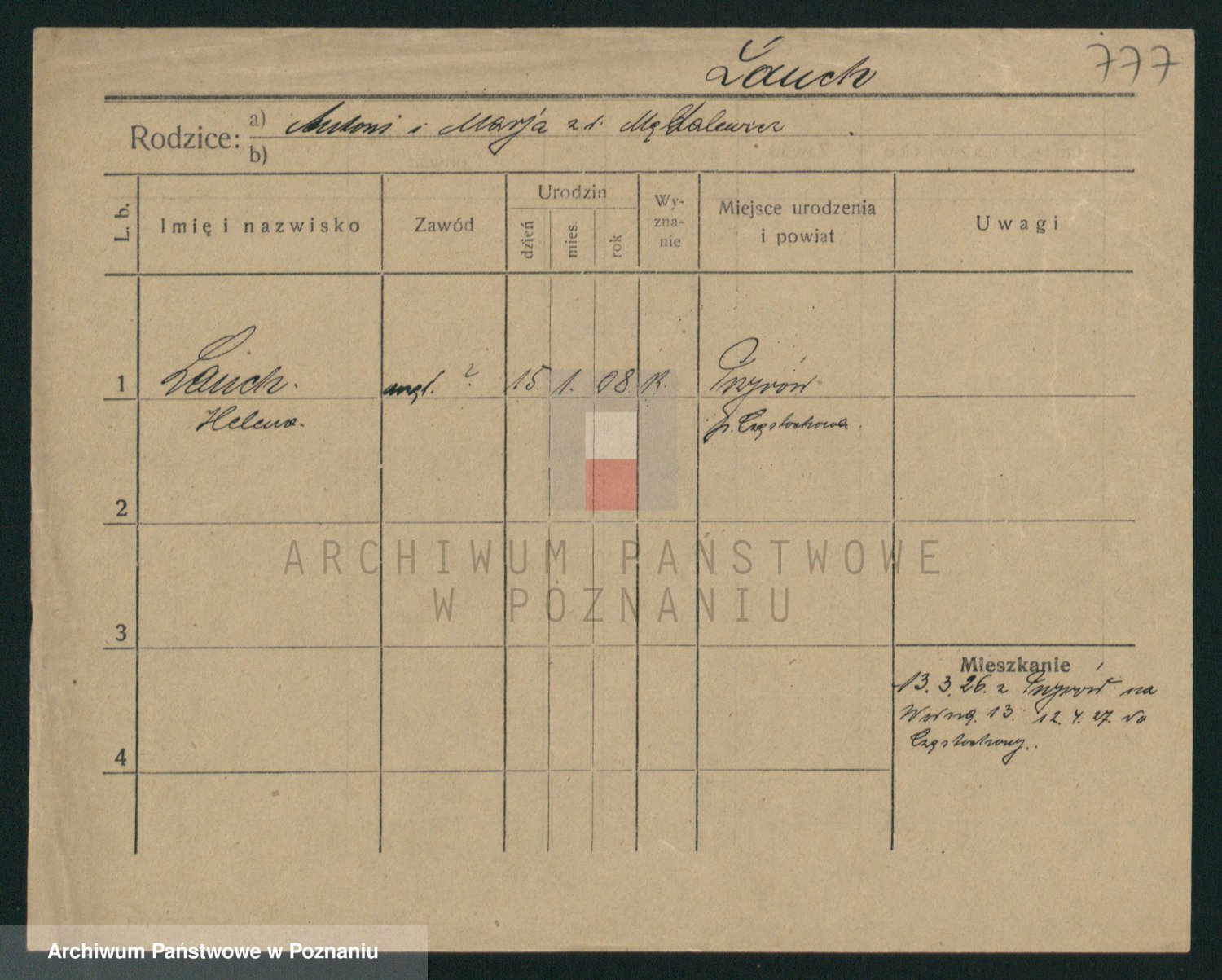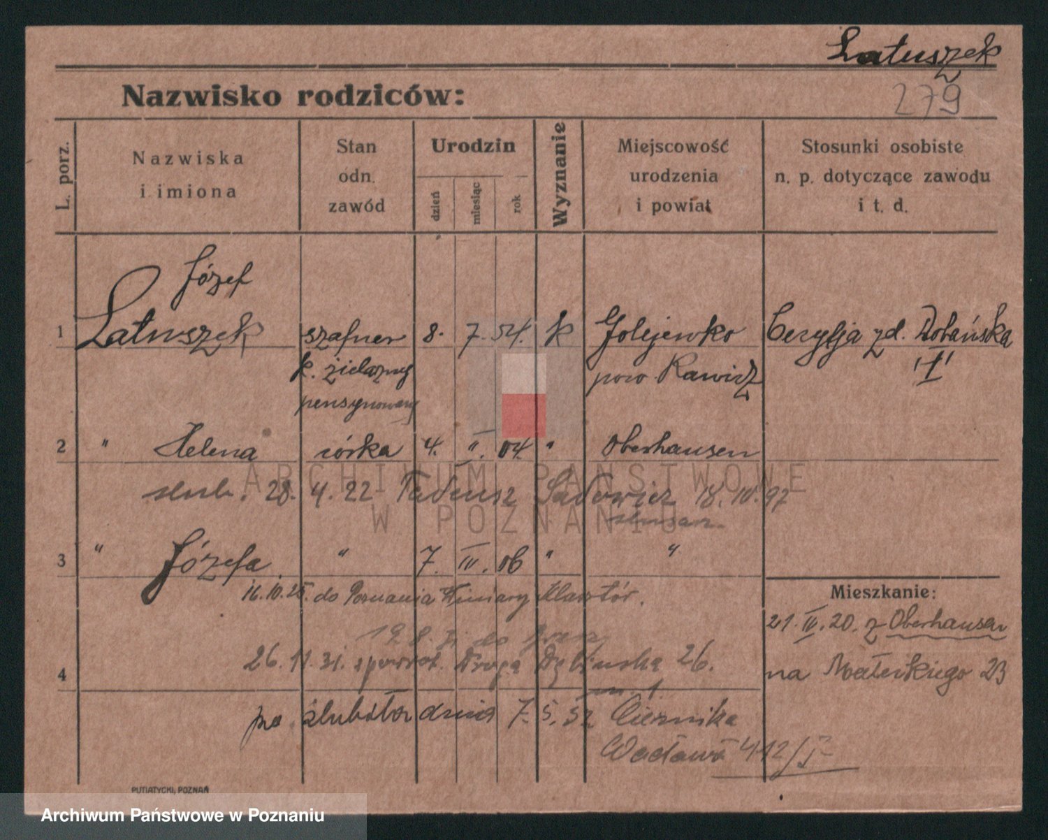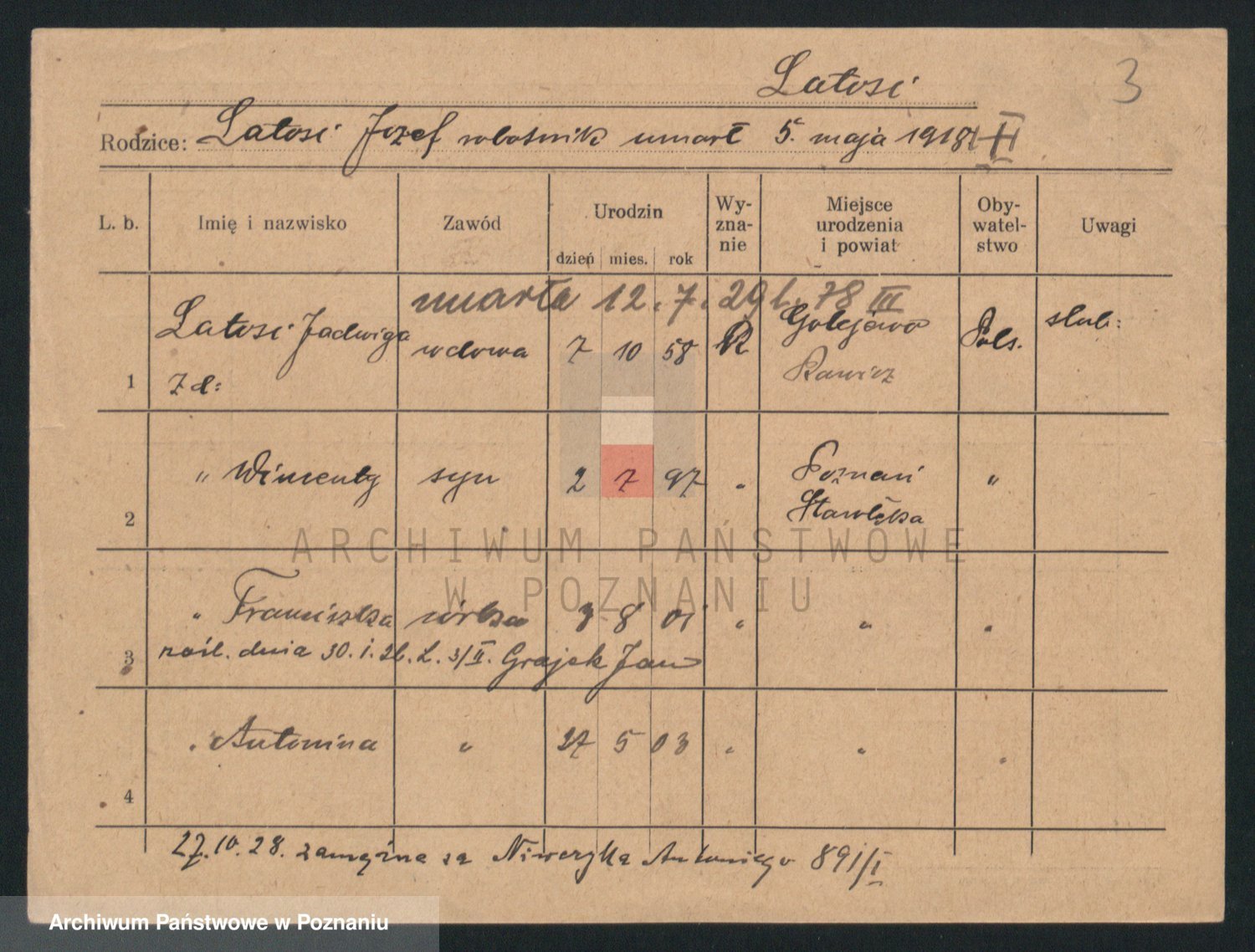 Podgląd karty osobowej dostępny jest po kliknięciu na nazwisko lub ikonkę karty. Można dokonywać powiększenia (ikony na górze) lub przechodzić między kolejnymi skanami (strzałki po bokach).