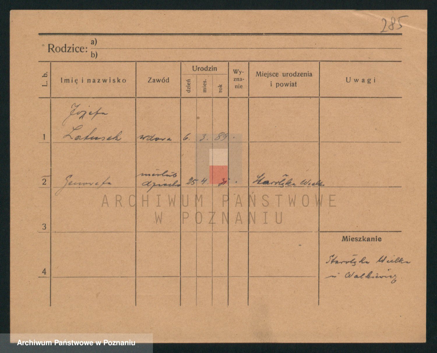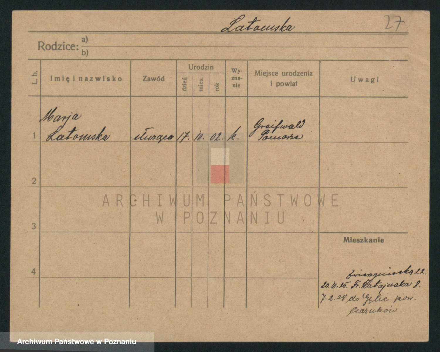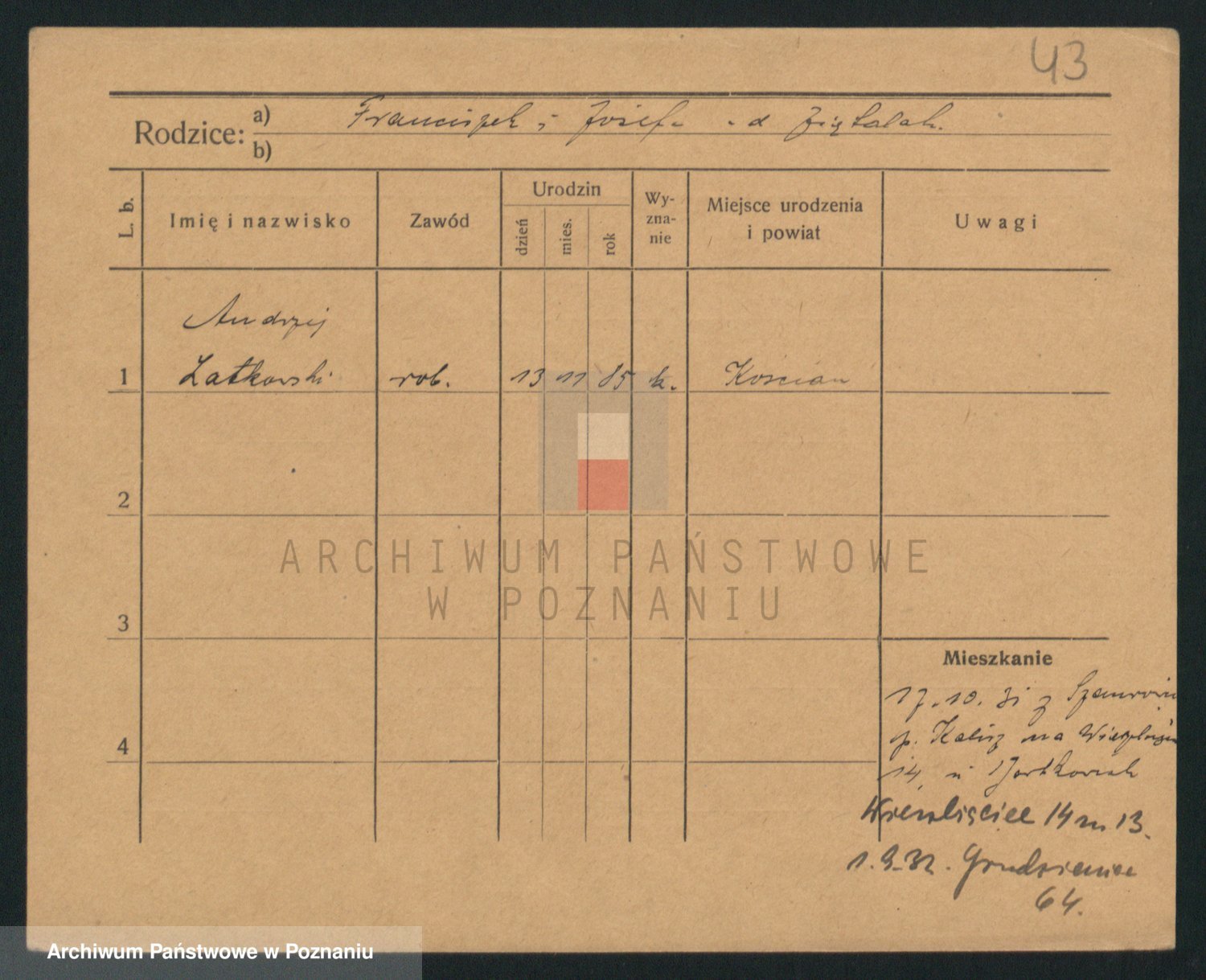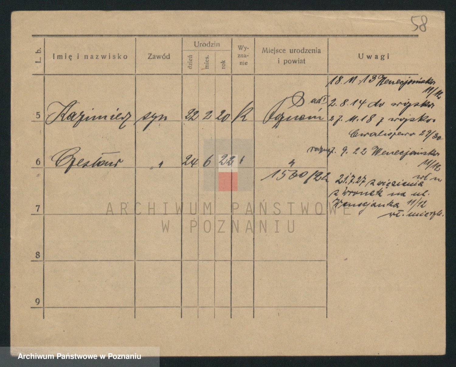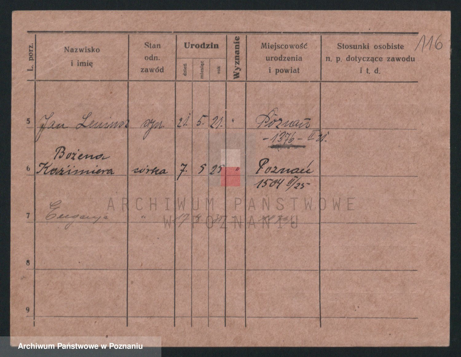 Podgląd karty osobowej dostępny jest po kliknięciu na nazwisko lub ikonkę karty. Można dokonywać powiększenia (ikony na górze) lub przechodzić między kolejnymi skanami (strzałki po bokach).